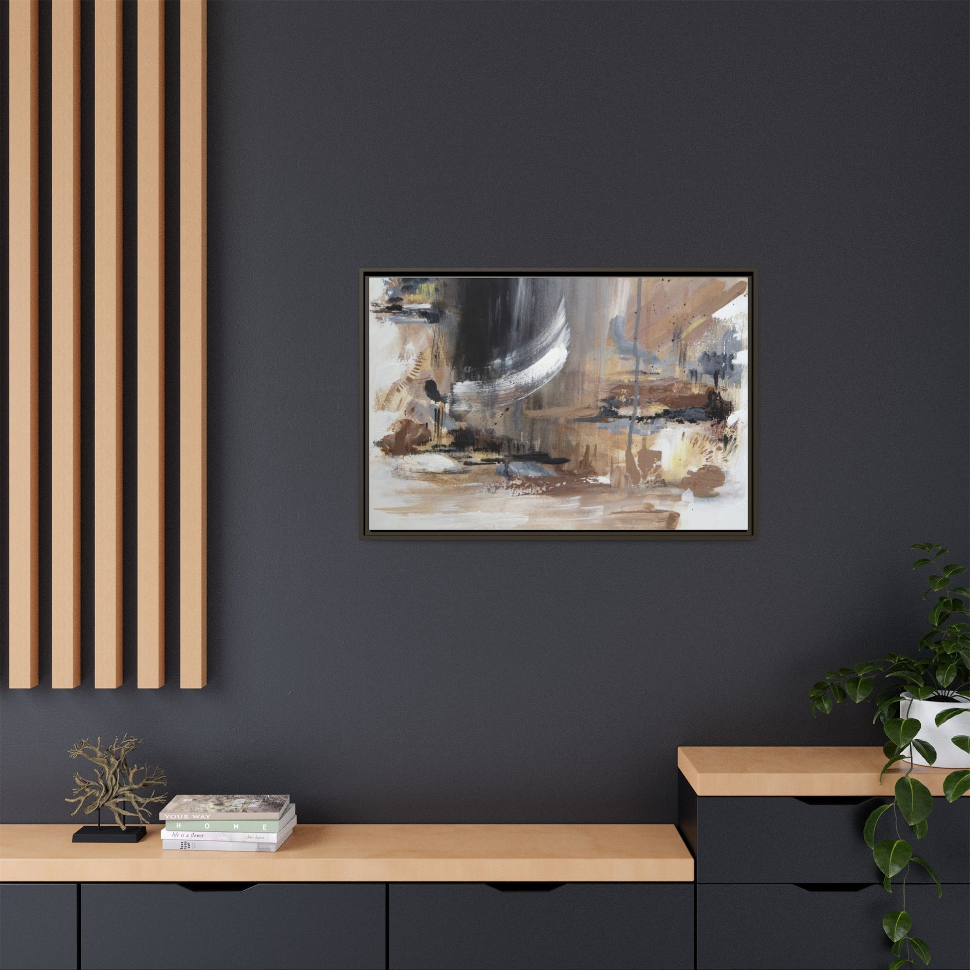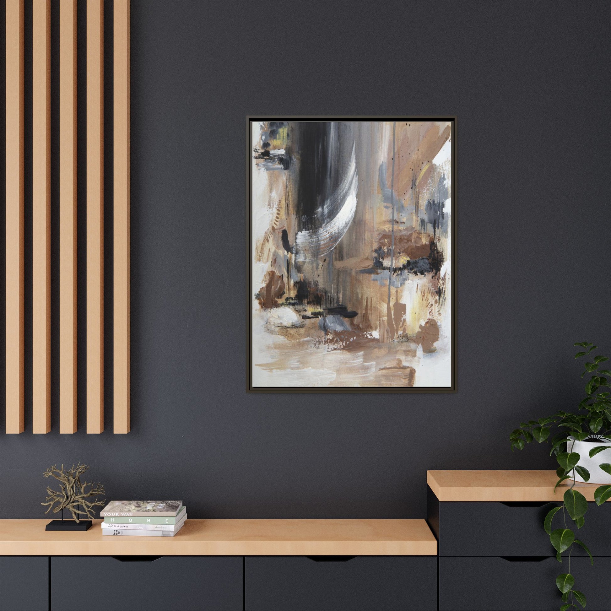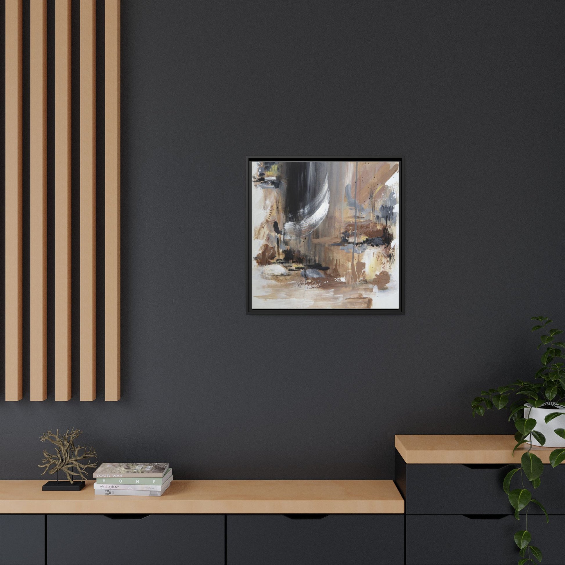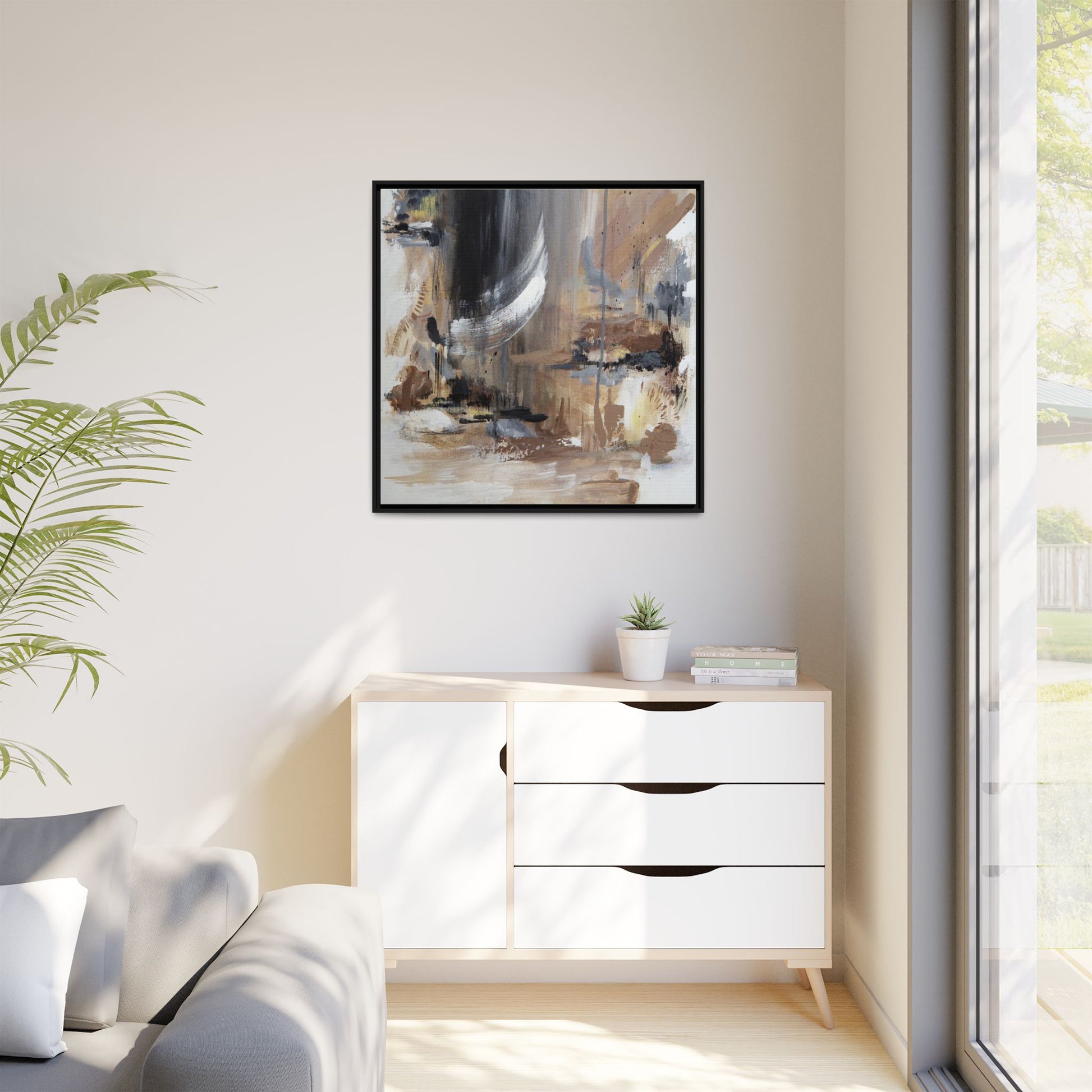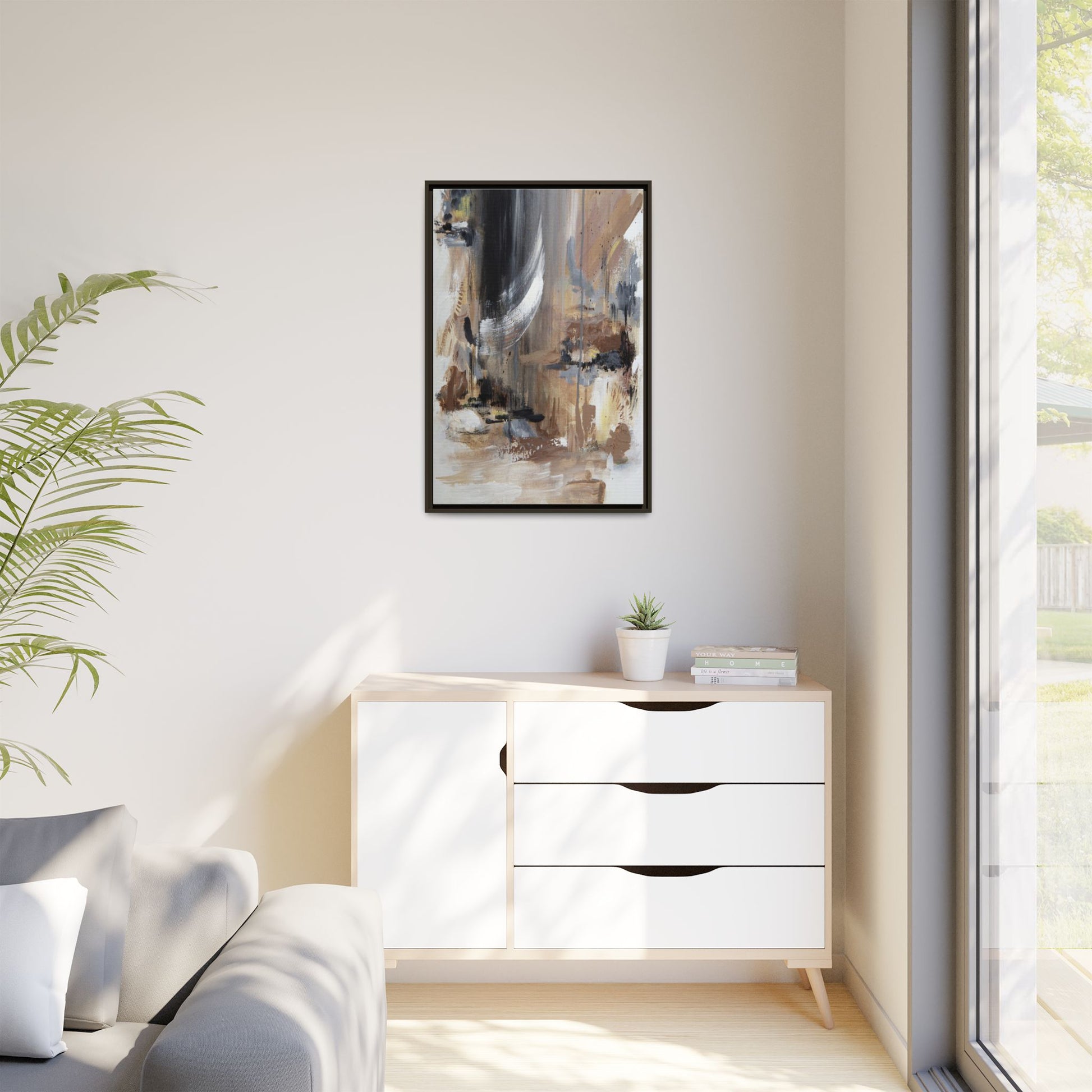 This captivating abstract painting features a dynamic composition of muted earth tones and grayscale colors, blending organic shapes and fluid brushstrokes. A prominent white wing-like form emerges from a dark, swirling background, creating a sense of movement and ethereal energy. The artwork employs a mixed media technique with layers of paint that create depth, texture, and subtle variations in tone, ranging from soft beiges and browns to stark blacks and whites. Drips, splatters, and gestural marks contribute to the painting's emotional and spontaneous feel, suggesting a landscape or dreamscape that exists between representation and abstraction. The overall effect is contemplative and atmospheric, inviting viewers to interpret the image through their own emotional and visual lens.