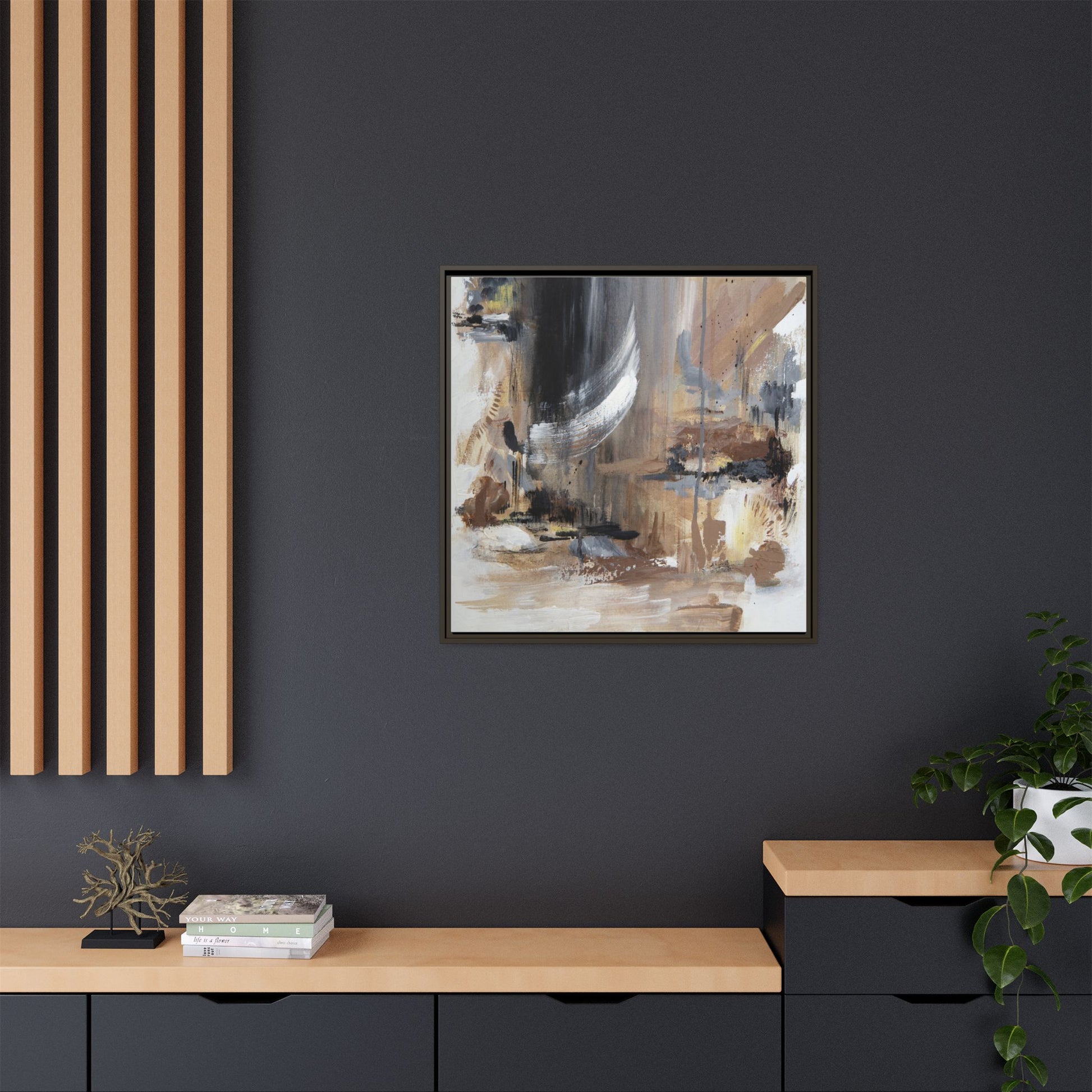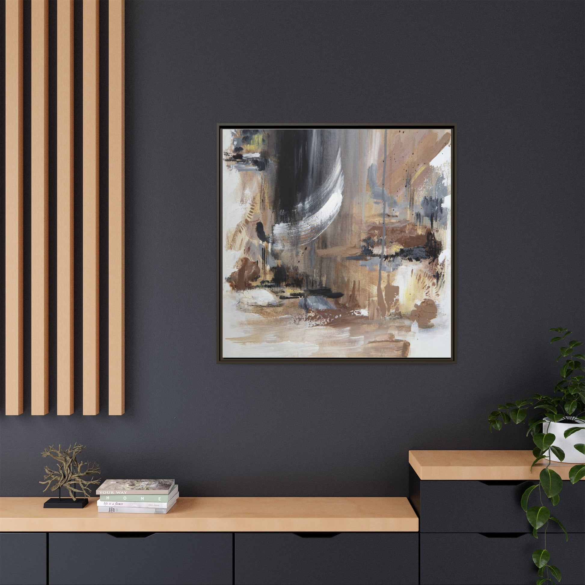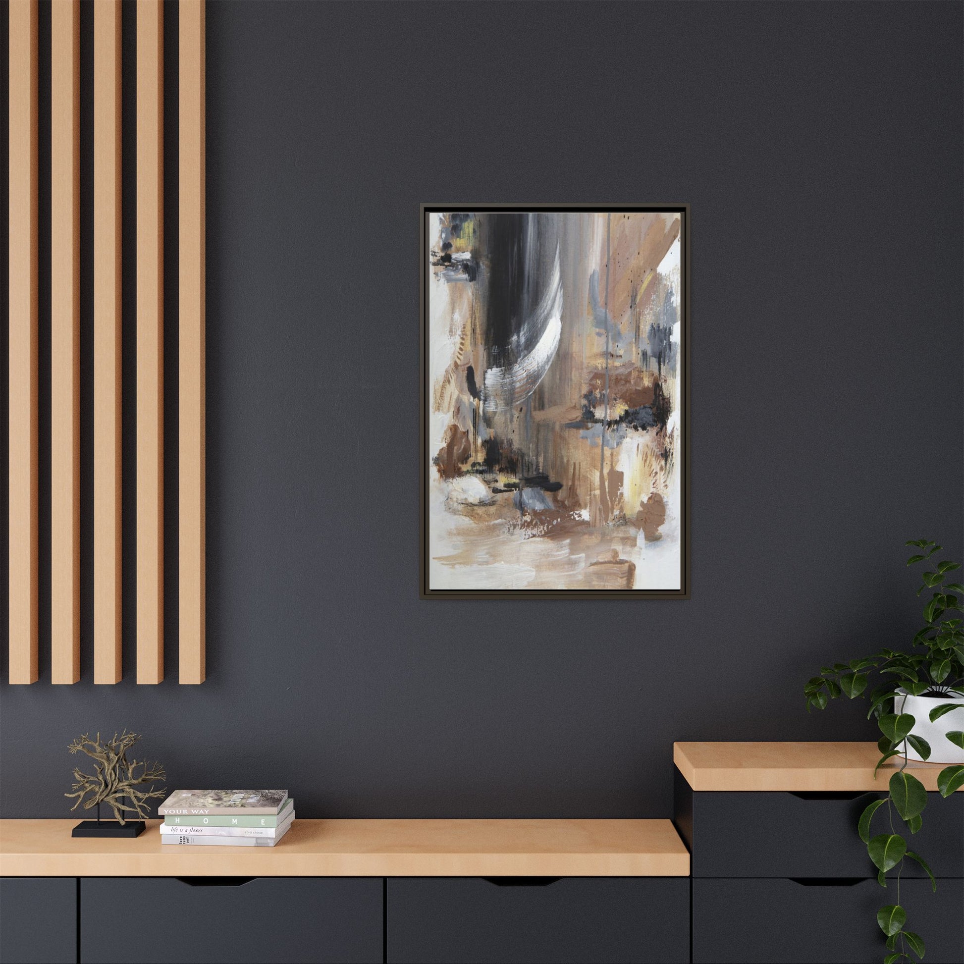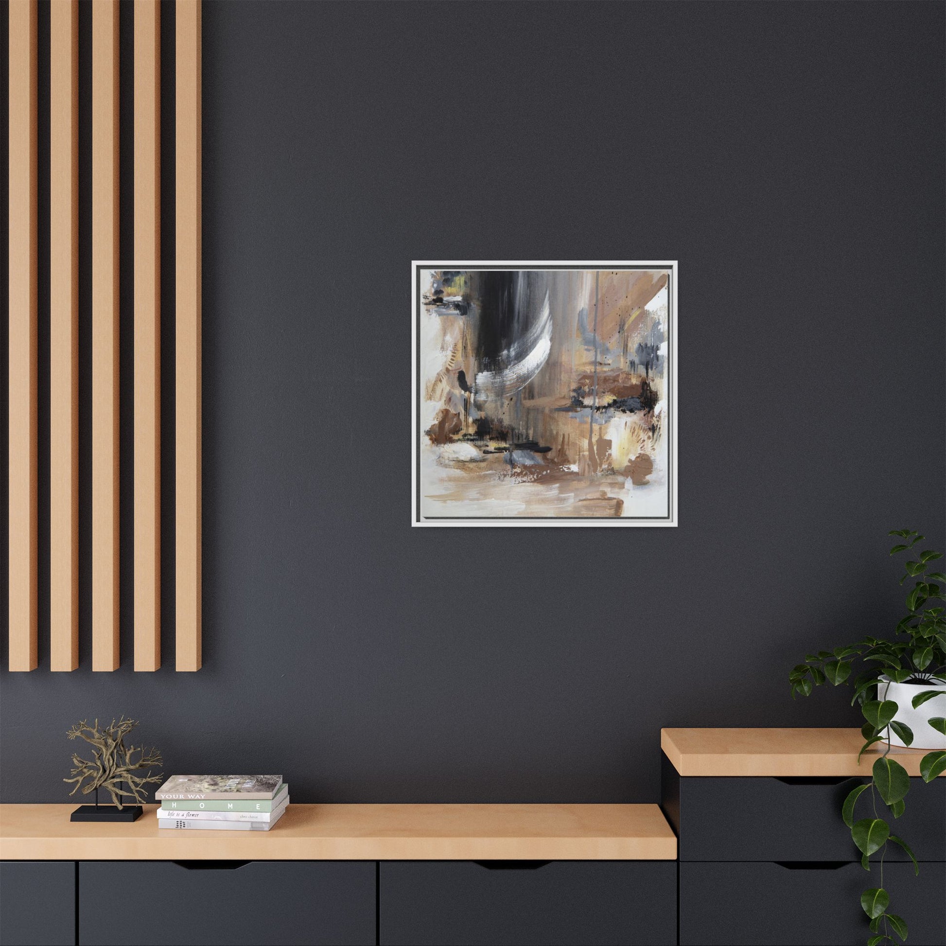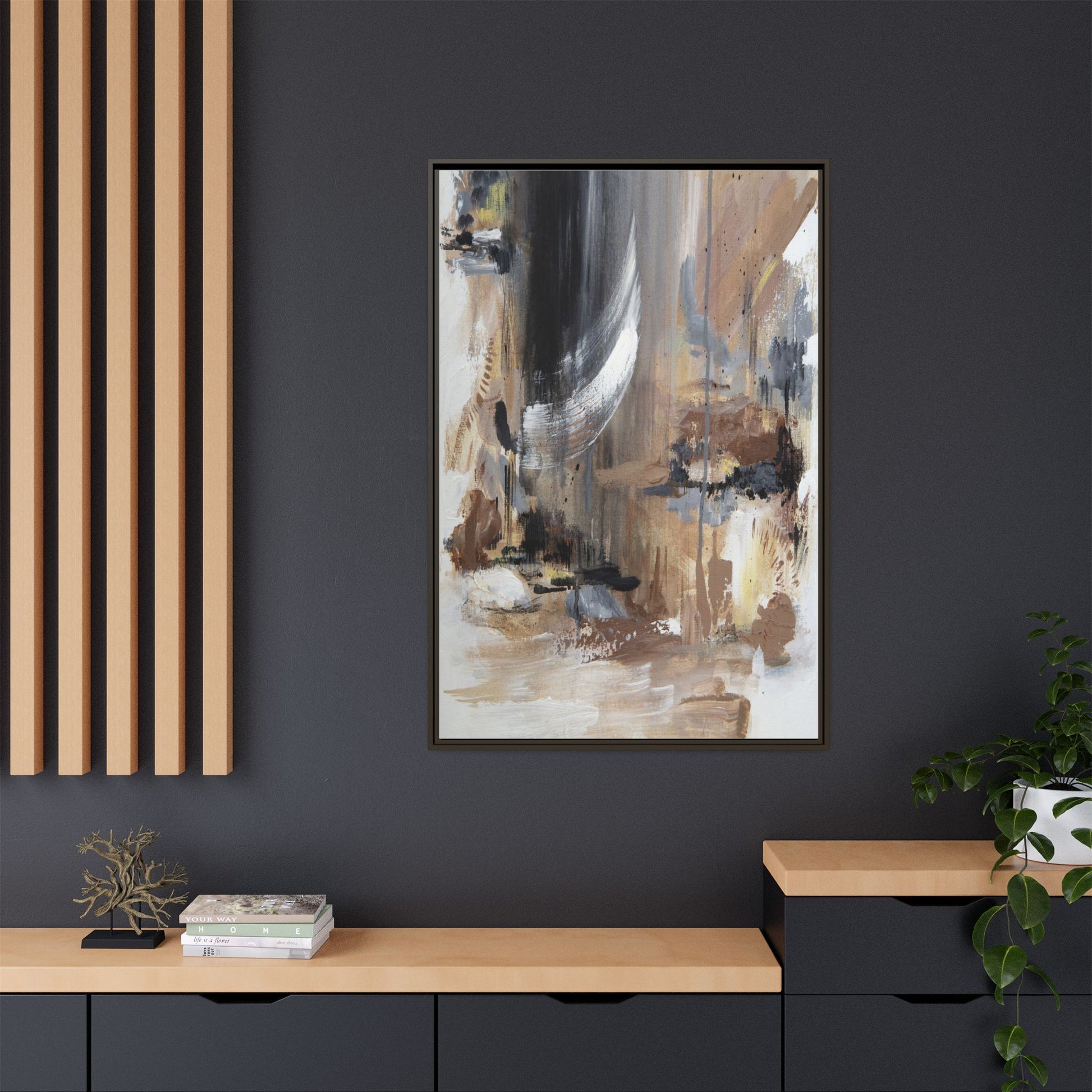 This captivating abstract painting features a dynamic composition of muted earth tones and grayscale colors, blending organic shapes and fluid brushstrokes. A prominent white wing-like form emerges from a dark, swirling background, creating a sense of movement and ethereal energy. The artwork employs a mixed media technique with layers of paint that create depth, texture, and subtle variations in tone, ranging from soft beiges and browns to stark blacks and whites. Drips, splatters, and gestural marks contribute to the painting's emotional and spontaneous feel, suggesting a landscape or dreamscape that exists between representation and abstraction. The overall effect is contemplative and atmospheric, inviting viewers to interpret the image through their own emotional and visual lens.