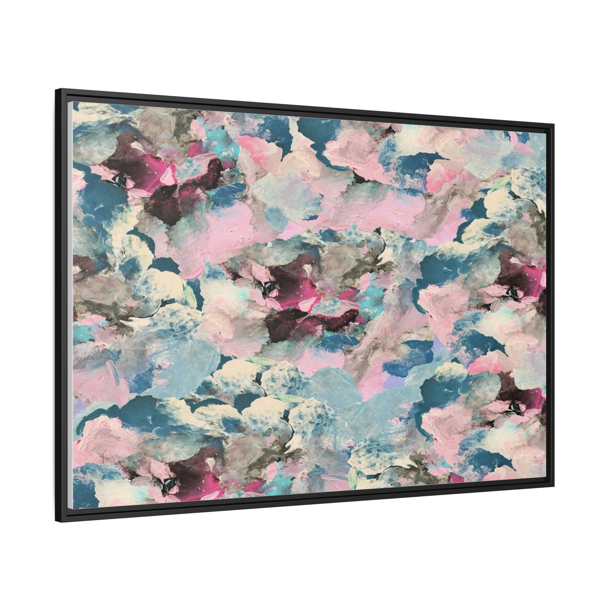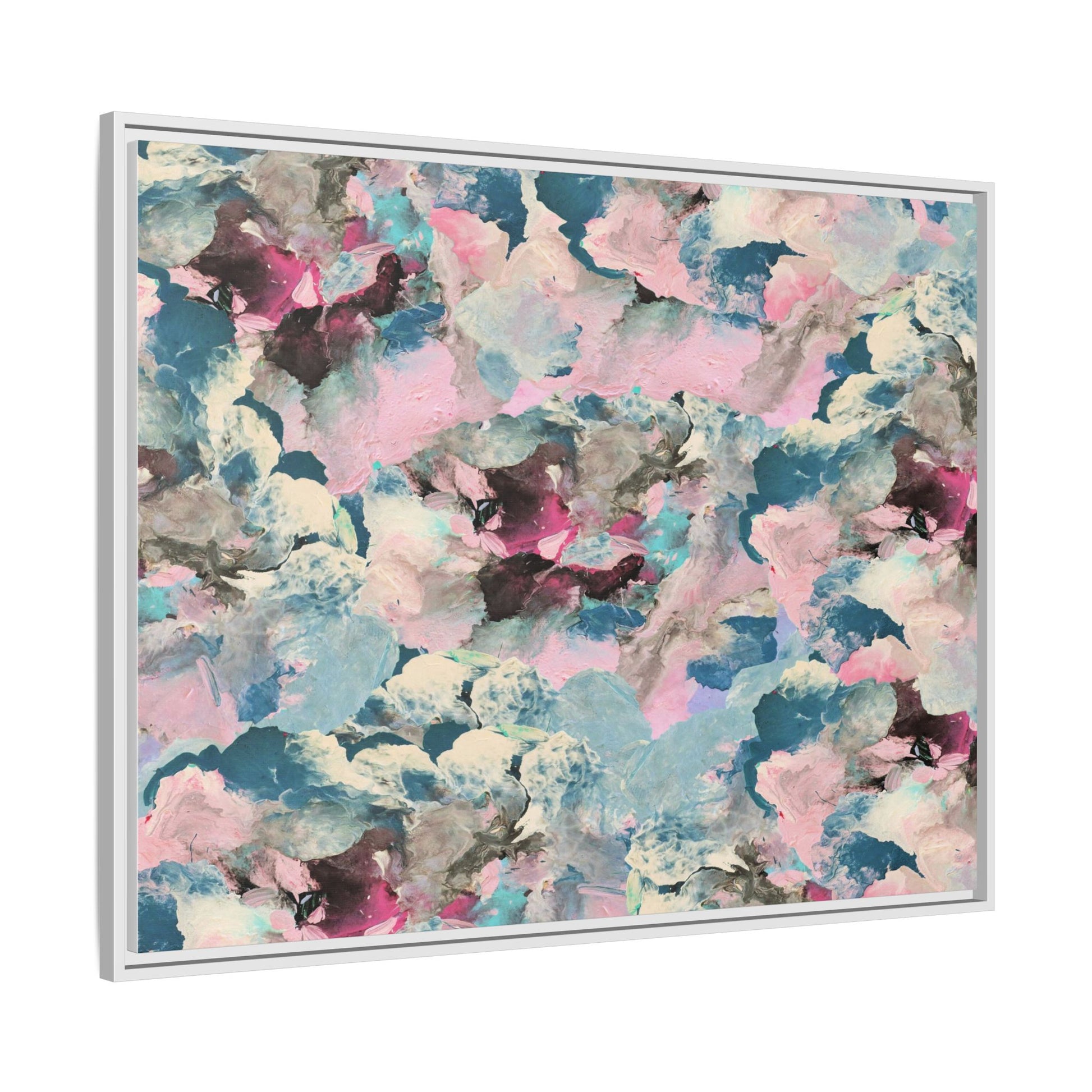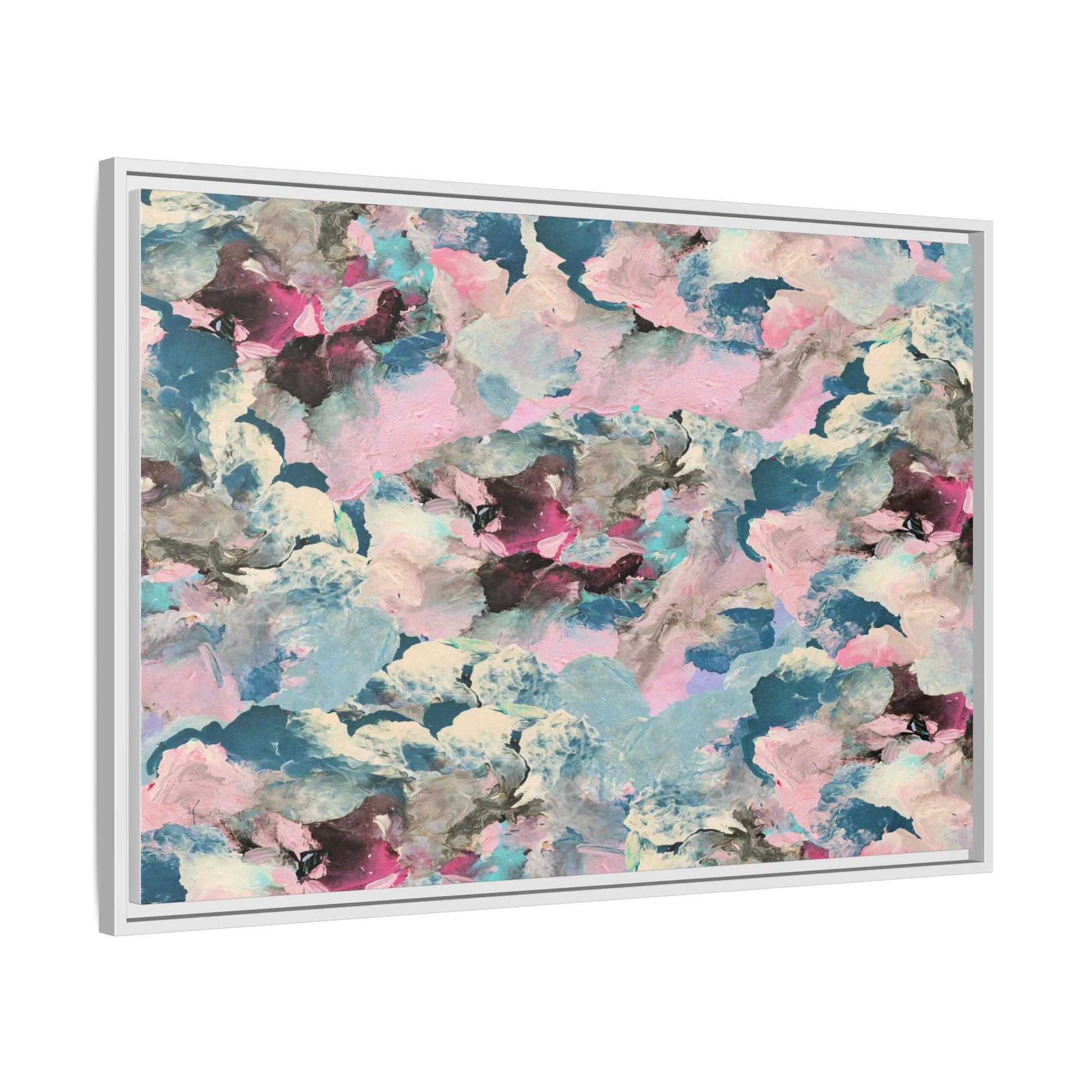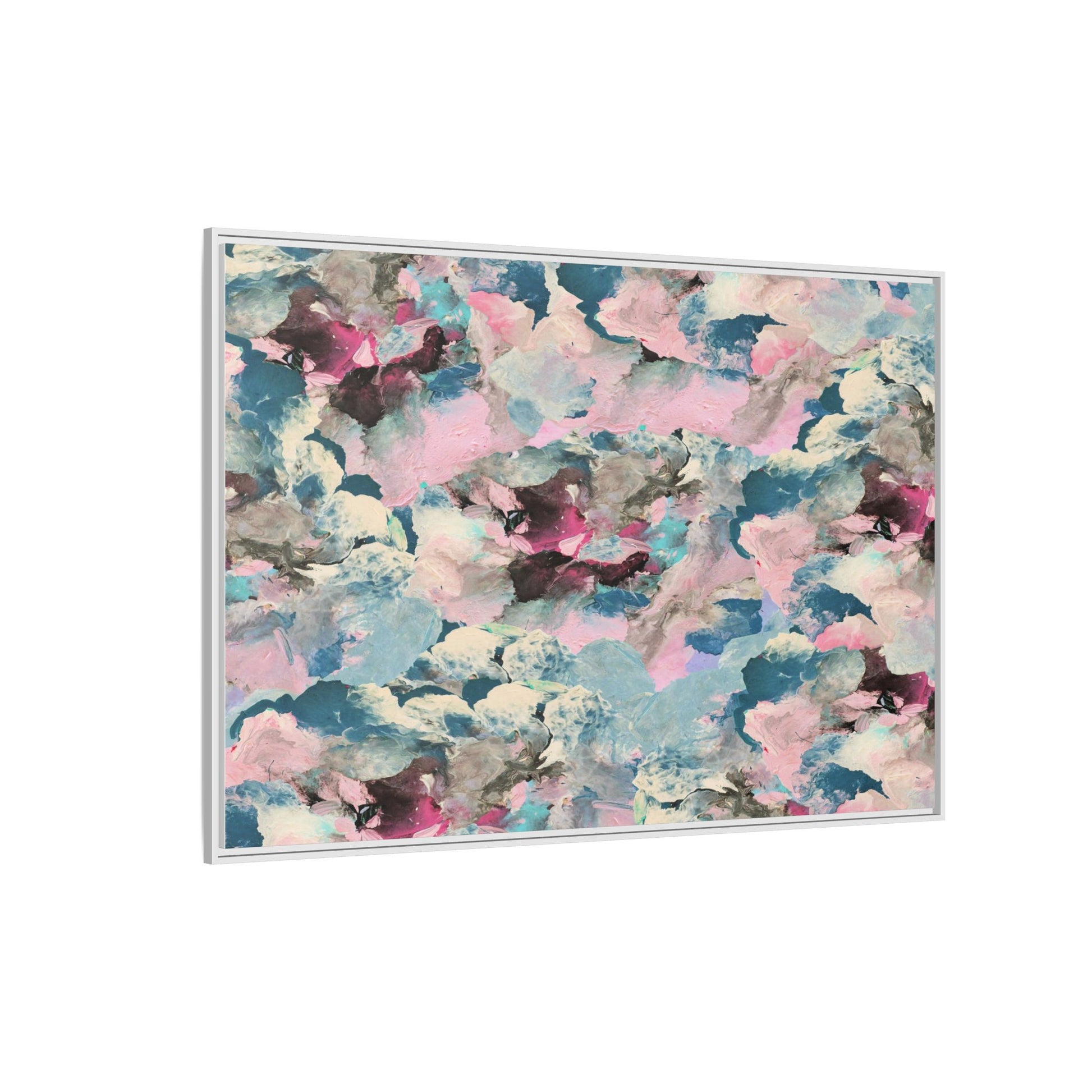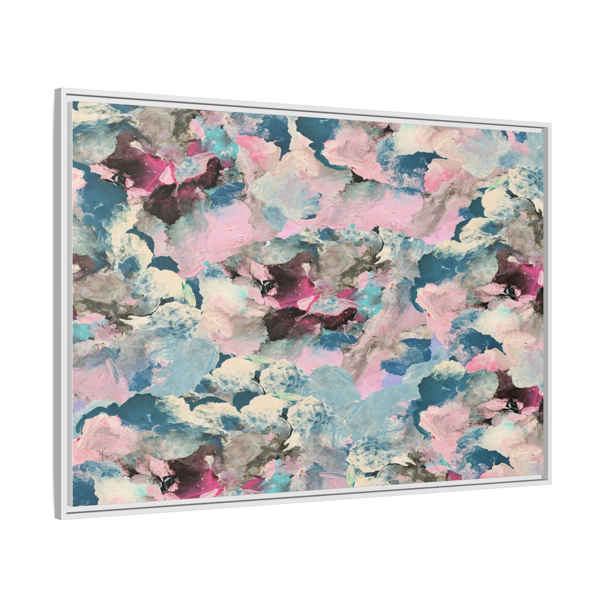 This abstract art piece showcases a mesmerizing blend of soft, ethereal colors including pink, blue, teal, white, and deep maroon. The image appears to be a digital or painted artwork with fluid, overlapping brushstrokes that create a dreamy, cloud-like texture and composition. Each color seems to blend and merge into the next, creating organic shapes and a sense of movement and depth across the entire canvas. The style resembles a watercolor or digital painting technique, with layers of color that seem to drift and flow into one another like a complex, emotional landscape. The overall effect is both calming and dynamic, inviting viewers to explore the intricate details and subtle color transitions within the artwork.