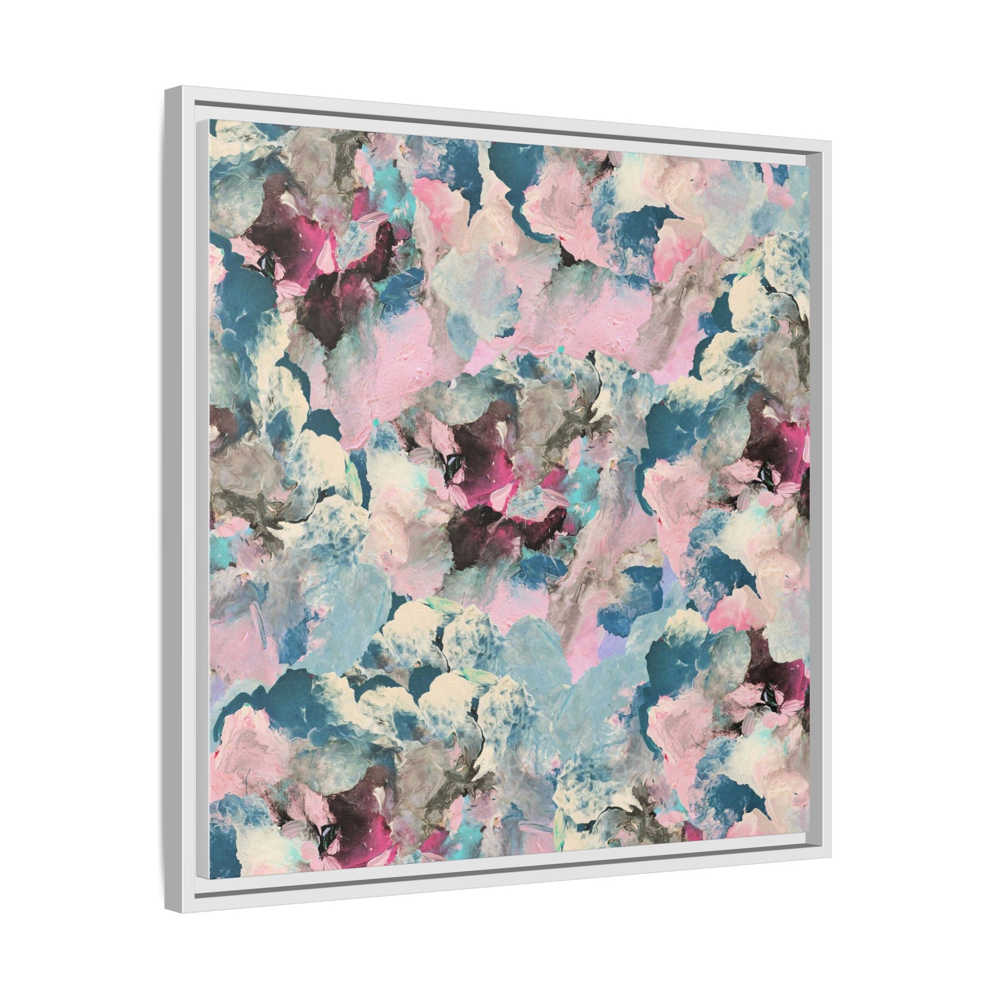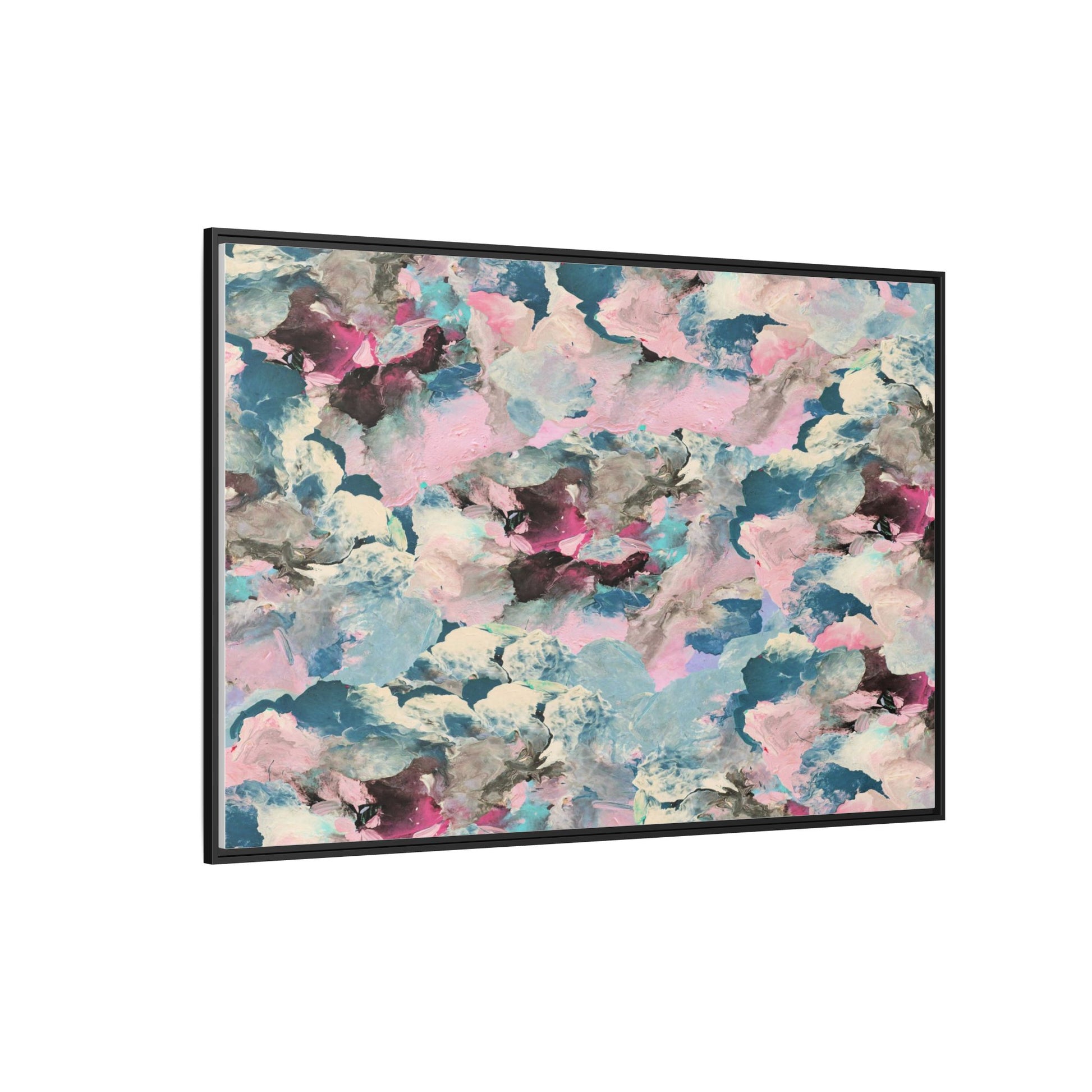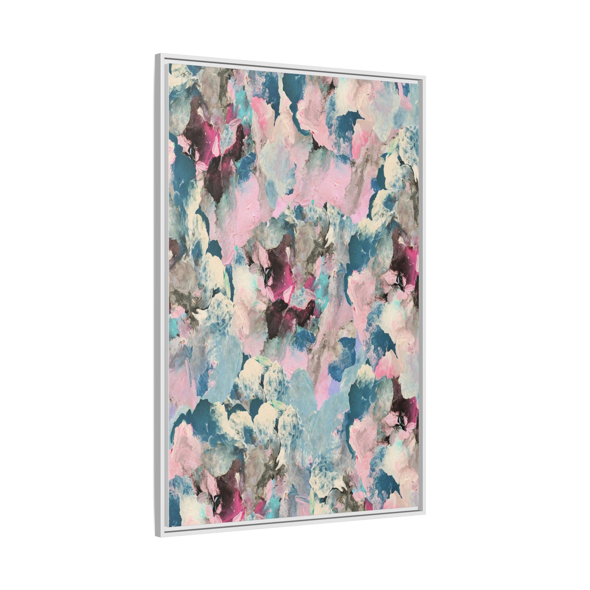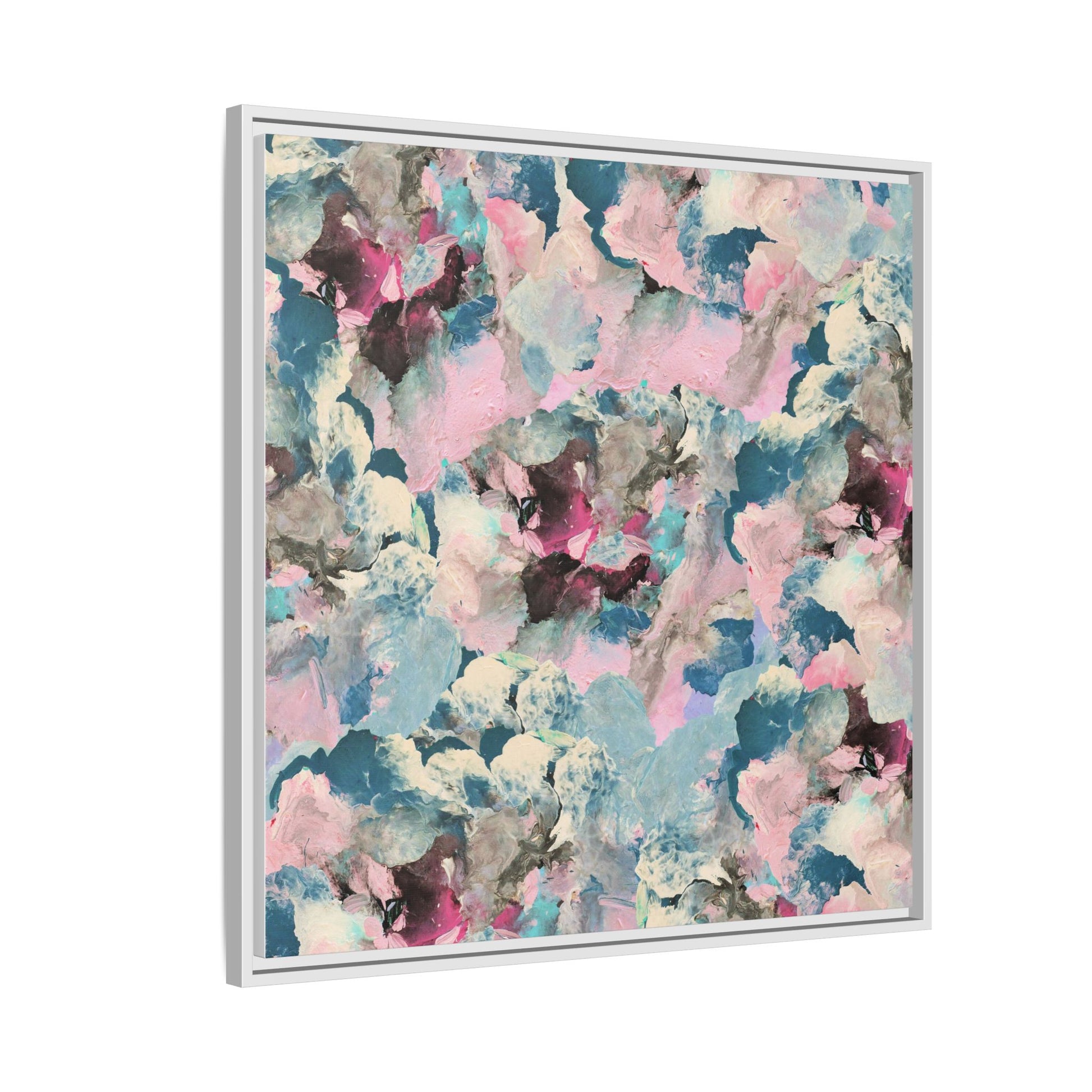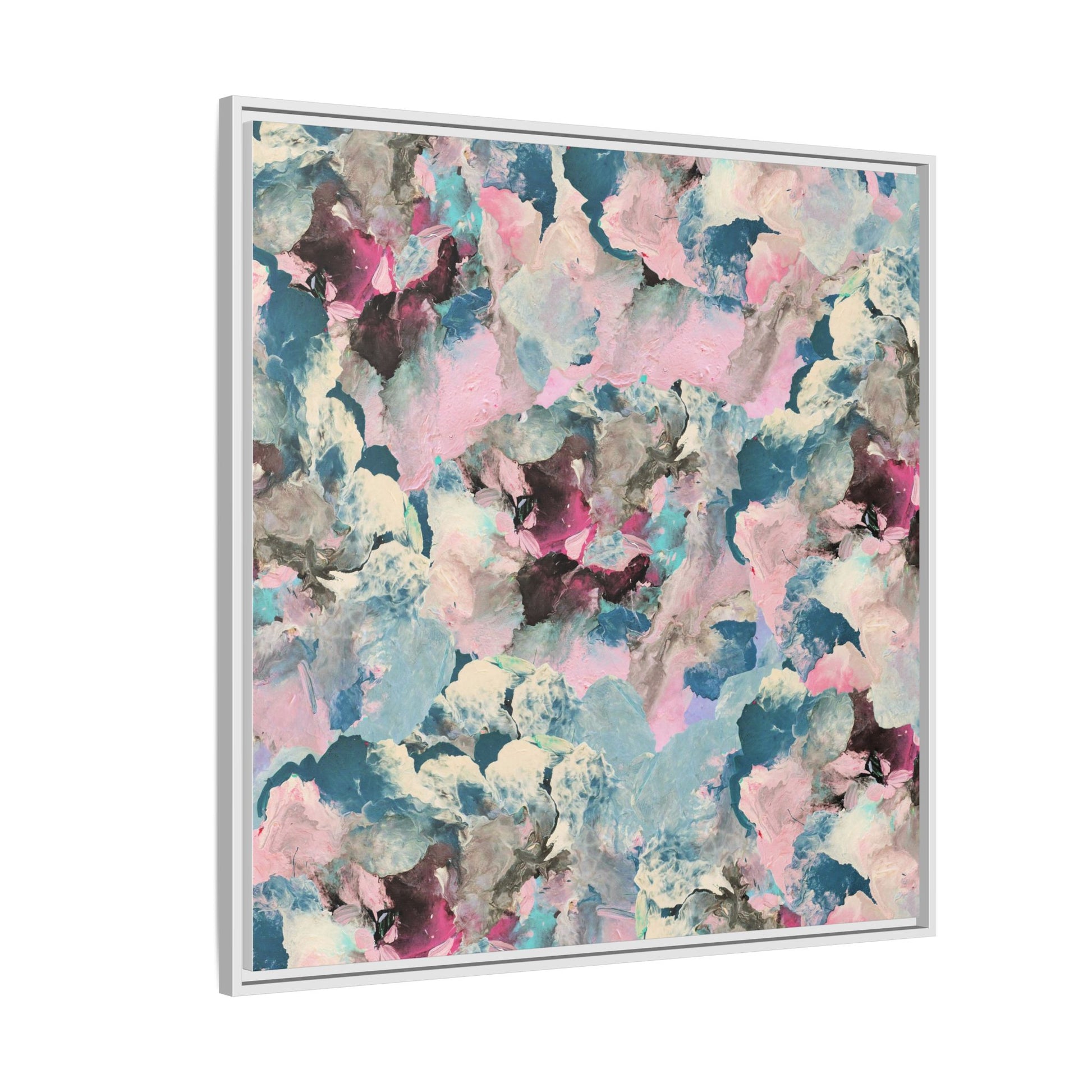 This abstract art piece showcases a mesmerizing blend of soft, ethereal colors including pink, blue, teal, white, and deep maroon. The image appears to be a digital or painted artwork with fluid, overlapping brushstrokes that create a dreamy, cloud-like texture and composition. Each color seems to blend and merge into the next, creating organic shapes and a sense of movement and depth across the entire canvas. The style resembles a watercolor or digital painting technique, with layers of color that seem to drift and flow into one another like a complex, emotional landscape. The overall effect is both calming and dynamic, inviting viewers to explore the intricate details and subtle color transitions within the artwork.
