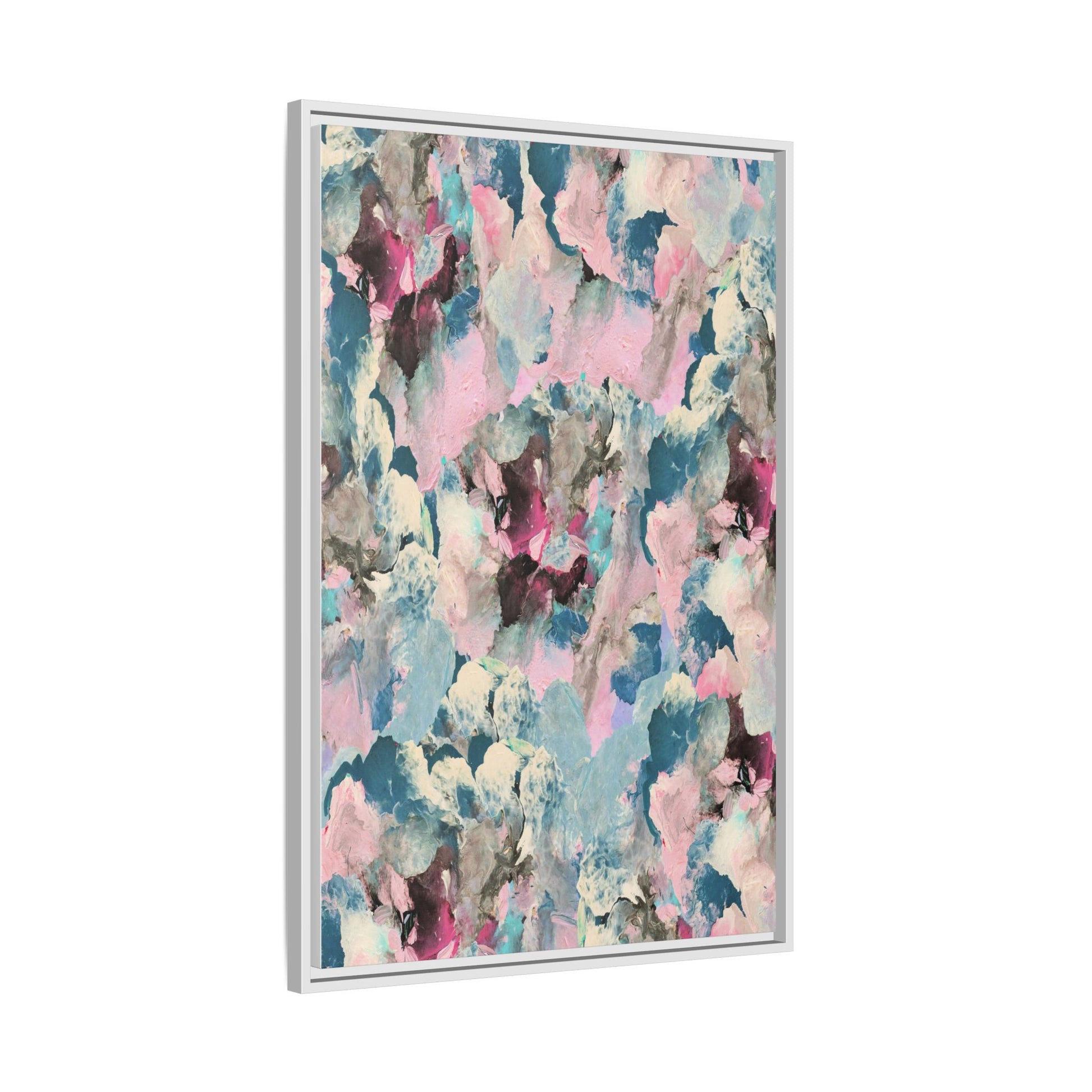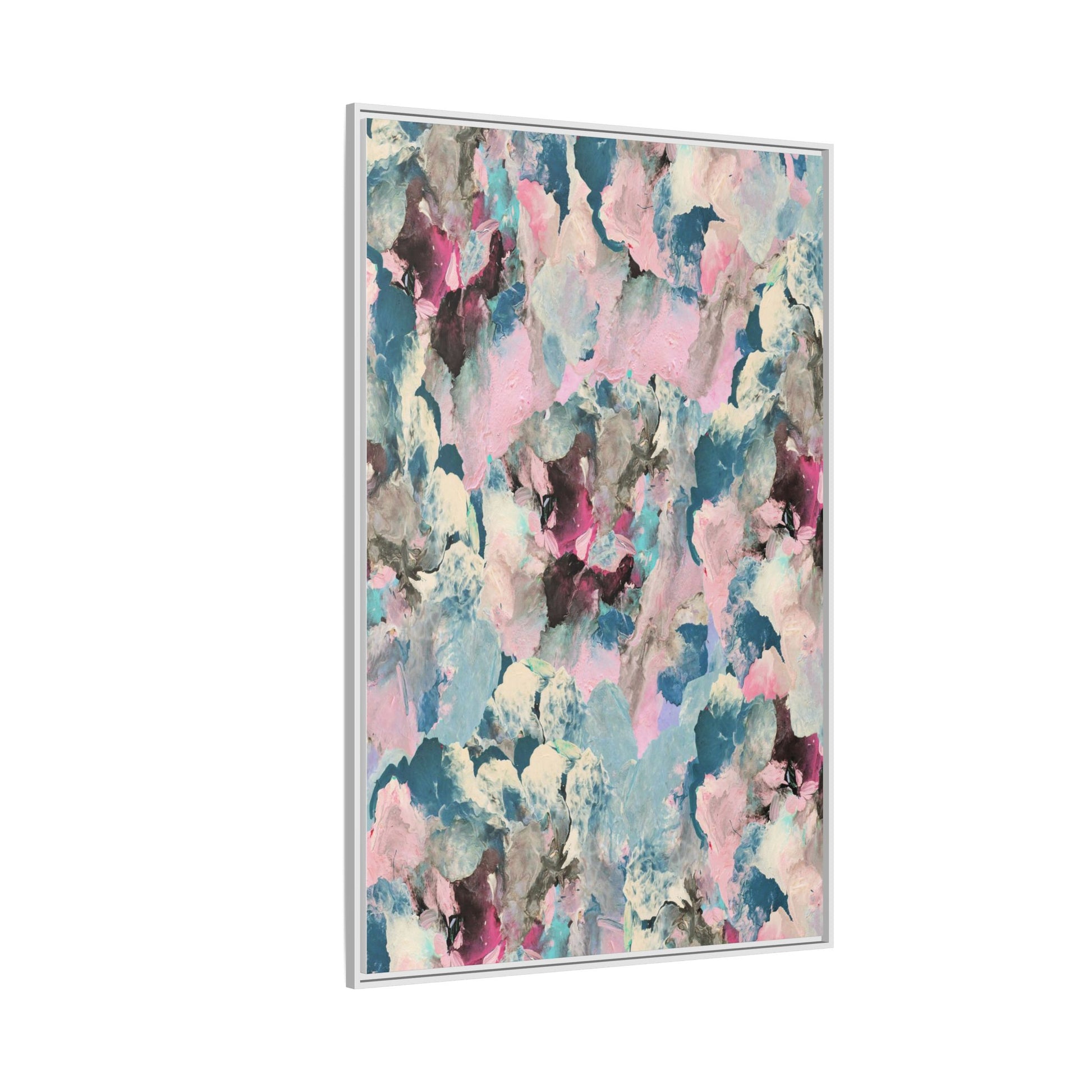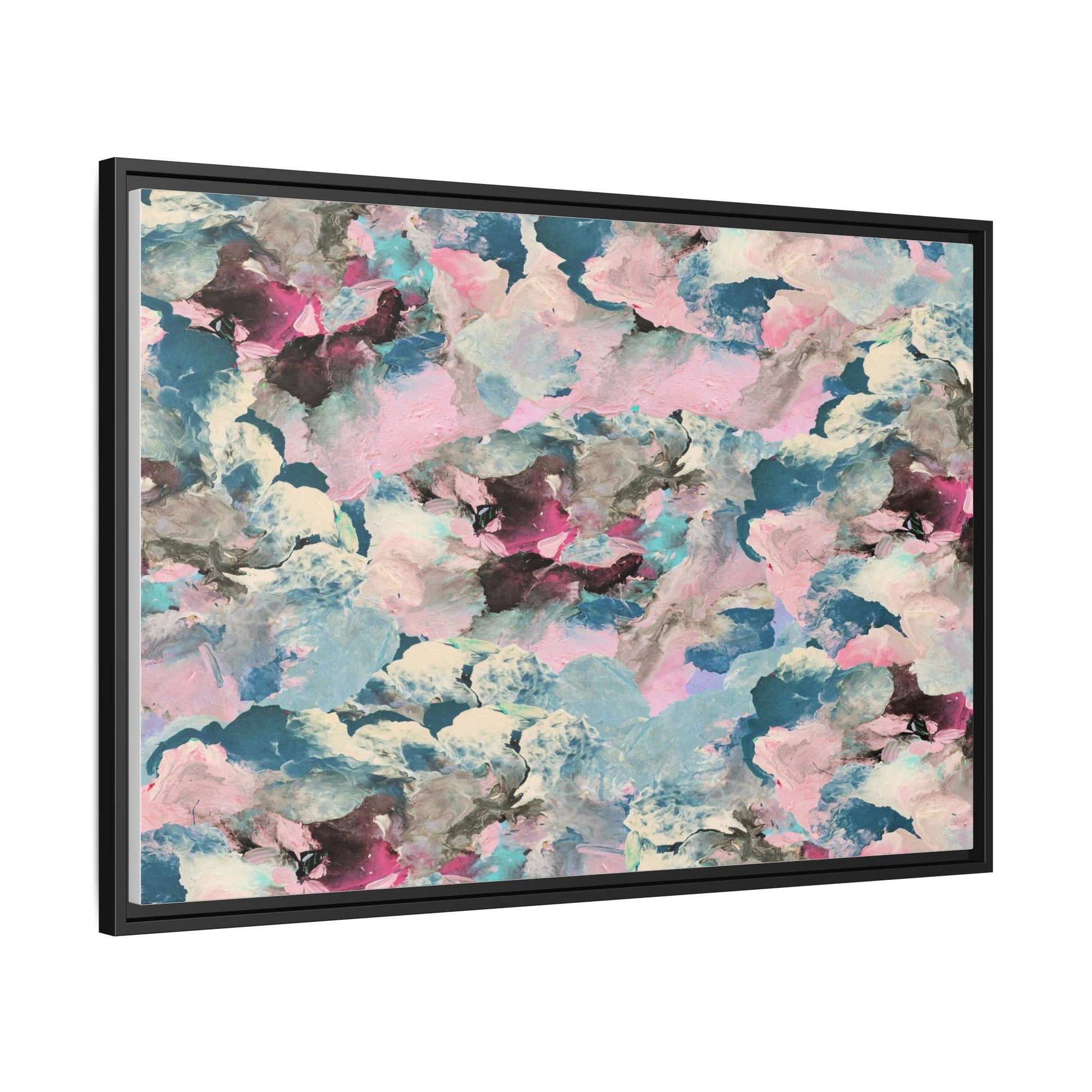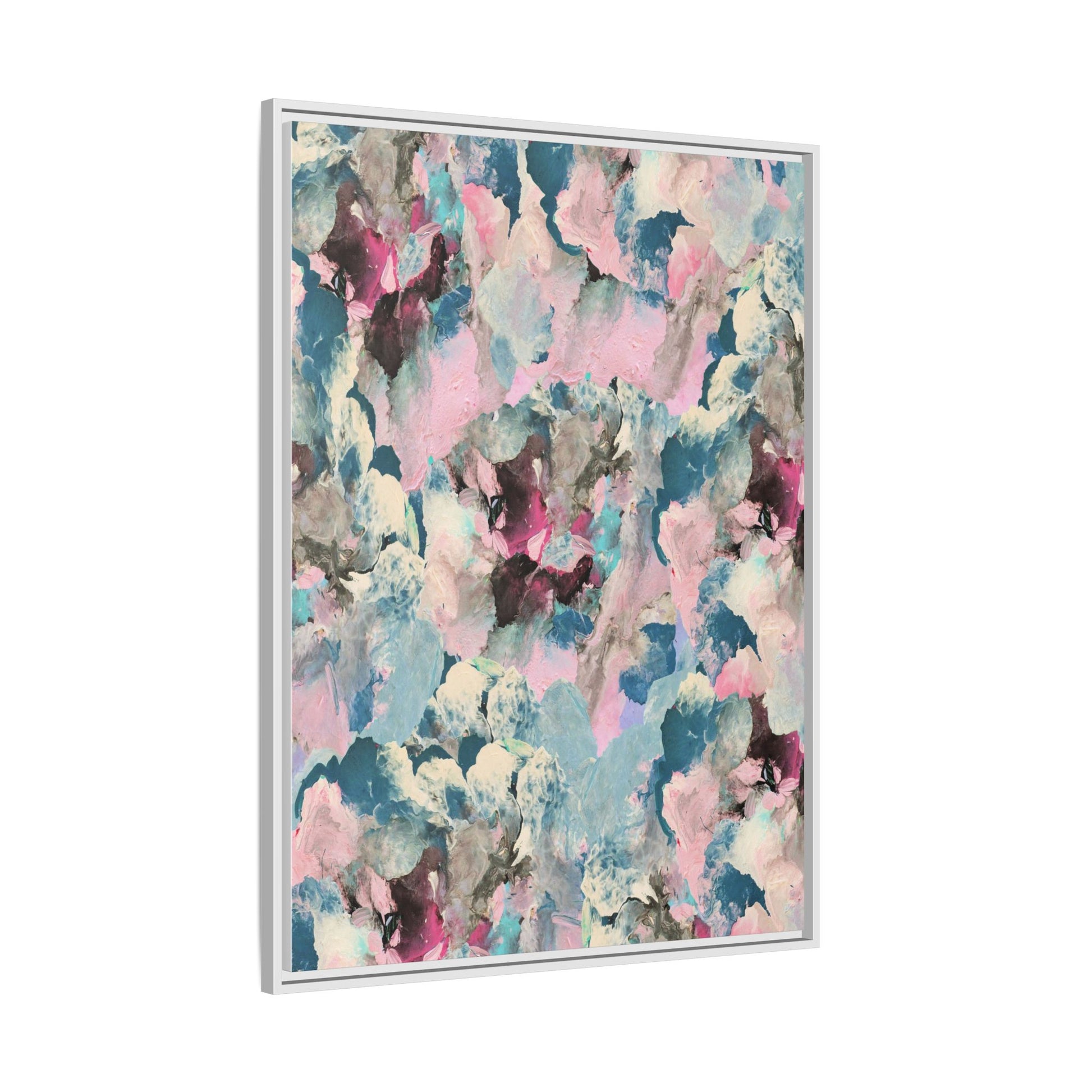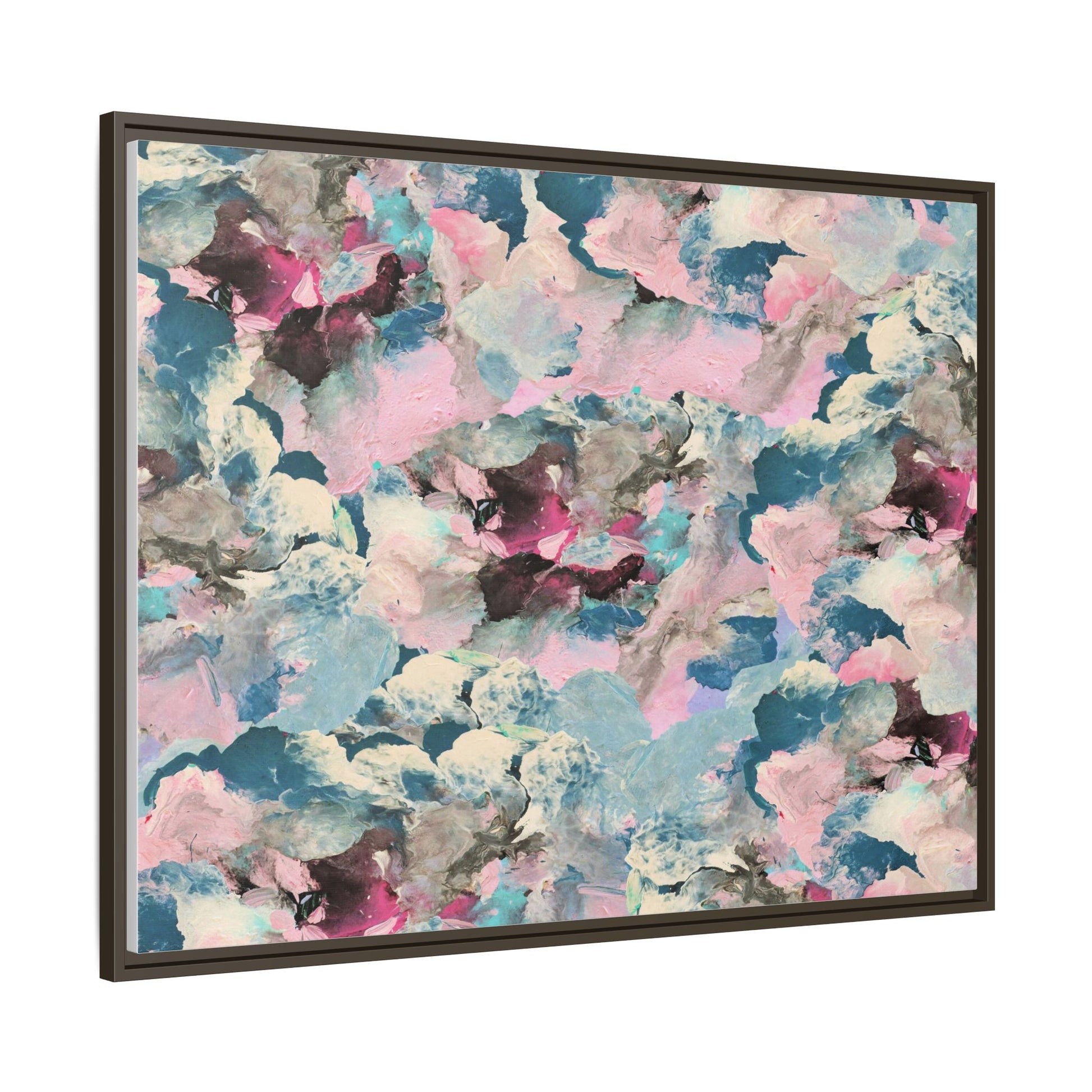 This abstract art piece showcases a mesmerizing blend of soft, ethereal colors including pink, blue, teal, white, and deep maroon. The image appears to be a digital or painted artwork with fluid, overlapping brushstrokes that create a dreamy, cloud-like texture and composition. Each color seems to blend and merge into the next, creating organic shapes and a sense of movement and depth across the entire canvas. The style resembles a watercolor or digital painting technique, with layers of color that seem to drift and flow into one another like a complex, emotional landscape. The overall effect is both calming and dynamic, inviting viewers to explore the intricate details and subtle color transitions within the artwork.