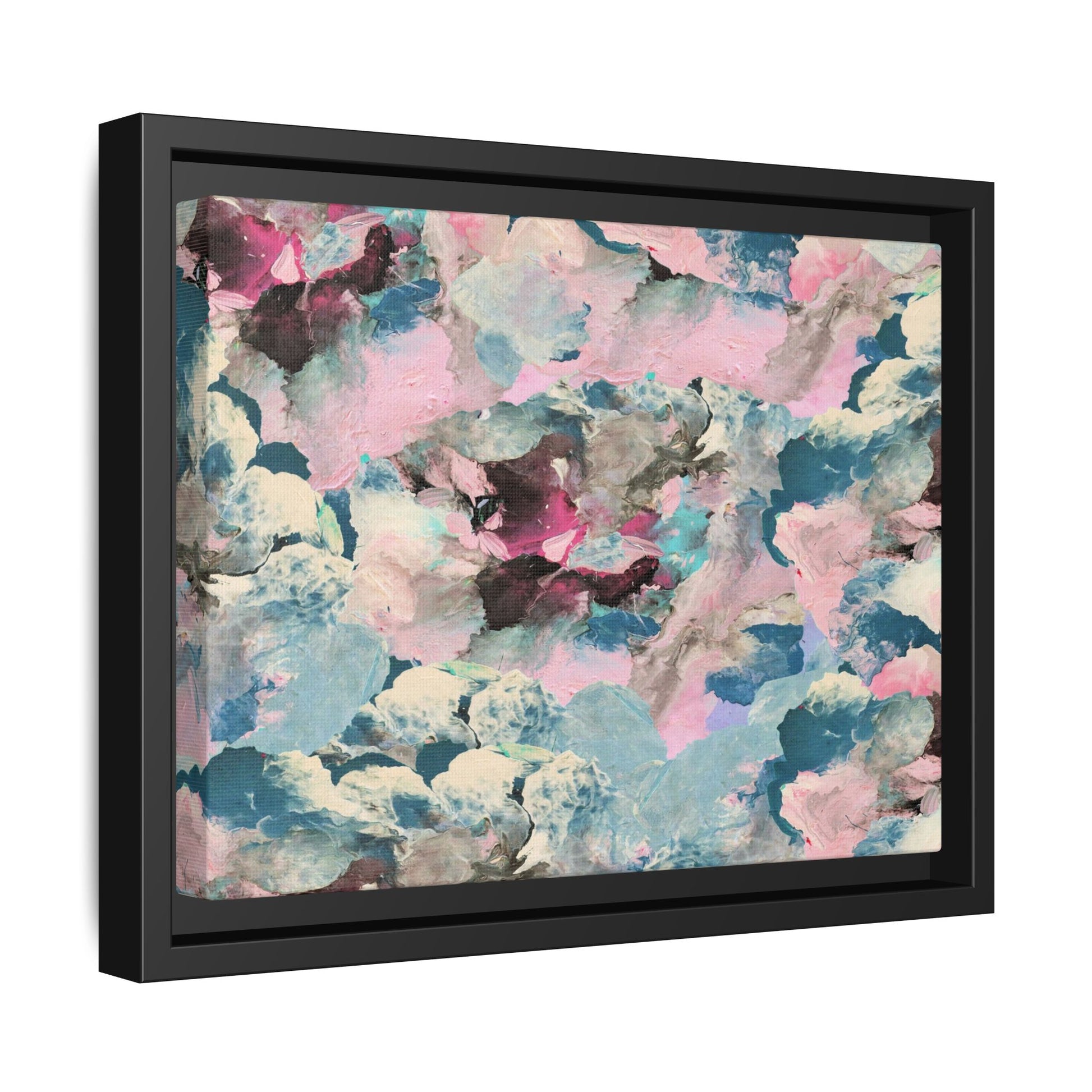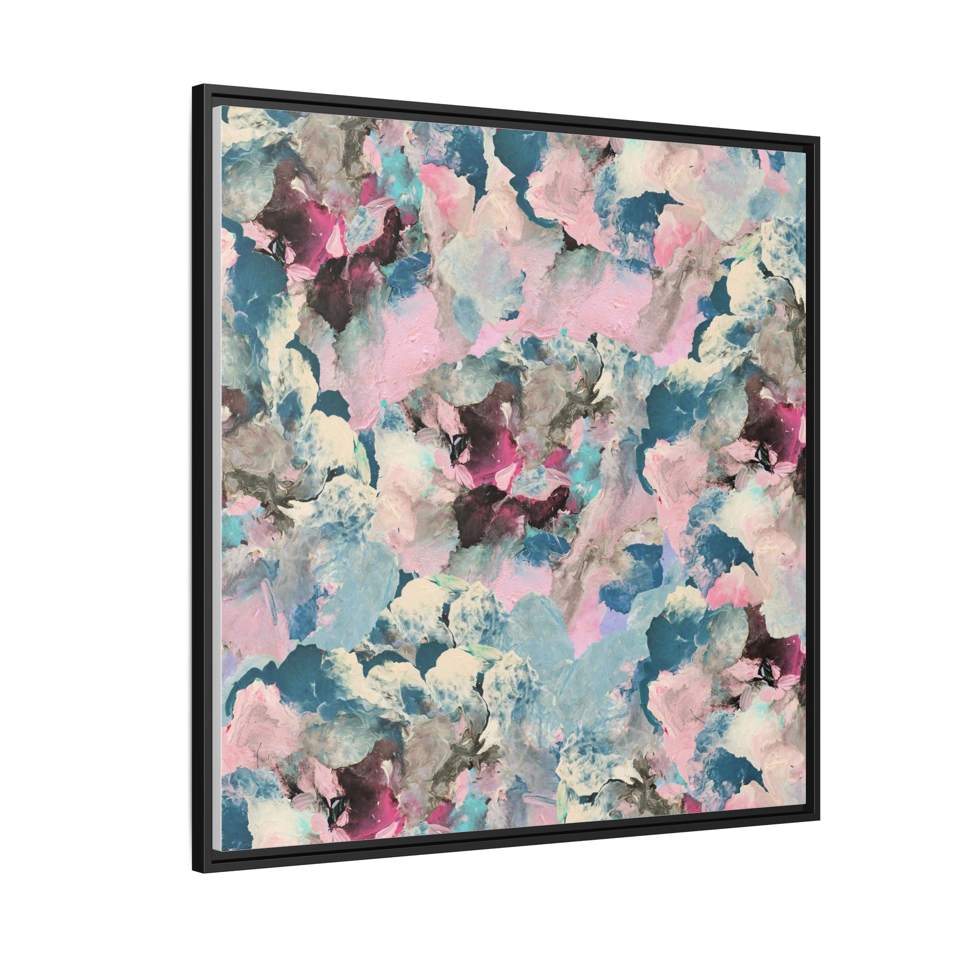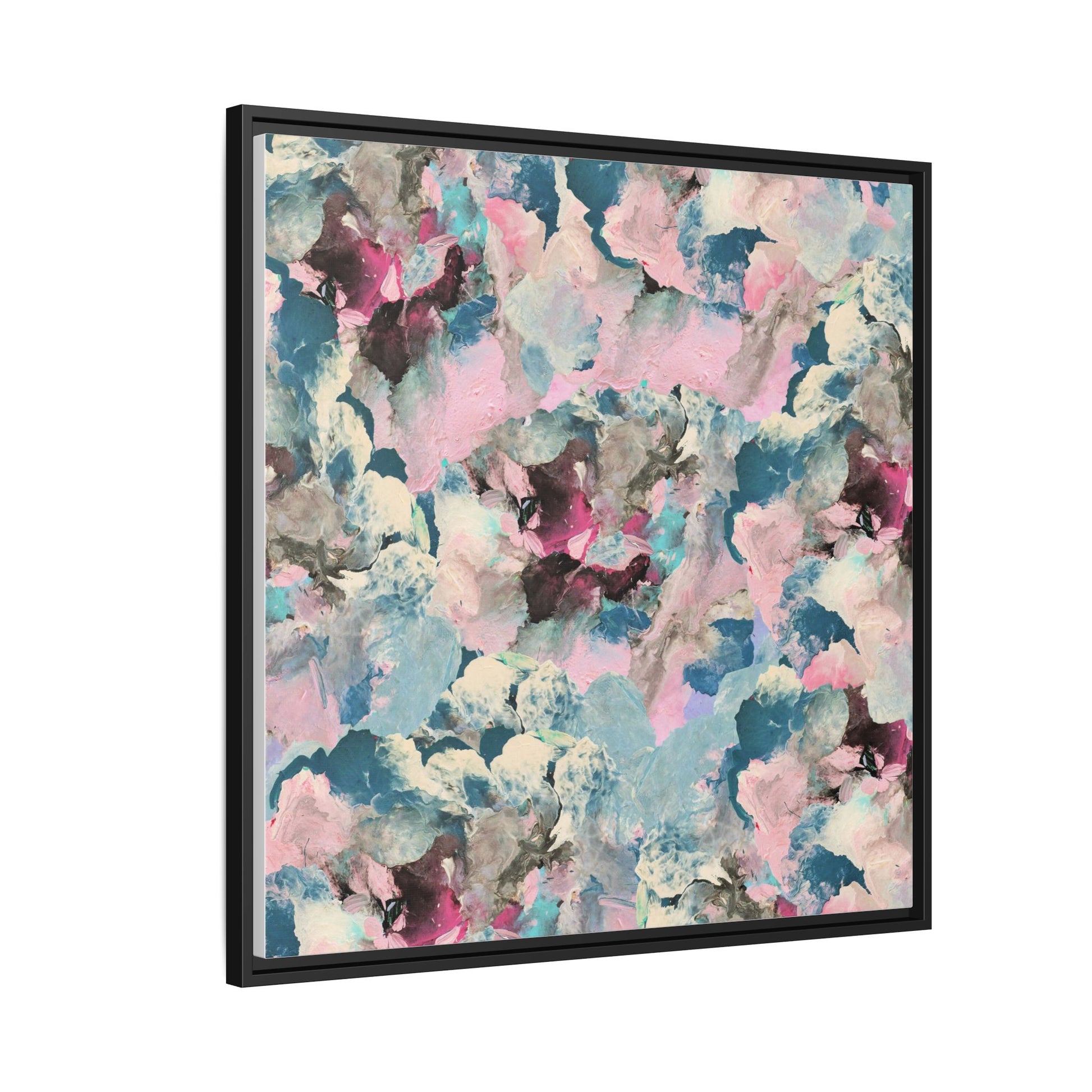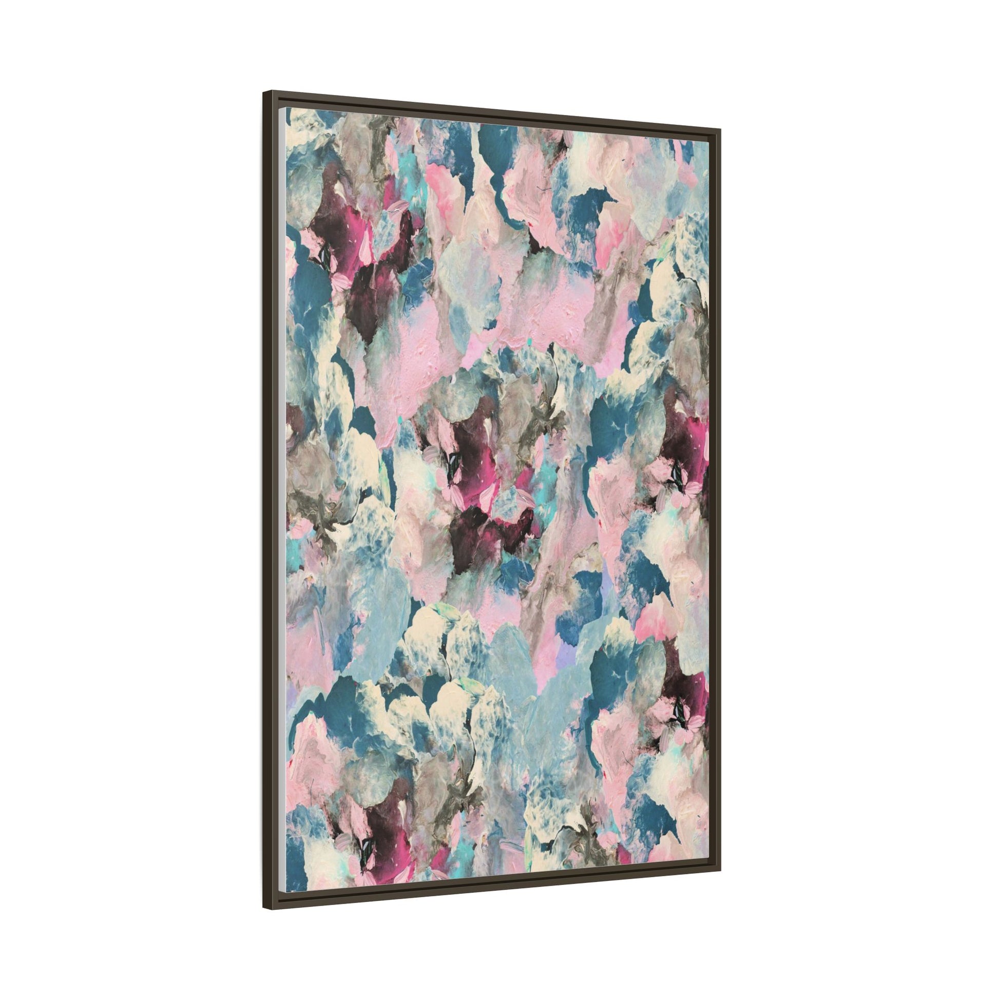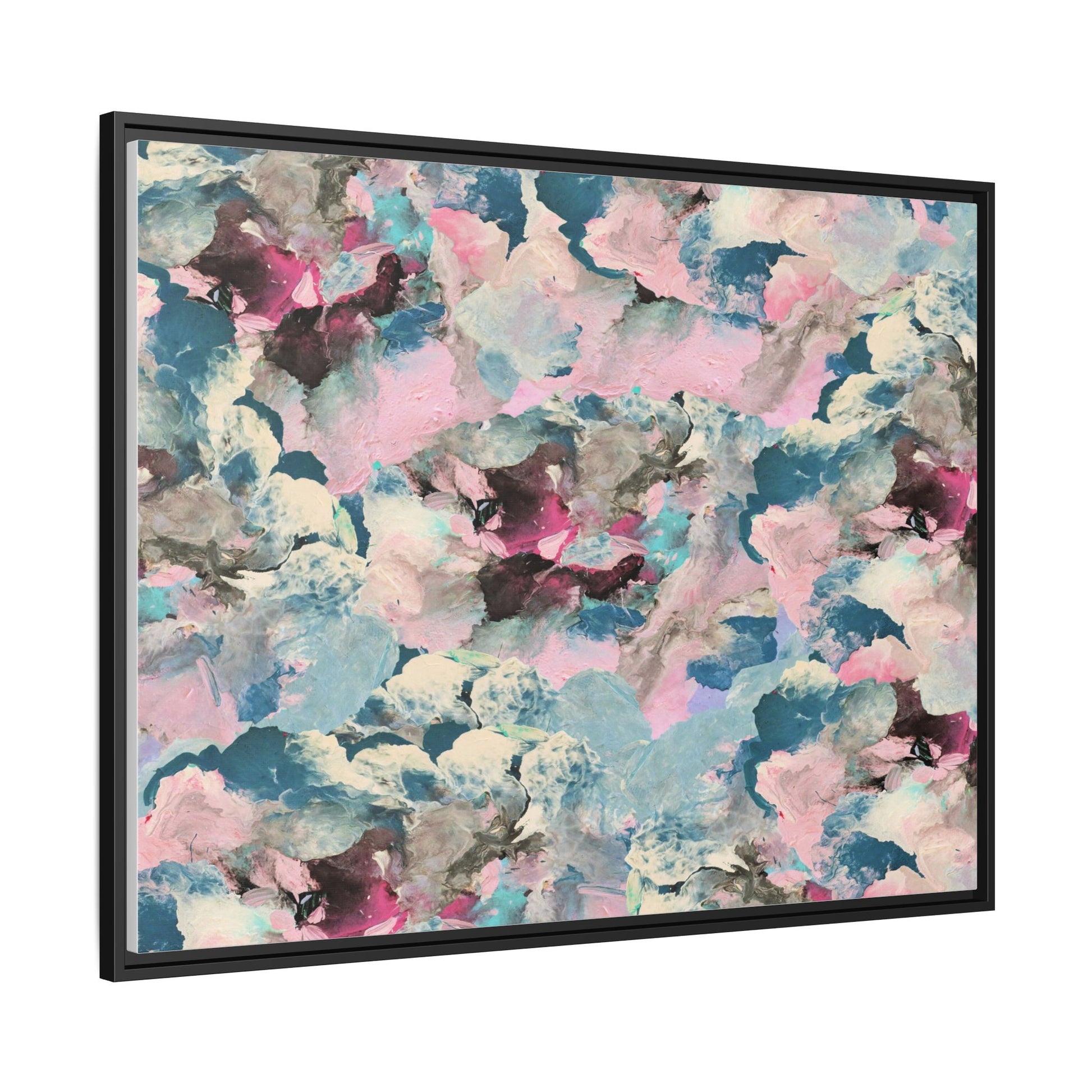 This abstract art piece showcases a mesmerizing blend of soft, ethereal colors including pink, blue, teal, white, and deep maroon. The image appears to be a digital or painted artwork with fluid, overlapping brushstrokes that create a dreamy, cloud-like texture and composition. Each color seems to blend and merge into the next, creating organic shapes and a sense of movement and depth across the entire canvas. The style resembles a watercolor or digital painting technique, with layers of color that seem to drift and flow into one another like a complex, emotional landscape. The overall effect is both calming and dynamic, inviting viewers to explore the intricate details and subtle color transitions within the artwork.