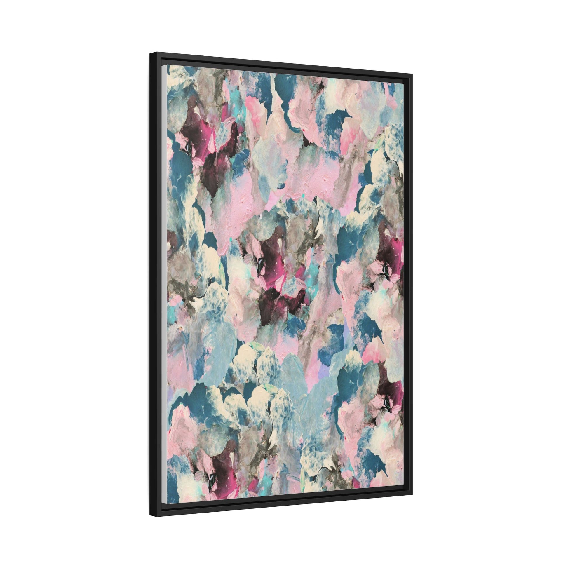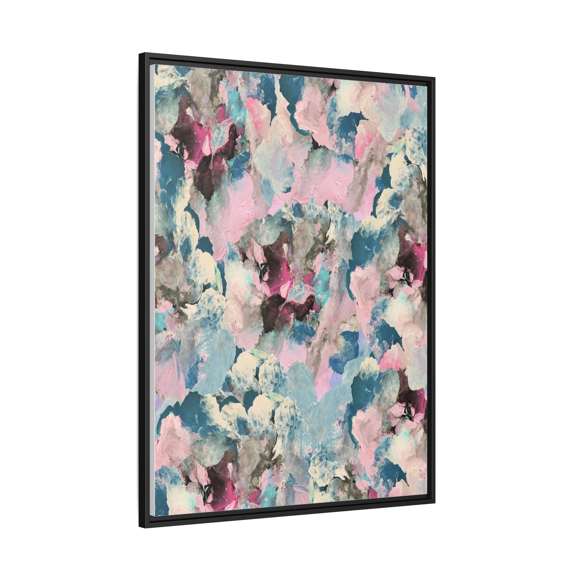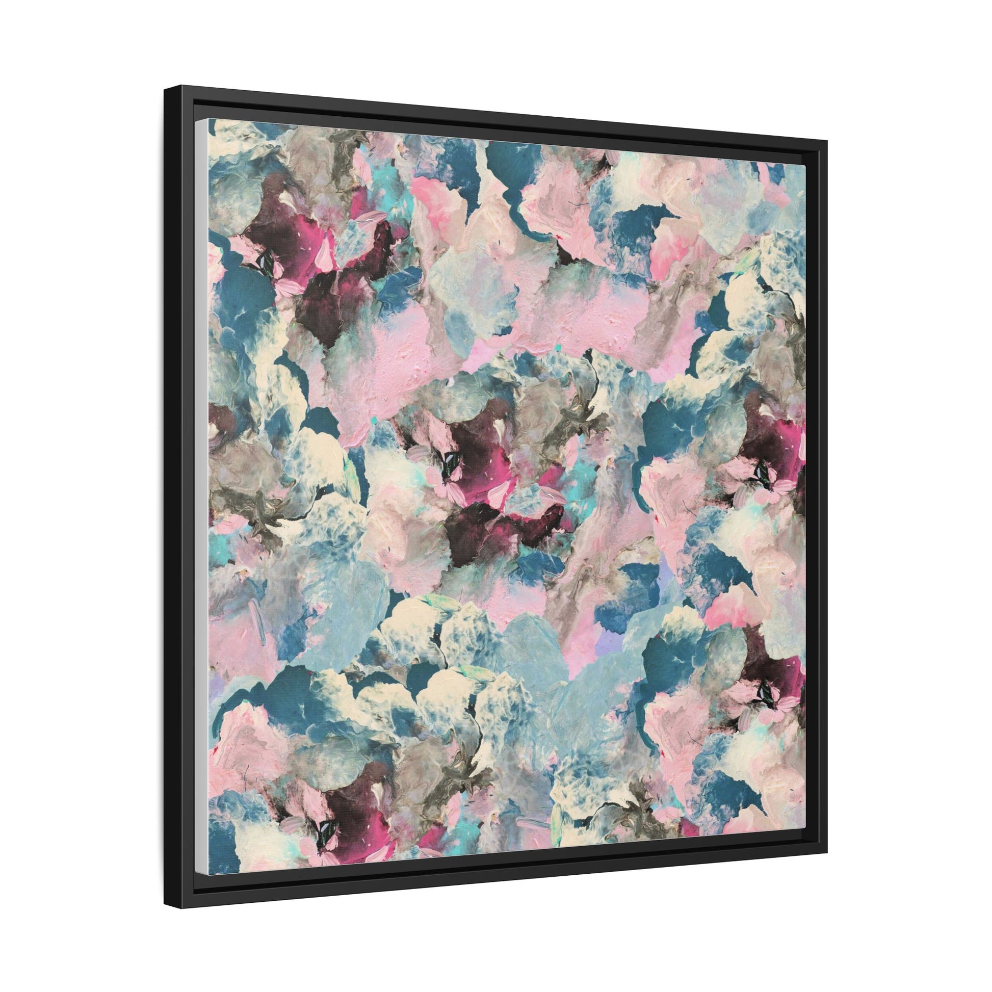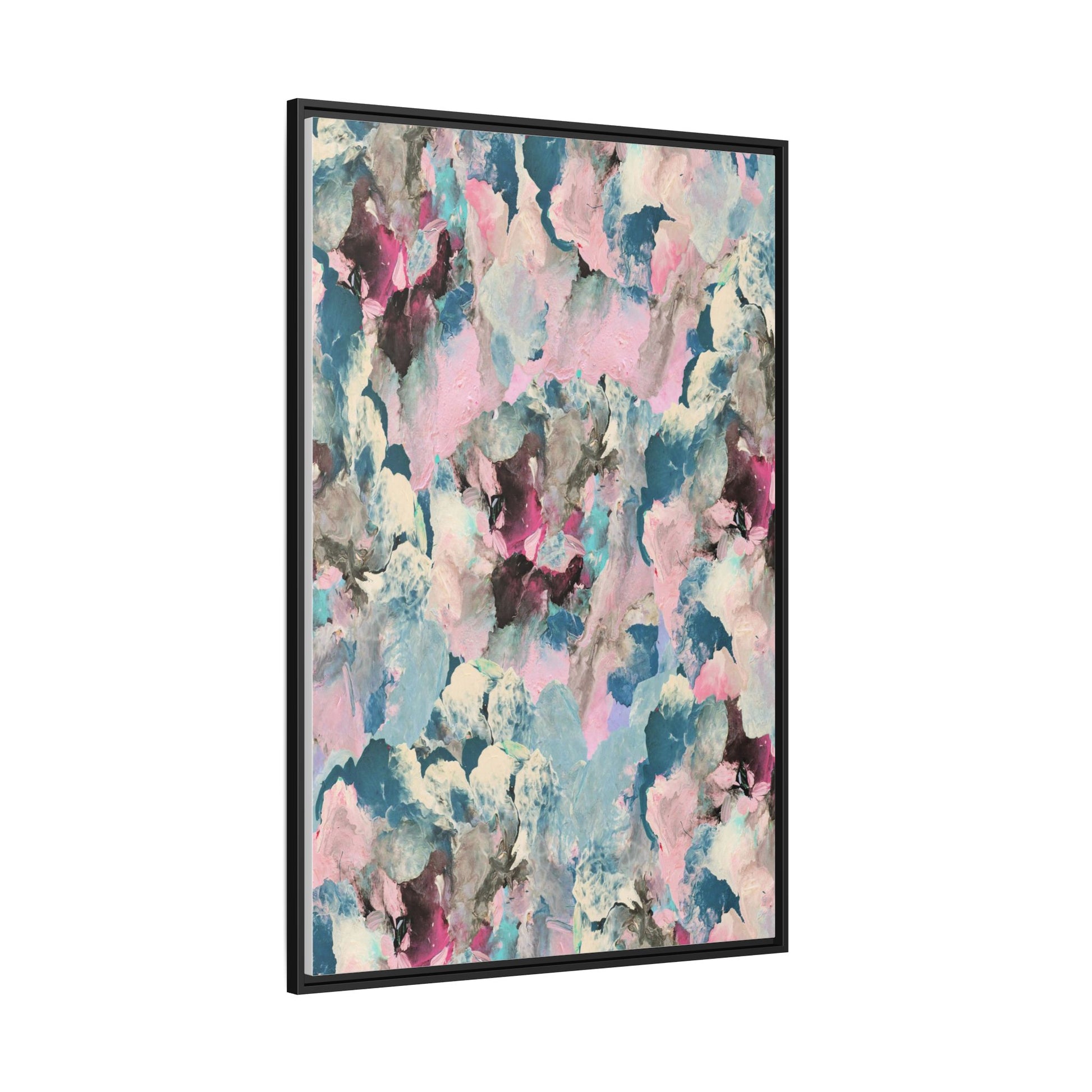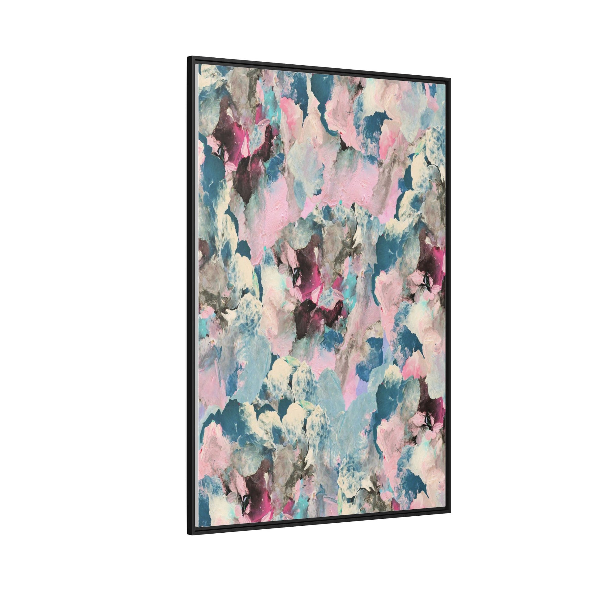 This abstract art piece showcases a mesmerizing blend of soft, ethereal colors including pink, blue, teal, white, and deep maroon. The image appears to be a digital or painted artwork with fluid, overlapping brushstrokes that create a dreamy, cloud-like texture and composition. Each color seems to blend and merge into the next, creating organic shapes and a sense of movement and depth across the entire canvas. The style resembles a watercolor or digital painting technique, with layers of color that seem to drift and flow into one another like a complex, emotional landscape. The overall effect is both calming and dynamic, inviting viewers to explore the intricate details and subtle color transitions within the artwork.