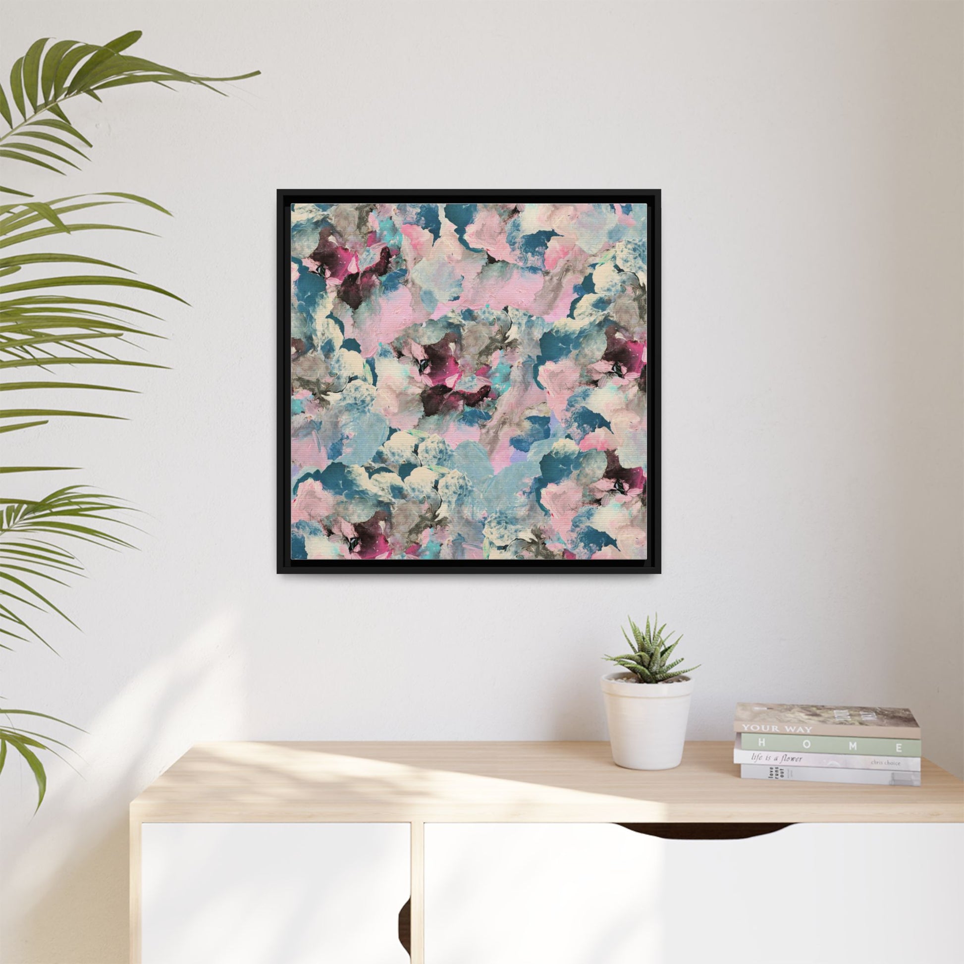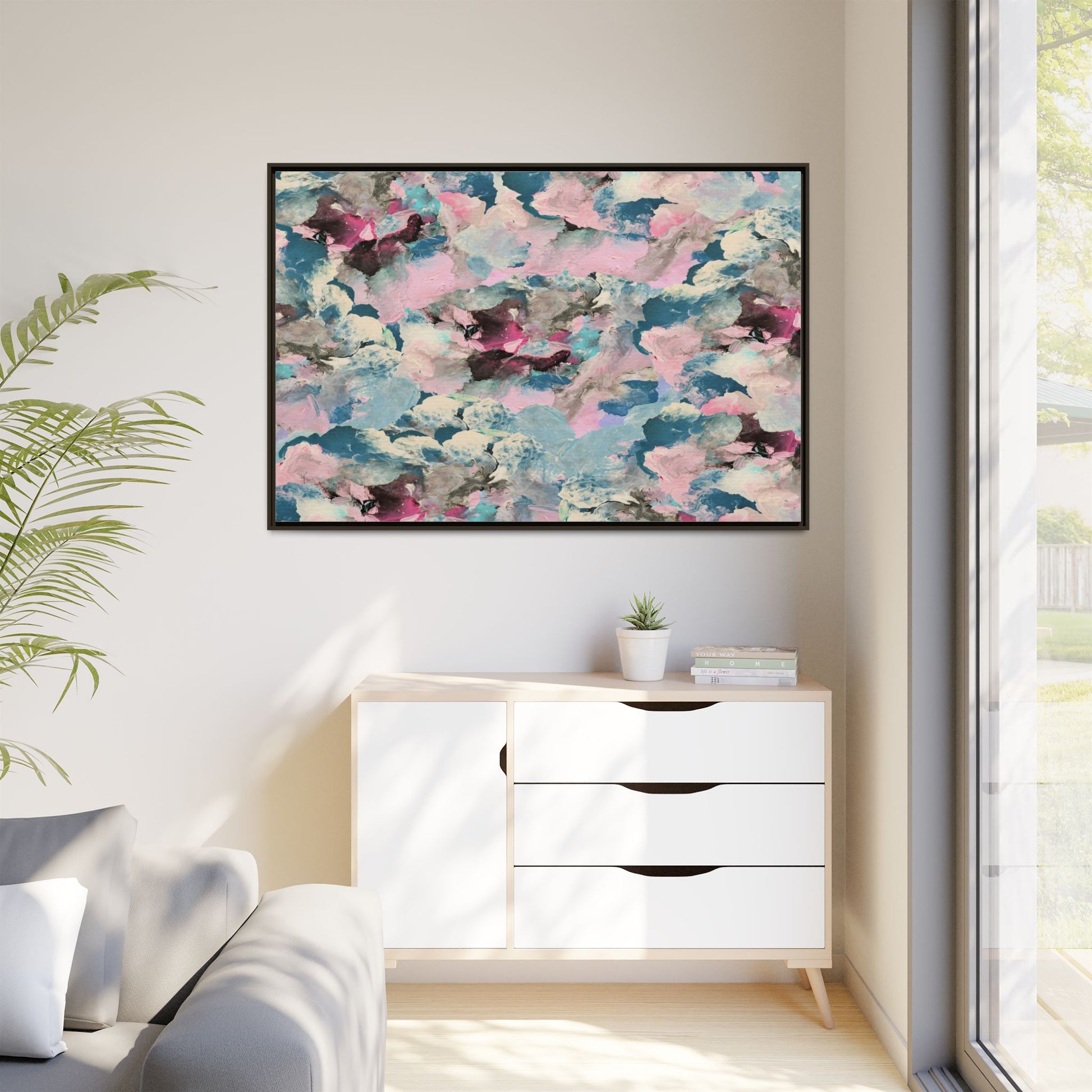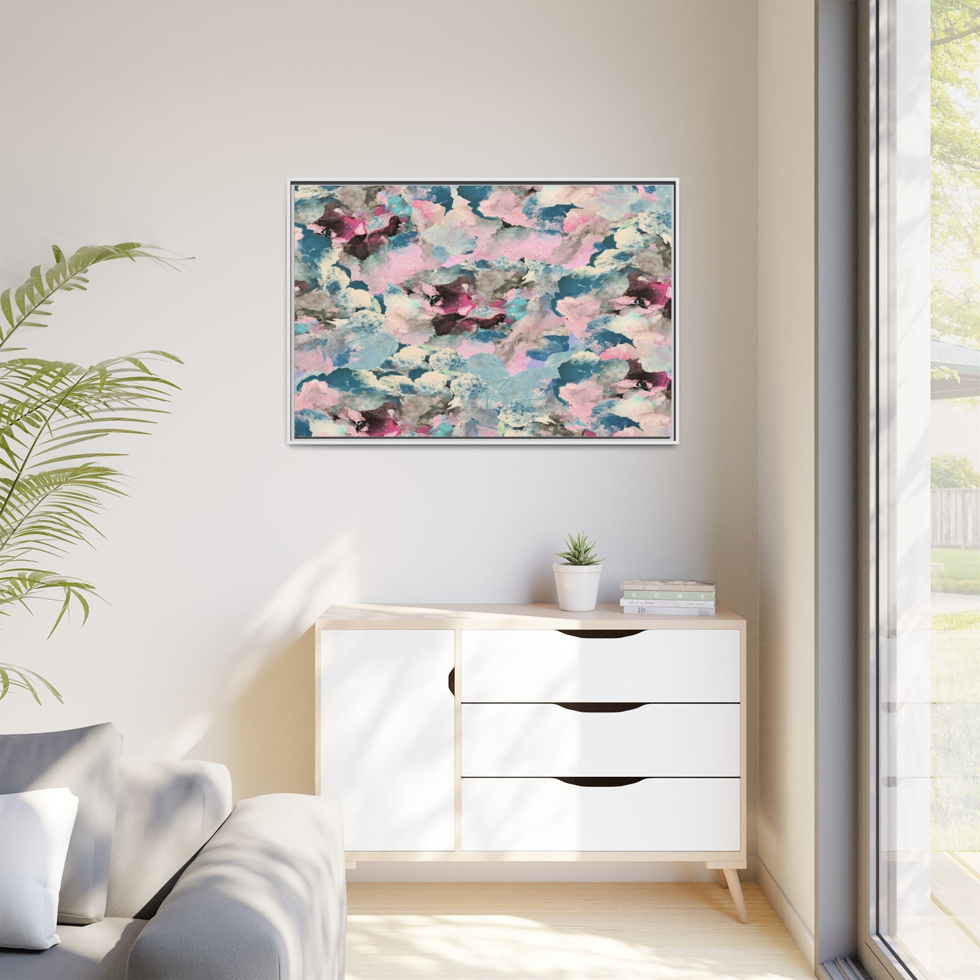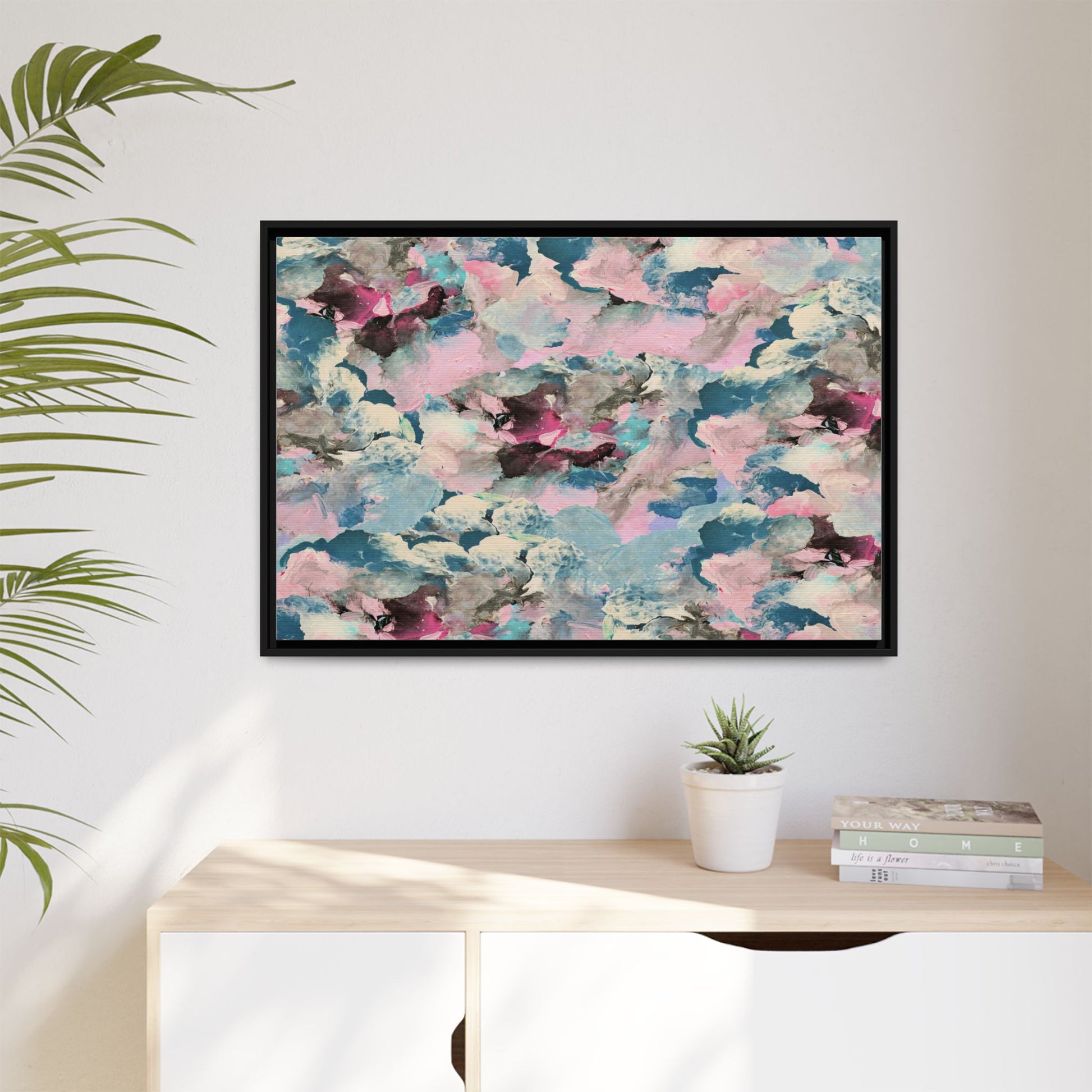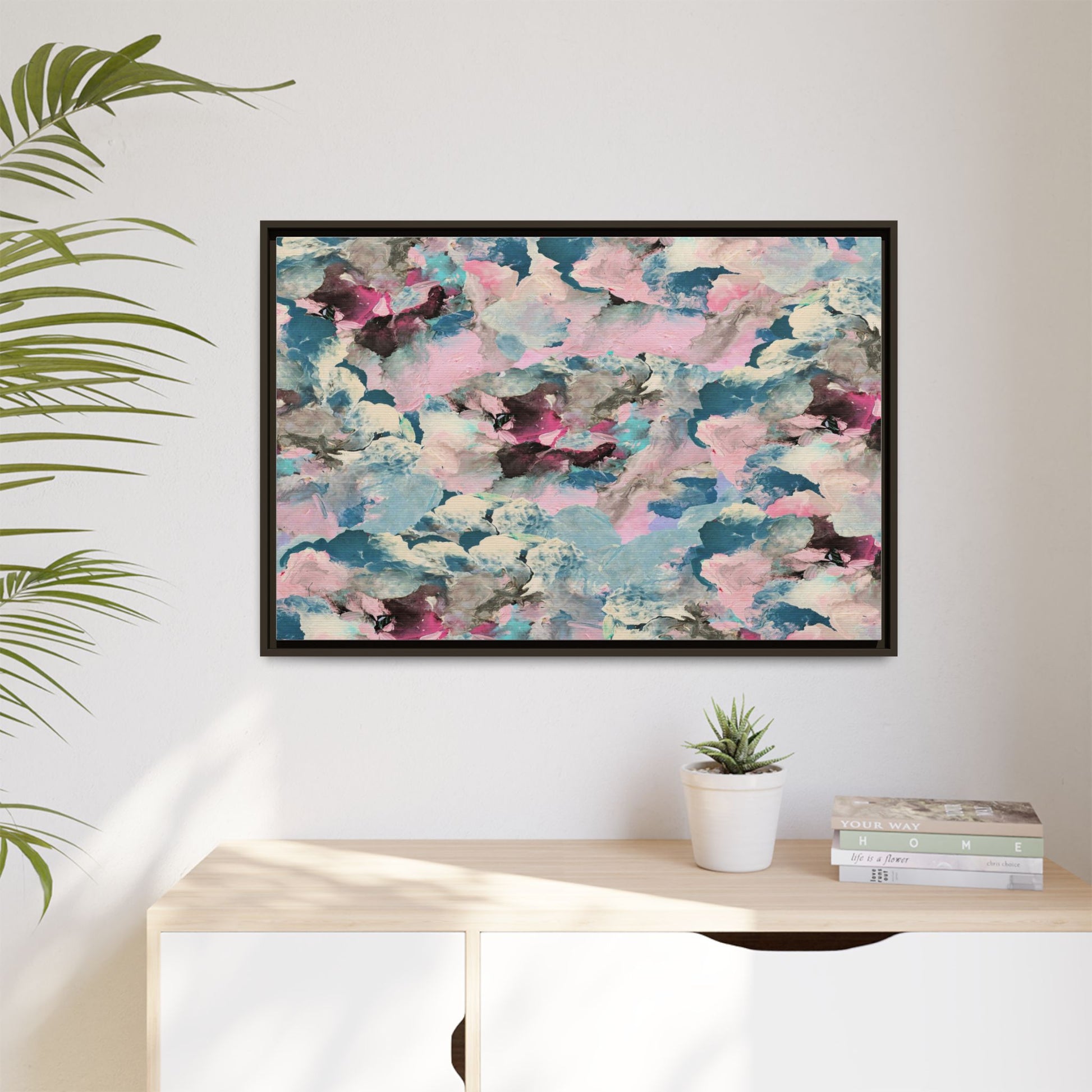 This abstract art piece showcases a mesmerizing blend of soft, ethereal colors including pink, blue, teal, white, and deep maroon. The image appears to be a digital or painted artwork with fluid, overlapping brushstrokes that create a dreamy, cloud-like texture and composition. Each color seems to blend and merge into the next, creating organic shapes and a sense of movement and depth across the entire canvas. The style resembles a watercolor or digital painting technique, with layers of color that seem to drift and flow into one another like a complex, emotional landscape. The overall effect is both calming and dynamic, inviting viewers to explore the intricate details and subtle color transitions within the artwork.