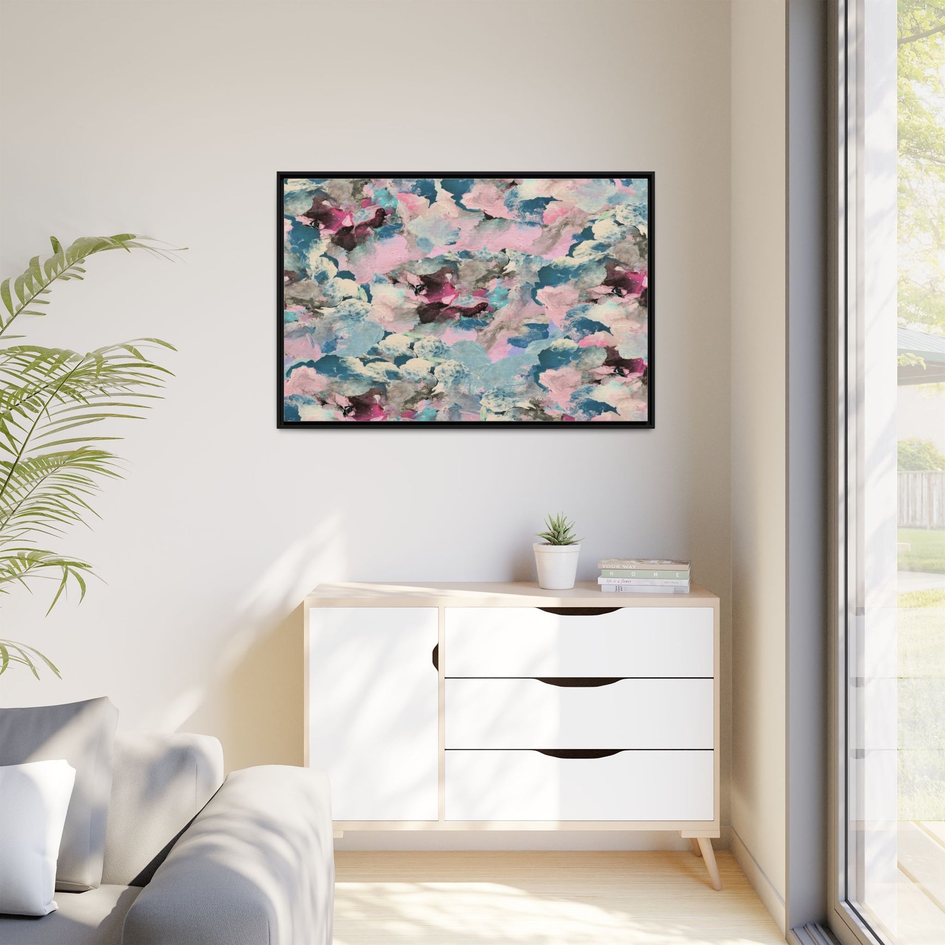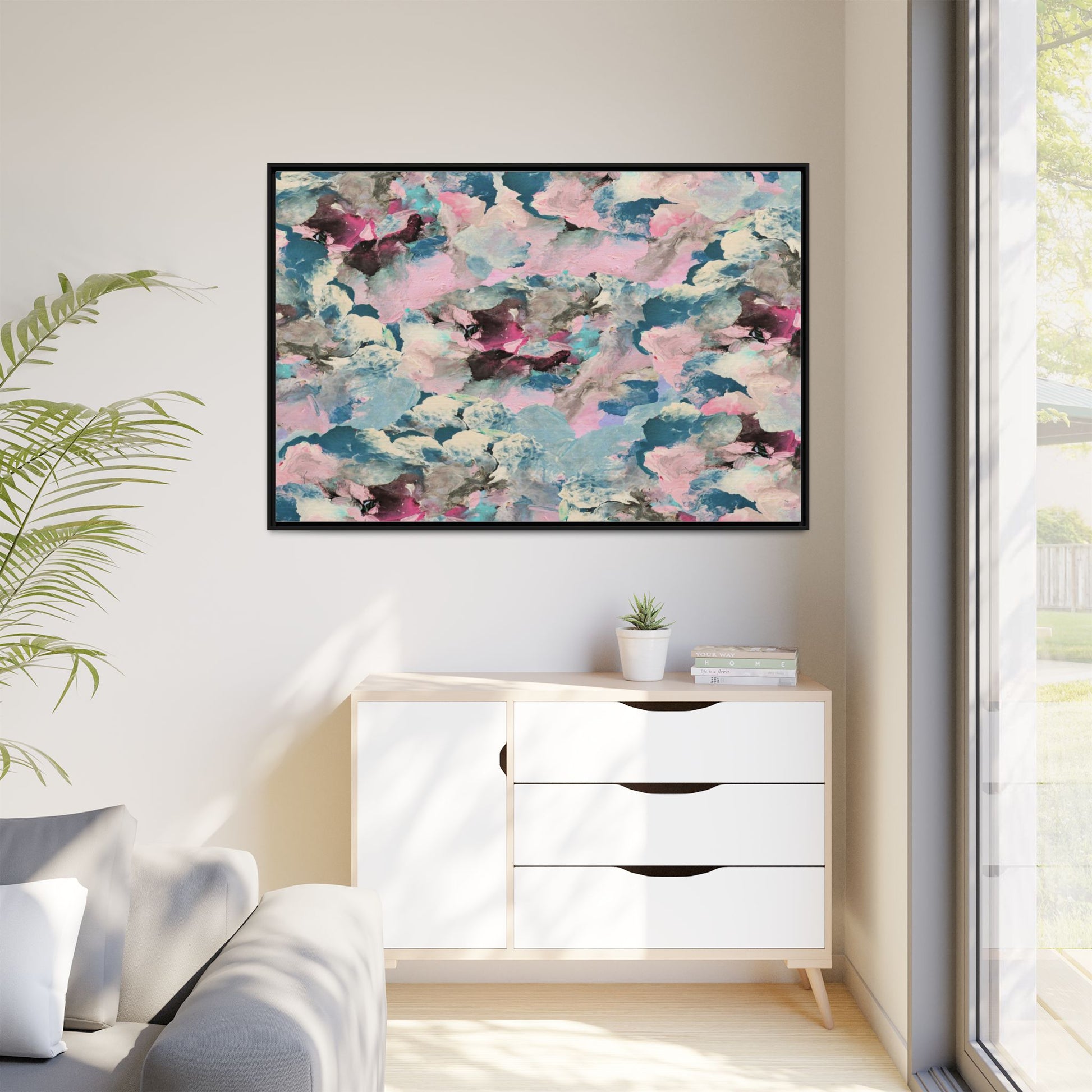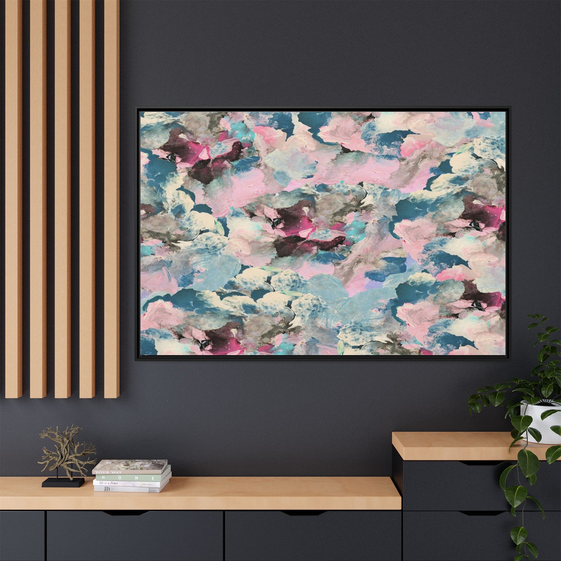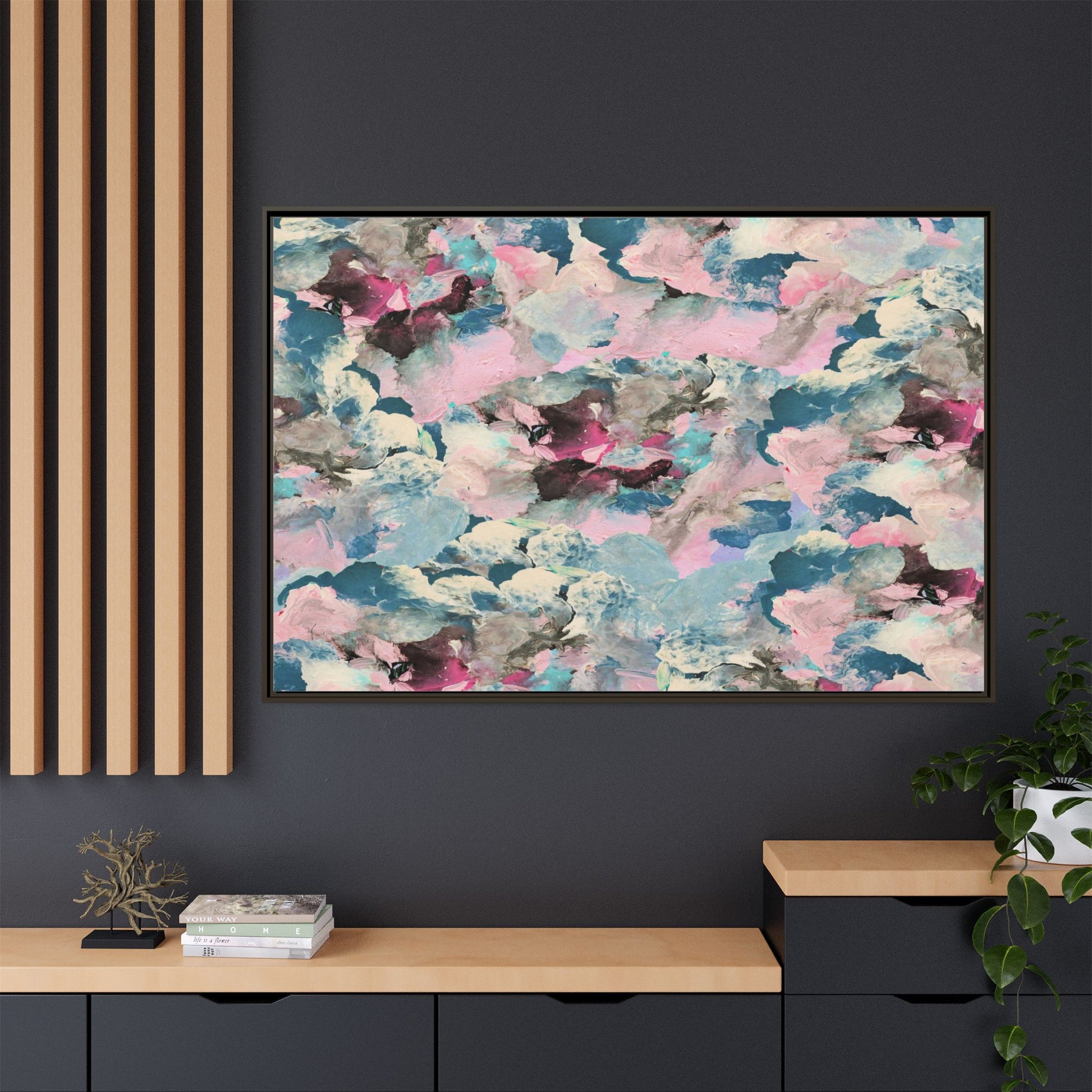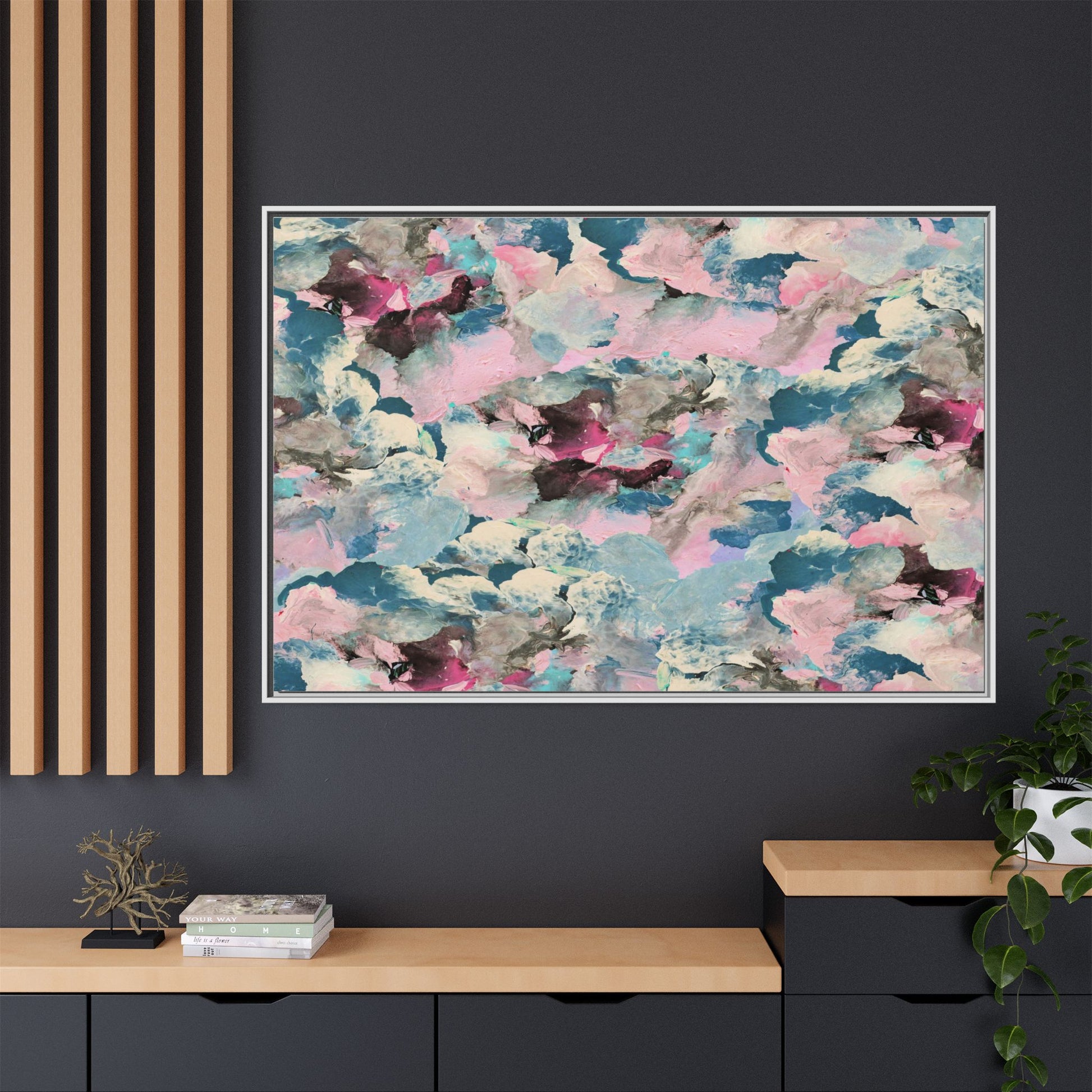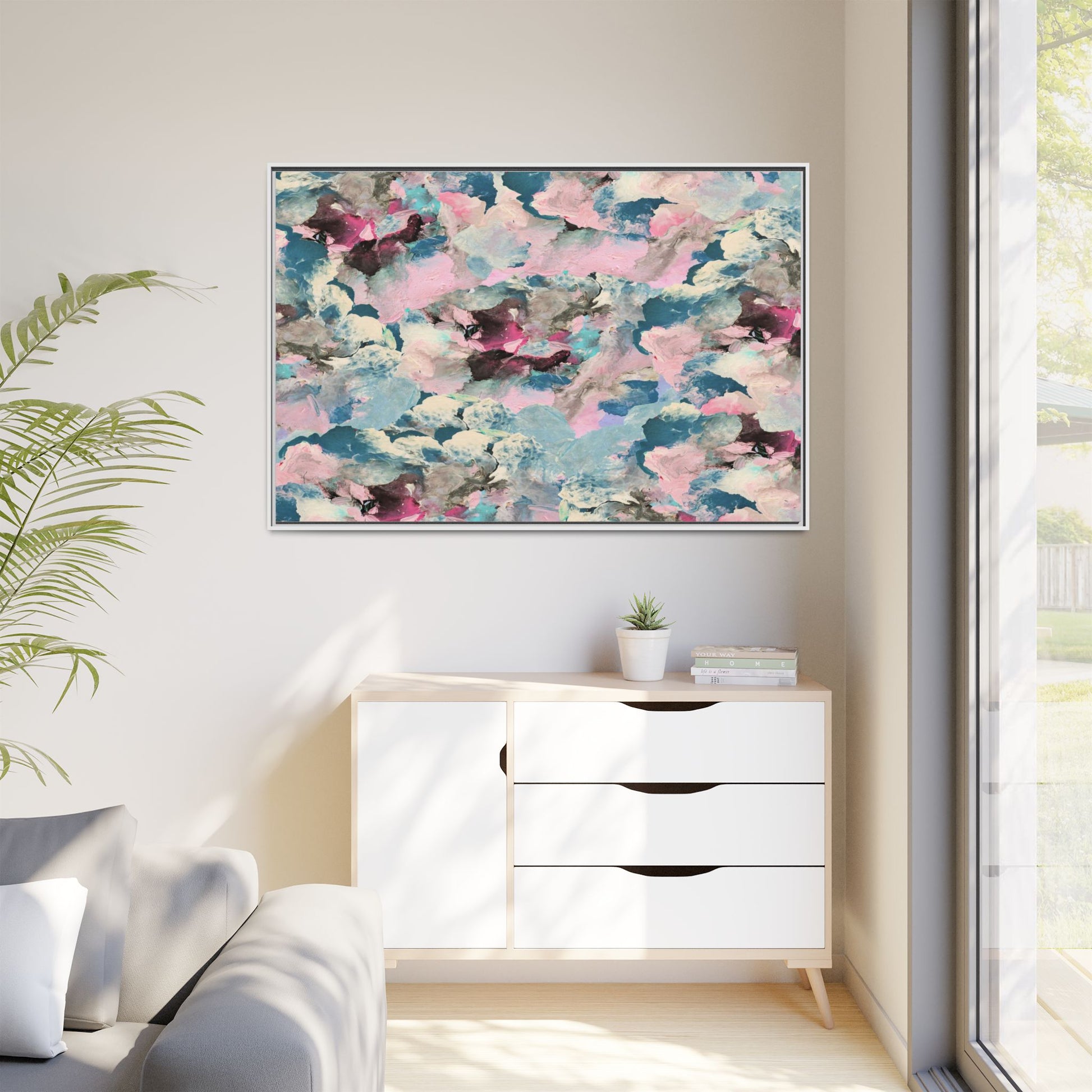 This abstract art piece showcases a mesmerizing blend of soft, ethereal colors including pink, blue, teal, white, and deep maroon. The image appears to be a digital or painted artwork with fluid, overlapping brushstrokes that create a dreamy, cloud-like texture and composition. Each color seems to blend and merge into the next, creating organic shapes and a sense of movement and depth across the entire canvas. The style resembles a watercolor or digital painting technique, with layers of color that seem to drift and flow into one another like a complex, emotional landscape. The overall effect is both calming and dynamic, inviting viewers to explore the intricate details and subtle color transitions within the artwork.