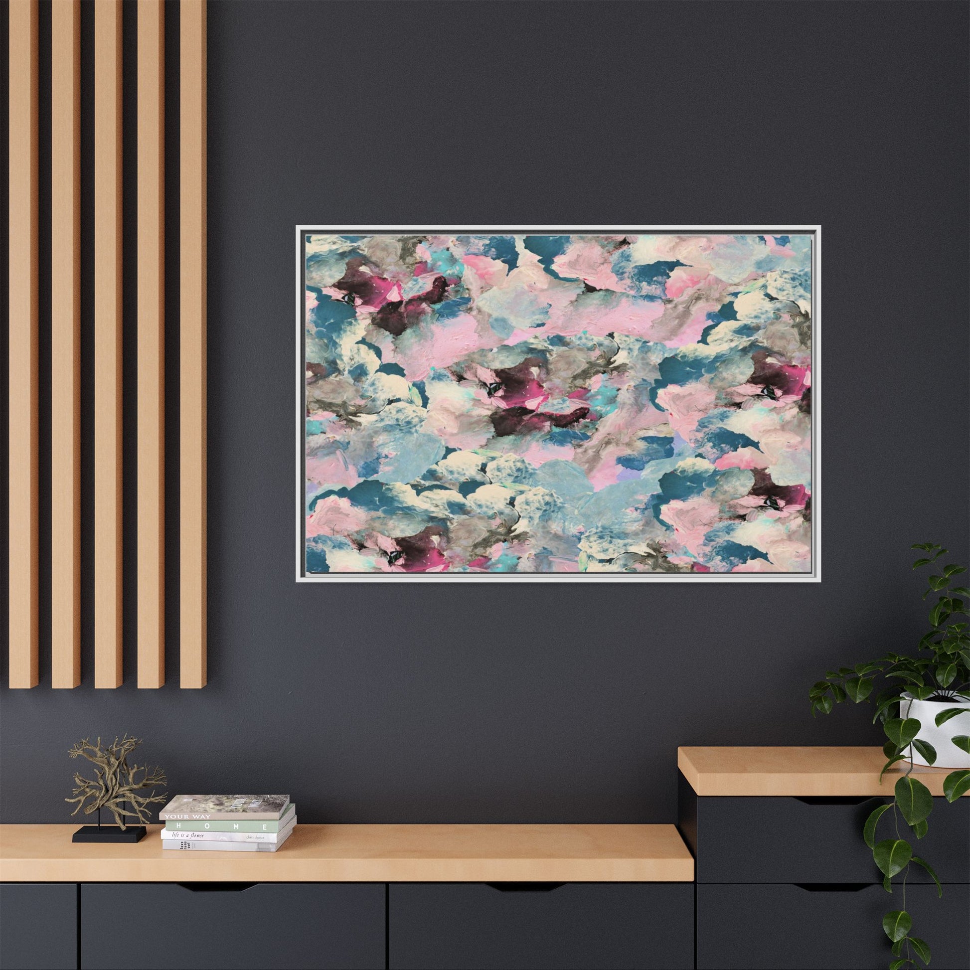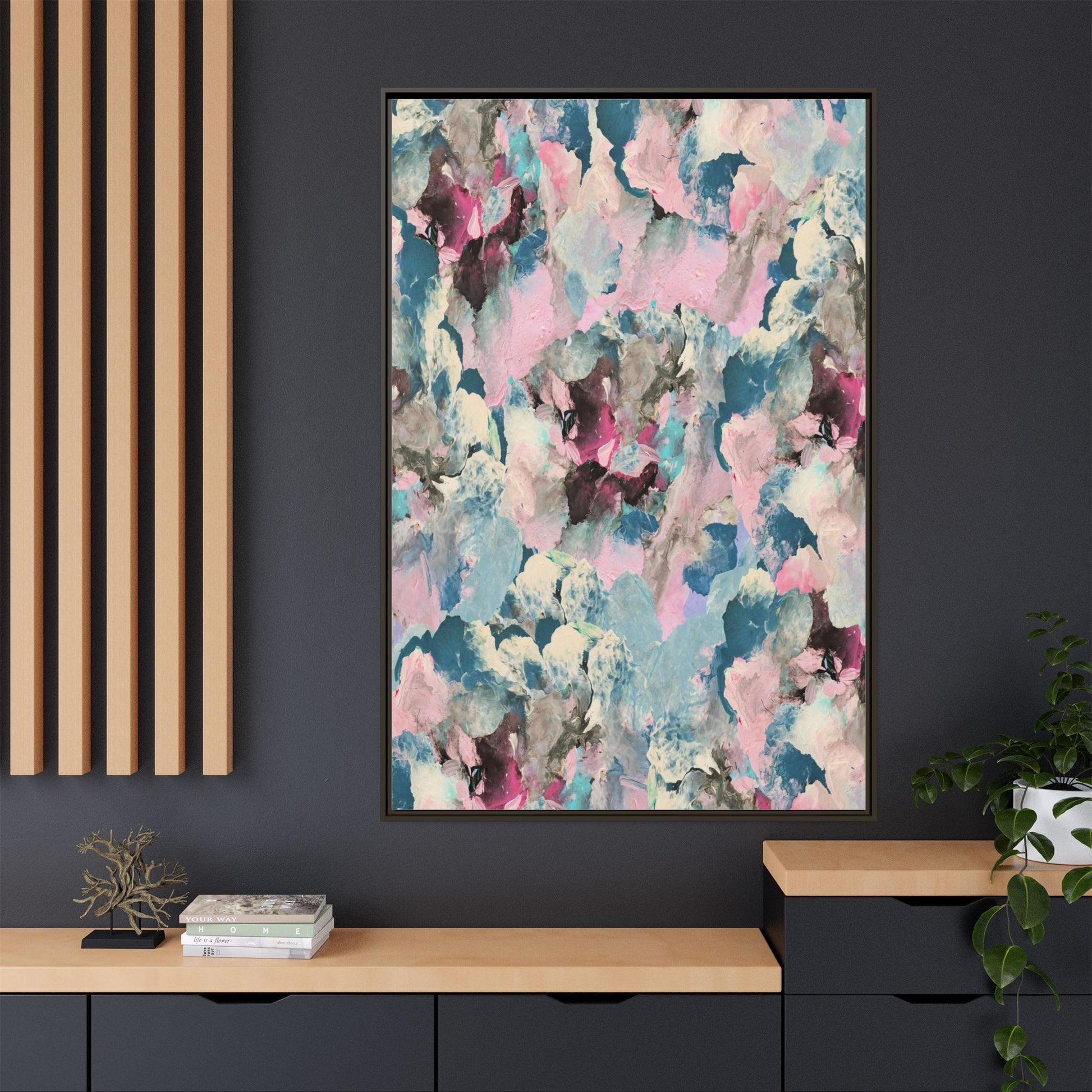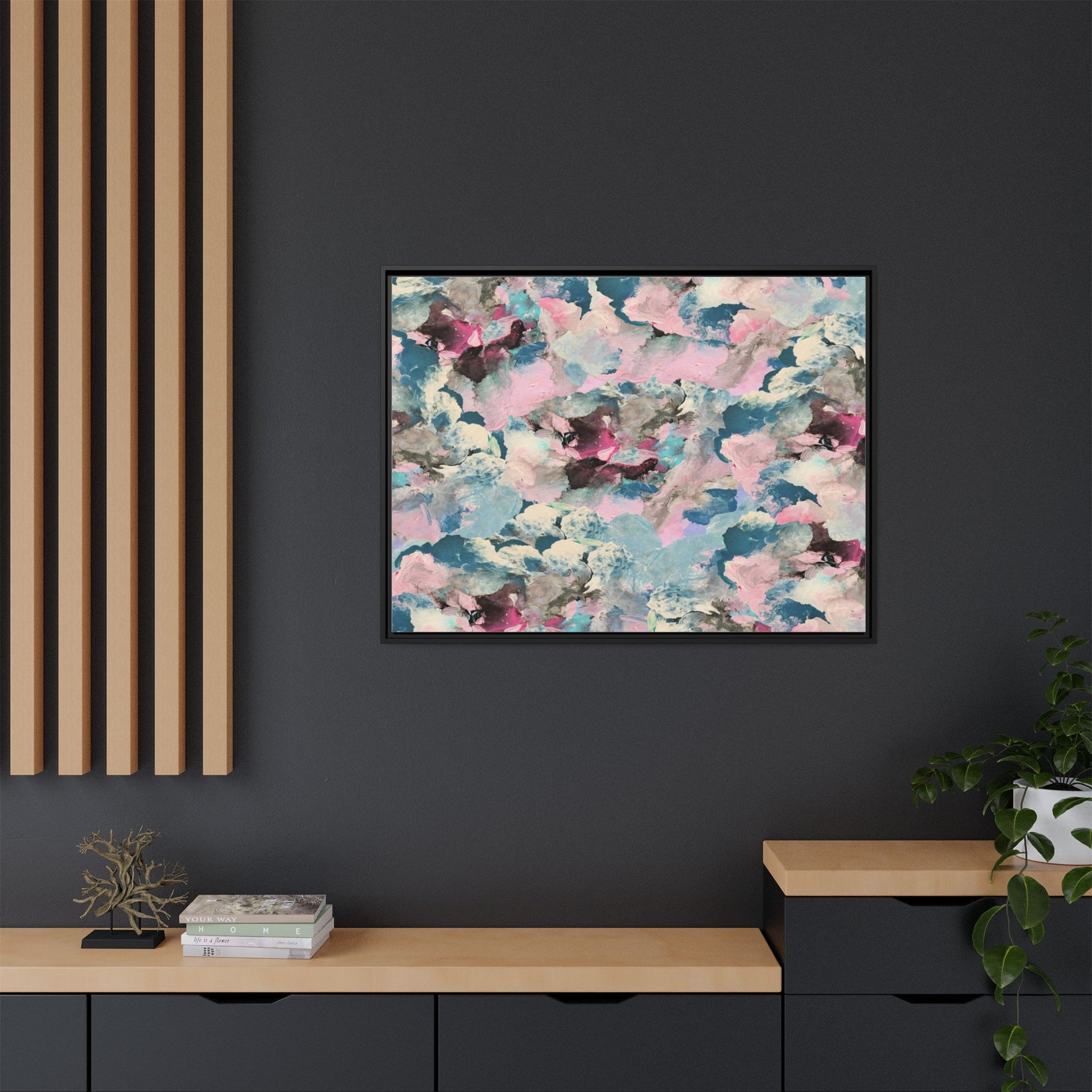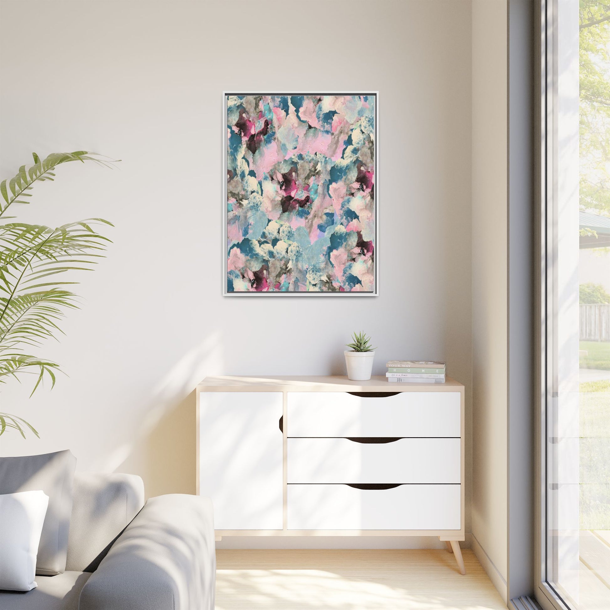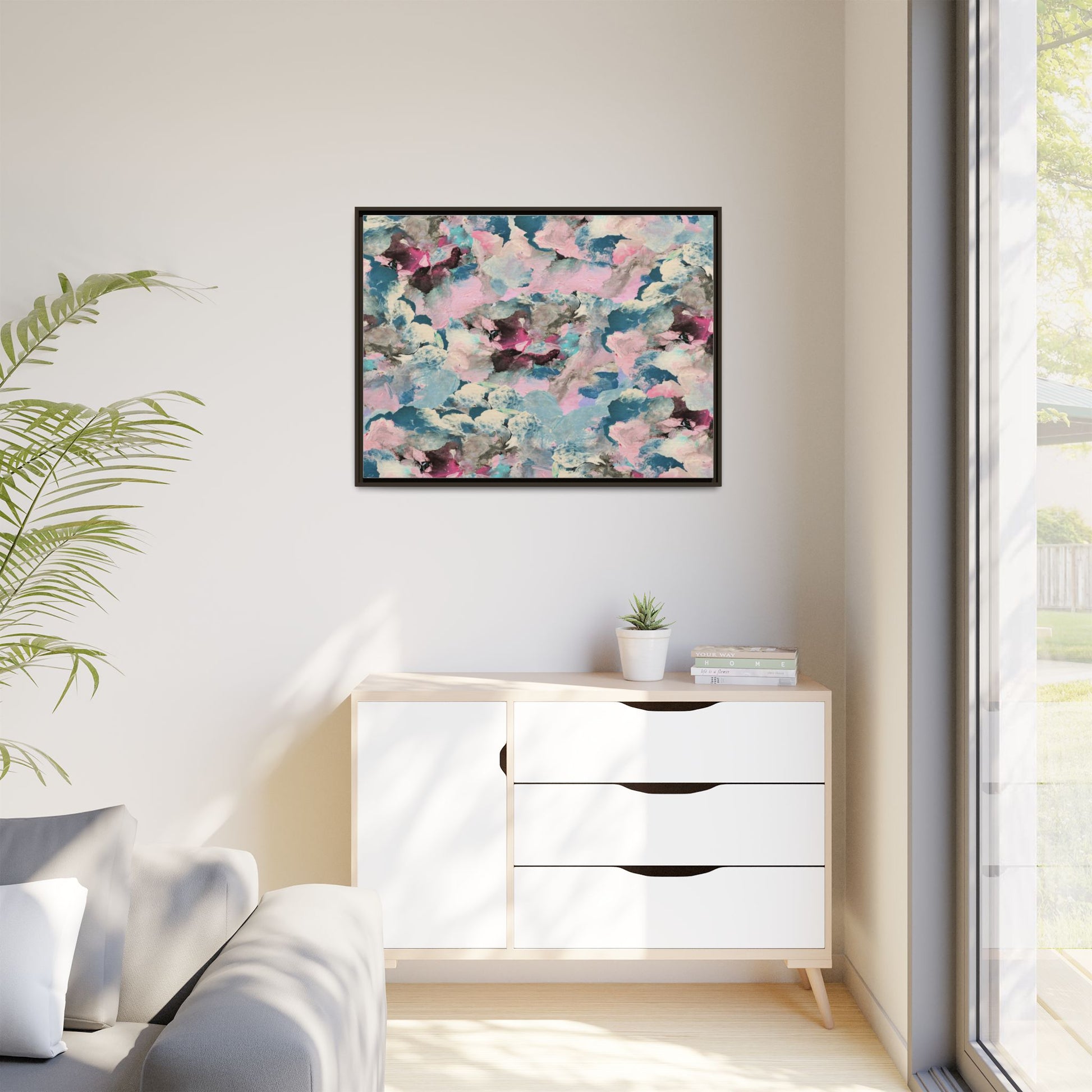 This abstract art piece showcases a mesmerizing blend of soft, ethereal colors including pink, blue, teal, white, and deep maroon. The image appears to be a digital or painted artwork with fluid, overlapping brushstrokes that create a dreamy, cloud-like texture and composition. Each color seems to blend and merge into the next, creating organic shapes and a sense of movement and depth across the entire canvas. The style resembles a watercolor or digital painting technique, with layers of color that seem to drift and flow into one another like a complex, emotional landscape. The overall effect is both calming and dynamic, inviting viewers to explore the intricate details and subtle color transitions within the artwork.