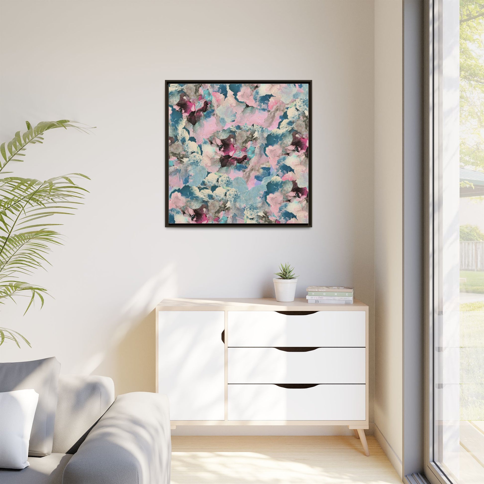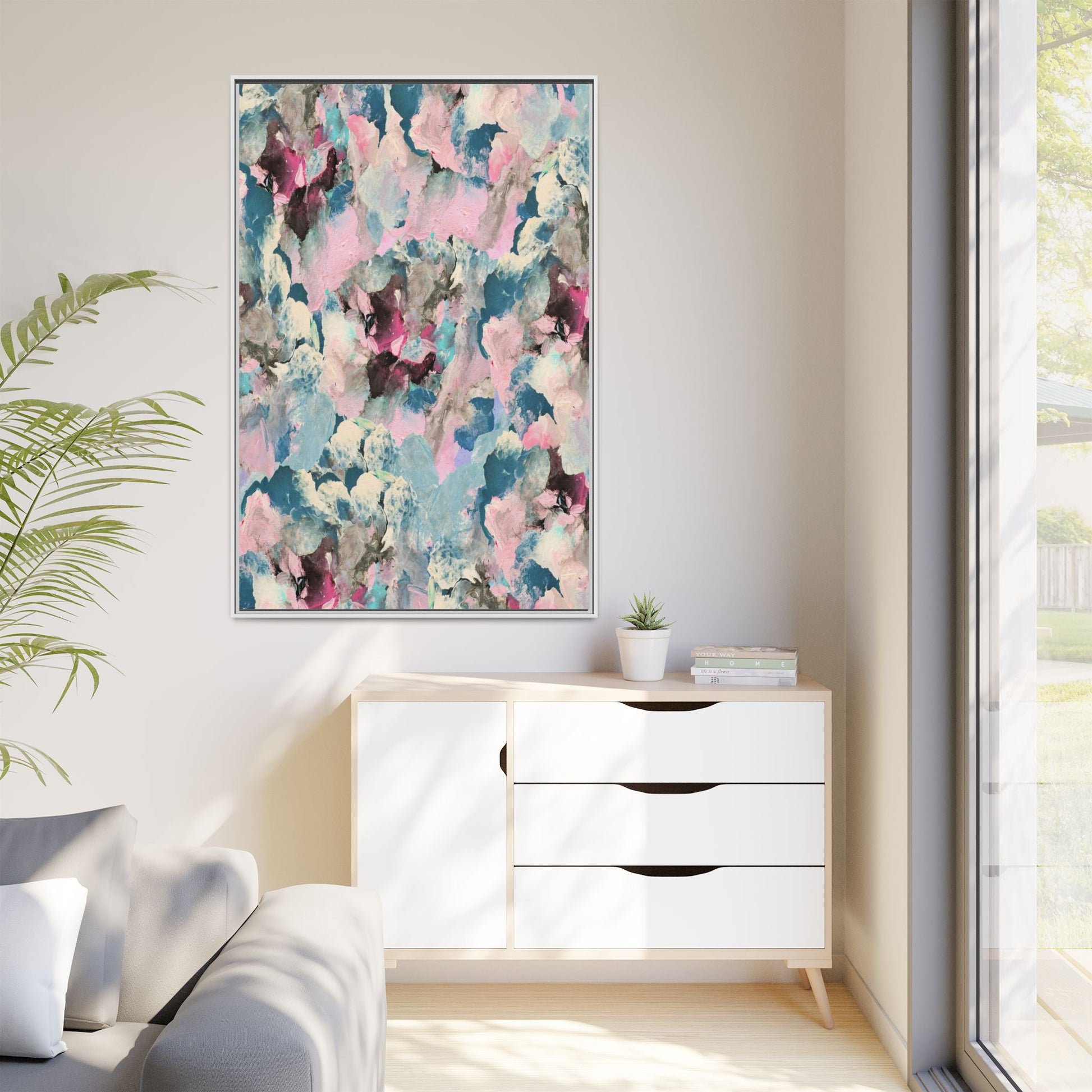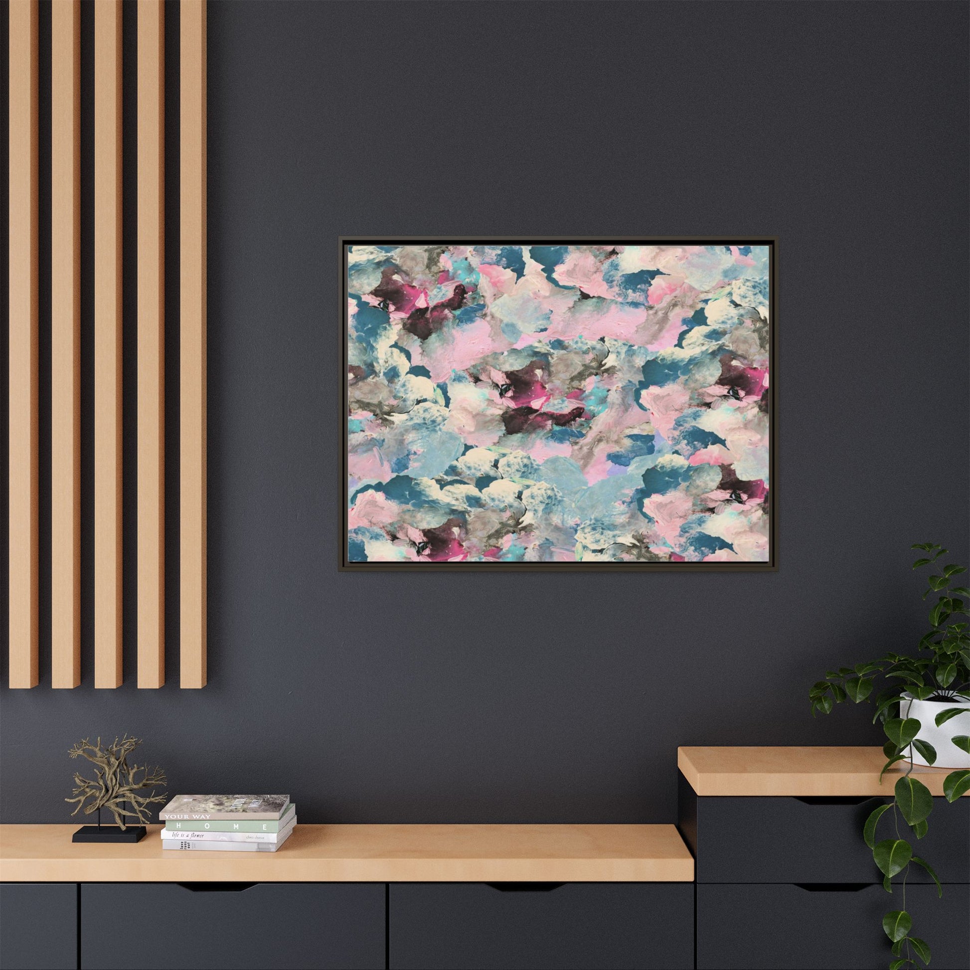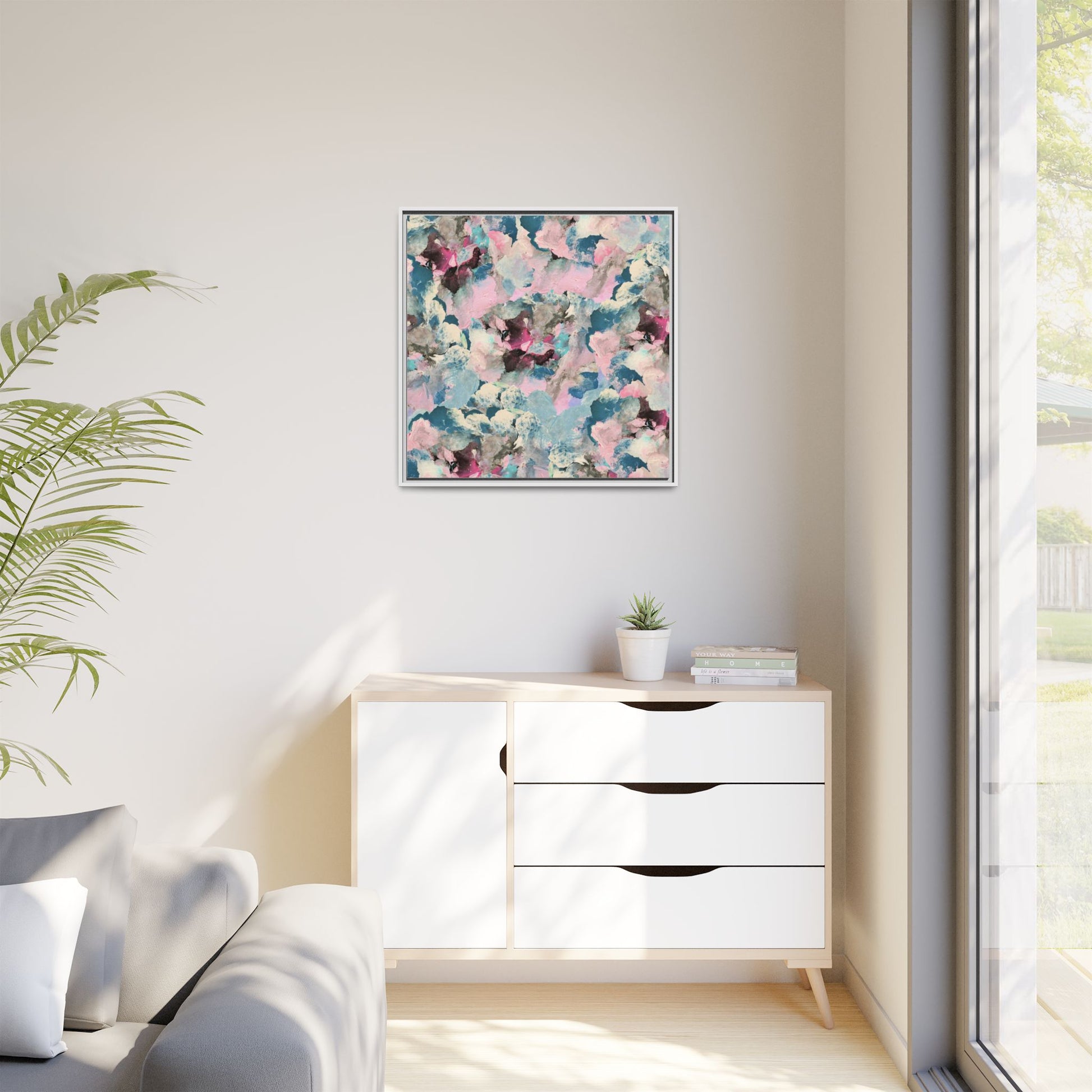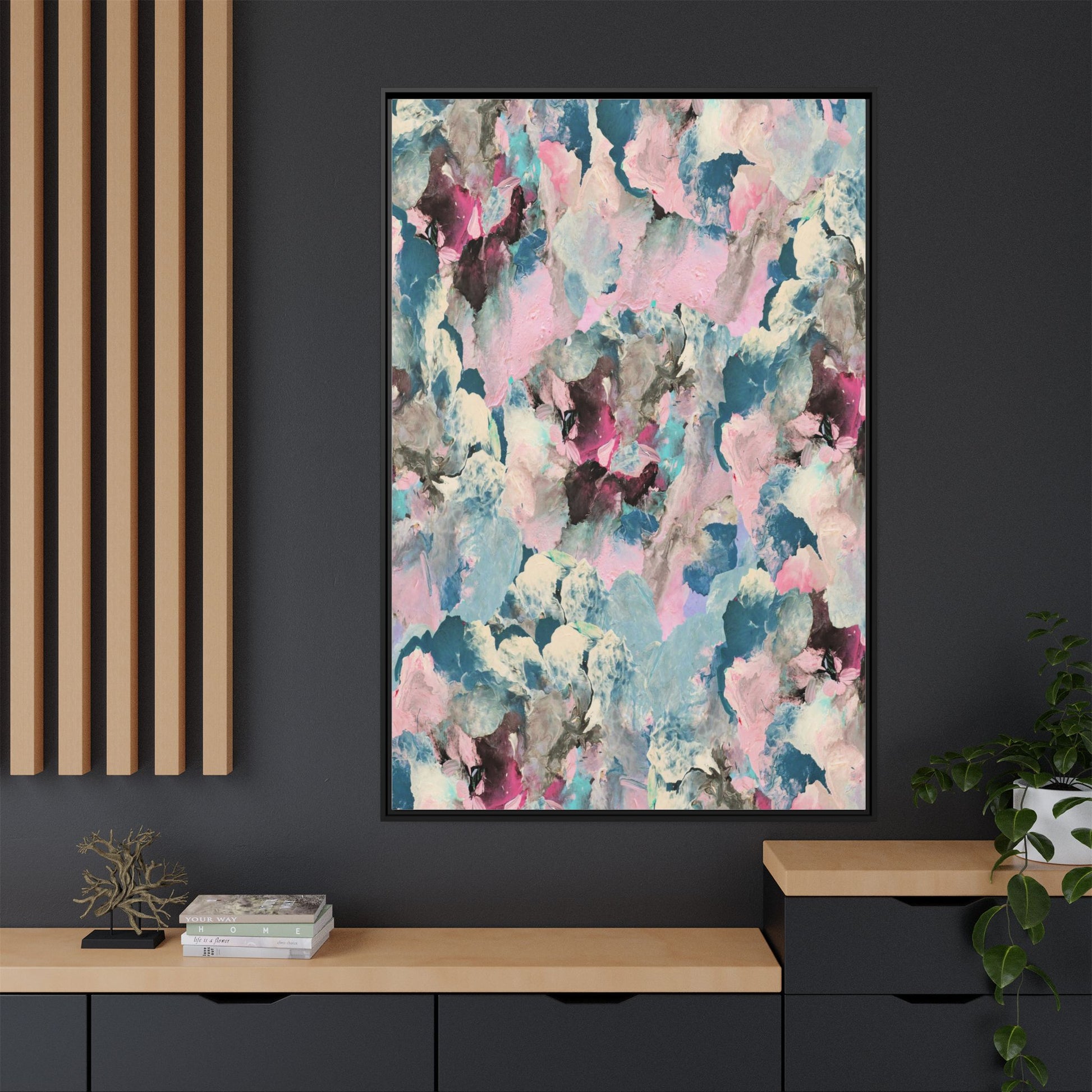 This abstract art piece showcases a mesmerizing blend of soft, ethereal colors including pink, blue, teal, white, and deep maroon. The image appears to be a digital or painted artwork with fluid, overlapping brushstrokes that create a dreamy, cloud-like texture and composition. Each color seems to blend and merge into the next, creating organic shapes and a sense of movement and depth across the entire canvas. The style resembles a watercolor or digital painting technique, with layers of color that seem to drift and flow into one another like a complex, emotional landscape. The overall effect is both calming and dynamic, inviting viewers to explore the intricate details and subtle color transitions within the artwork.