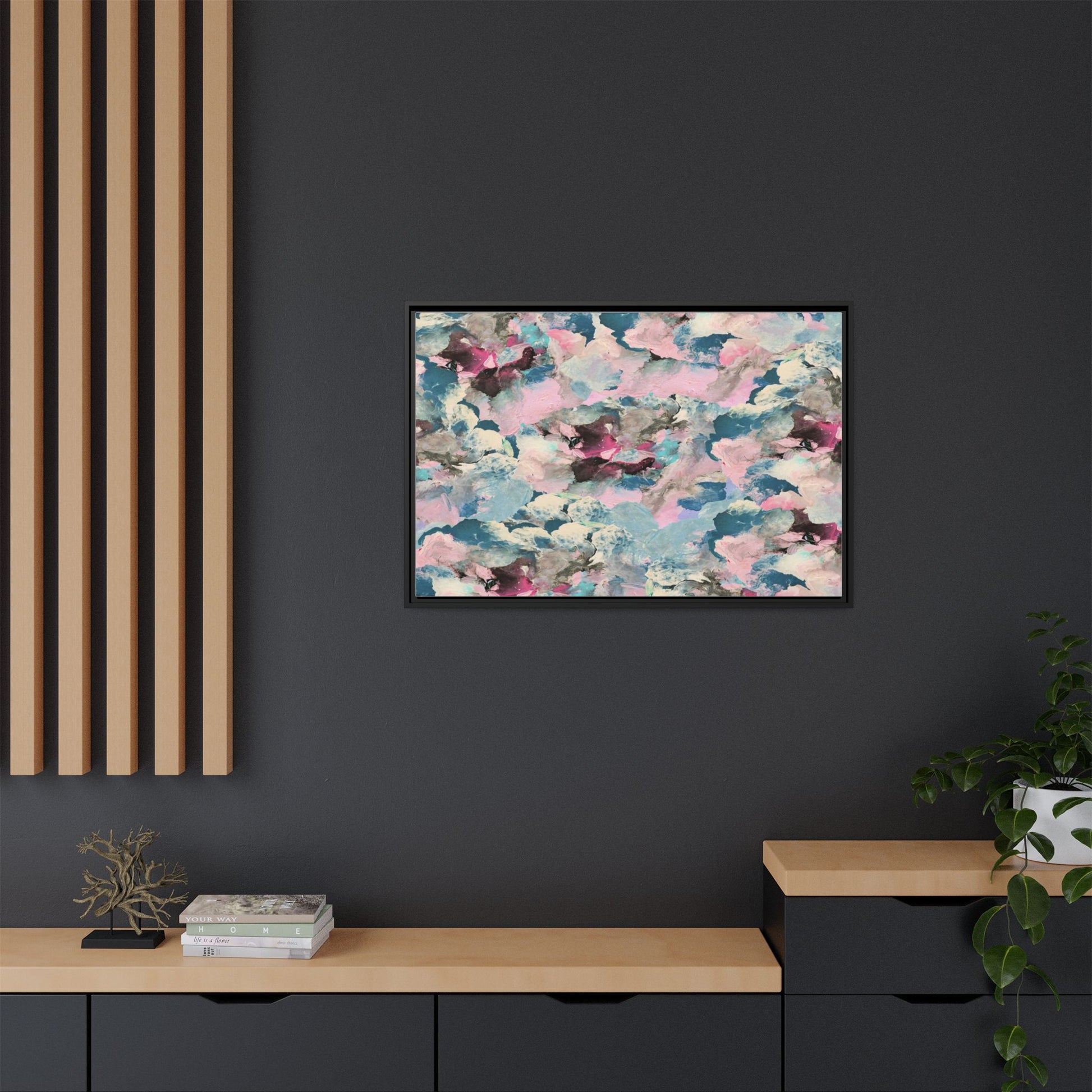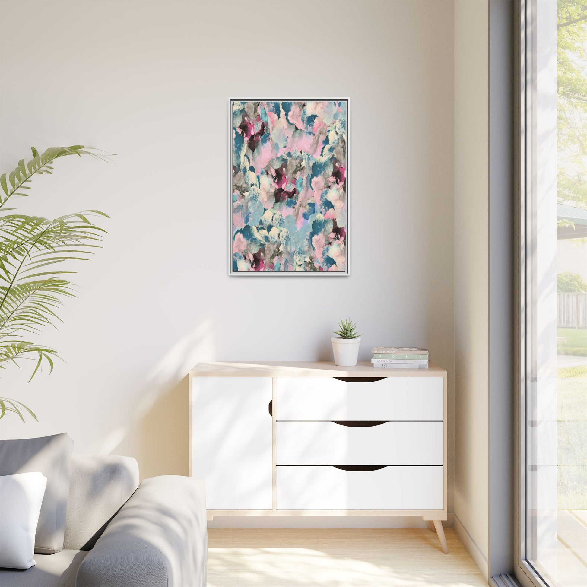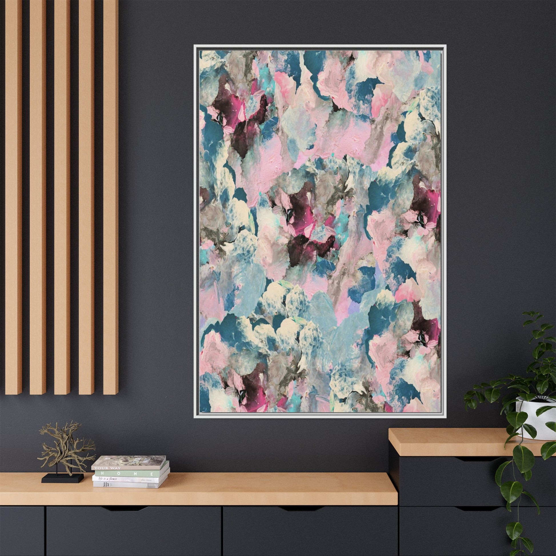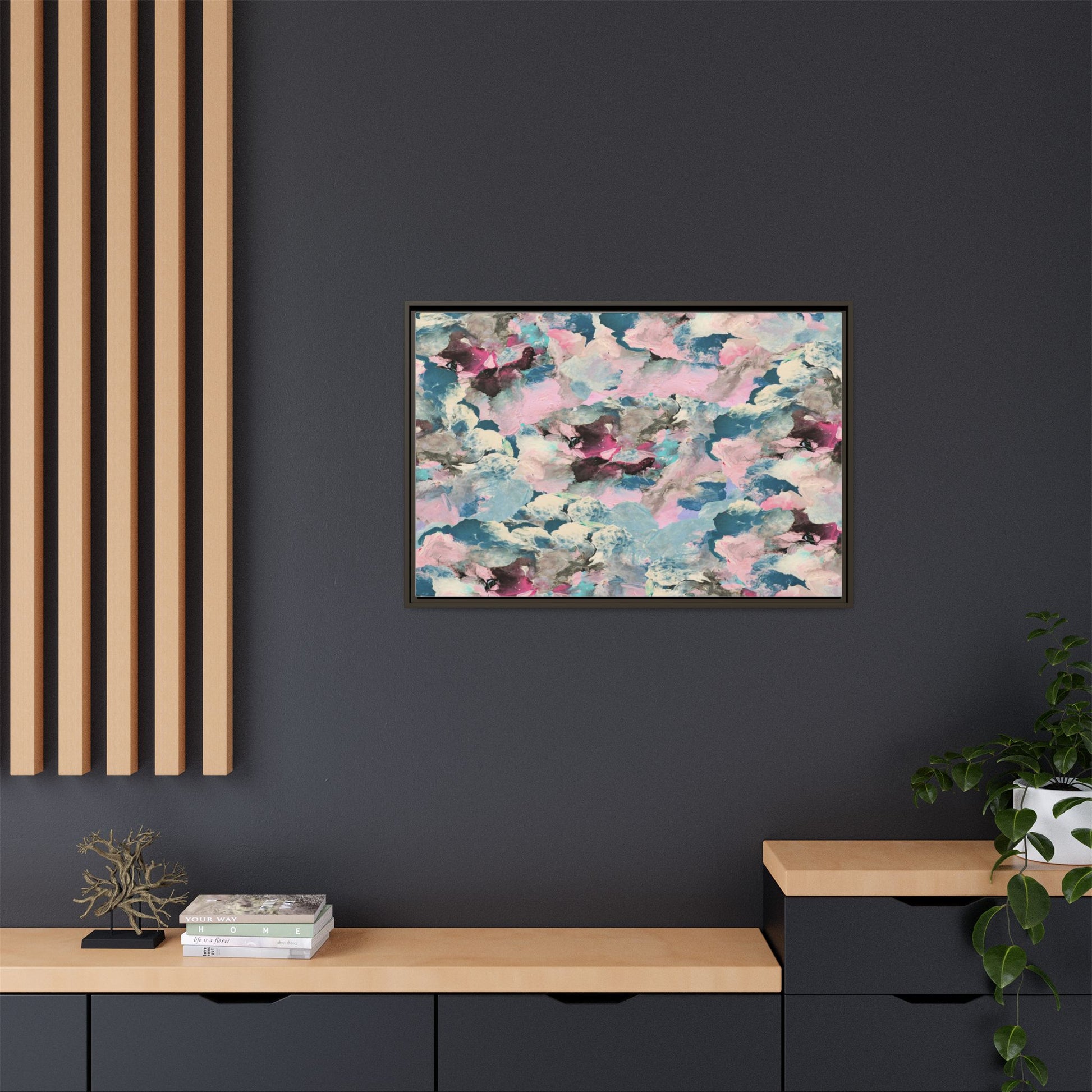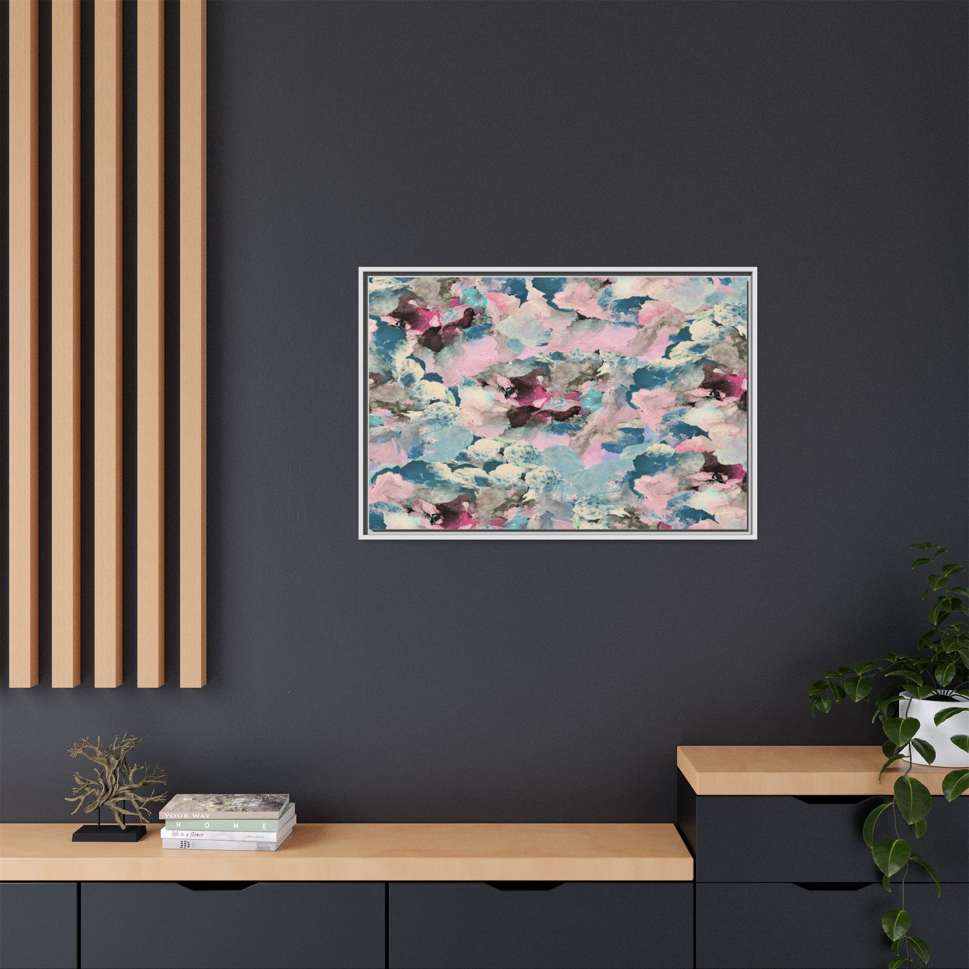 This abstract art piece showcases a mesmerizing blend of soft, ethereal colors including pink, blue, teal, white, and deep maroon. The image appears to be a digital or painted artwork with fluid, overlapping brushstrokes that create a dreamy, cloud-like texture and composition. Each color seems to blend and merge into the next, creating organic shapes and a sense of movement and depth across the entire canvas. The style resembles a watercolor or digital painting technique, with layers of color that seem to drift and flow into one another like a complex, emotional landscape. The overall effect is both calming and dynamic, inviting viewers to explore the intricate details and subtle color transitions within the artwork.