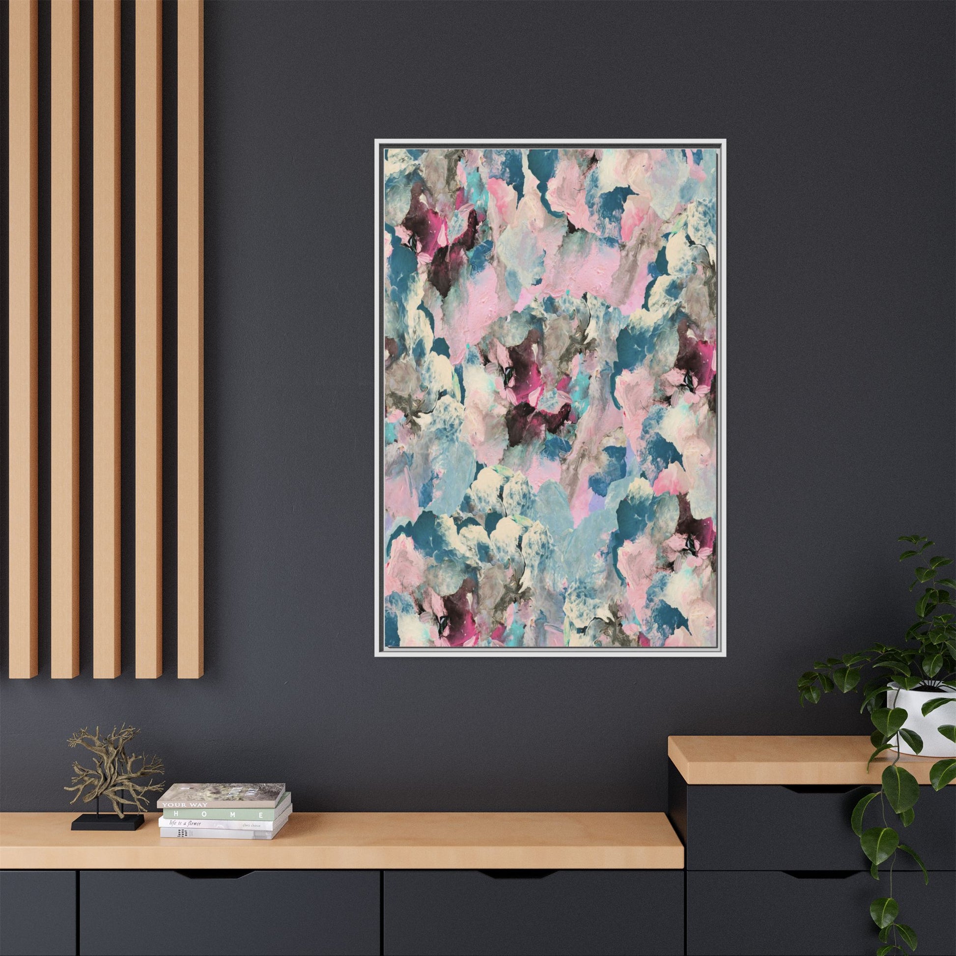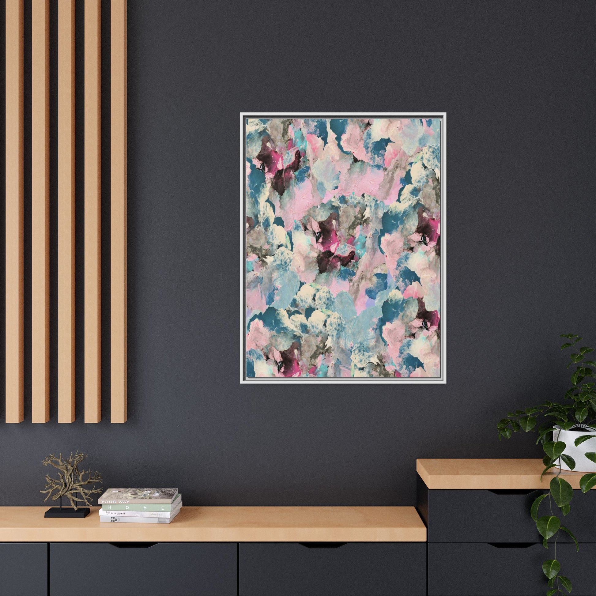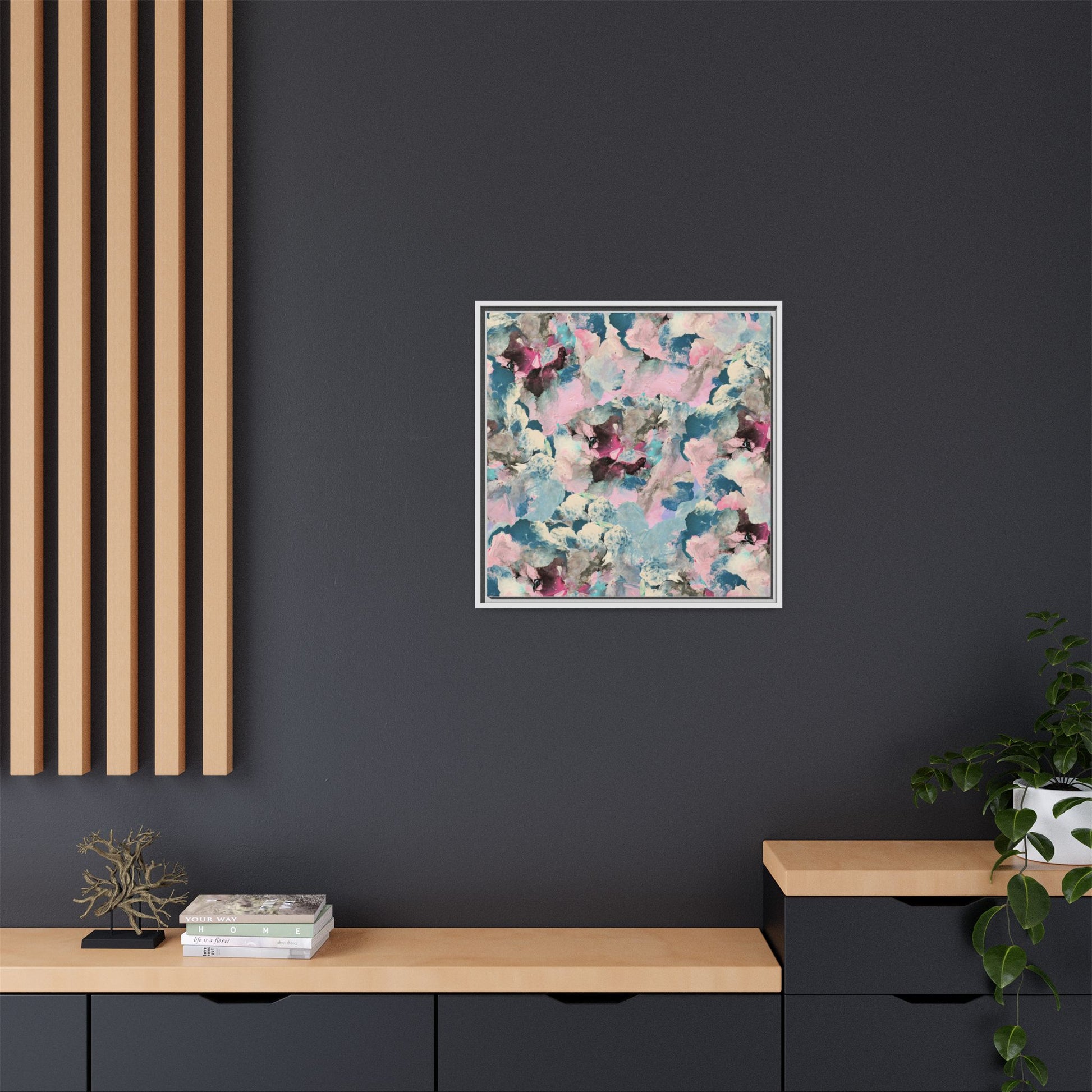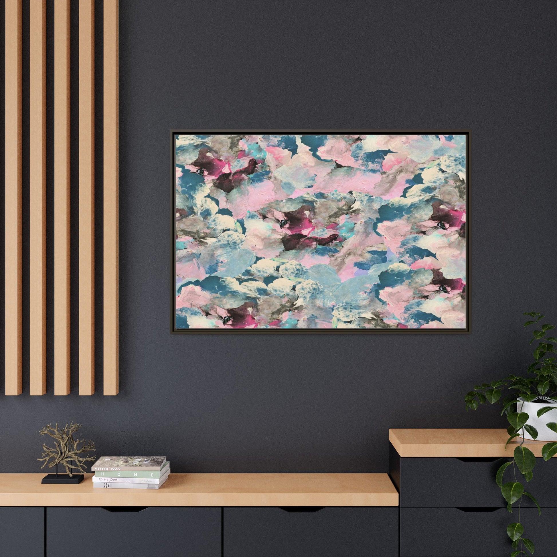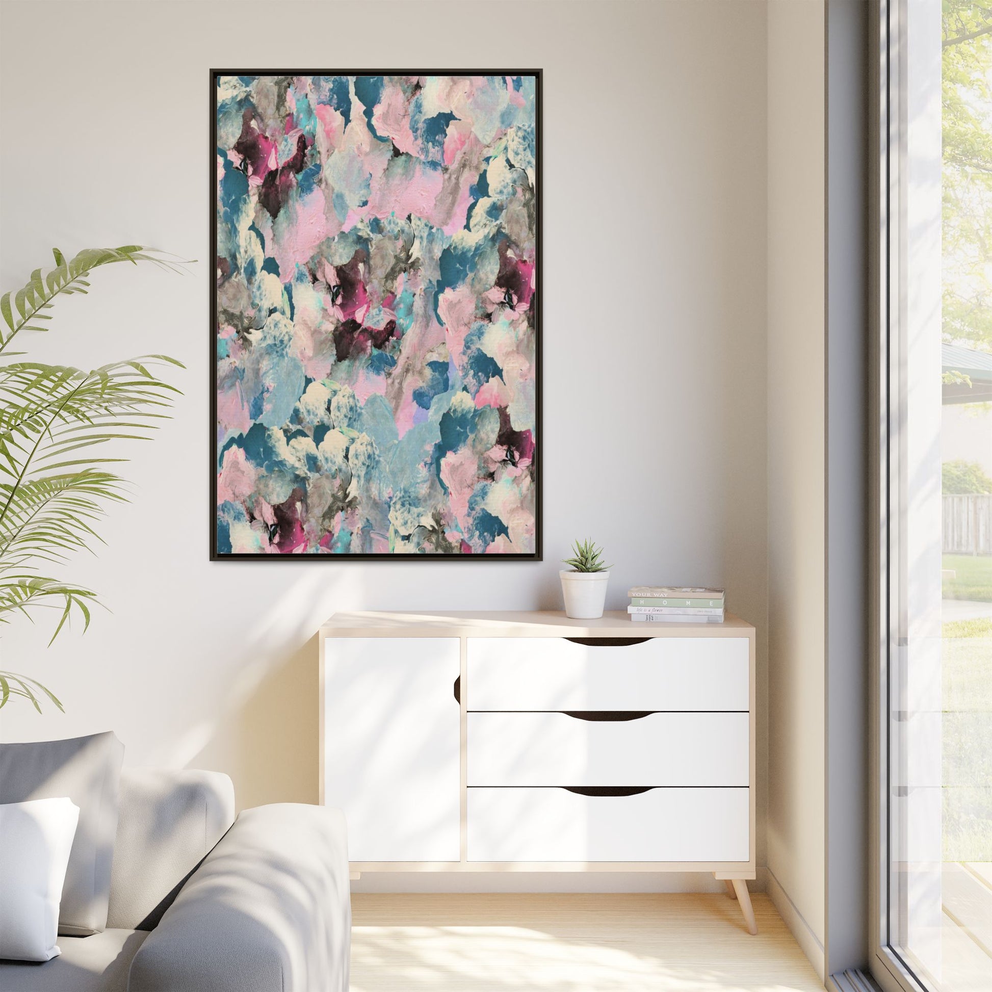 This abstract art piece showcases a mesmerizing blend of soft, ethereal colors including pink, blue, teal, white, and deep maroon. The image appears to be a digital or painted artwork with fluid, overlapping brushstrokes that create a dreamy, cloud-like texture and composition. Each color seems to blend and merge into the next, creating organic shapes and a sense of movement and depth across the entire canvas. The style resembles a watercolor or digital painting technique, with layers of color that seem to drift and flow into one another like a complex, emotional landscape. The overall effect is both calming and dynamic, inviting viewers to explore the intricate details and subtle color transitions within the artwork.