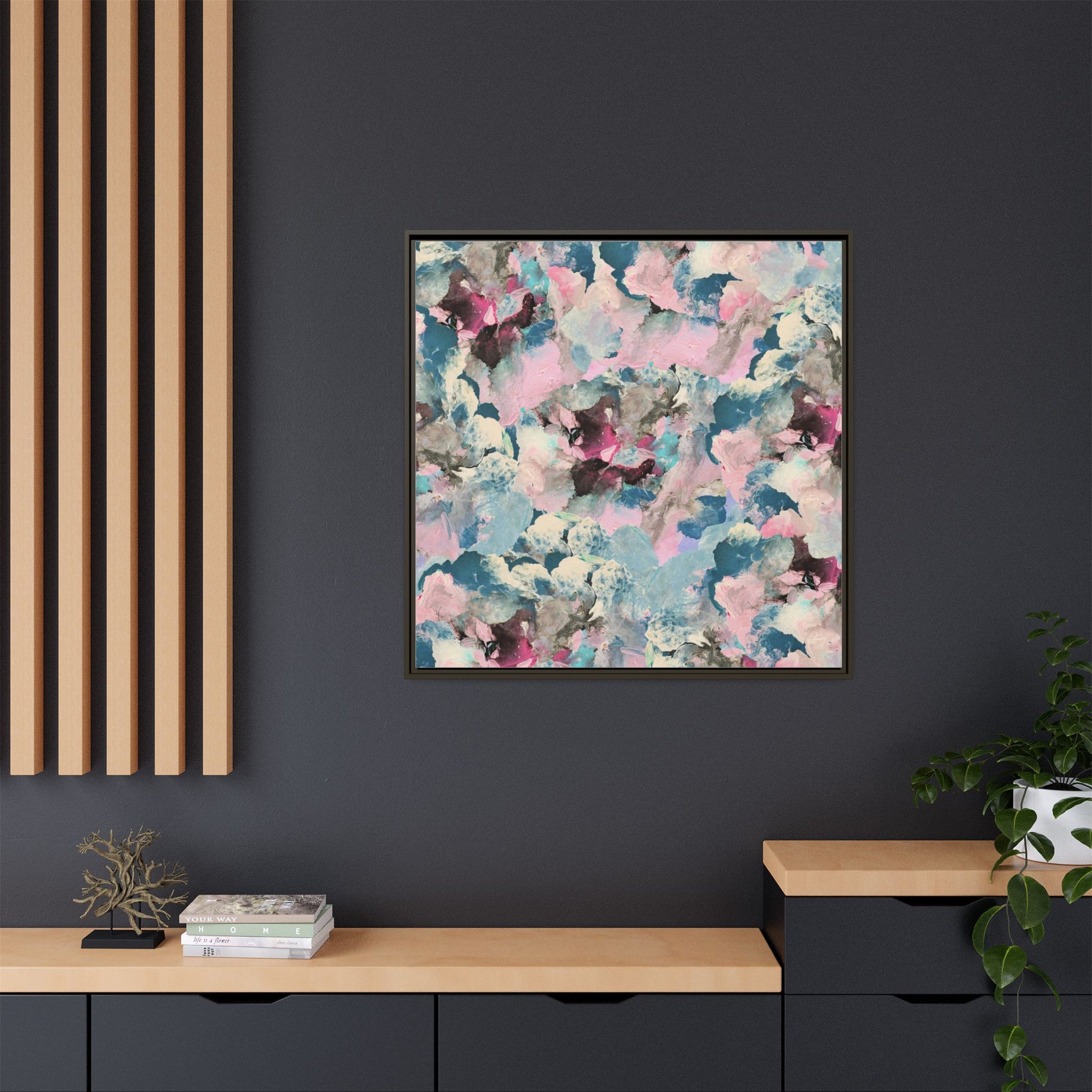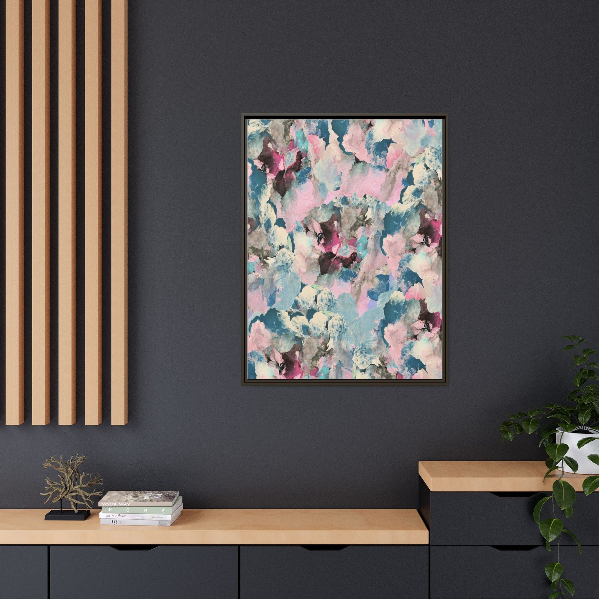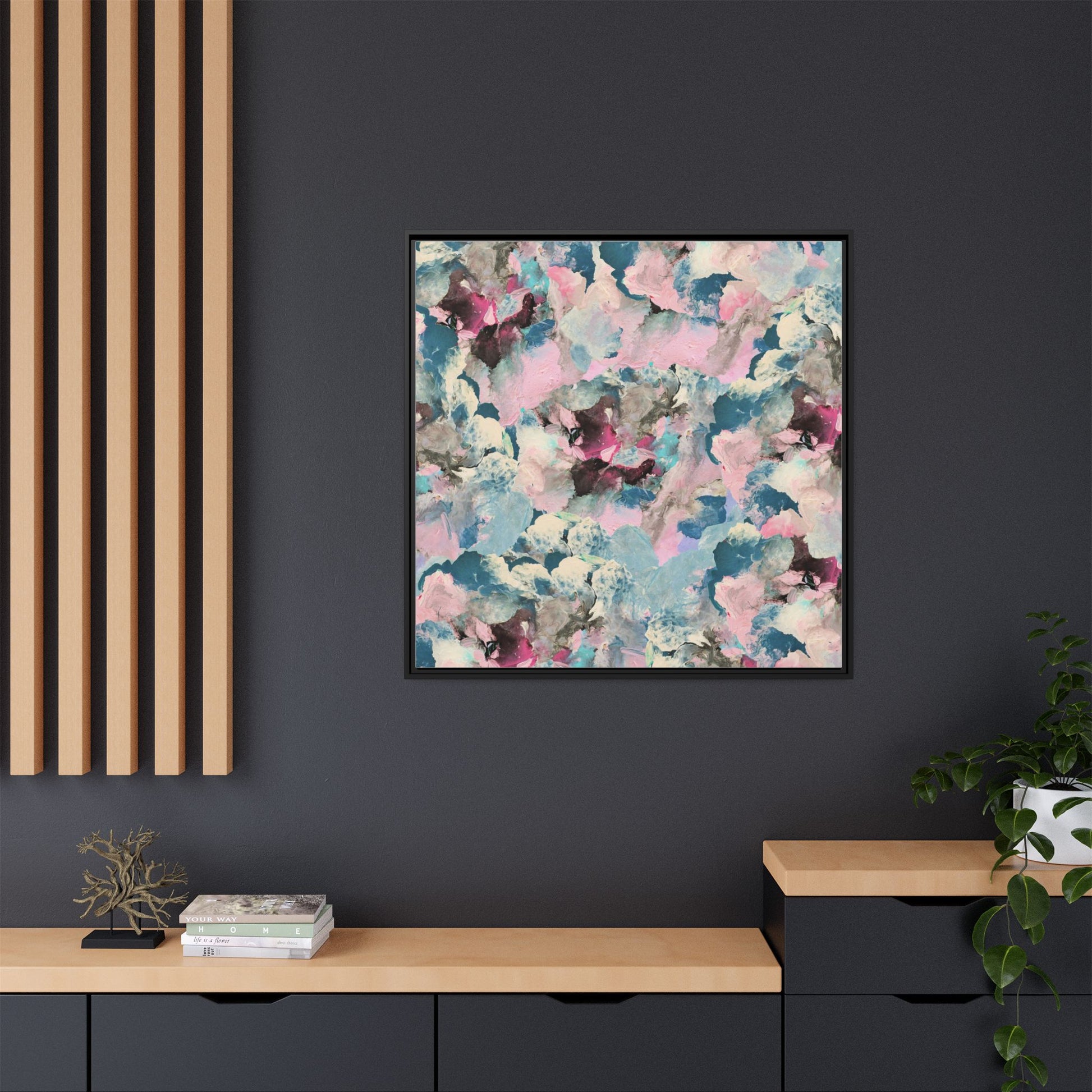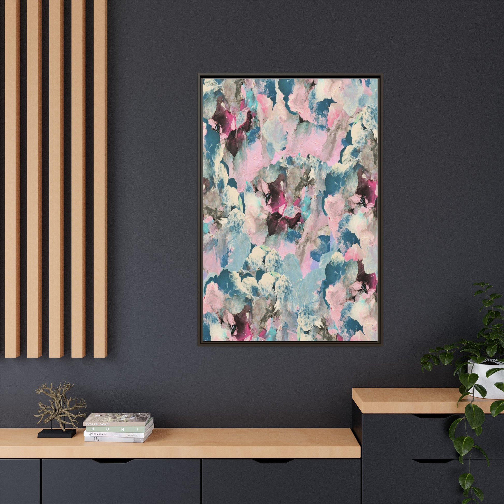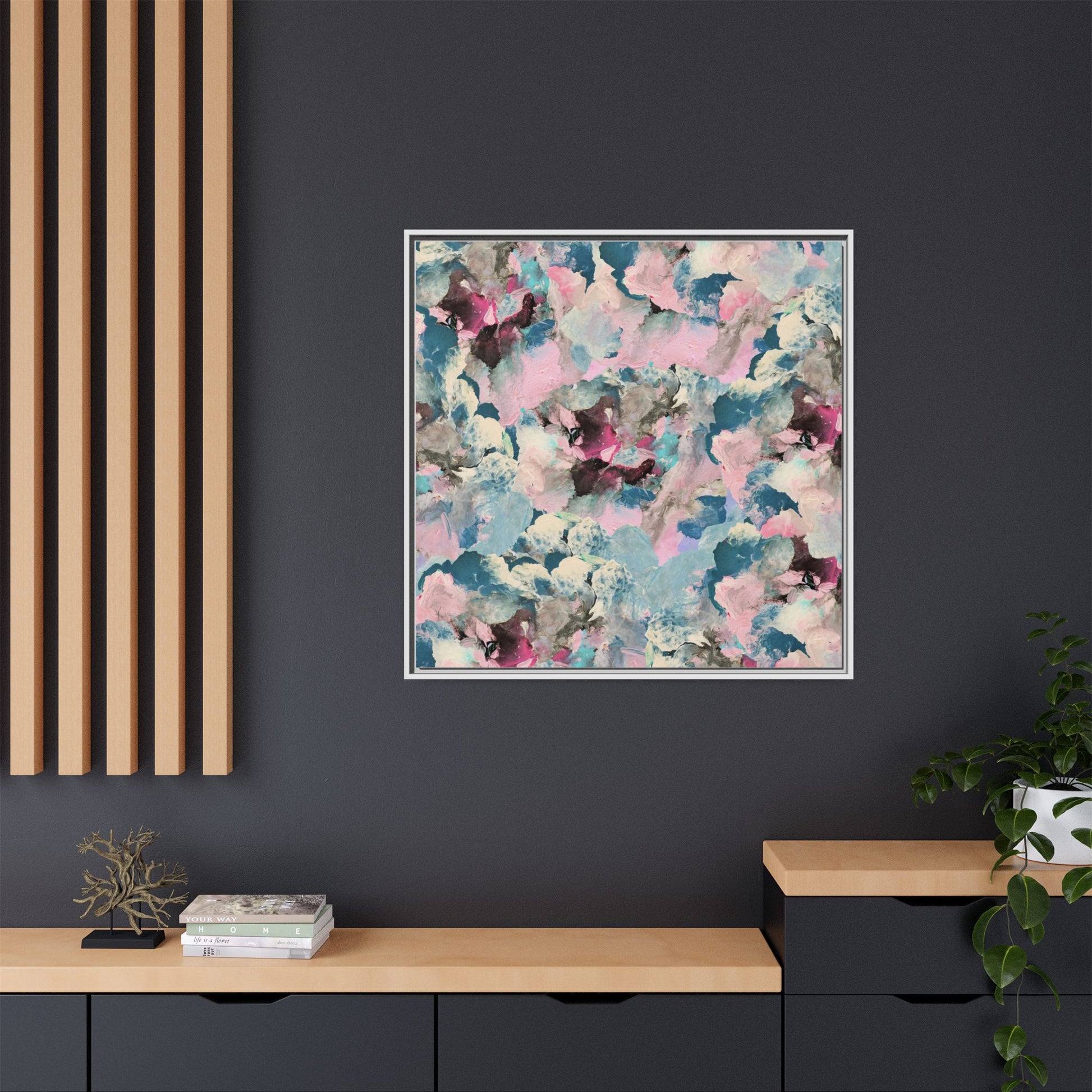 This abstract art piece showcases a mesmerizing blend of soft, ethereal colors including pink, blue, teal, white, and deep maroon. The image appears to be a digital or painted artwork with fluid, overlapping brushstrokes that create a dreamy, cloud-like texture and composition. Each color seems to blend and merge into the next, creating organic shapes and a sense of movement and depth across the entire canvas. The style resembles a watercolor or digital painting technique, with layers of color that seem to drift and flow into one another like a complex, emotional landscape. The overall effect is both calming and dynamic, inviting viewers to explore the intricate details and subtle color transitions within the artwork.