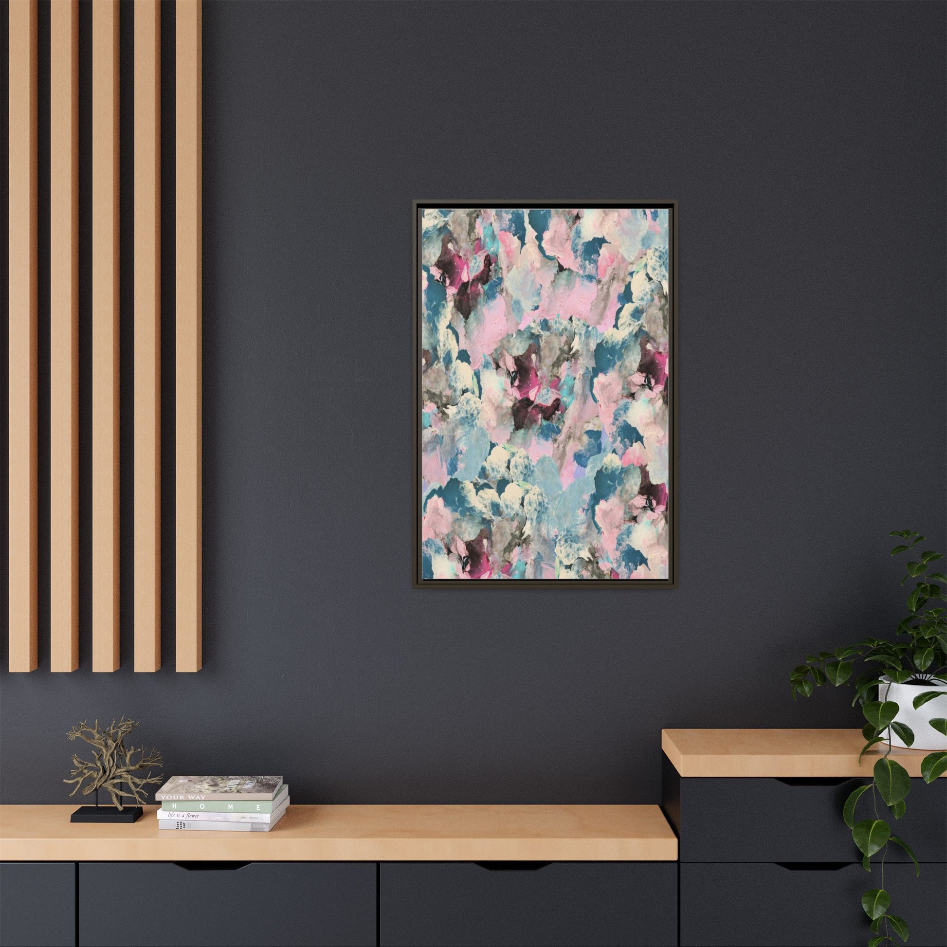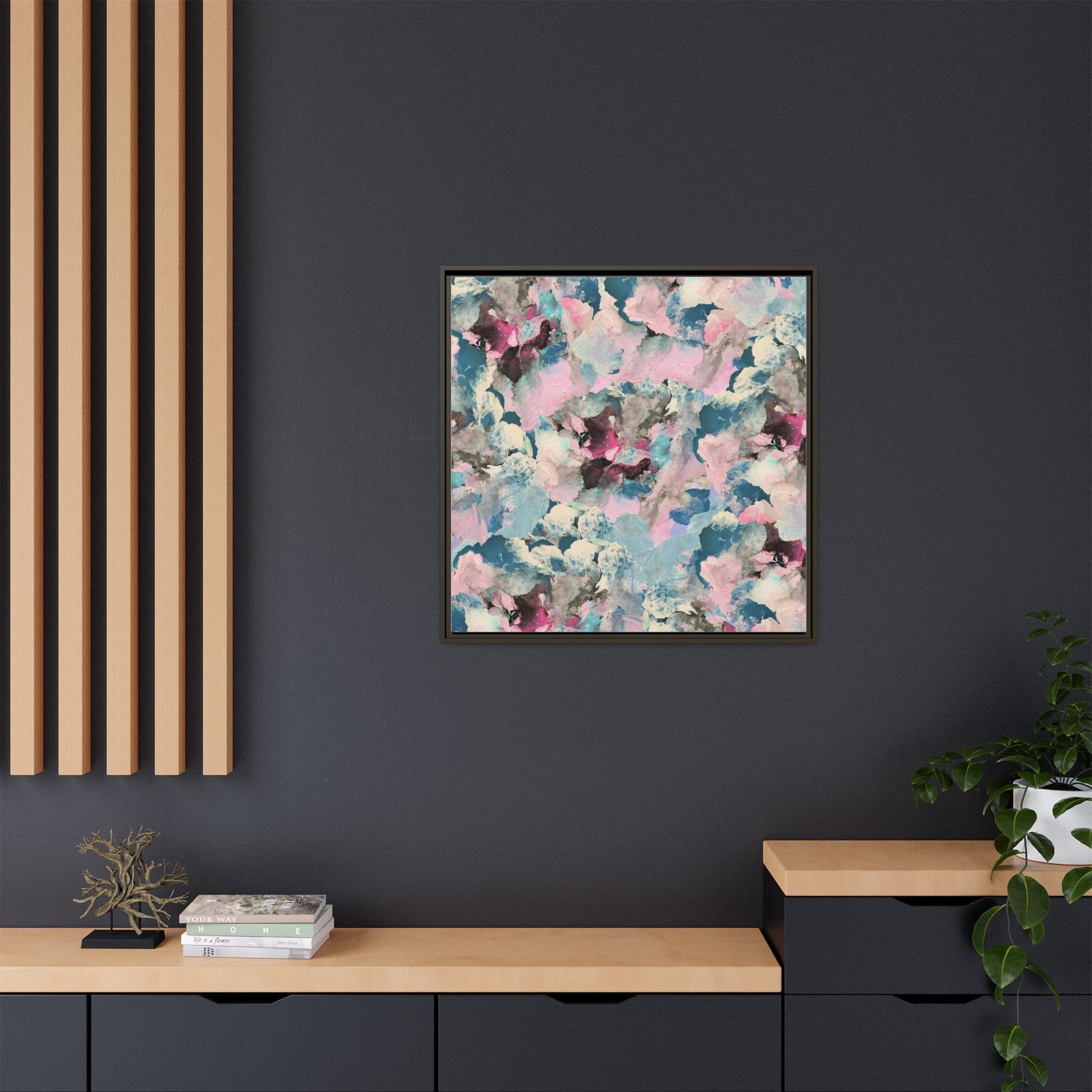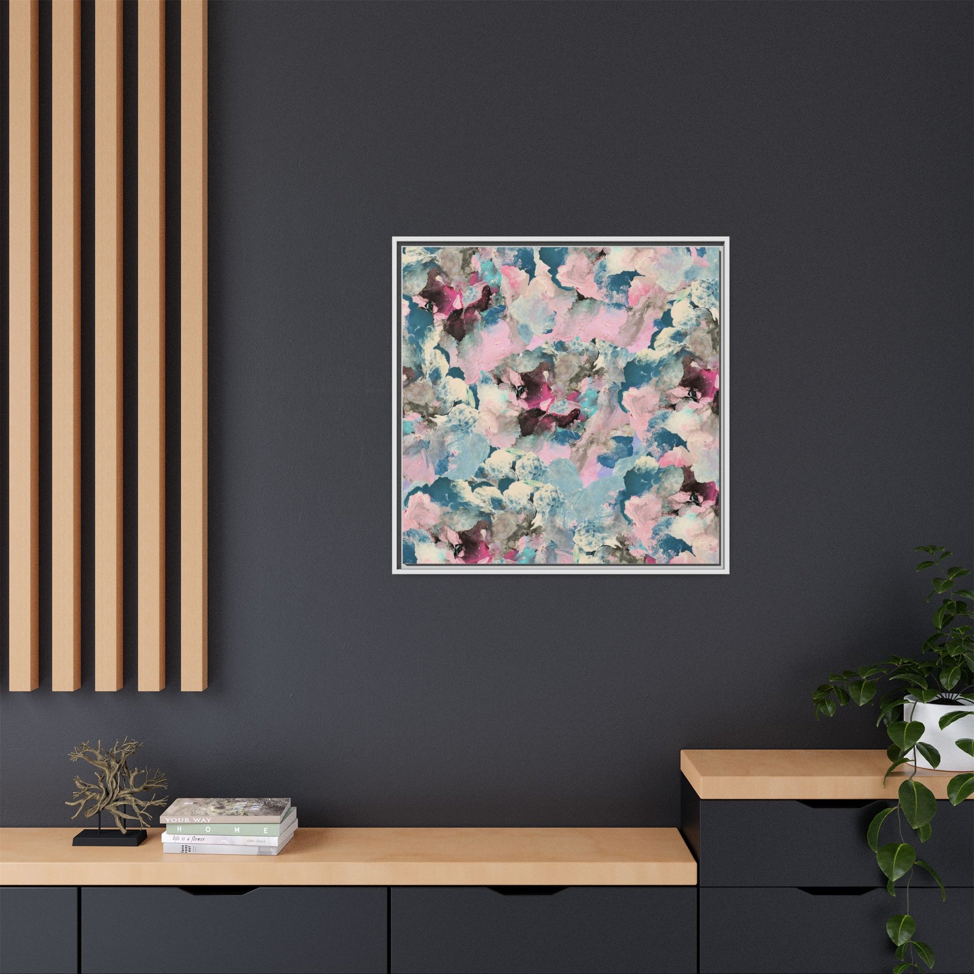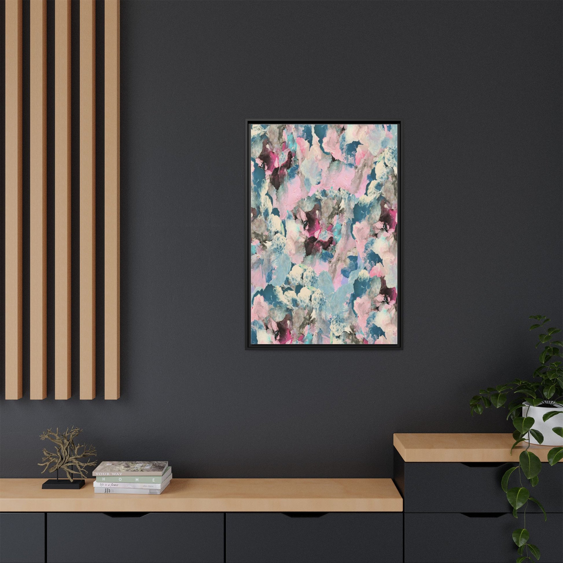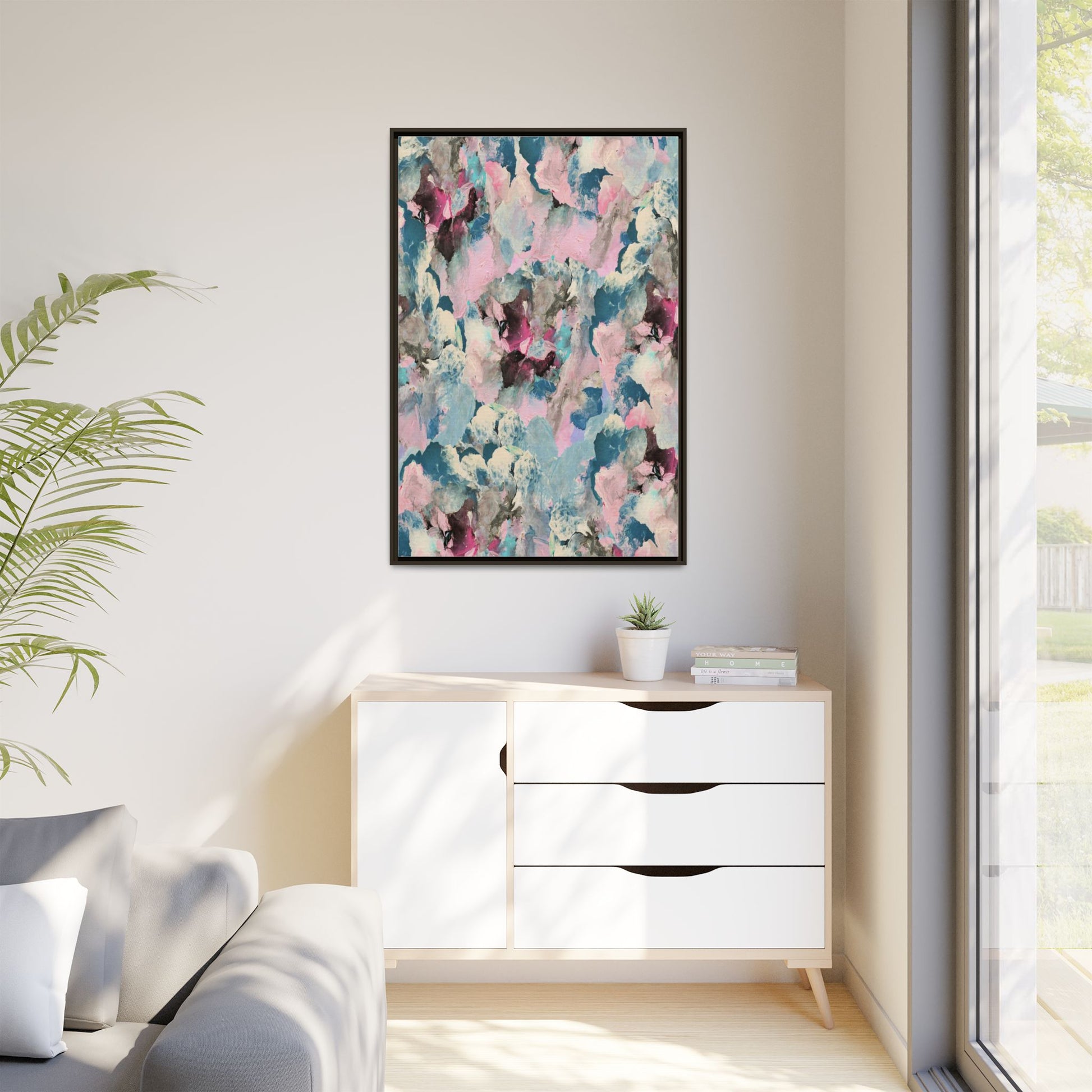 This abstract art piece showcases a mesmerizing blend of soft, ethereal colors including pink, blue, teal, white, and deep maroon. The image appears to be a digital or painted artwork with fluid, overlapping brushstrokes that create a dreamy, cloud-like texture and composition. Each color seems to blend and merge into the next, creating organic shapes and a sense of movement and depth across the entire canvas. The style resembles a watercolor or digital painting technique, with layers of color that seem to drift and flow into one another like a complex, emotional landscape. The overall effect is both calming and dynamic, inviting viewers to explore the intricate details and subtle color transitions within the artwork.
