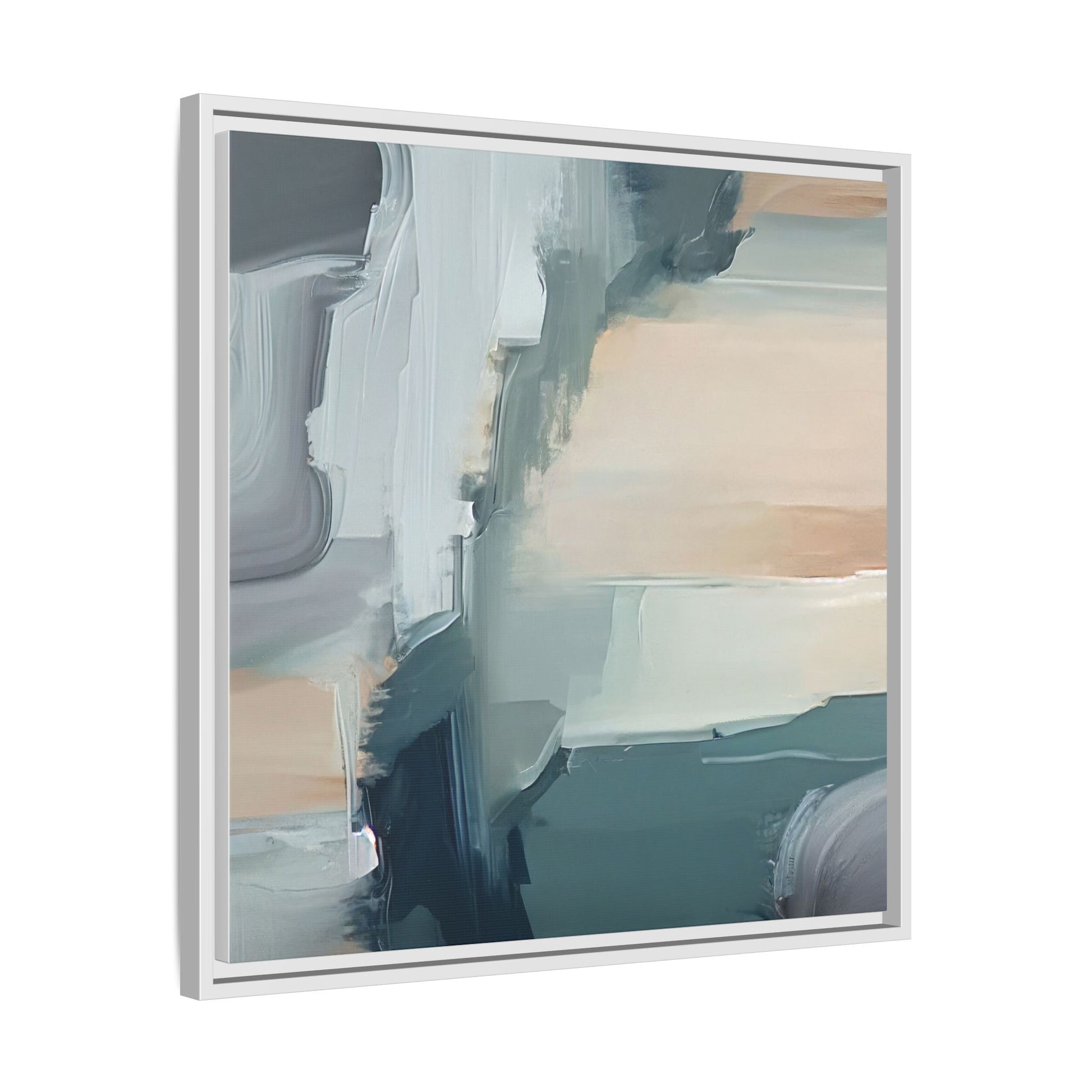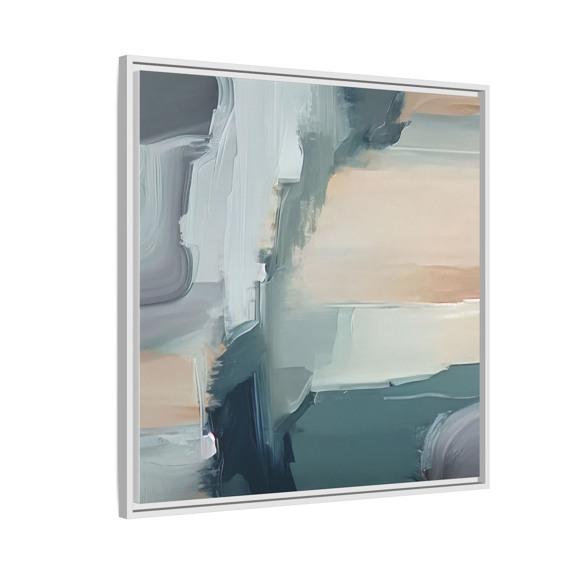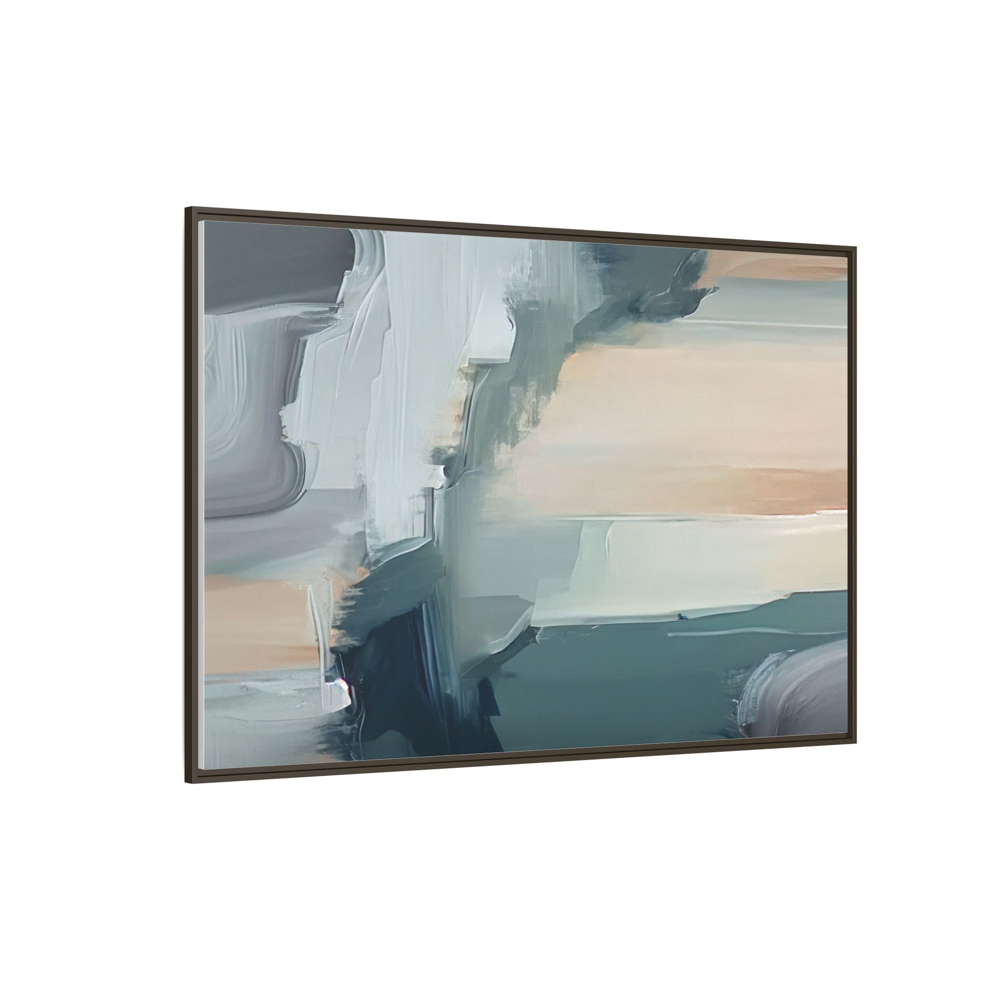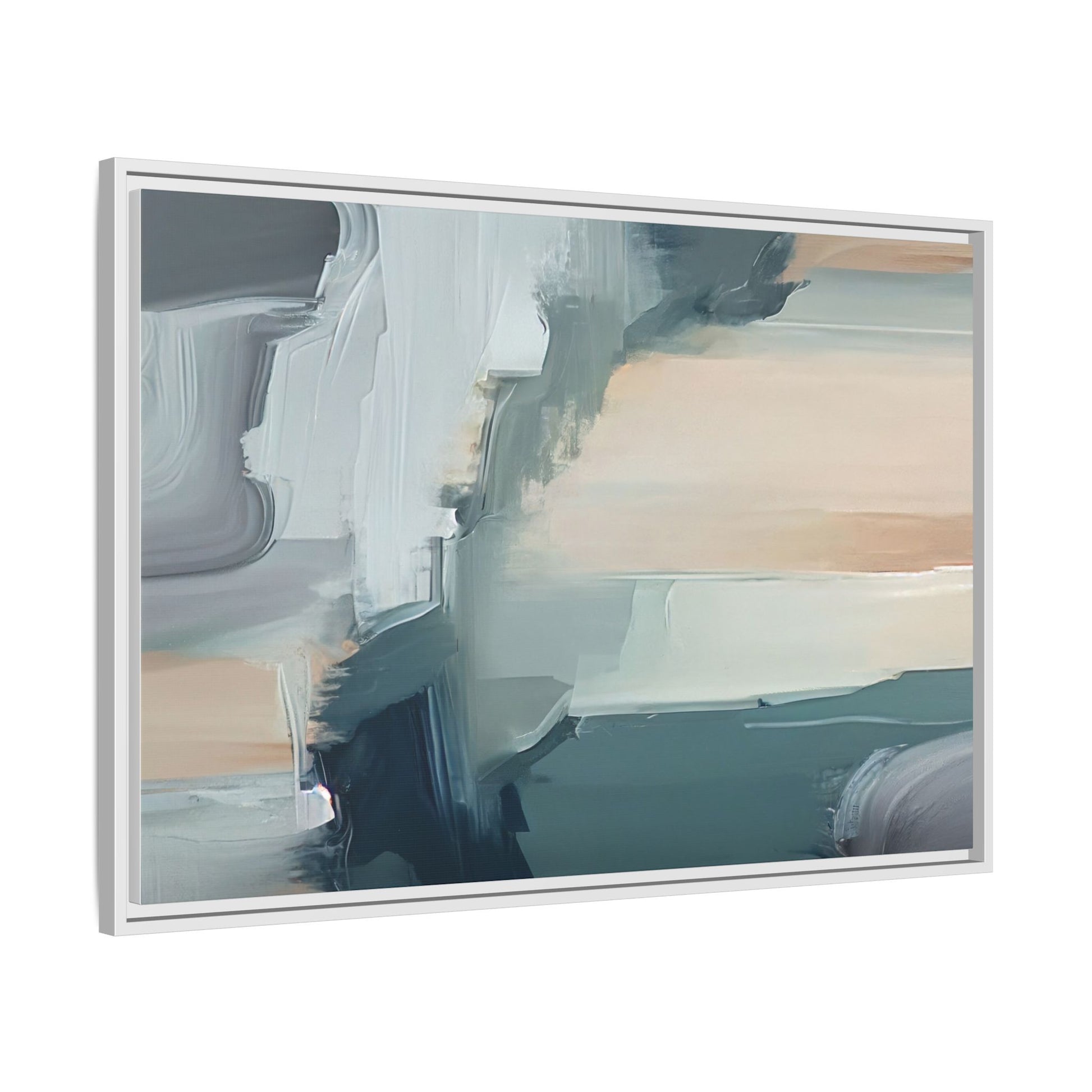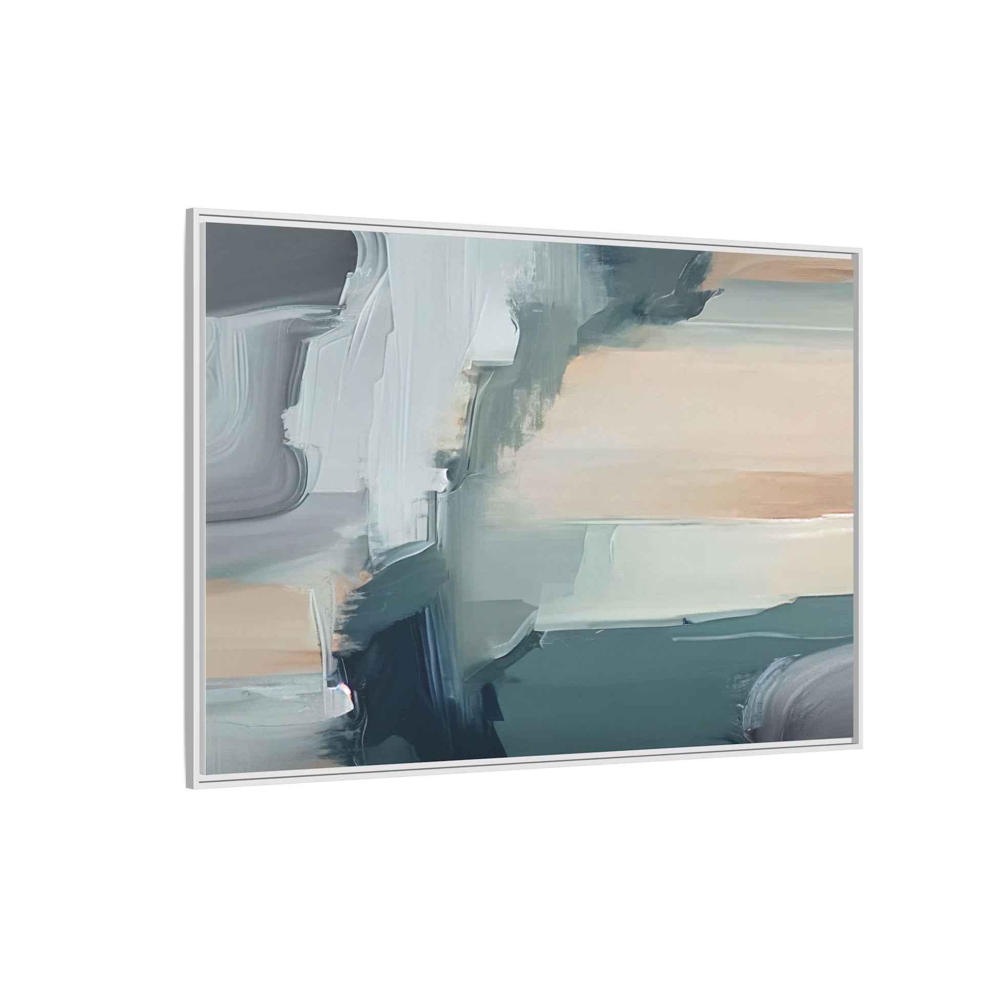This captivating abstract artwork features a dynamic composition of blended blues, whites, and soft peach tones, creating a fluid and ethereal landscape-like scene. The painting employs a technique of sweeping, layered brushstrokes that seem to blur and merge, generating a sense of movement and depth across the canvas. Soft, almost translucent edges create a dreamy, atmospheric quality, with darker teal and slate blue hues contrasting against lighter, more delicate white and cream sections. The image evokes a sense of a distant horizon or a fragmented seascape, with organic shapes that suggest geological formations or abstract cloud-like structures. The brushwork appears both intentional and spontaneous, giving the artwork a sense of emotional depth and visual complexity.