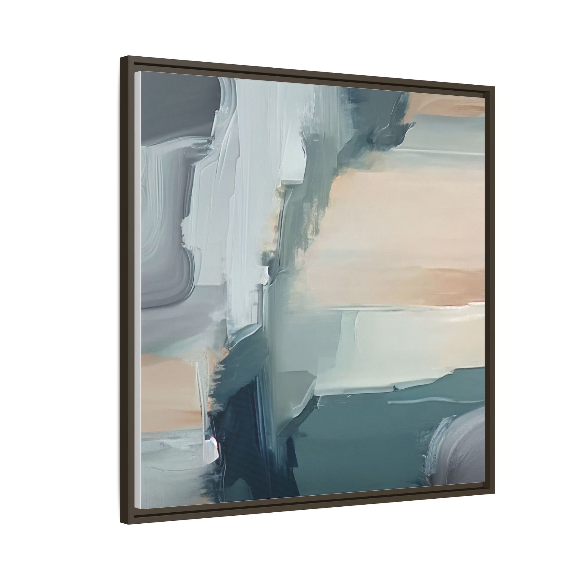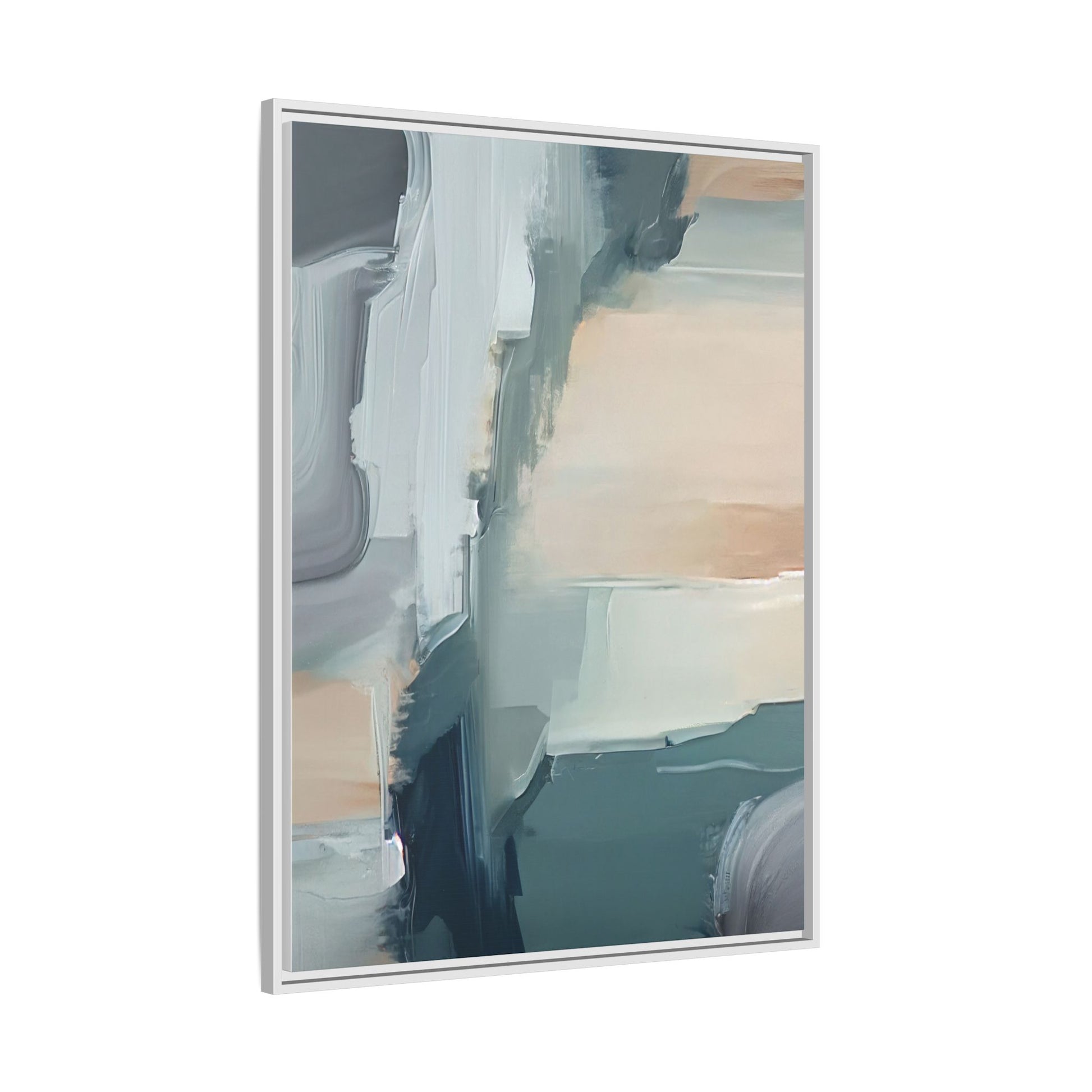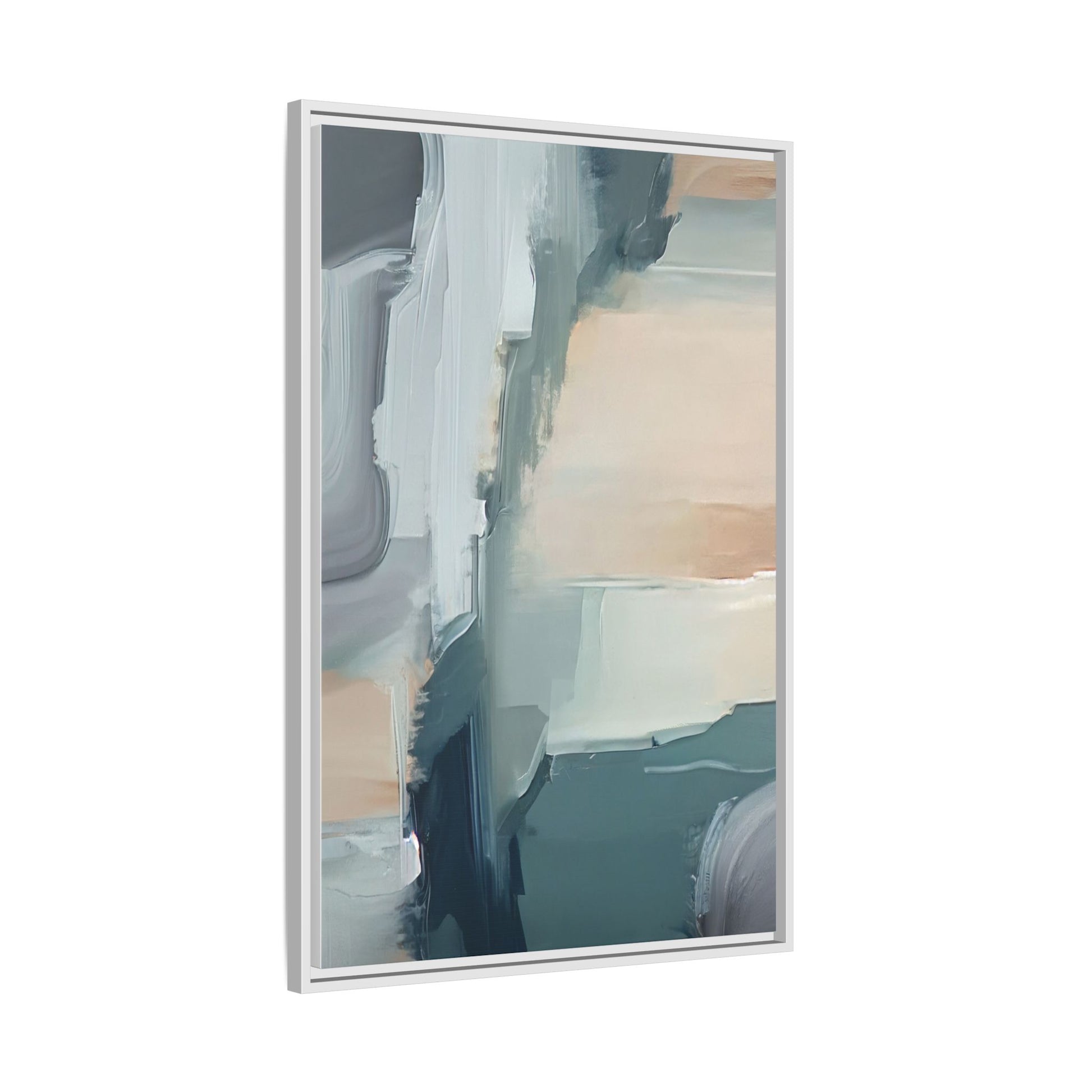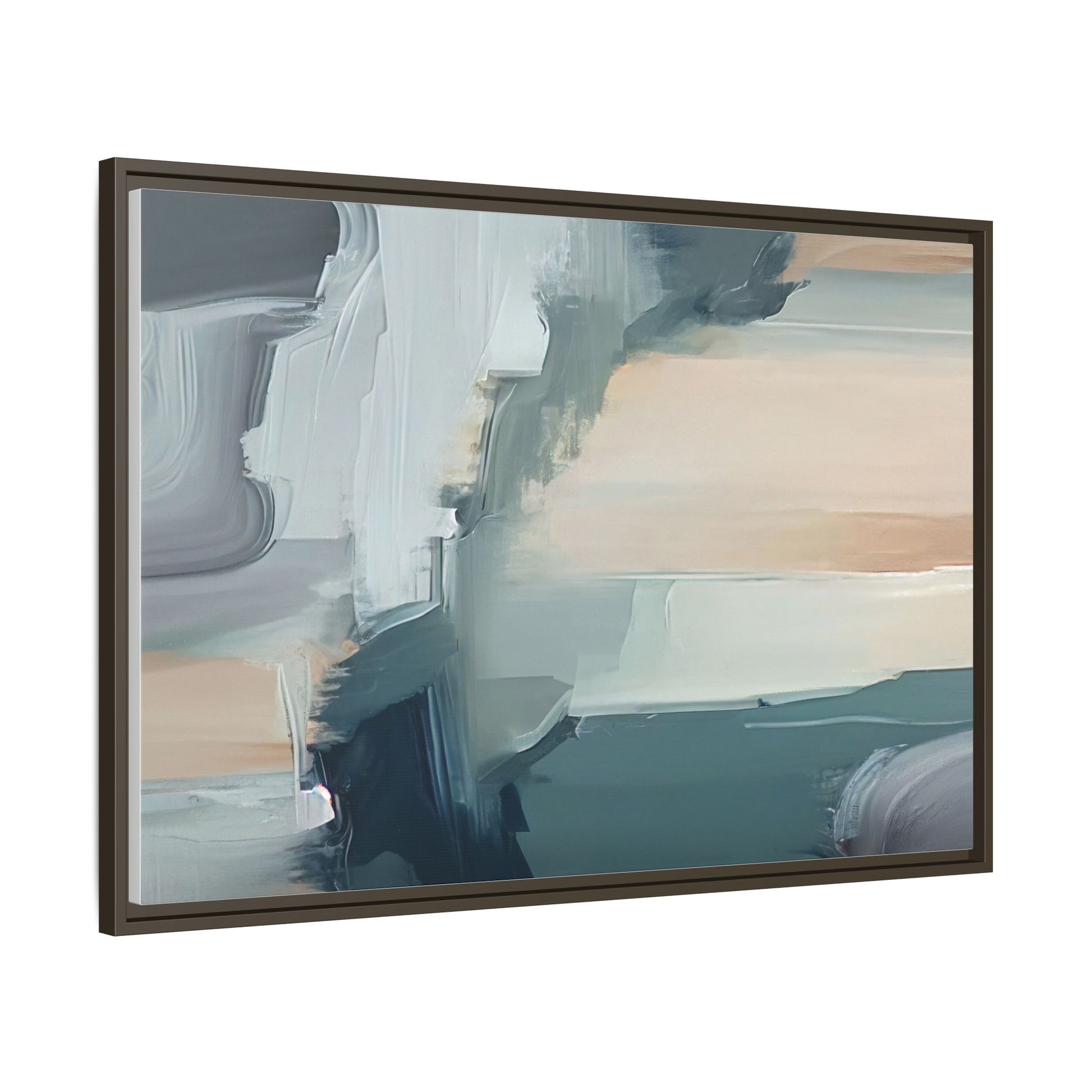 This captivating abstract artwork features a dynamic composition of blended blues, whites, and soft peach tones, creating a fluid and ethereal landscape-like scene. The painting employs a technique of sweeping, layered brushstrokes that seem to blur and merge, generating a sense of movement and depth across the canvas. Soft, almost translucent edges create a dreamy, atmospheric quality, with darker teal and slate blue hues contrasting against lighter, more delicate white and cream sections. The image evokes a sense of a distant horizon or a fragmented seascape, with organic shapes that suggest geological formations or abstract cloud-like structures. The brushwork appears both intentional and spontaneous, giving the artwork a sense of emotional depth and visual complexity.