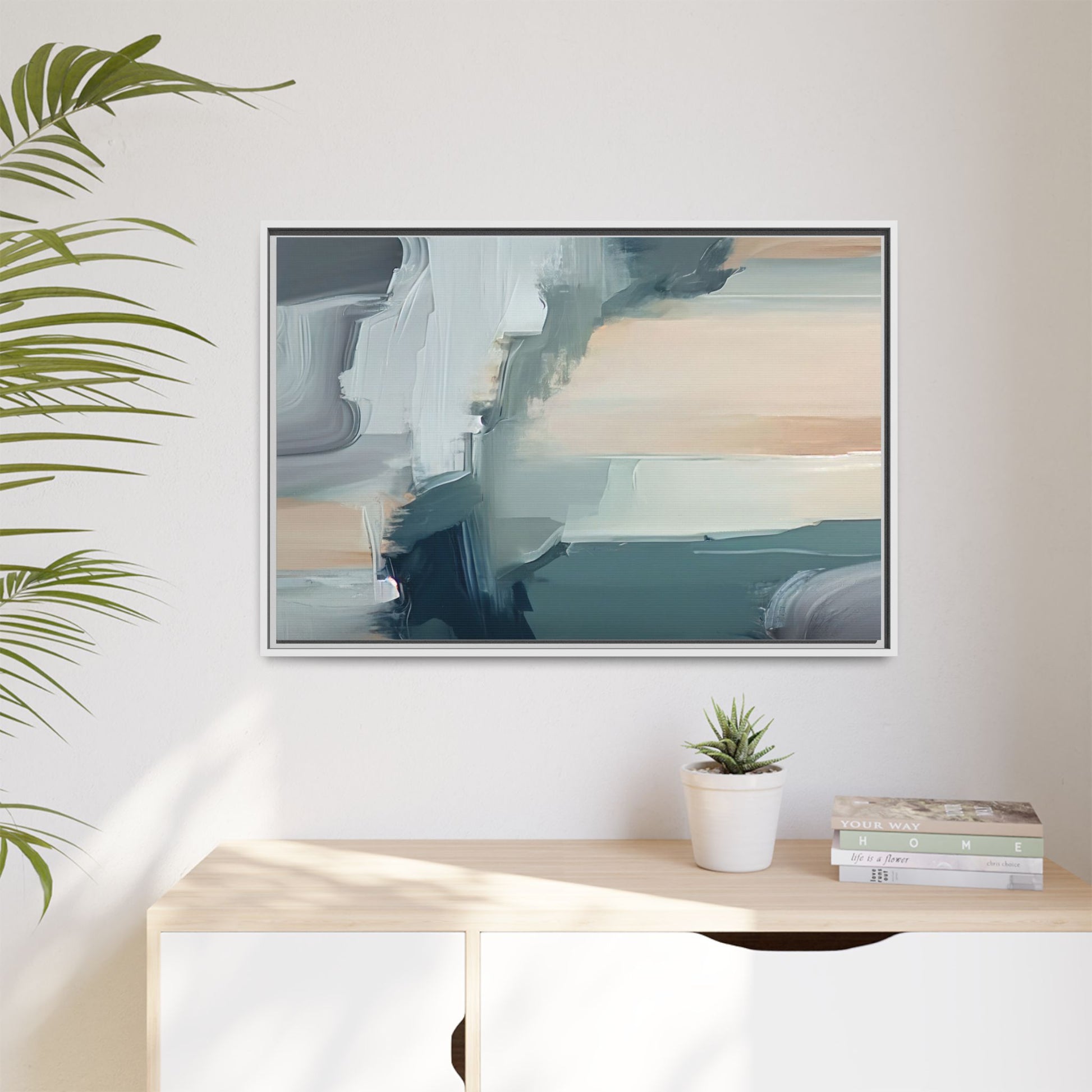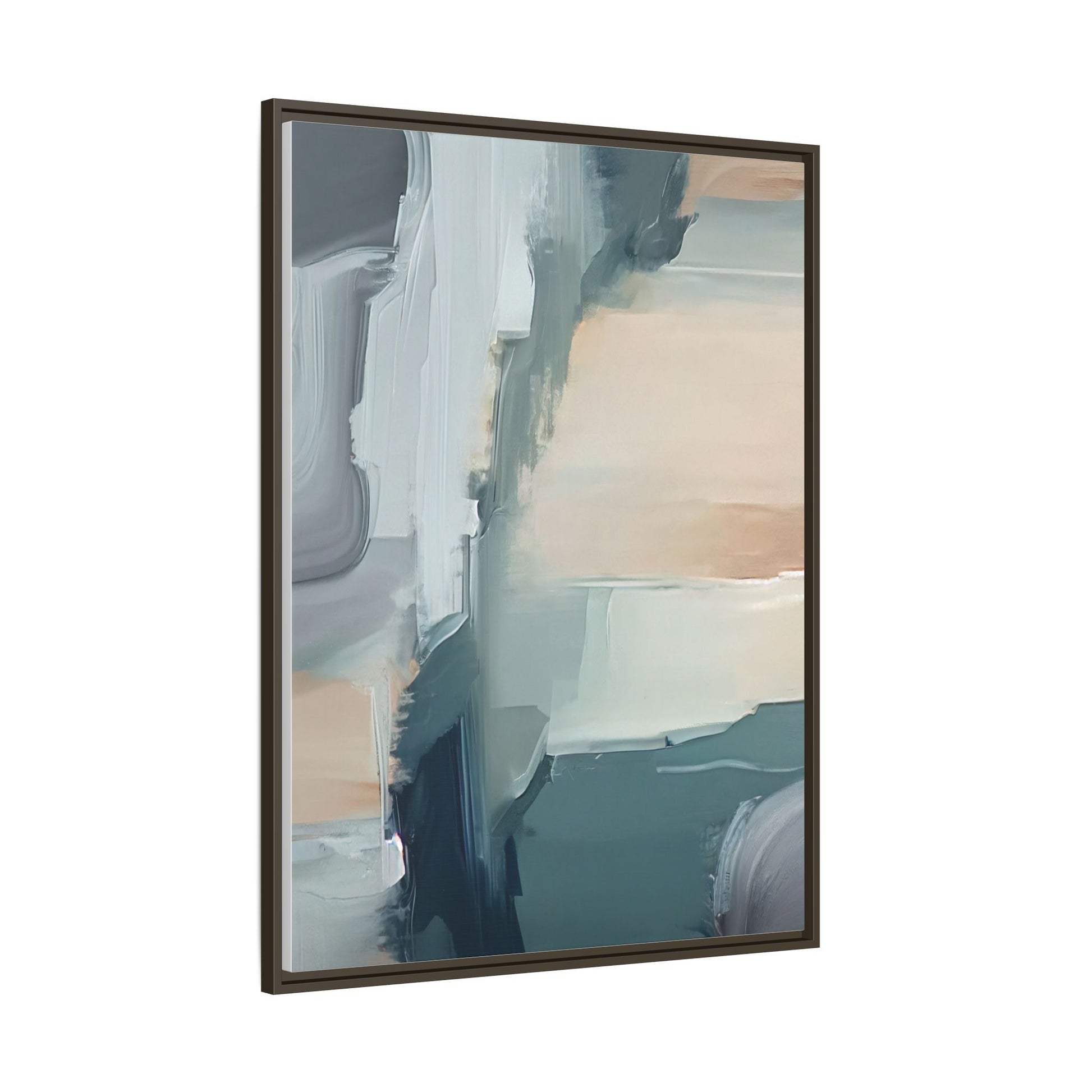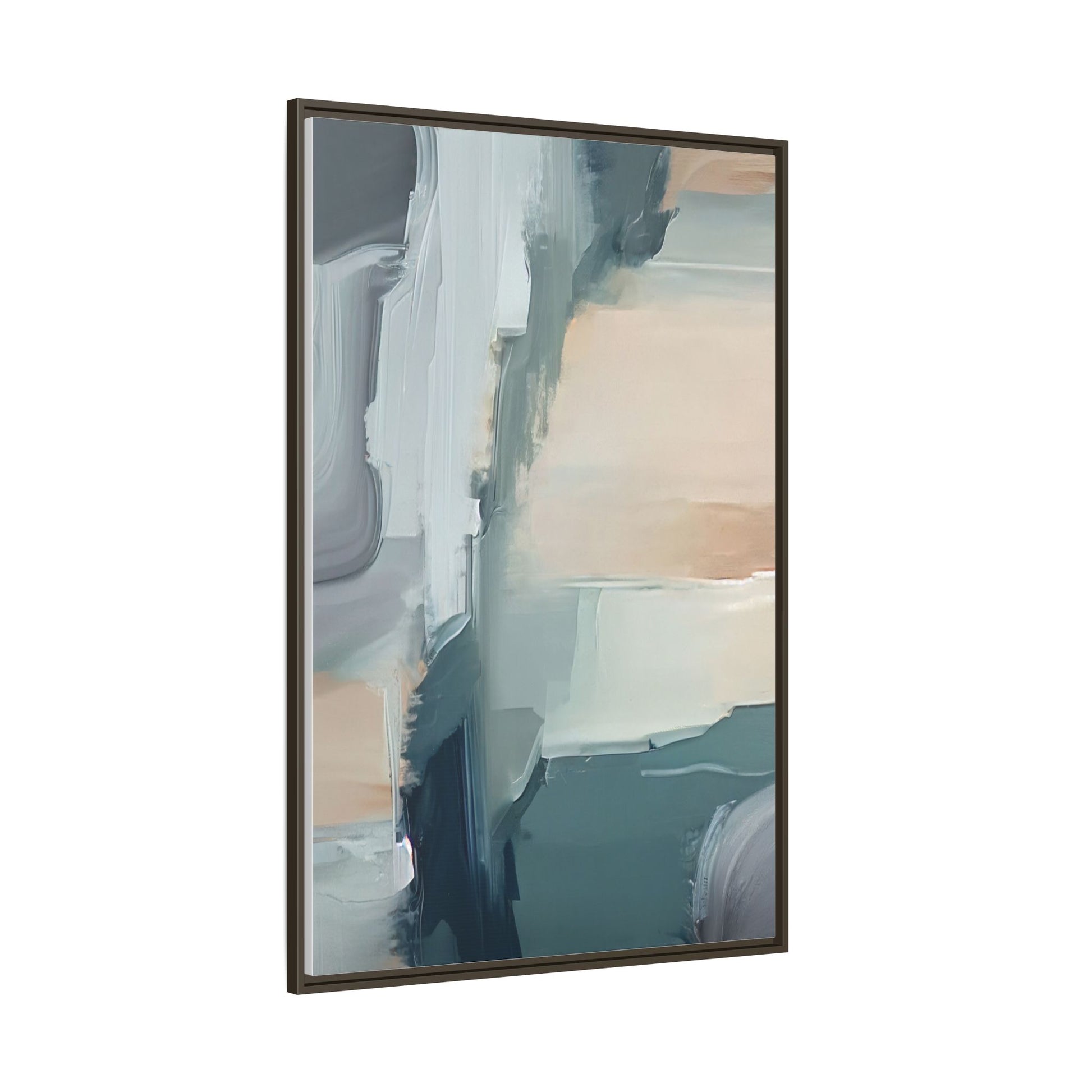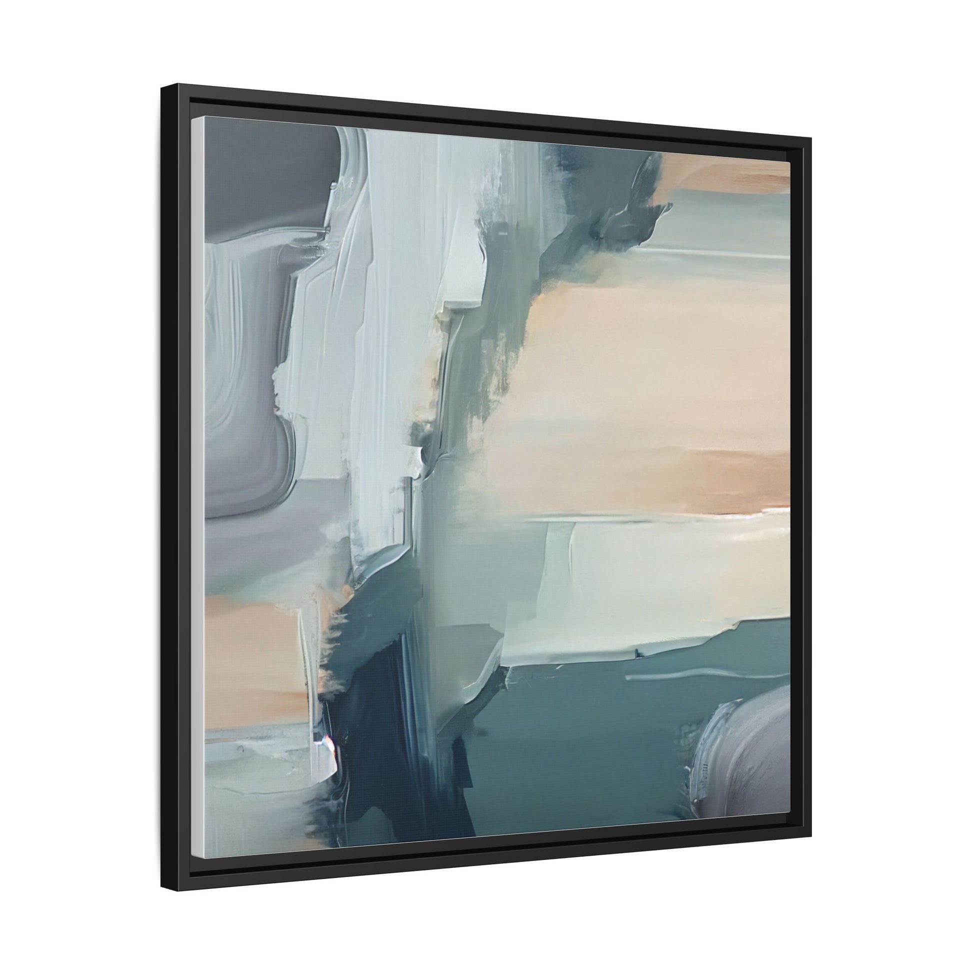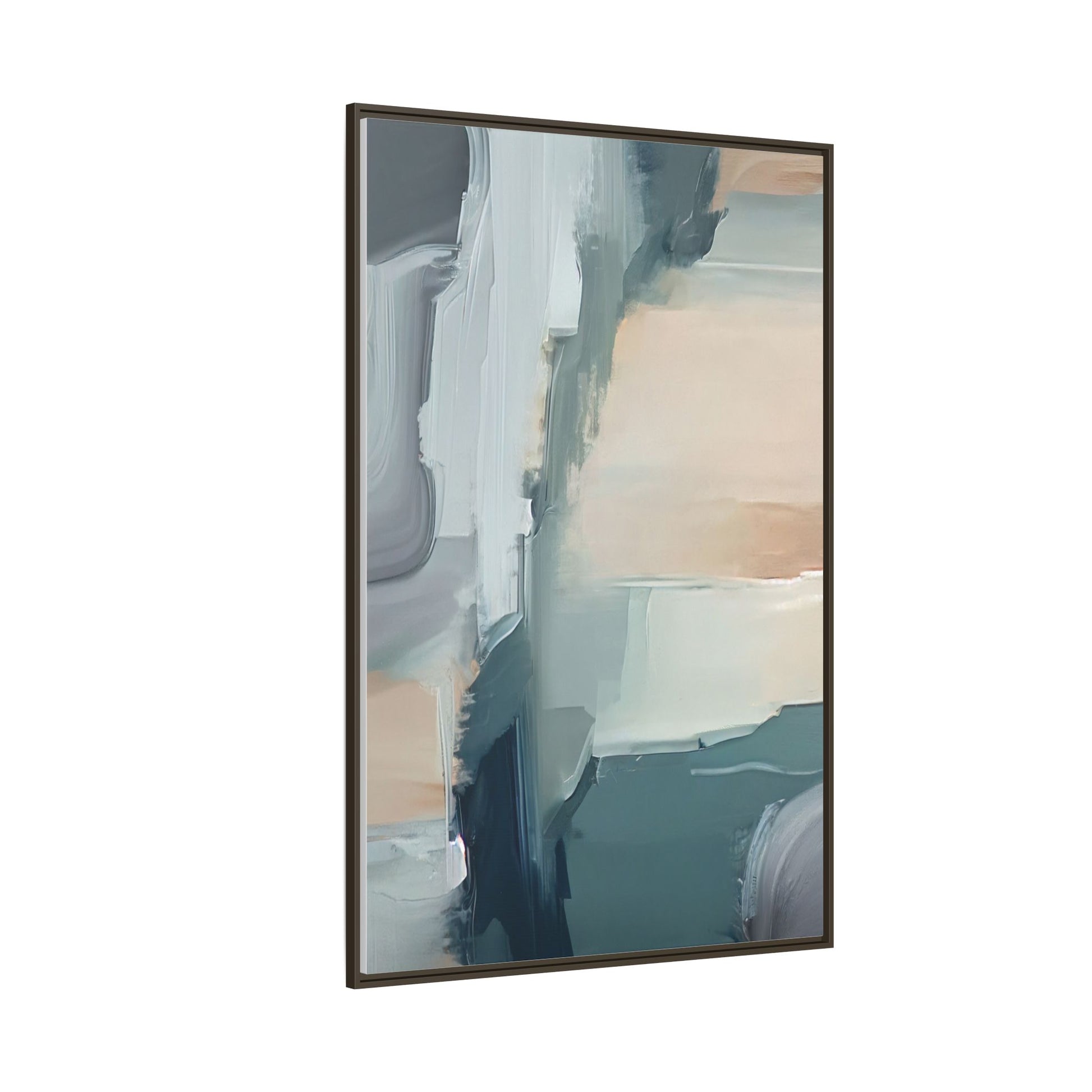 This captivating abstract artwork features a dynamic composition of blended blues, whites, and soft peach tones, creating a fluid and ethereal landscape-like scene. The painting employs a technique of sweeping, layered brushstrokes that seem to blur and merge, generating a sense of movement and depth across the canvas. Soft, almost translucent edges create a dreamy, atmospheric quality, with darker teal and slate blue hues contrasting against lighter, more delicate white and cream sections. The image evokes a sense of a distant horizon or a fragmented seascape, with organic shapes that suggest geological formations or abstract cloud-like structures. The brushwork appears both intentional and spontaneous, giving the artwork a sense of emotional depth and visual complexity.
