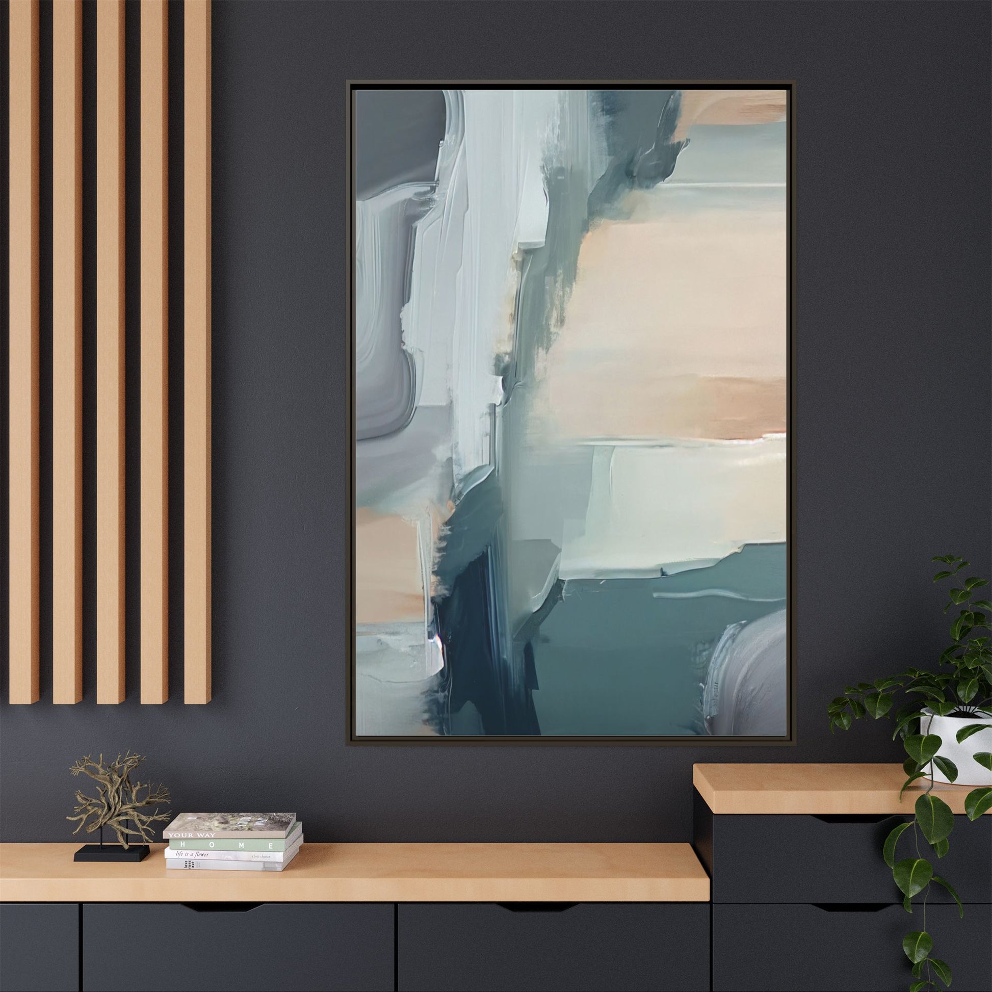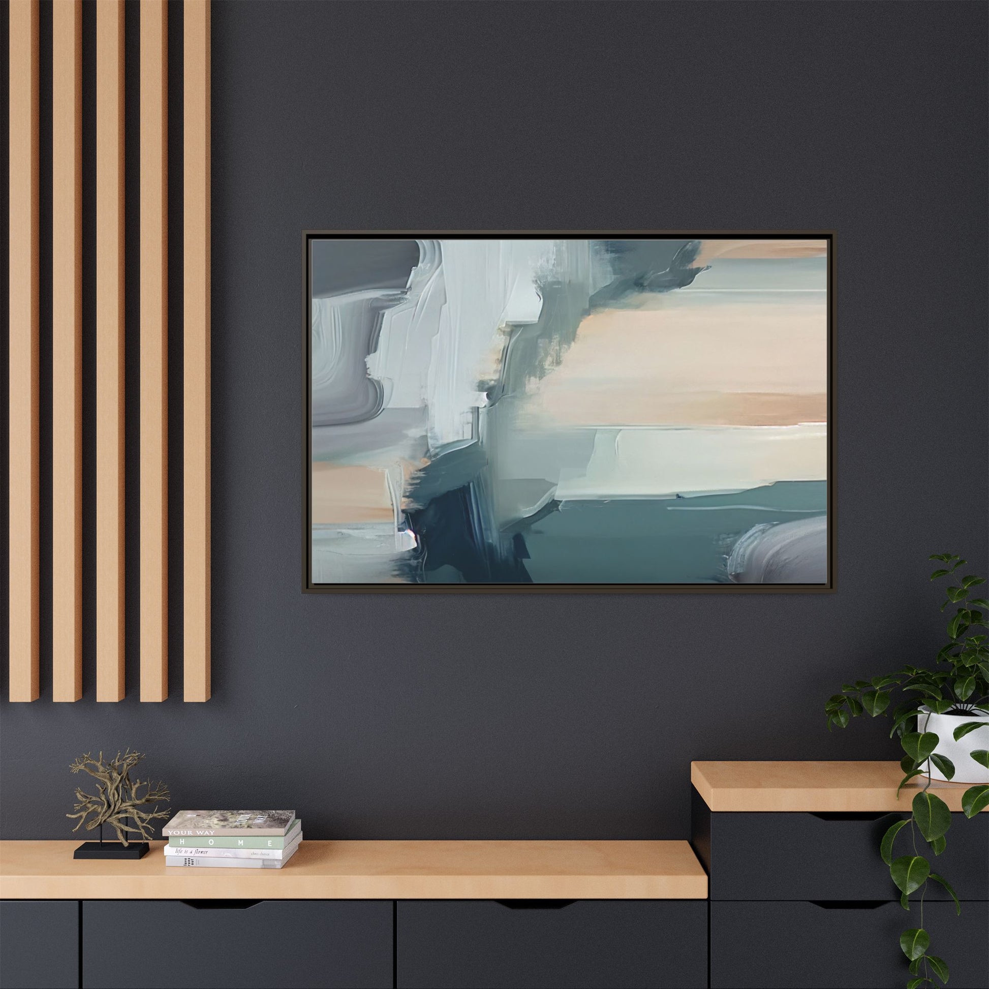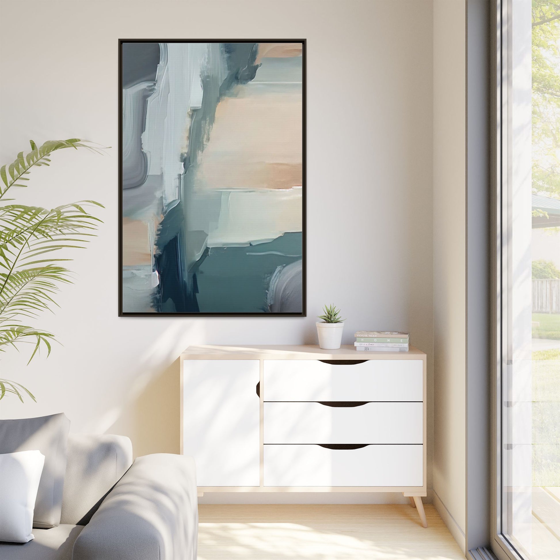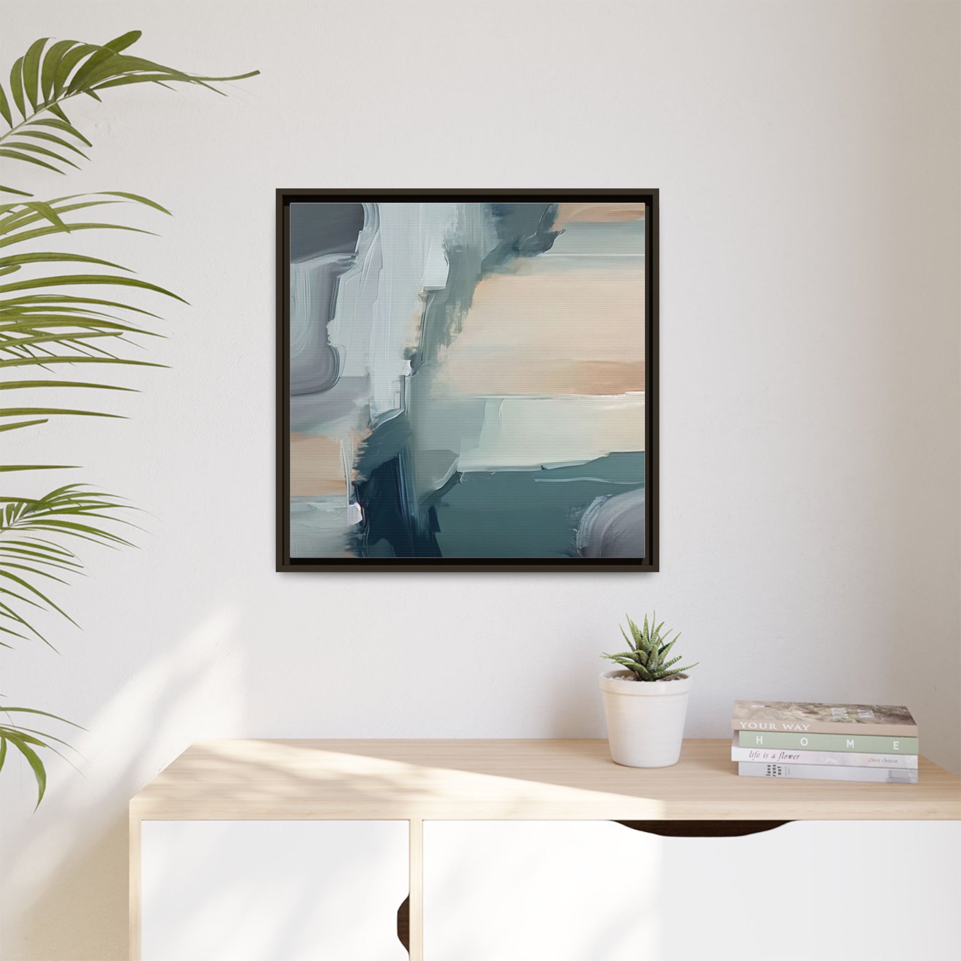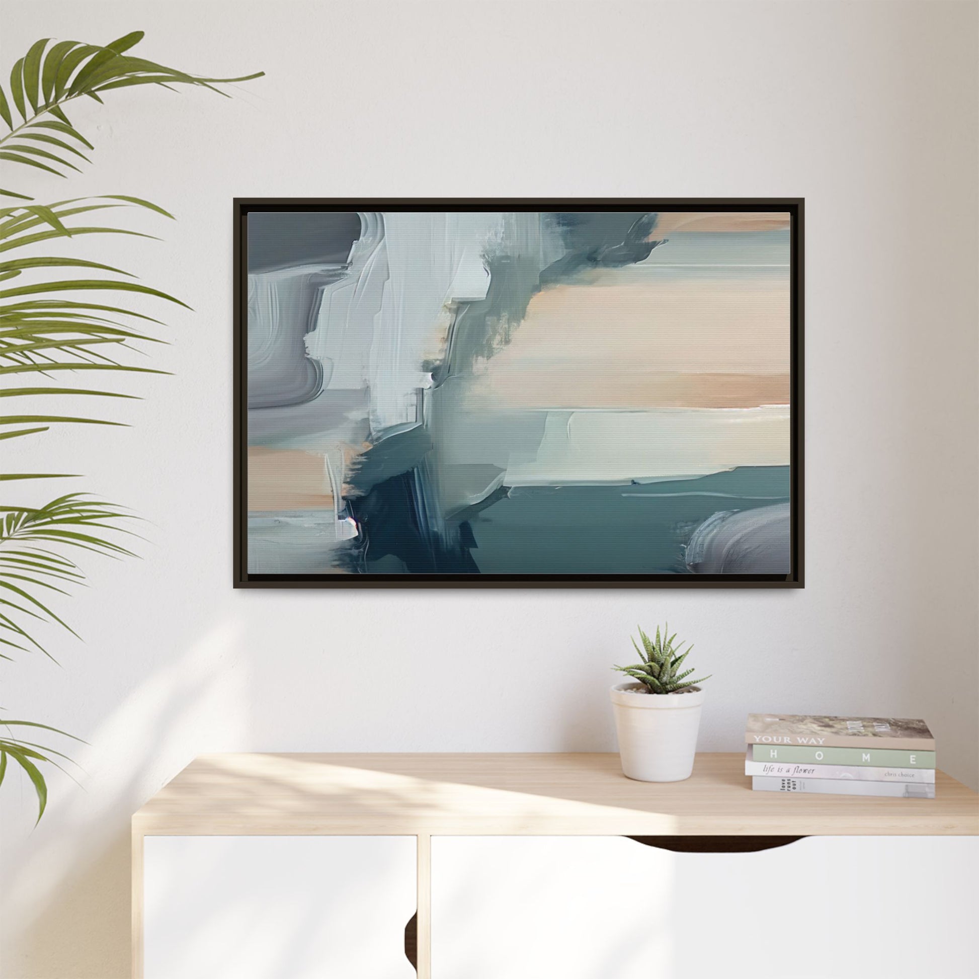 This captivating abstract artwork features a dynamic composition of blended blues, whites, and soft peach tones, creating a fluid and ethereal landscape-like scene. The painting employs a technique of sweeping, layered brushstrokes that seem to blur and merge, generating a sense of movement and depth across the canvas. Soft, almost translucent edges create a dreamy, atmospheric quality, with darker teal and slate blue hues contrasting against lighter, more delicate white and cream sections. The image evokes a sense of a distant horizon or a fragmented seascape, with organic shapes that suggest geological formations or abstract cloud-like structures. The brushwork appears both intentional and spontaneous, giving the artwork a sense of emotional depth and visual complexity.