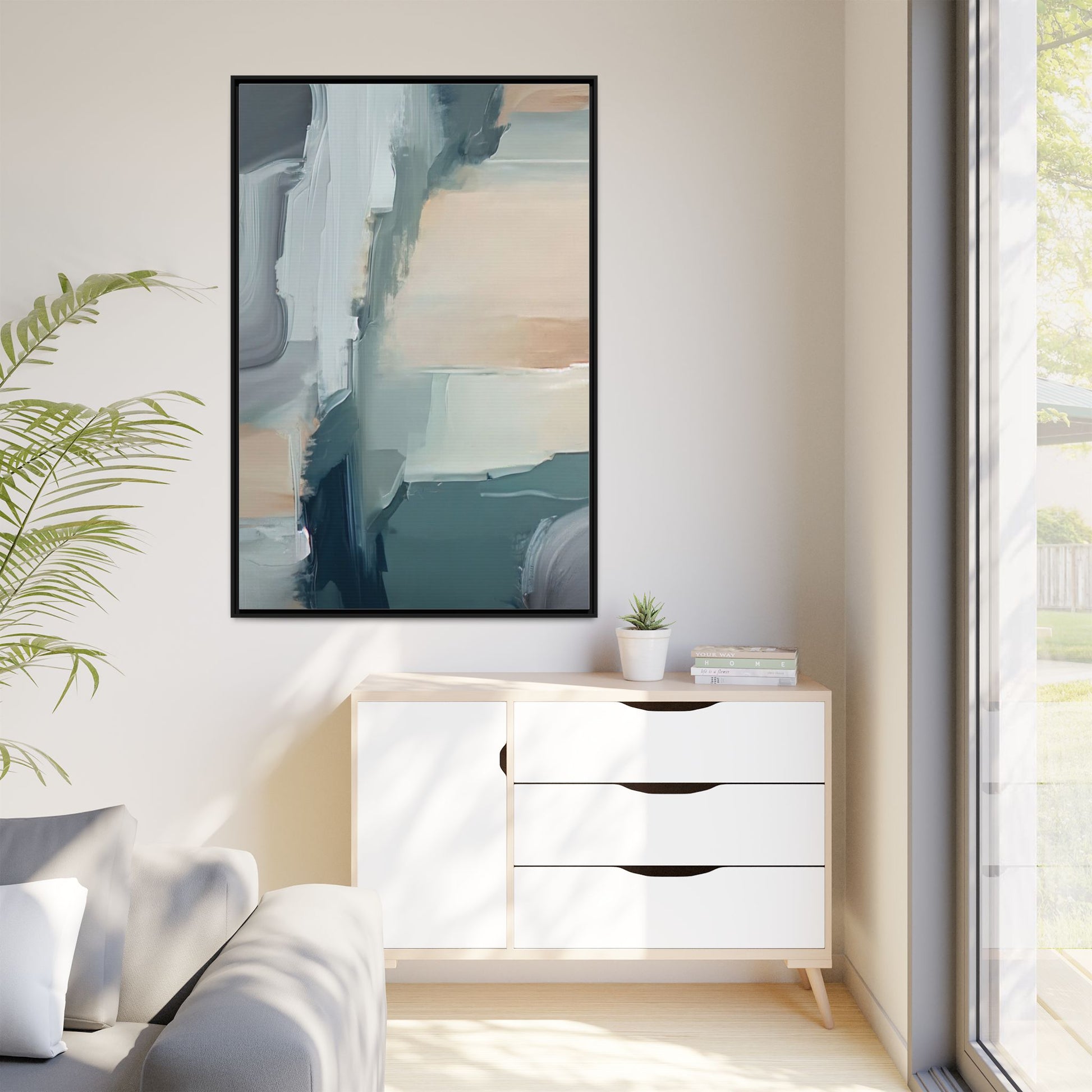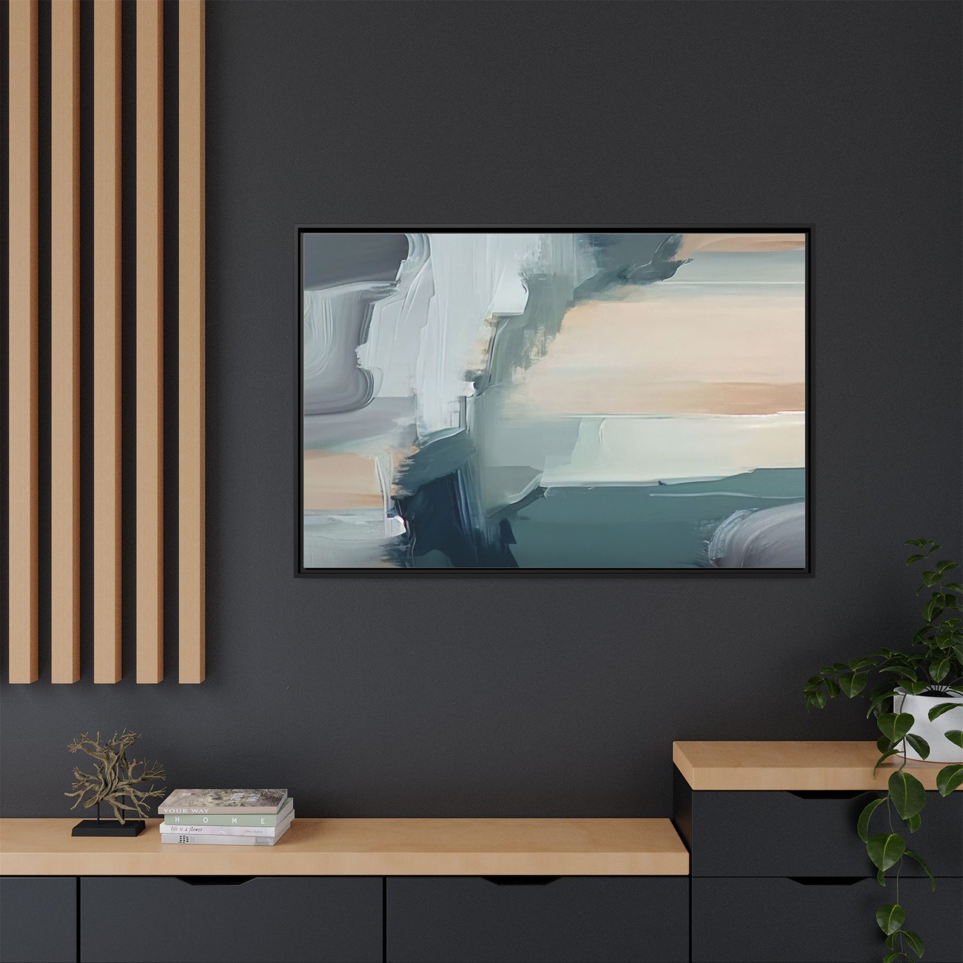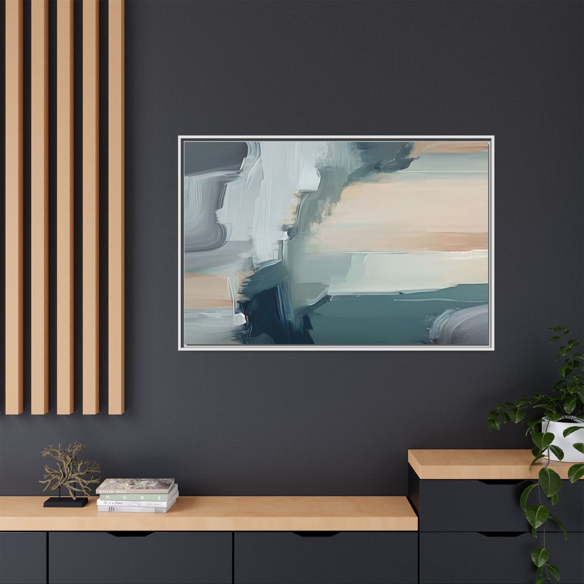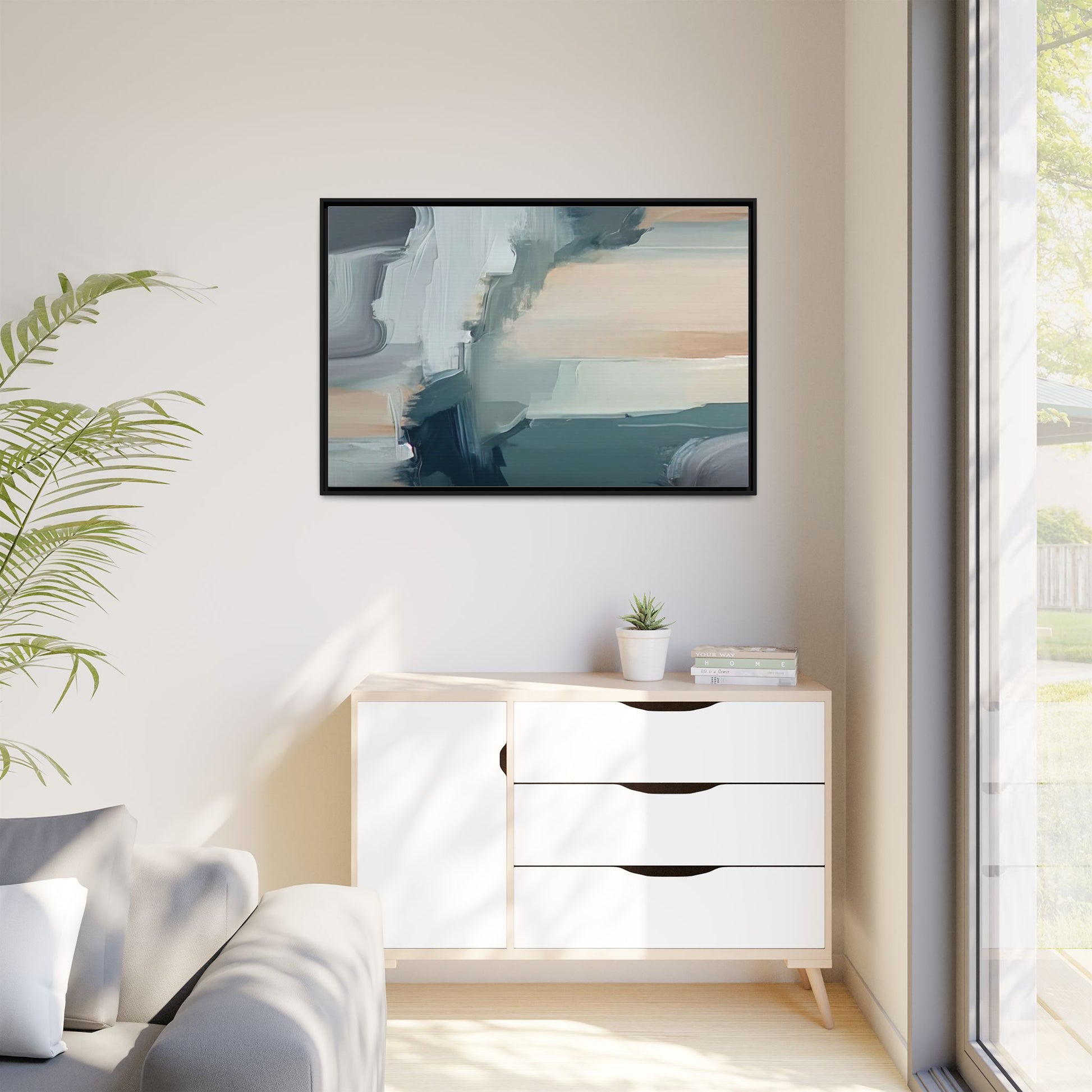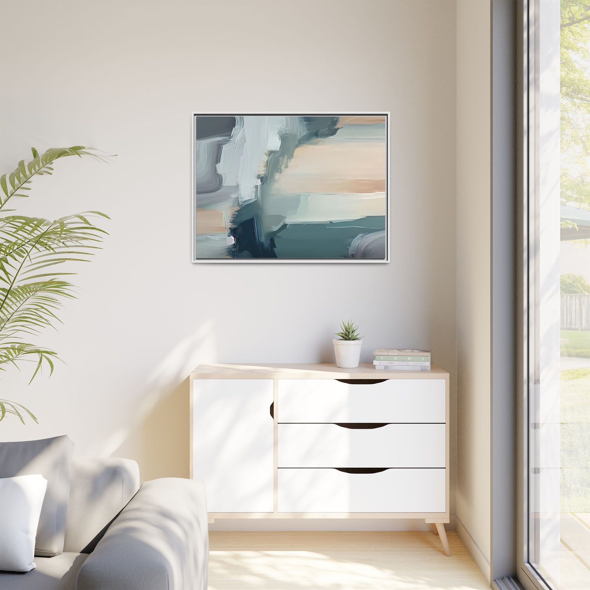 This captivating abstract artwork features a dynamic composition of blended blues, whites, and soft peach tones, creating a fluid and ethereal landscape-like scene. The painting employs a technique of sweeping, layered brushstrokes that seem to blur and merge, generating a sense of movement and depth across the canvas. Soft, almost translucent edges create a dreamy, atmospheric quality, with darker teal and slate blue hues contrasting against lighter, more delicate white and cream sections. The image evokes a sense of a distant horizon or a fragmented seascape, with organic shapes that suggest geological formations or abstract cloud-like structures. The brushwork appears both intentional and spontaneous, giving the artwork a sense of emotional depth and visual complexity.