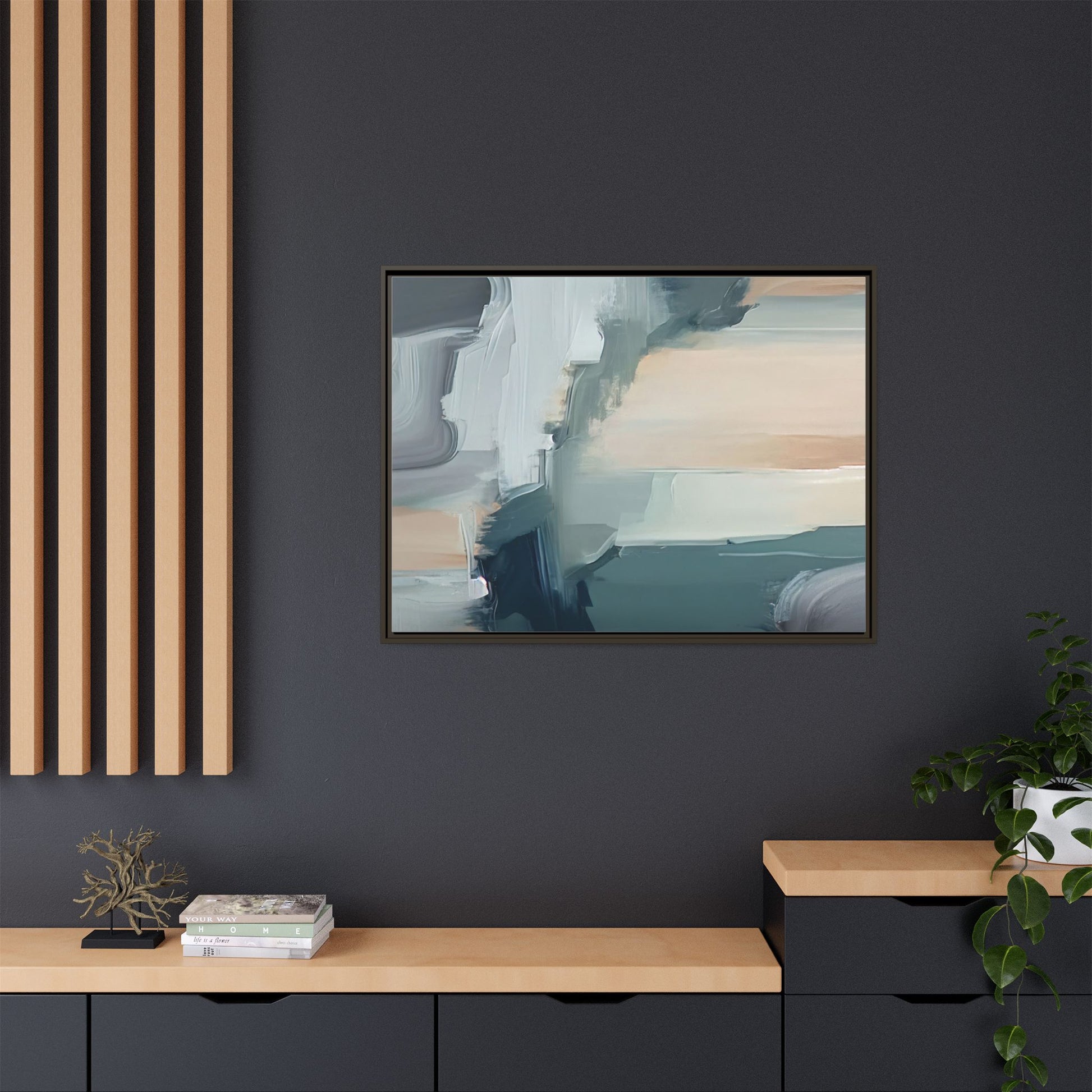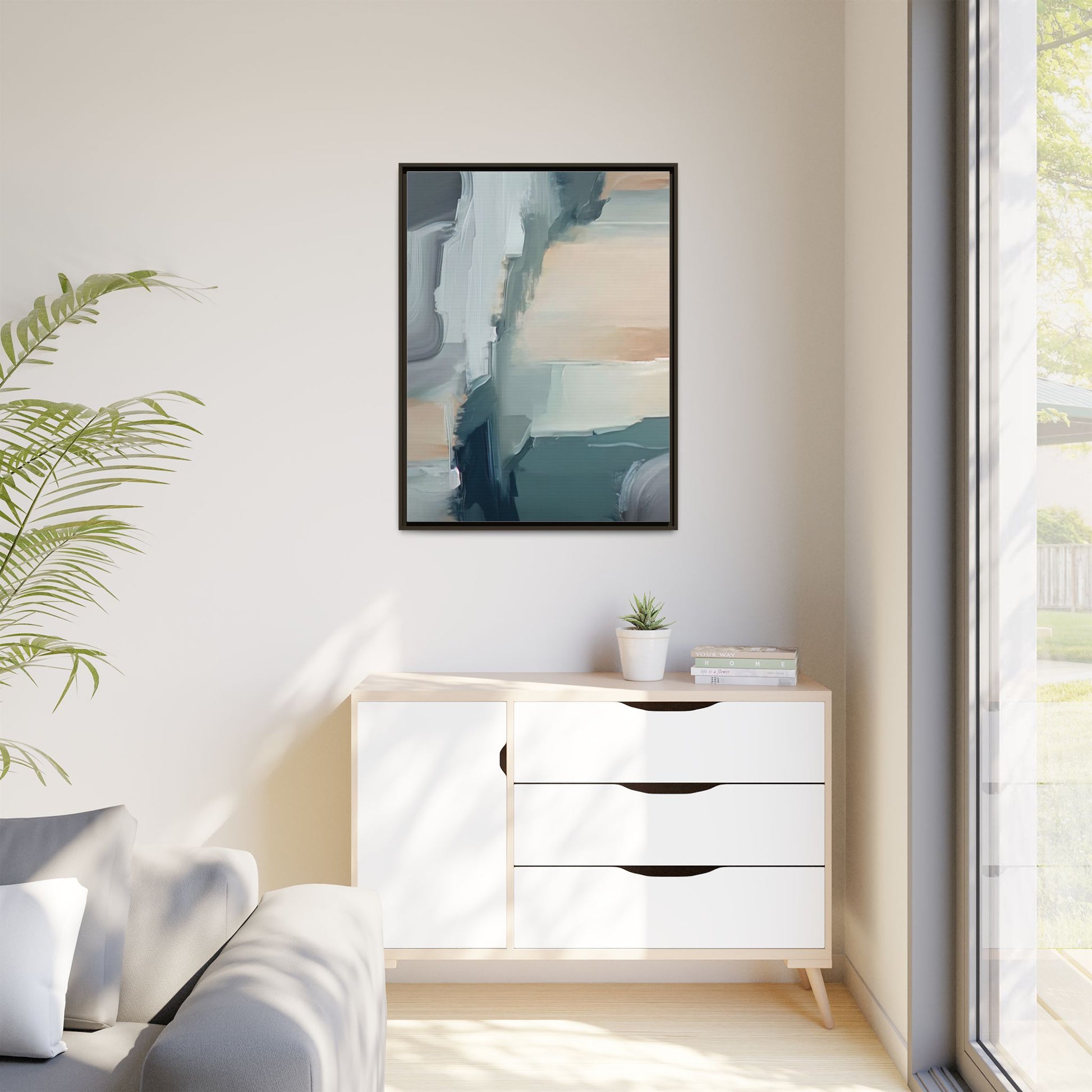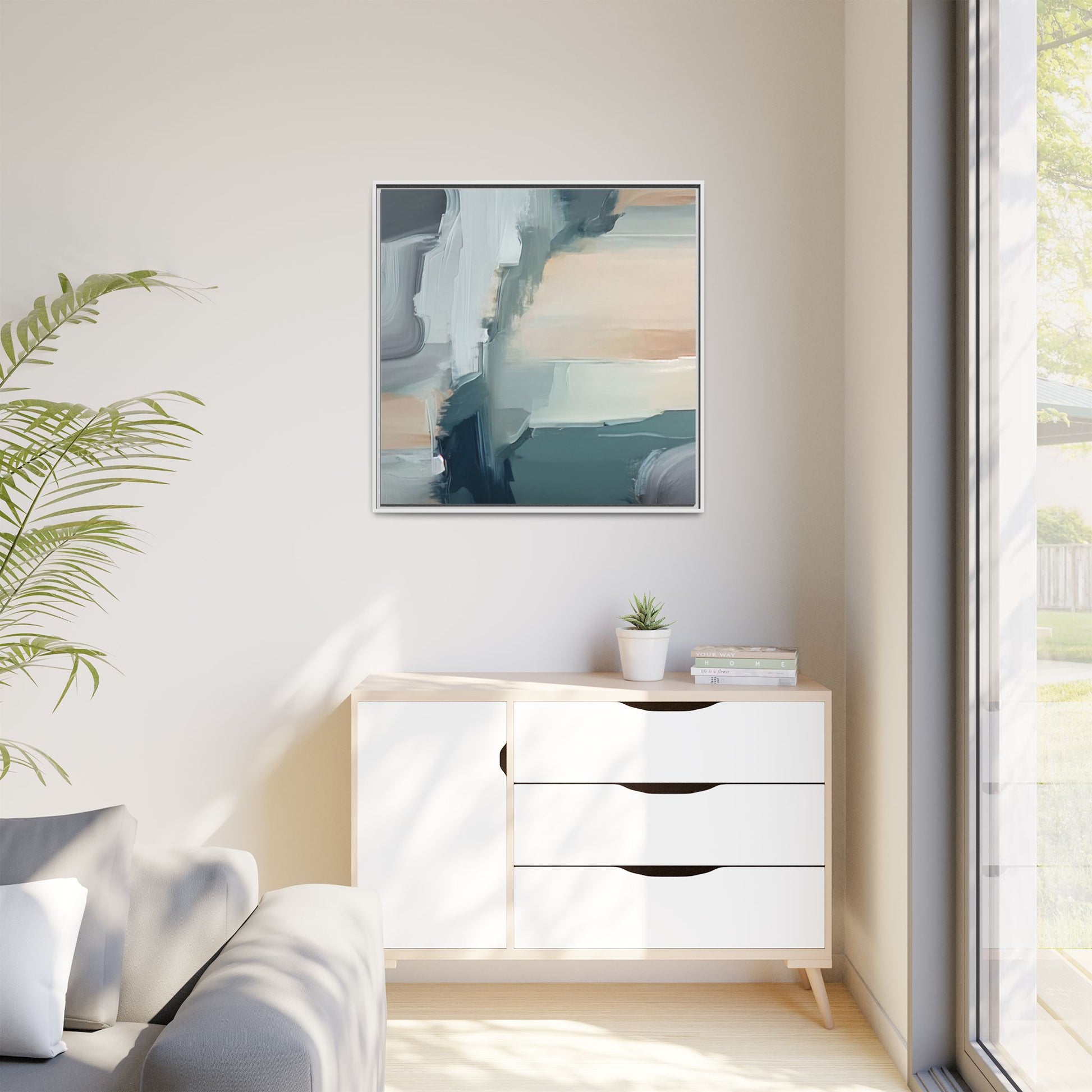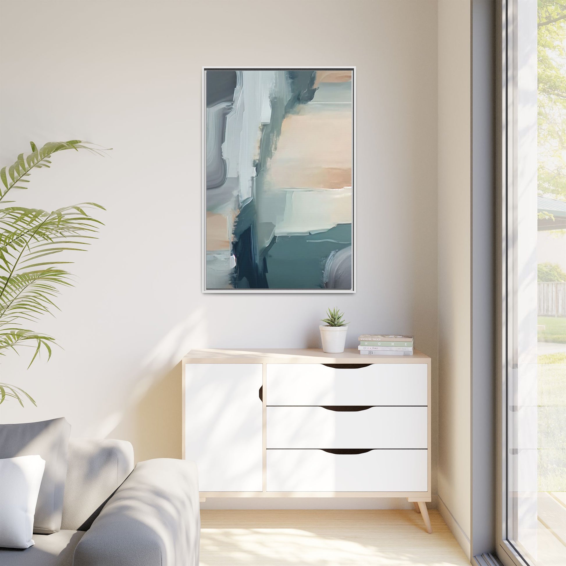 This captivating abstract artwork features a dynamic composition of blended blues, whites, and soft peach tones, creating a fluid and ethereal landscape-like scene. The painting employs a technique of sweeping, layered brushstrokes that seem to blur and merge, generating a sense of movement and depth across the canvas. Soft, almost translucent edges create a dreamy, atmospheric quality, with darker teal and slate blue hues contrasting against lighter, more delicate white and cream sections. The image evokes a sense of a distant horizon or a fragmented seascape, with organic shapes that suggest geological formations or abstract cloud-like structures. The brushwork appears both intentional and spontaneous, giving the artwork a sense of emotional depth and visual complexity.