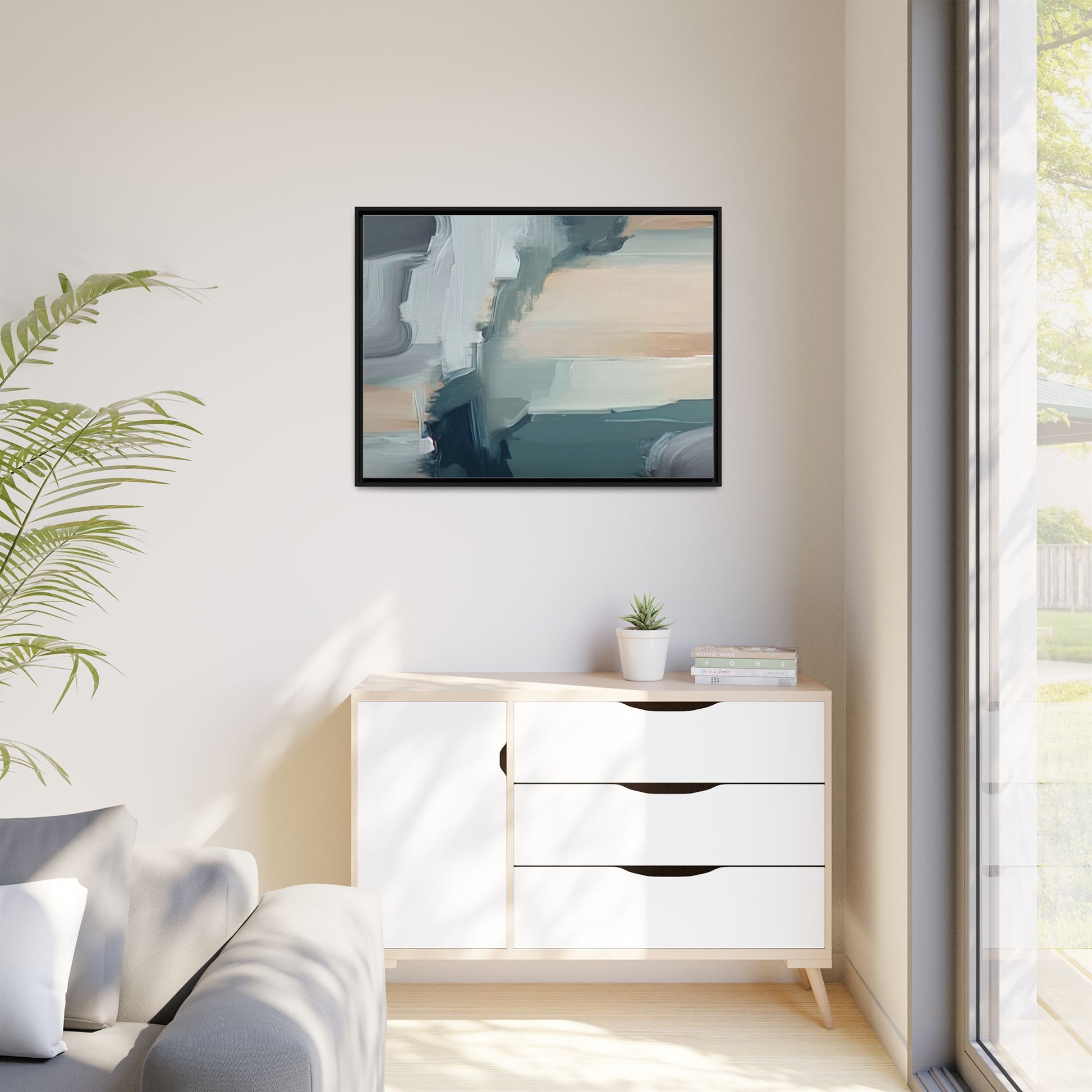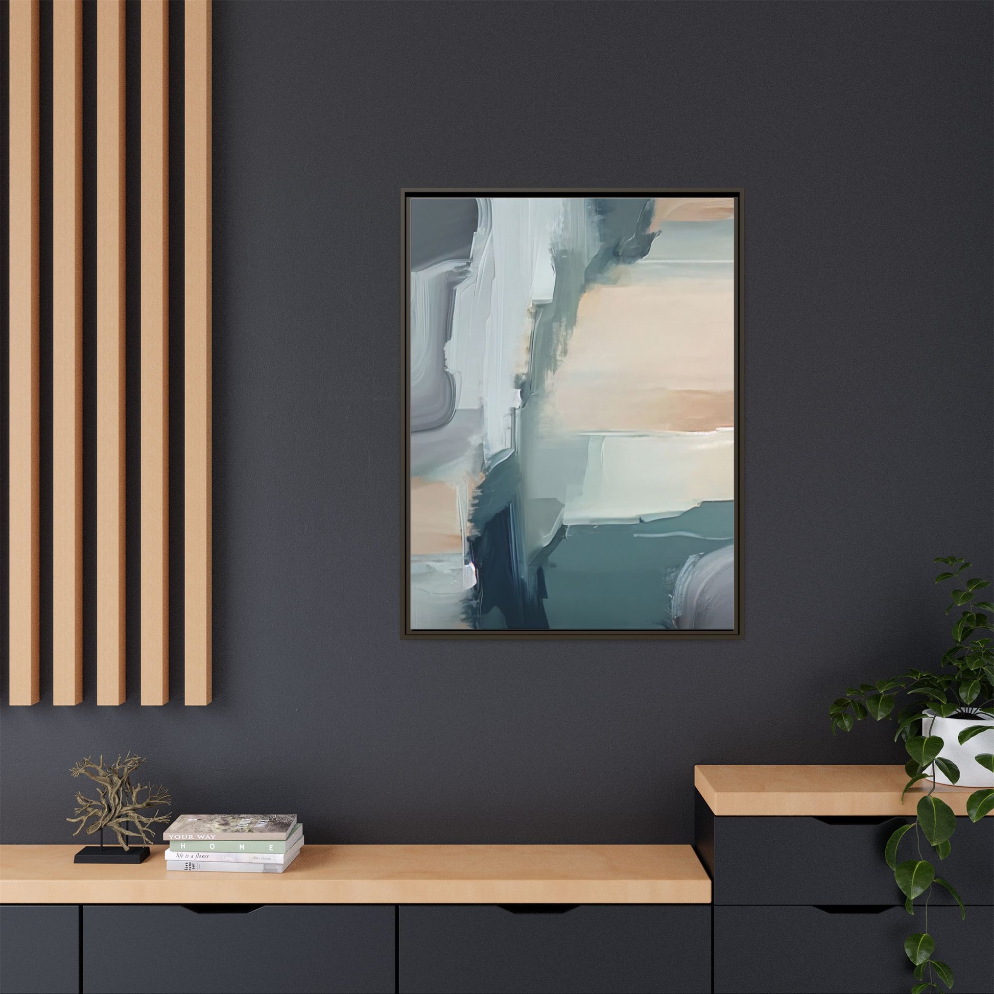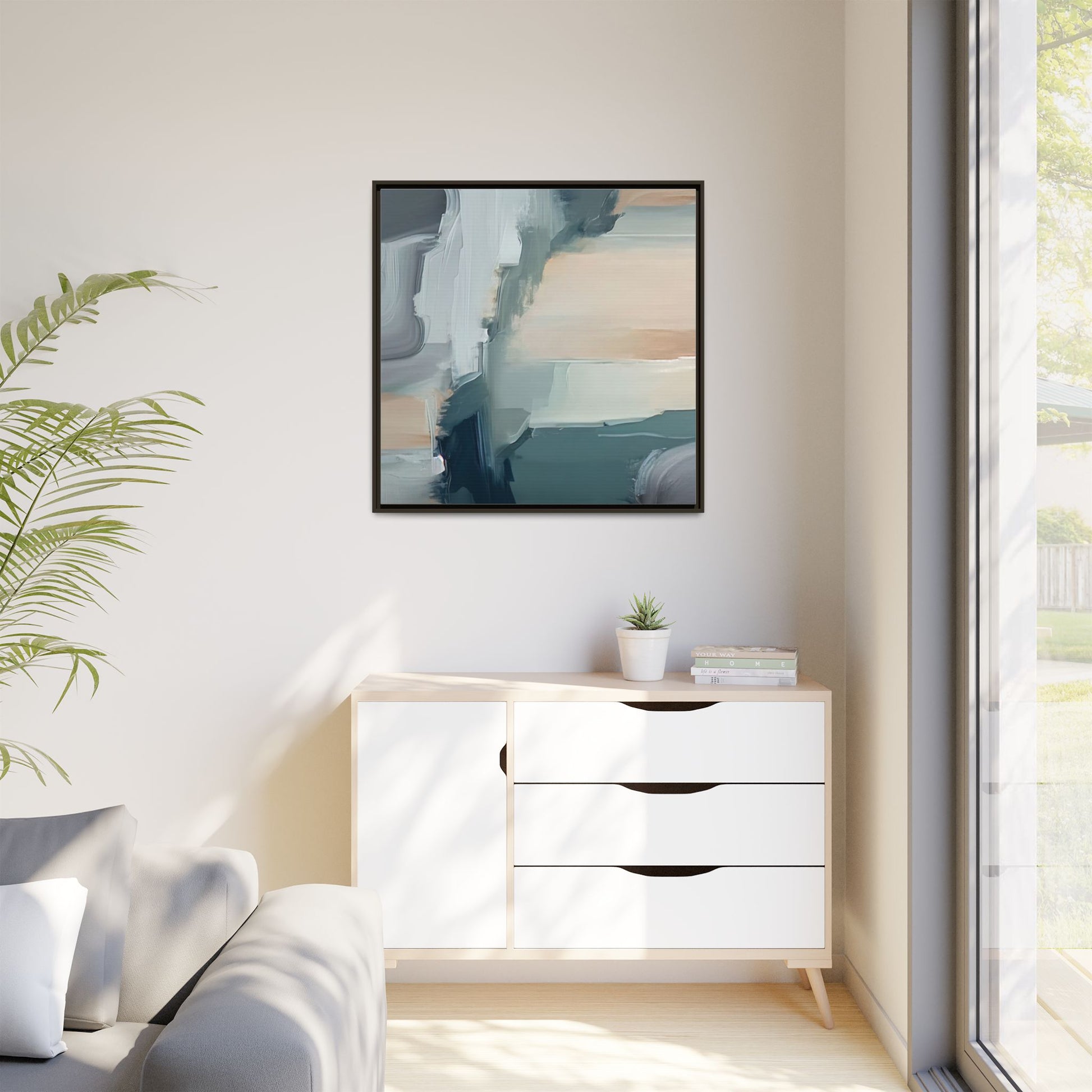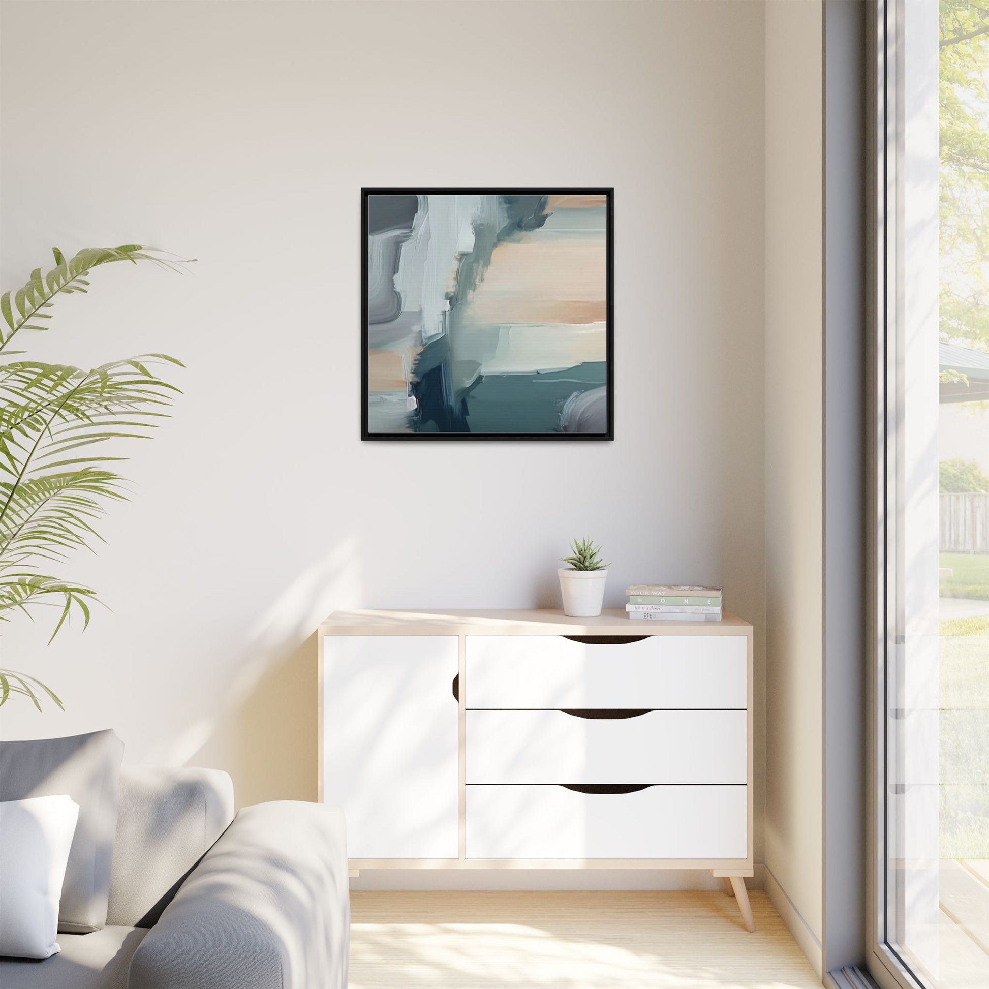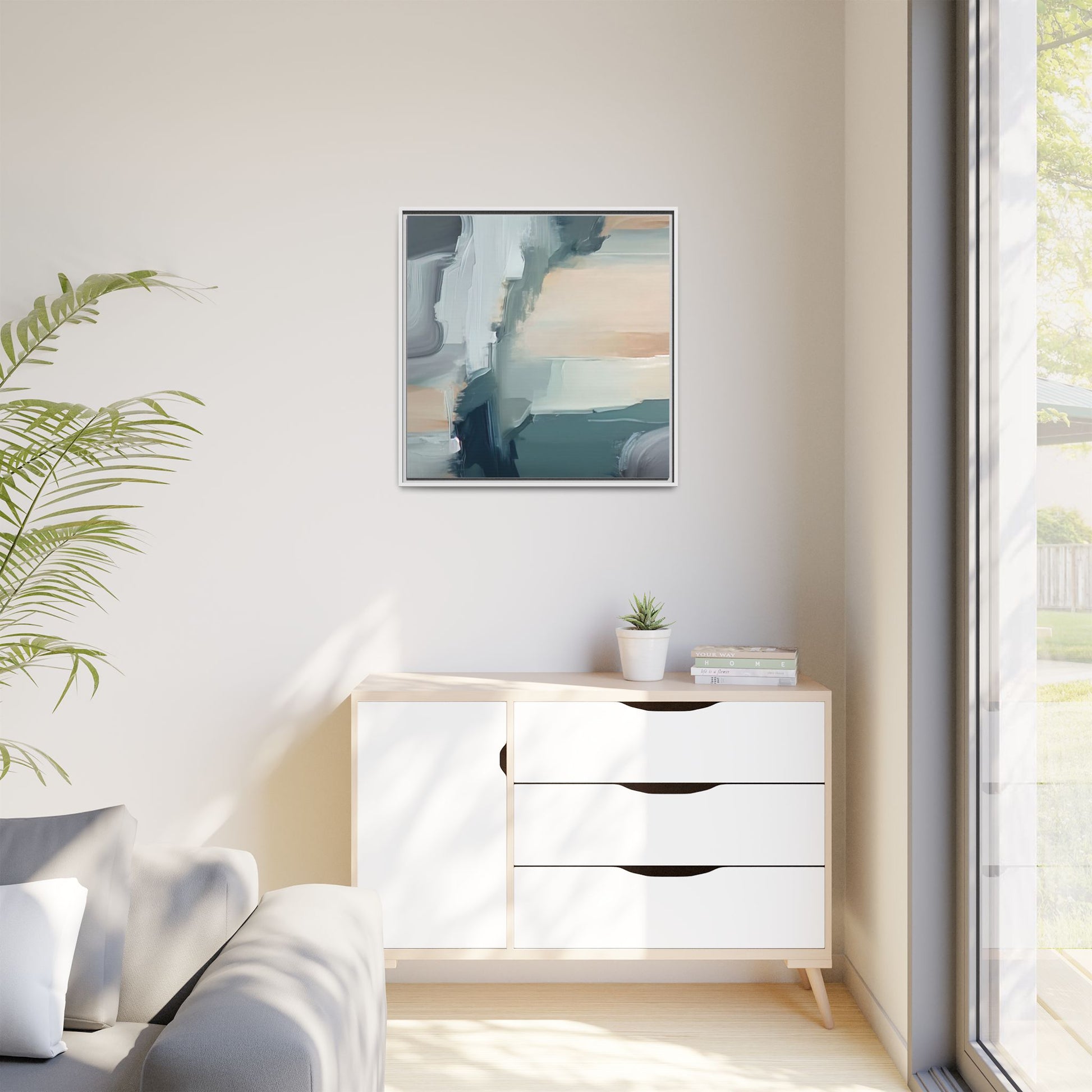 This captivating abstract artwork features a dynamic composition of blended blues, whites, and soft peach tones, creating a fluid and ethereal landscape-like scene. The painting employs a technique of sweeping, layered brushstrokes that seem to blur and merge, generating a sense of movement and depth across the canvas. Soft, almost translucent edges create a dreamy, atmospheric quality, with darker teal and slate blue hues contrasting against lighter, more delicate white and cream sections. The image evokes a sense of a distant horizon or a fragmented seascape, with organic shapes that suggest geological formations or abstract cloud-like structures. The brushwork appears both intentional and spontaneous, giving the artwork a sense of emotional depth and visual complexity.
