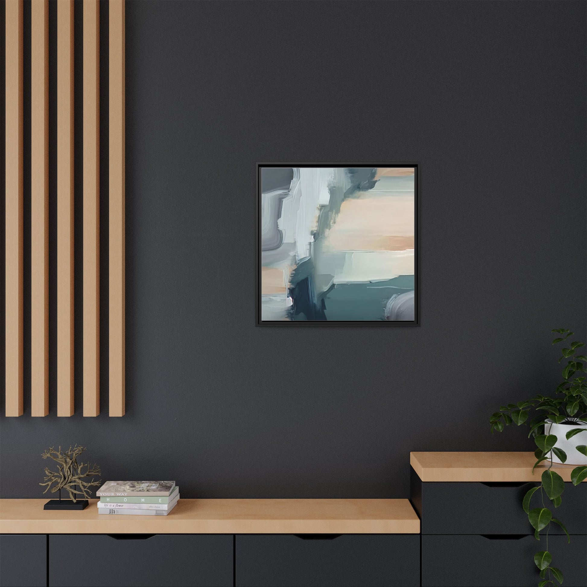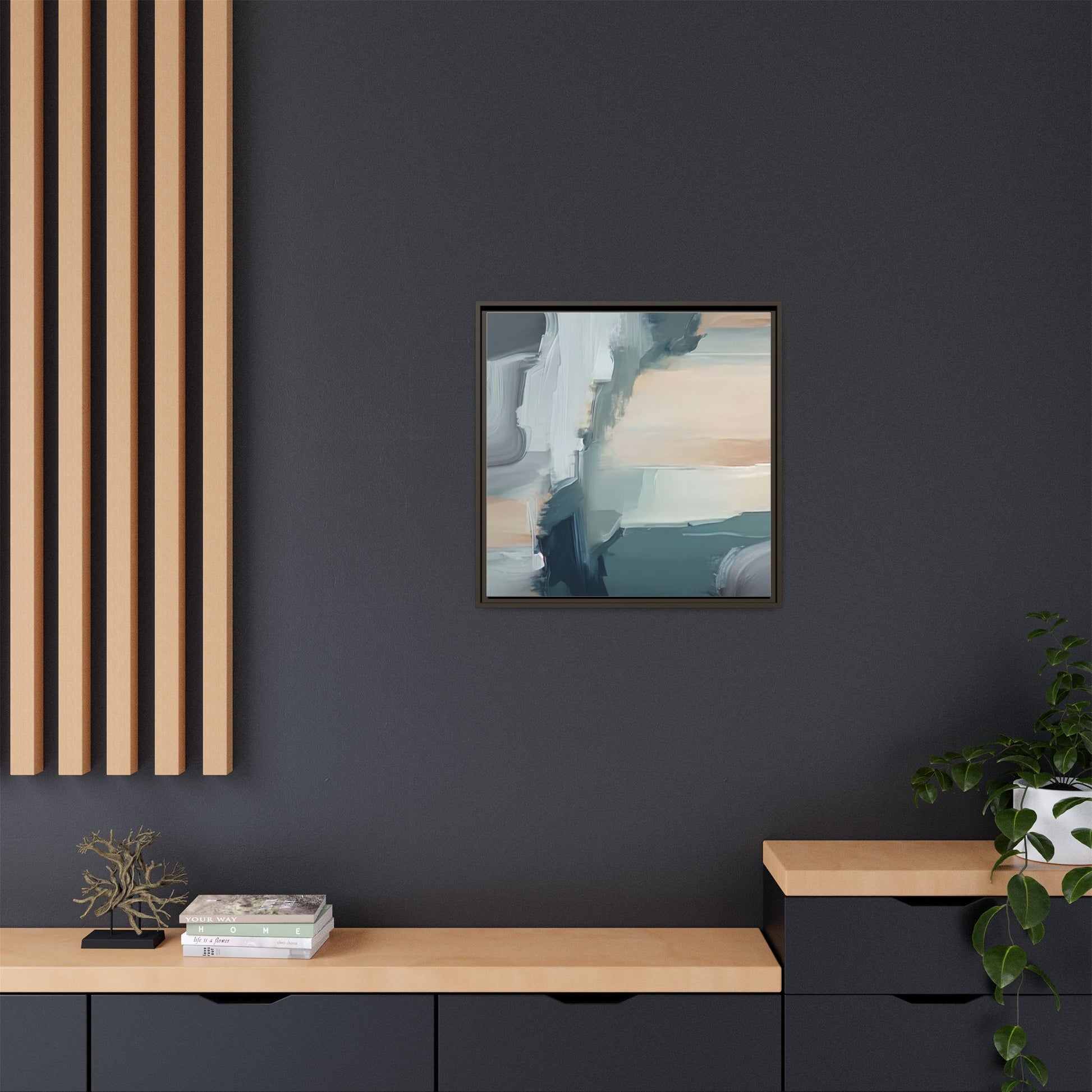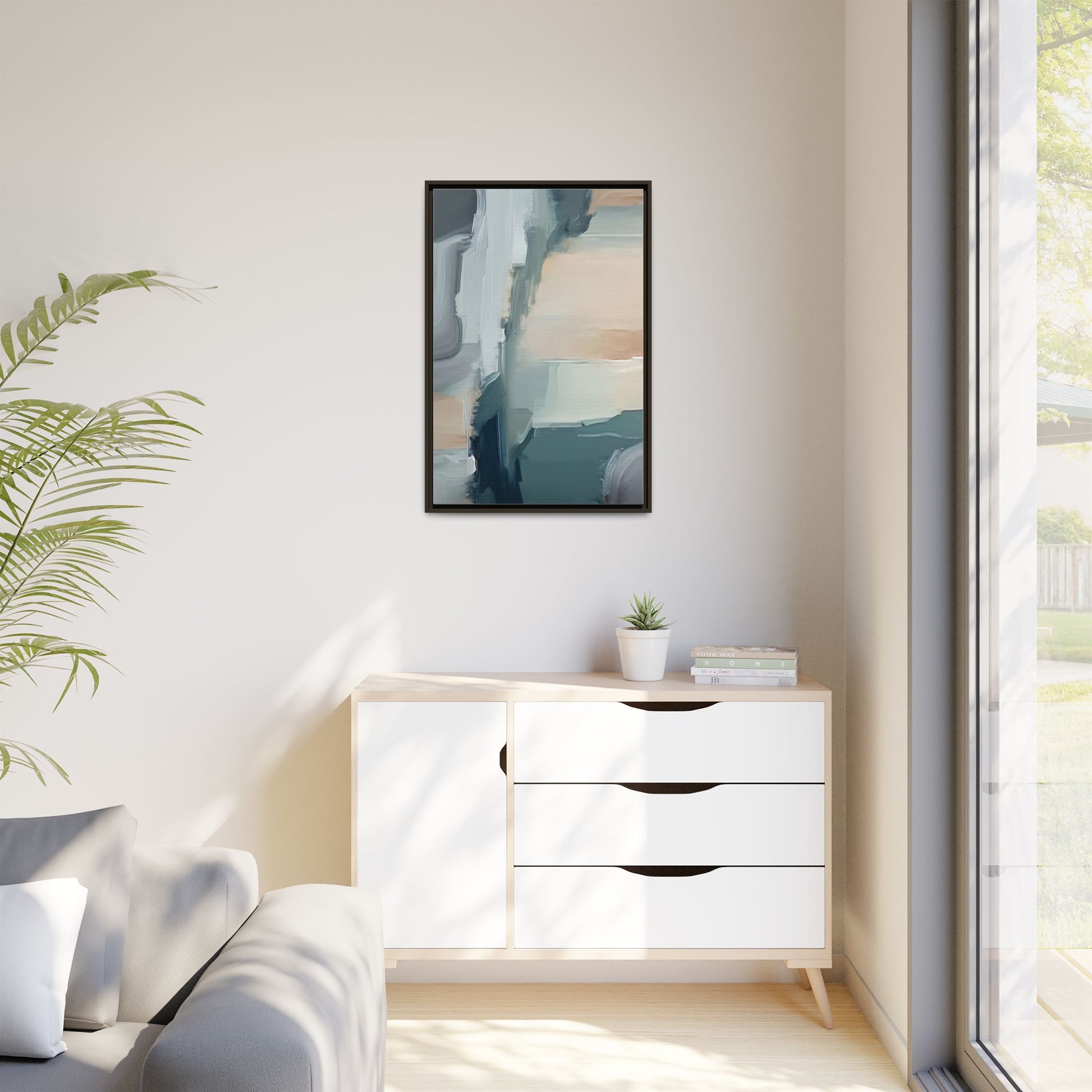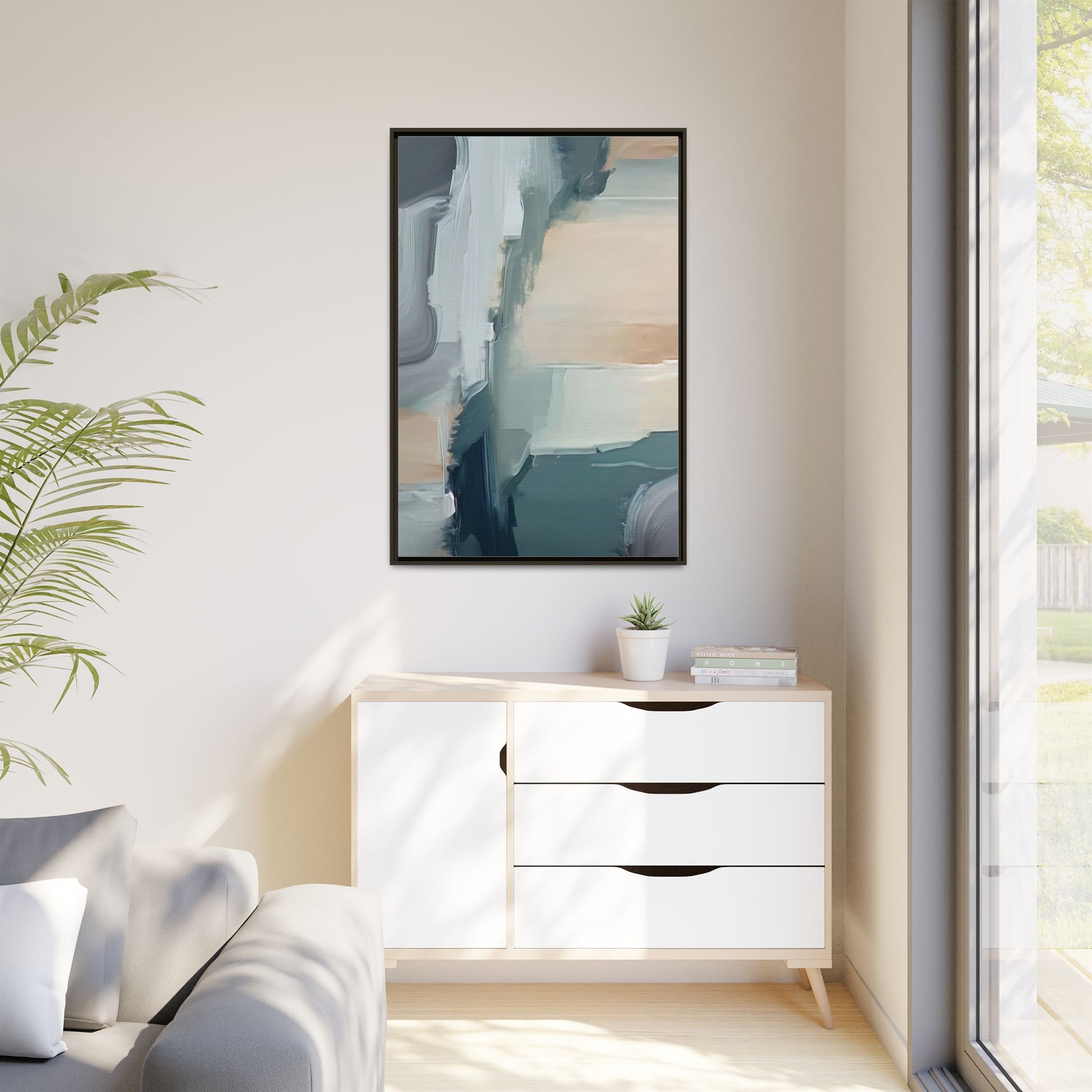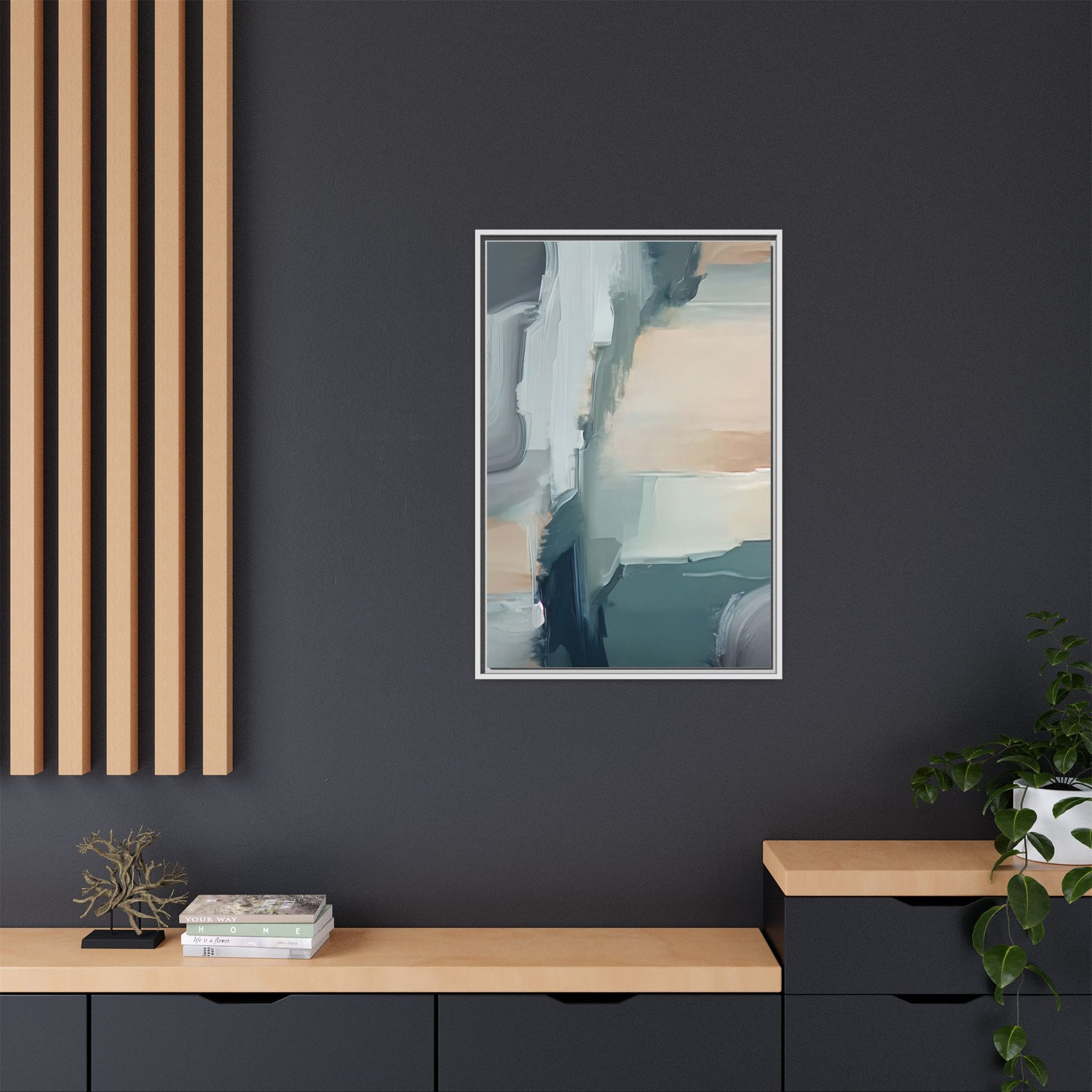 This captivating abstract artwork features a dynamic composition of blended blues, whites, and soft peach tones, creating a fluid and ethereal landscape-like scene. The painting employs a technique of sweeping, layered brushstrokes that seem to blur and merge, generating a sense of movement and depth across the canvas. Soft, almost translucent edges create a dreamy, atmospheric quality, with darker teal and slate blue hues contrasting against lighter, more delicate white and cream sections. The image evokes a sense of a distant horizon or a fragmented seascape, with organic shapes that suggest geological formations or abstract cloud-like structures. The brushwork appears both intentional and spontaneous, giving the artwork a sense of emotional depth and visual complexity.