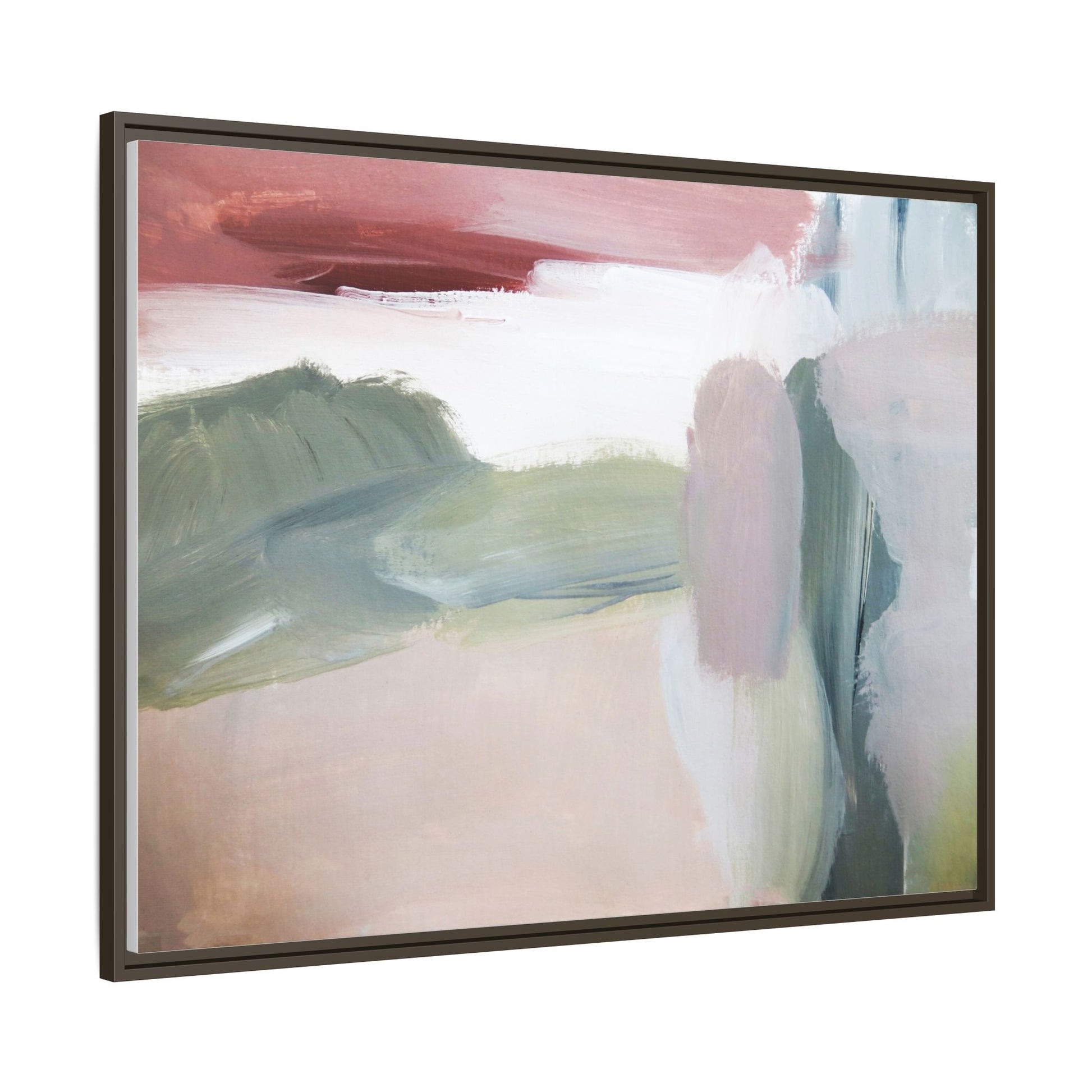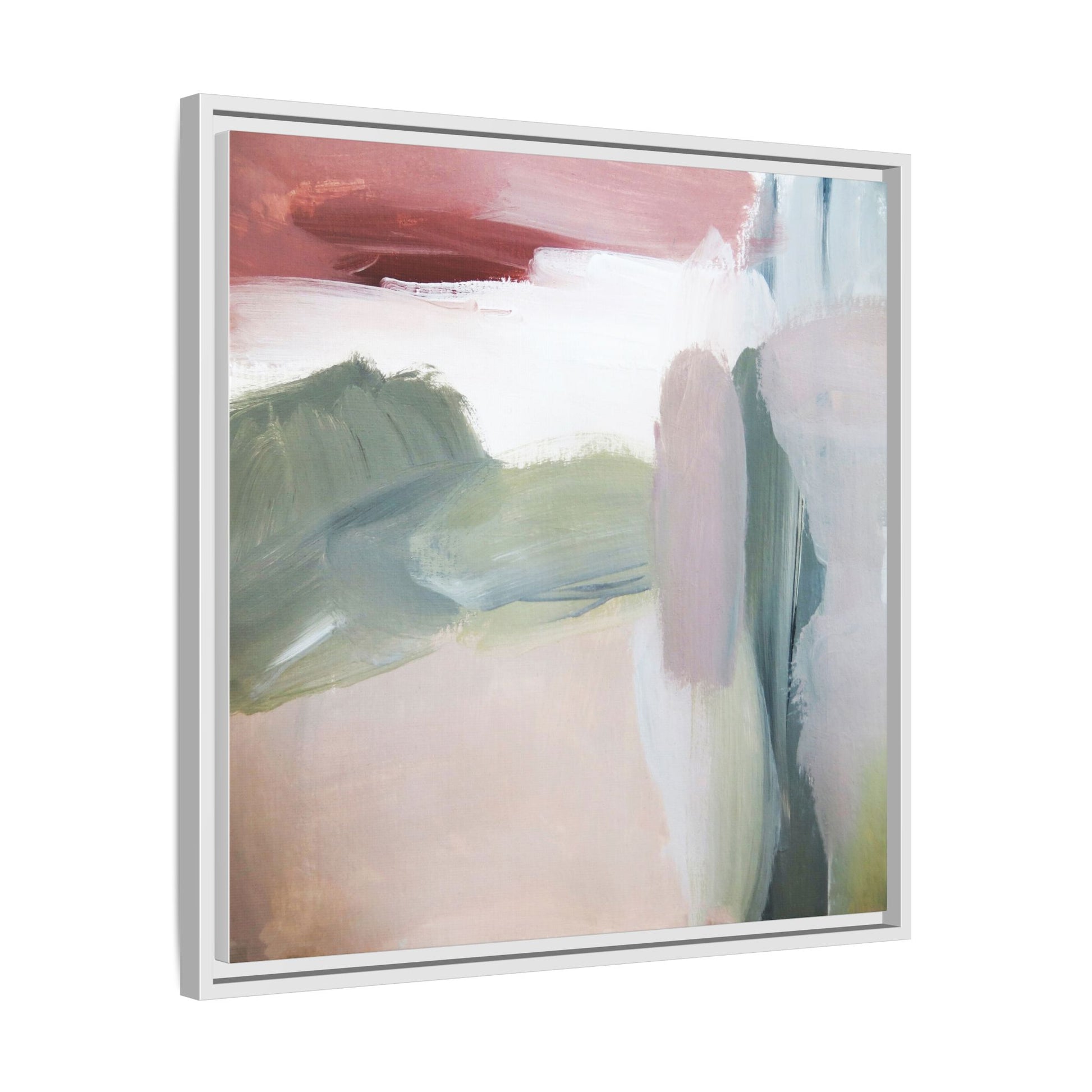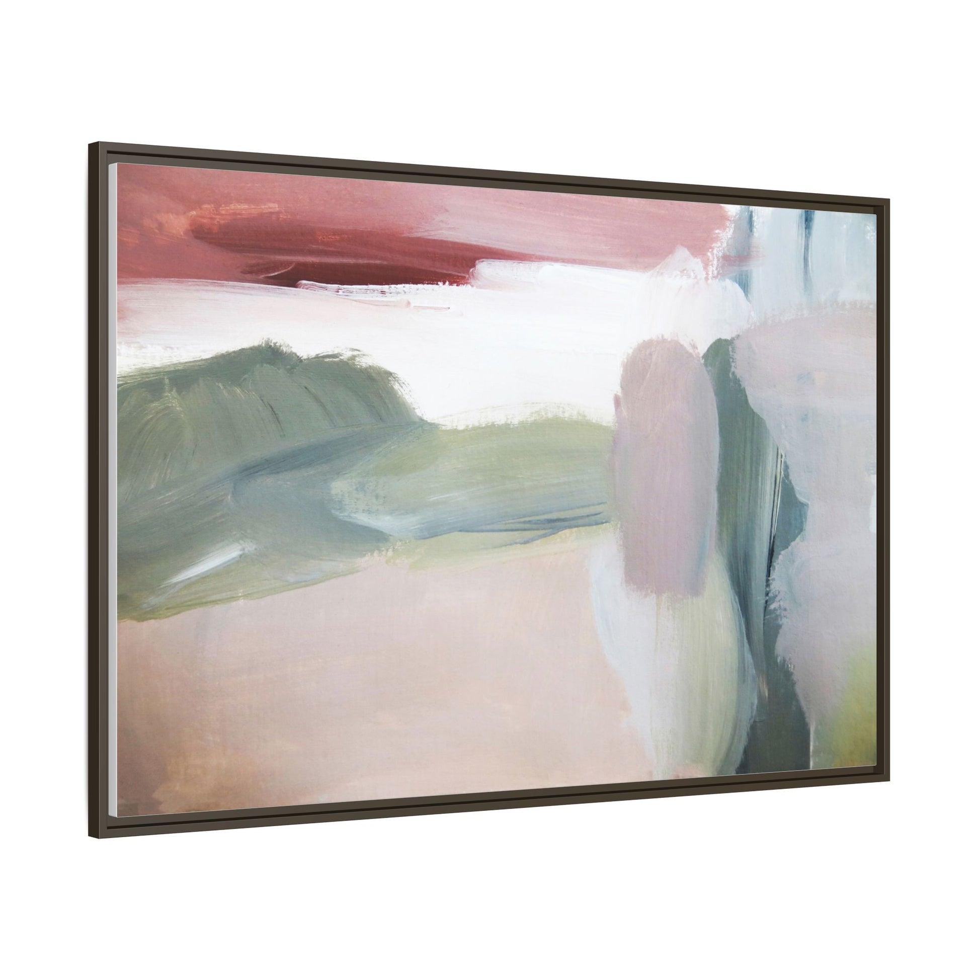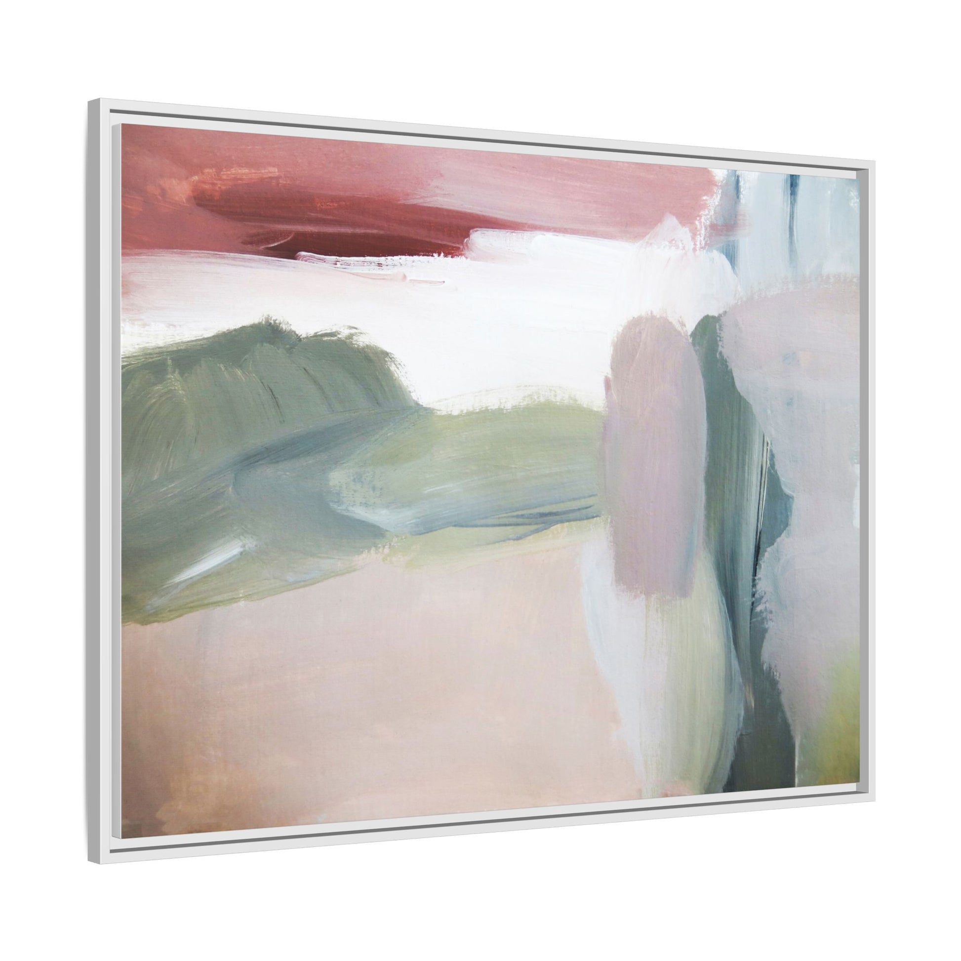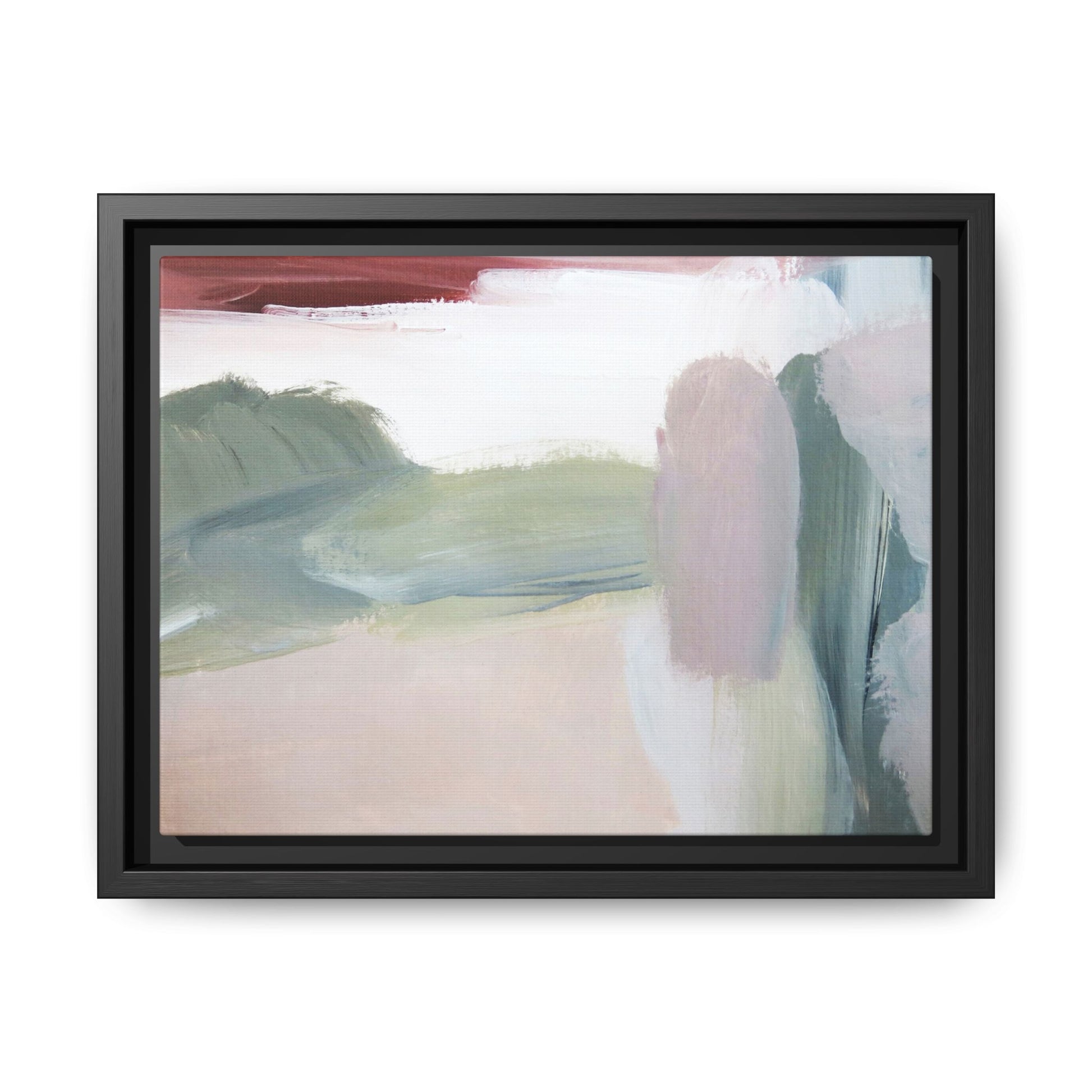 This abstract painting features a soft, ethereal landscape composed of muted, blended colors including pale pink, sage green, white, and hints of deep burgundy. The artwork employs a fluid, impressionistic style with broad, sweeping brushstrokes that create a sense of movement and depth across the canvas. Soft, diffused edges blend different color sections together, creating a dreamlike and harmonious composition that suggests a distant, misty horizon or landscape. The color palette evokes a sense of tranquility and subtle emotional resonance, with each hue gently transitioning into the next. The painting's technique appears to be oil or acrylic, with layers of color overlapping and creating a sense of atmospheric depth and gentle complexity.