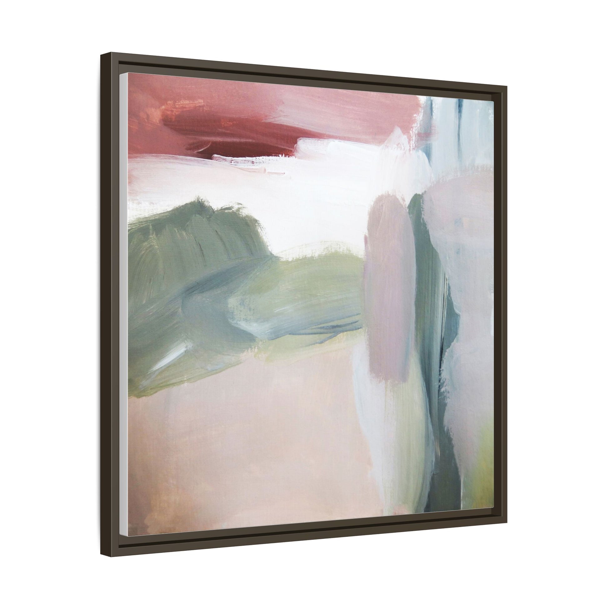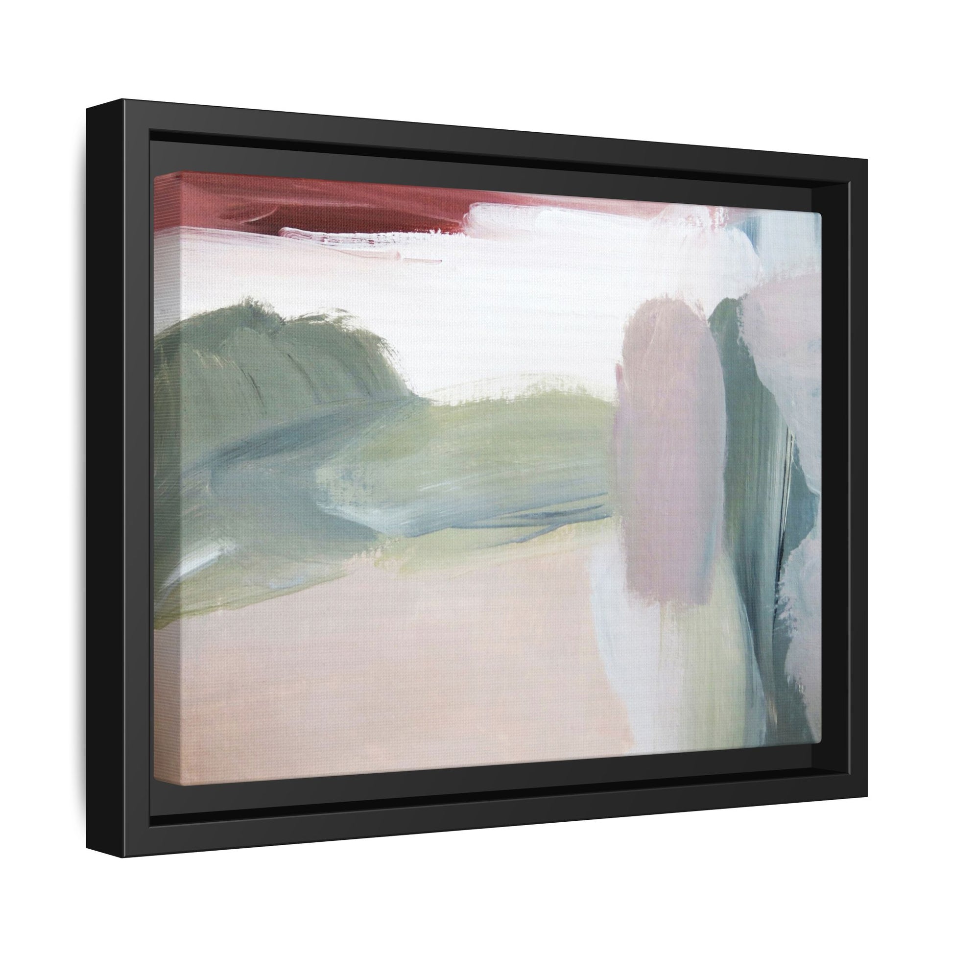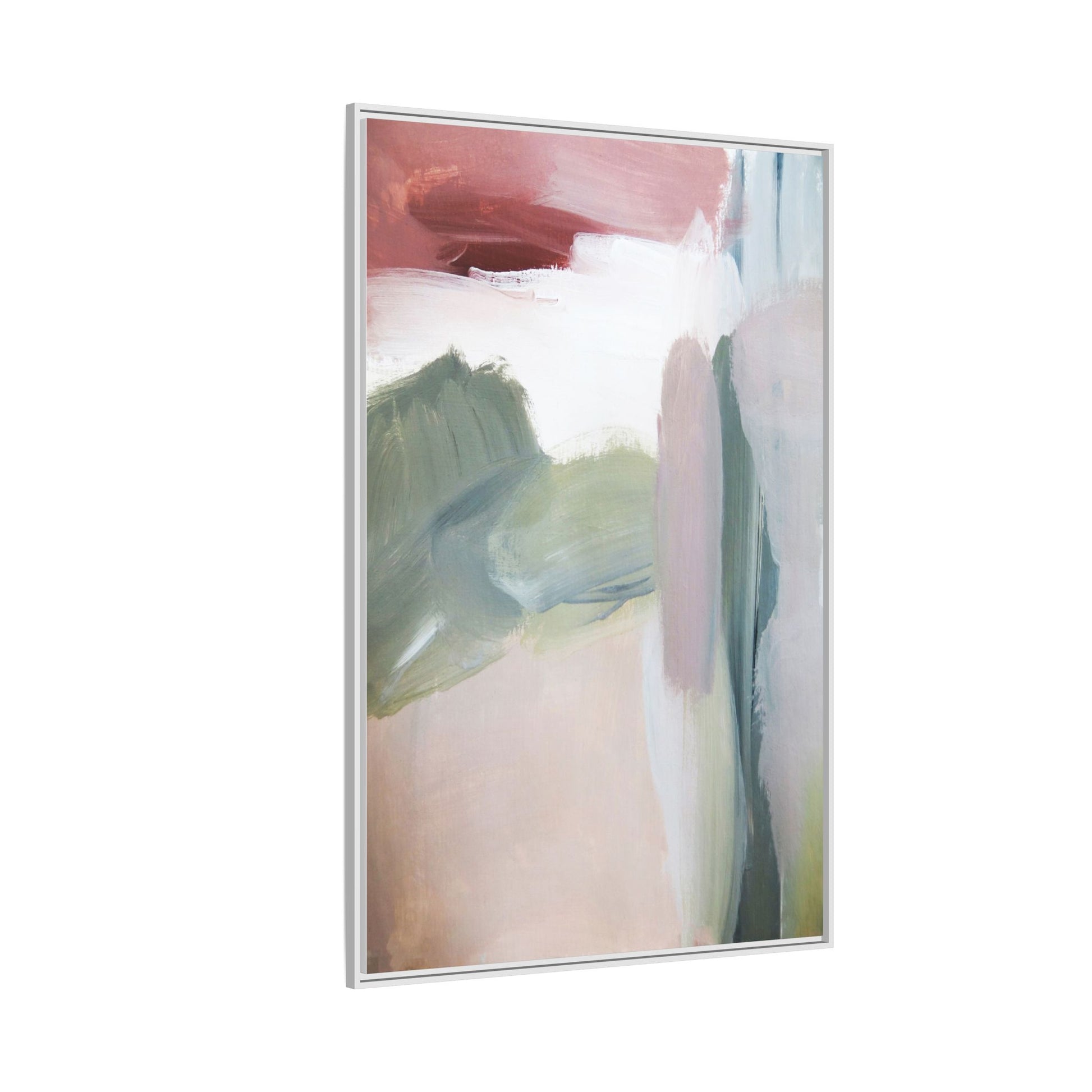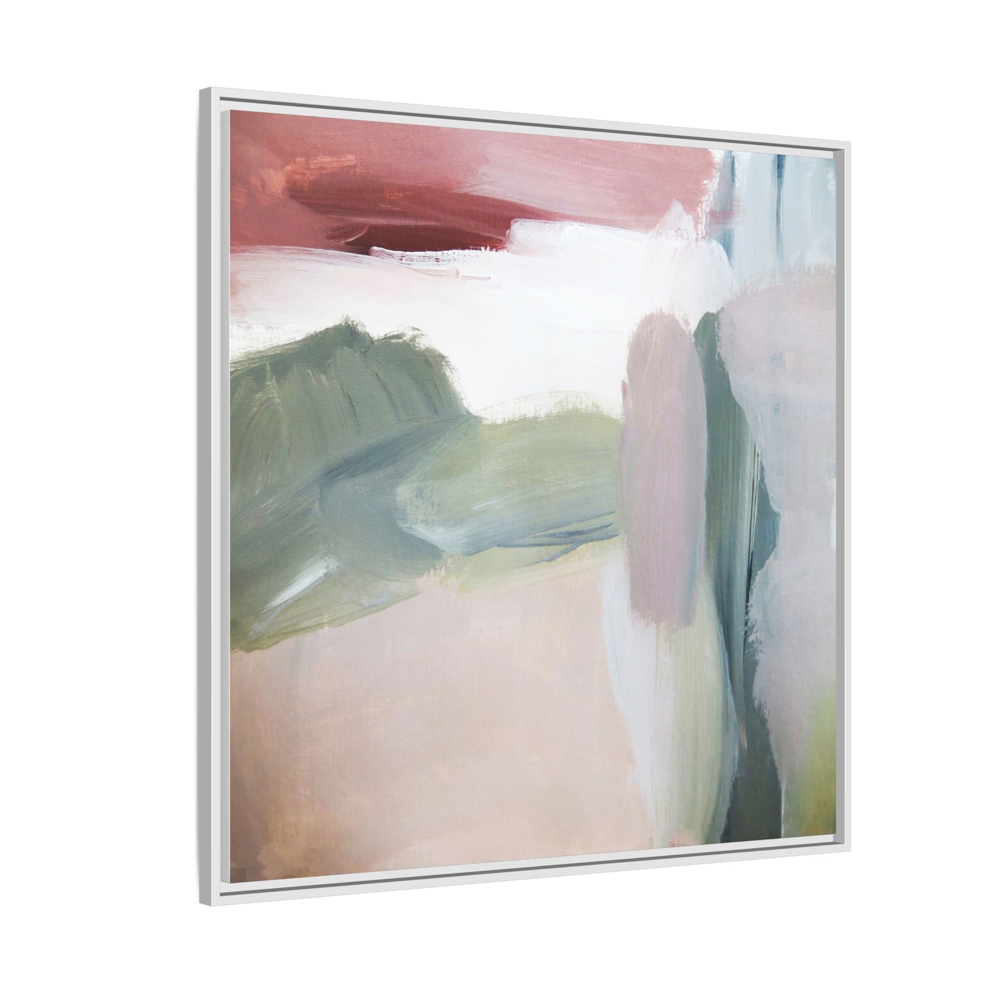 This abstract painting features a soft, ethereal landscape composed of muted, blended colors including pale pink, sage green, white, and hints of deep burgundy. The artwork employs a fluid, impressionistic style with broad, sweeping brushstrokes that create a sense of movement and depth across the canvas. Soft, diffused edges blend different color sections together, creating a dreamlike and harmonious composition that suggests a distant, misty horizon or landscape. The color palette evokes a sense of tranquility and subtle emotional resonance, with each hue gently transitioning into the next. The painting's technique appears to be oil or acrylic, with layers of color overlapping and creating a sense of atmospheric depth and gentle complexity.
