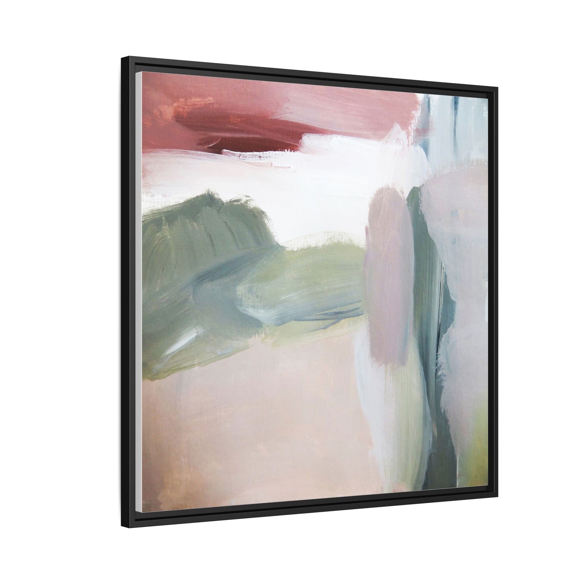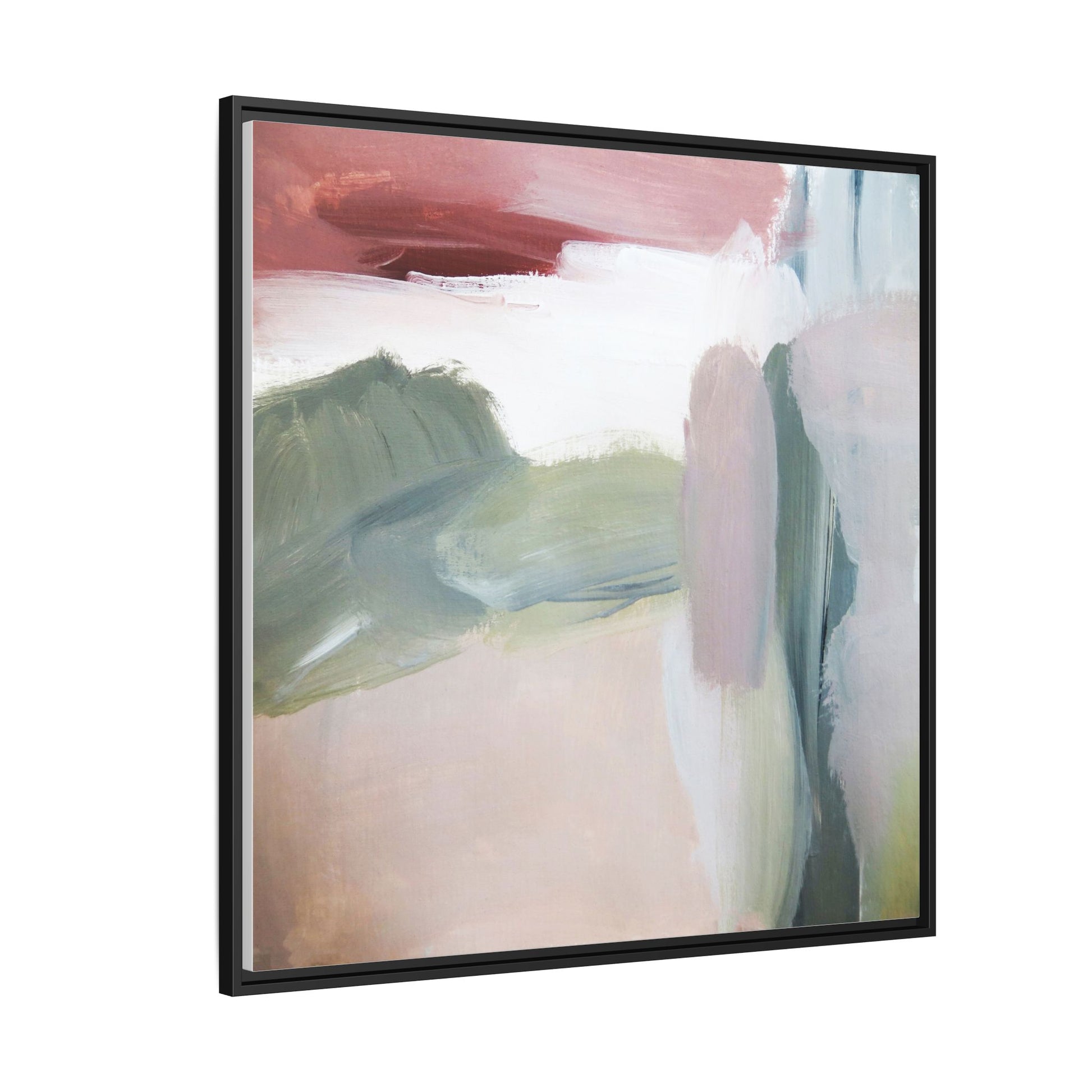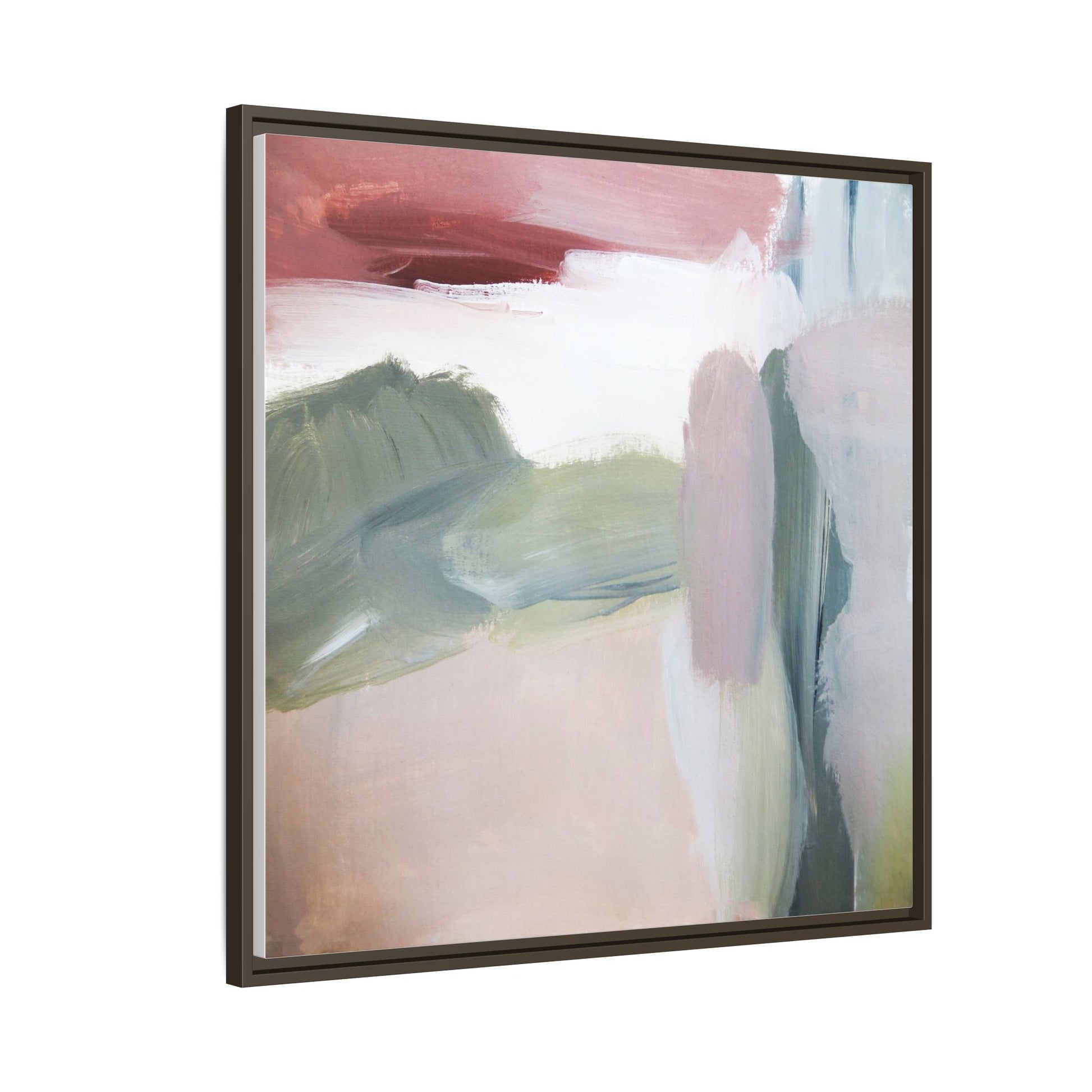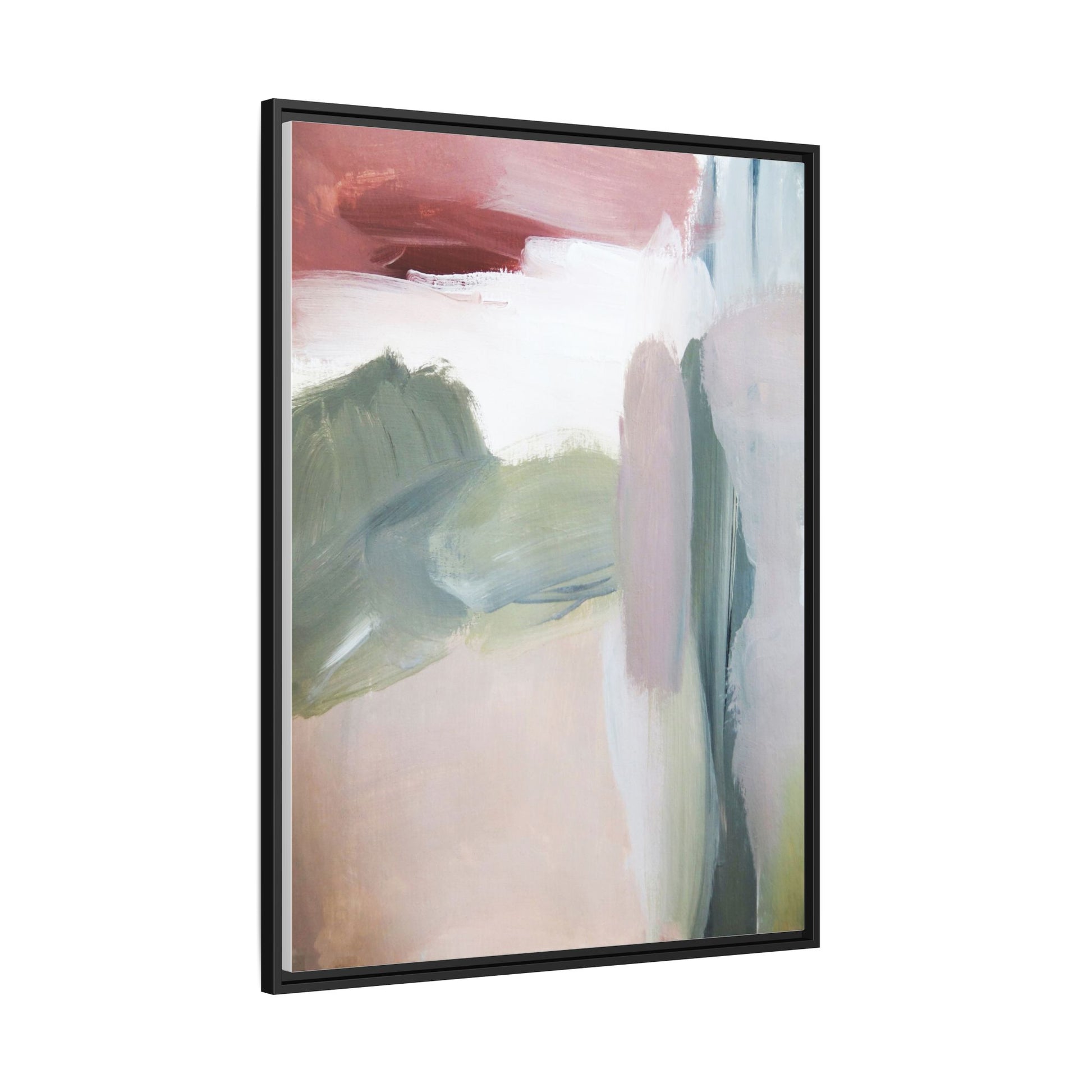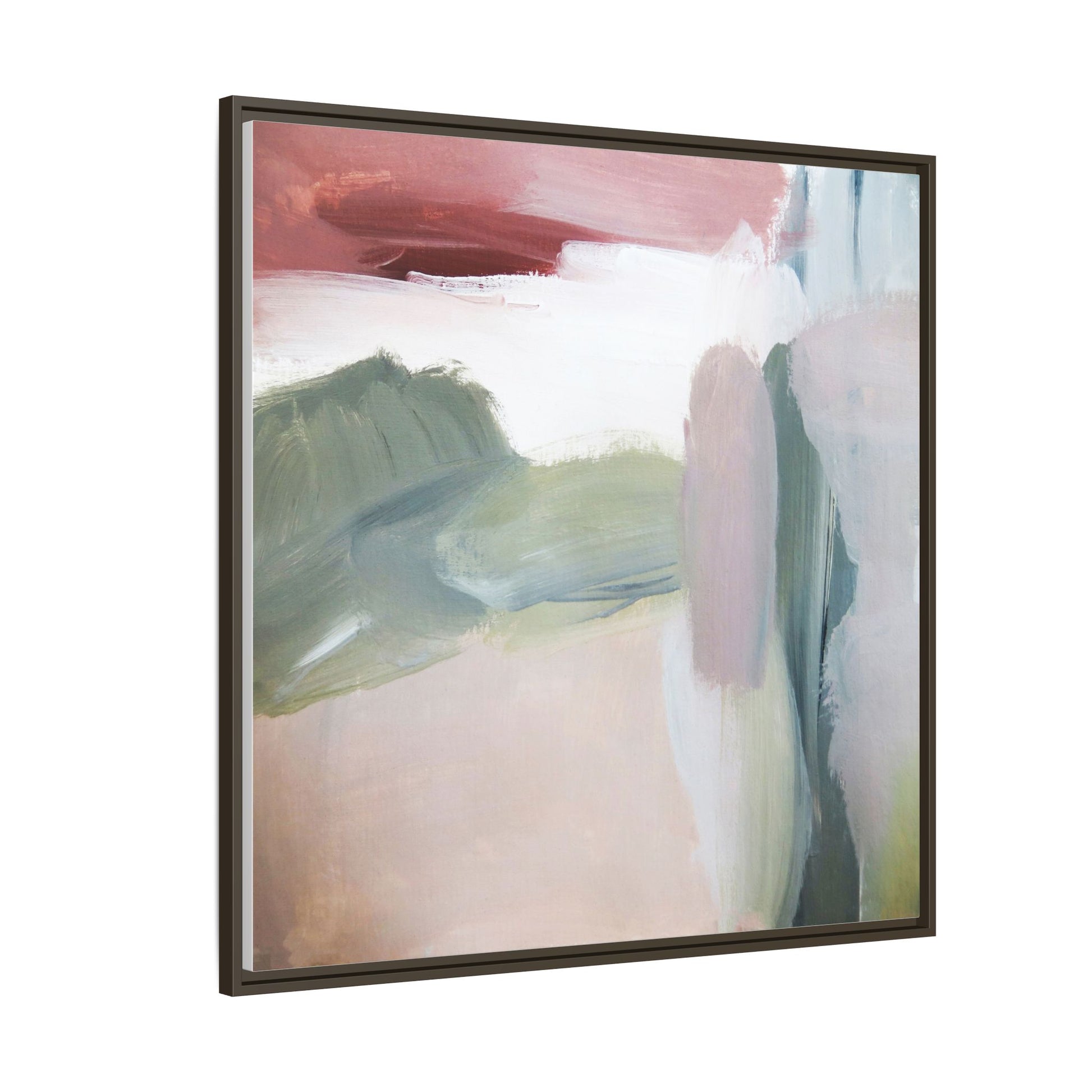 This abstract painting features a soft, ethereal landscape composed of muted, blended colors including pale pink, sage green, white, and hints of deep burgundy. The artwork employs a fluid, impressionistic style with broad, sweeping brushstrokes that create a sense of movement and depth across the canvas. Soft, diffused edges blend different color sections together, creating a dreamlike and harmonious composition that suggests a distant, misty horizon or landscape. The color palette evokes a sense of tranquility and subtle emotional resonance, with each hue gently transitioning into the next. The painting's technique appears to be oil or acrylic, with layers of color overlapping and creating a sense of atmospheric depth and gentle complexity.