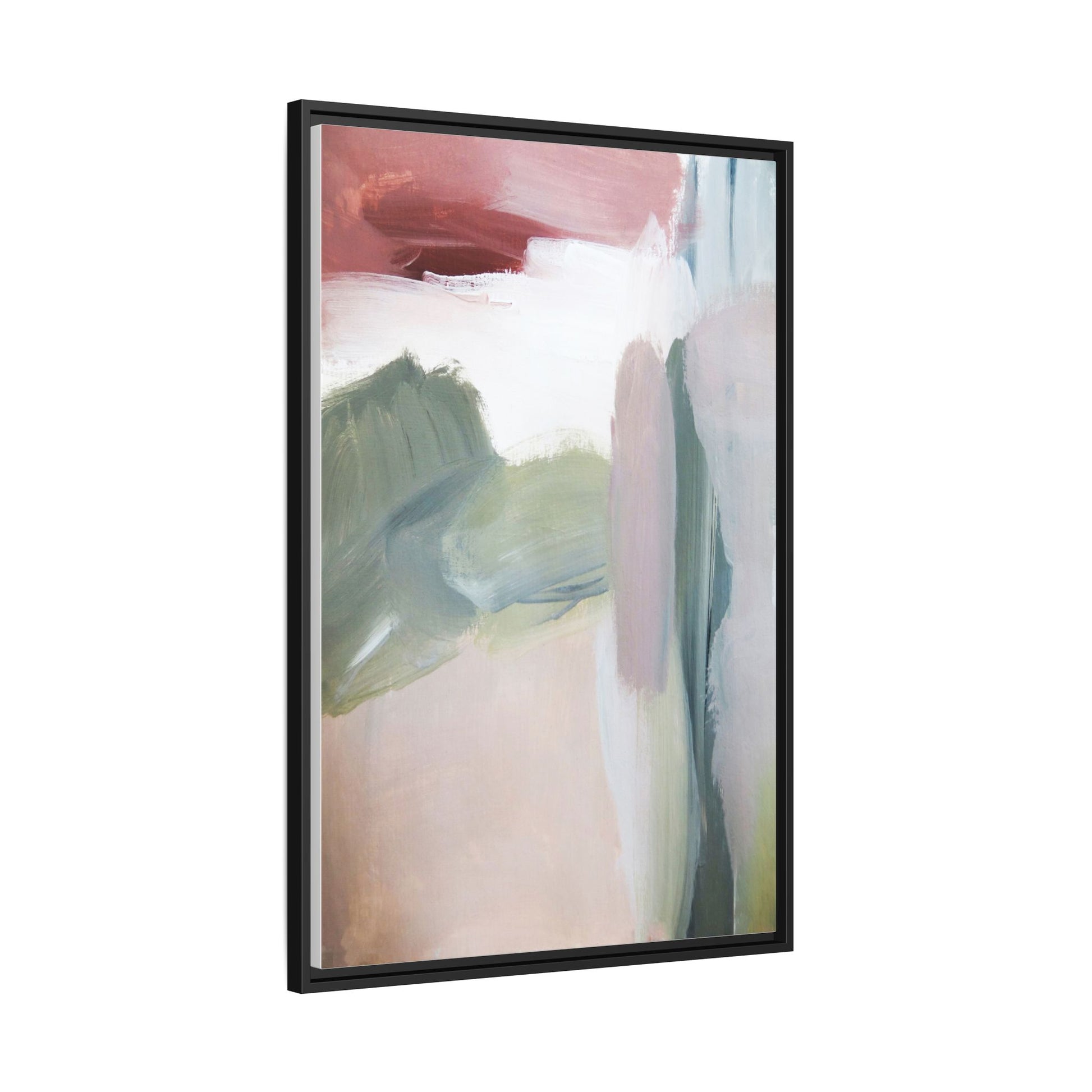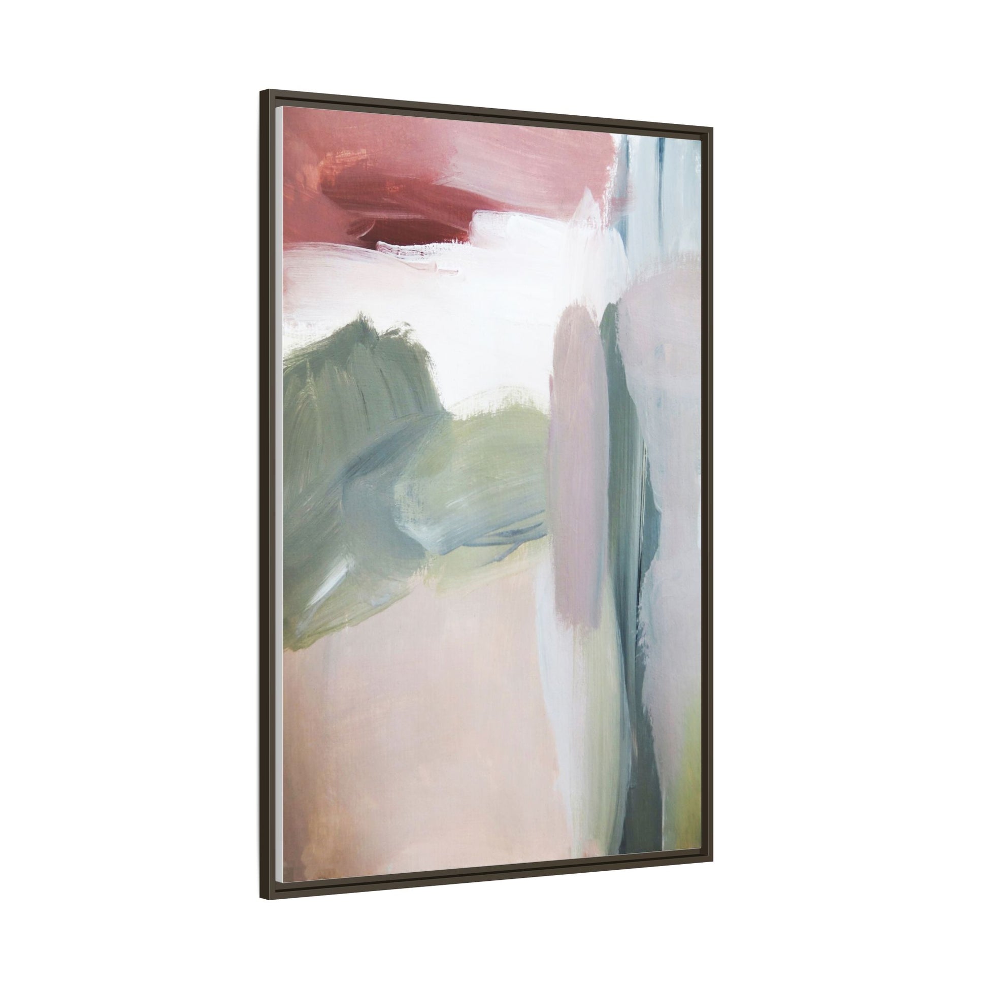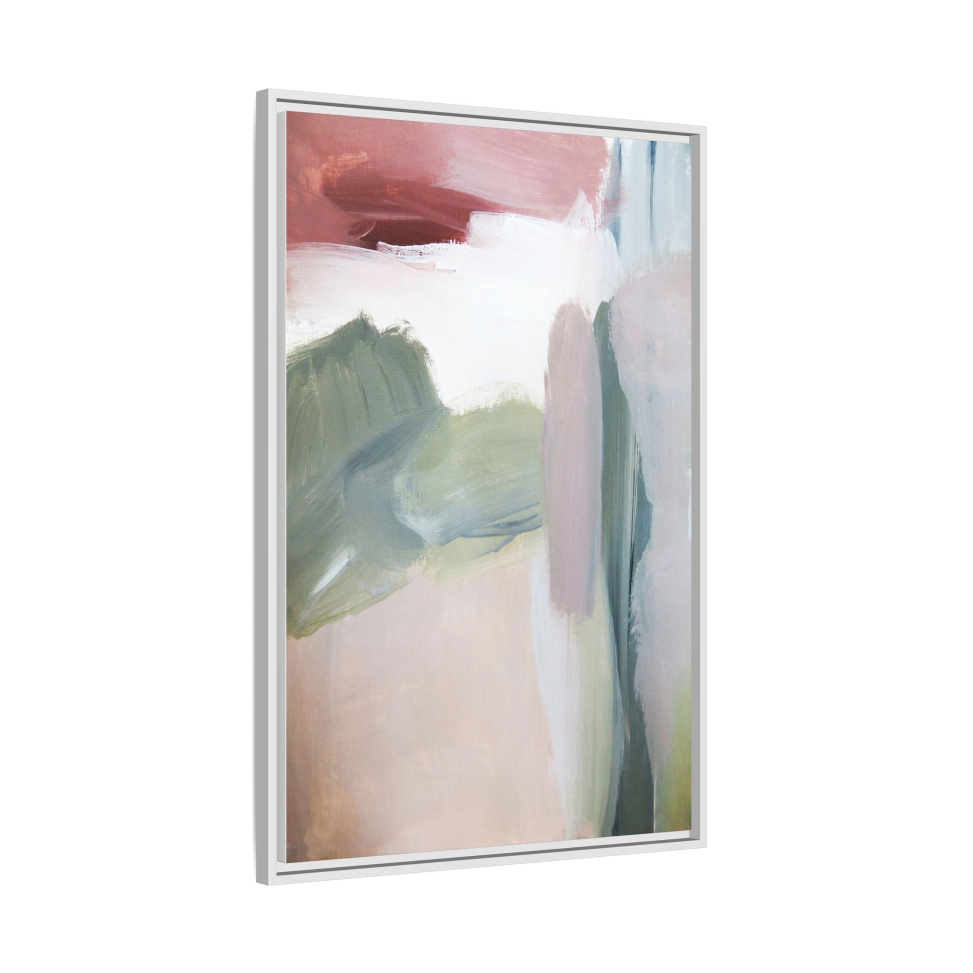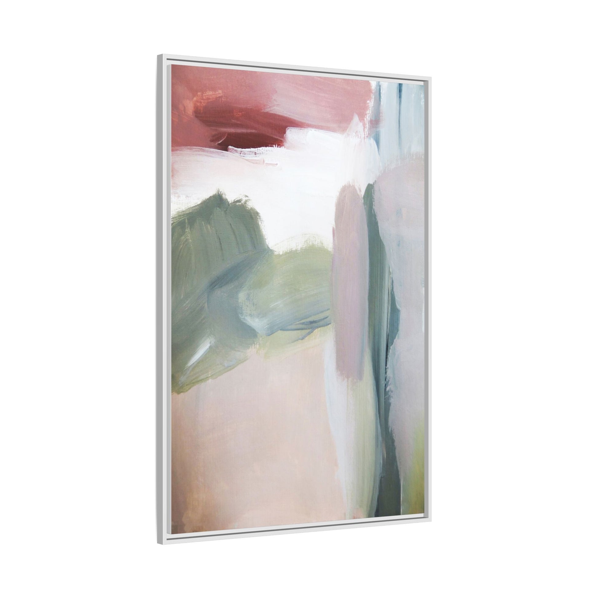This abstract painting features a soft, ethereal landscape composed of muted, blended colors including pale pink, sage green, white, and hints of deep burgundy. The artwork employs a fluid, impressionistic style with broad, sweeping brushstrokes that create a sense of movement and depth across the canvas. Soft, diffused edges blend different color sections together, creating a dreamlike and harmonious composition that suggests a distant, misty horizon or landscape. The color palette evokes a sense of tranquility and subtle emotional resonance, with each hue gently transitioning into the next. The painting's technique appears to be oil or acrylic, with layers of color overlapping and creating a sense of atmospheric depth and gentle complexity.