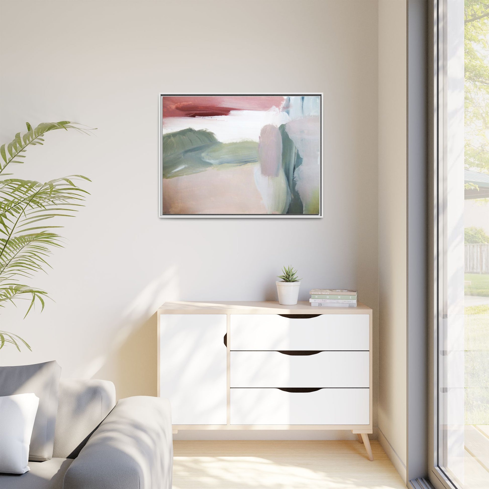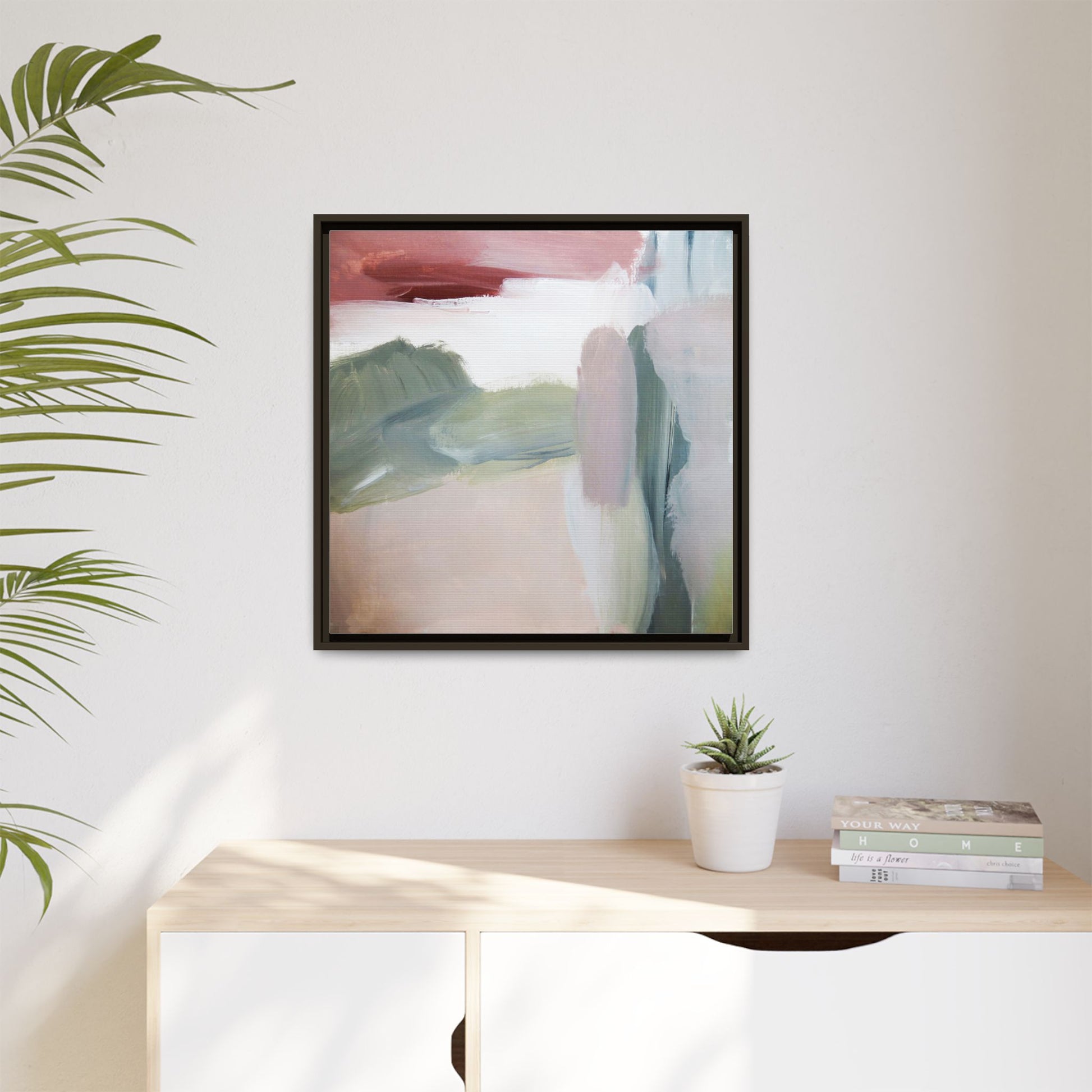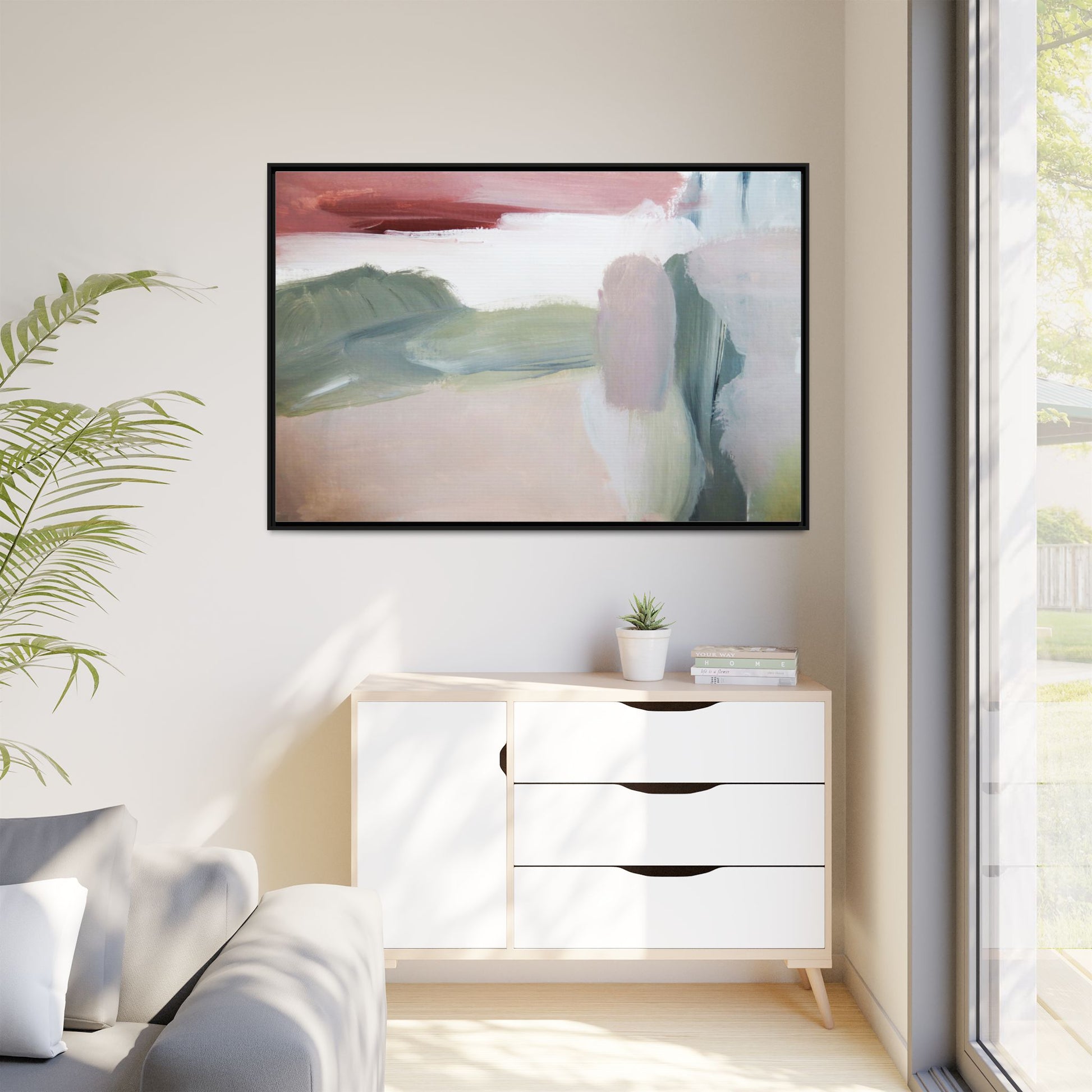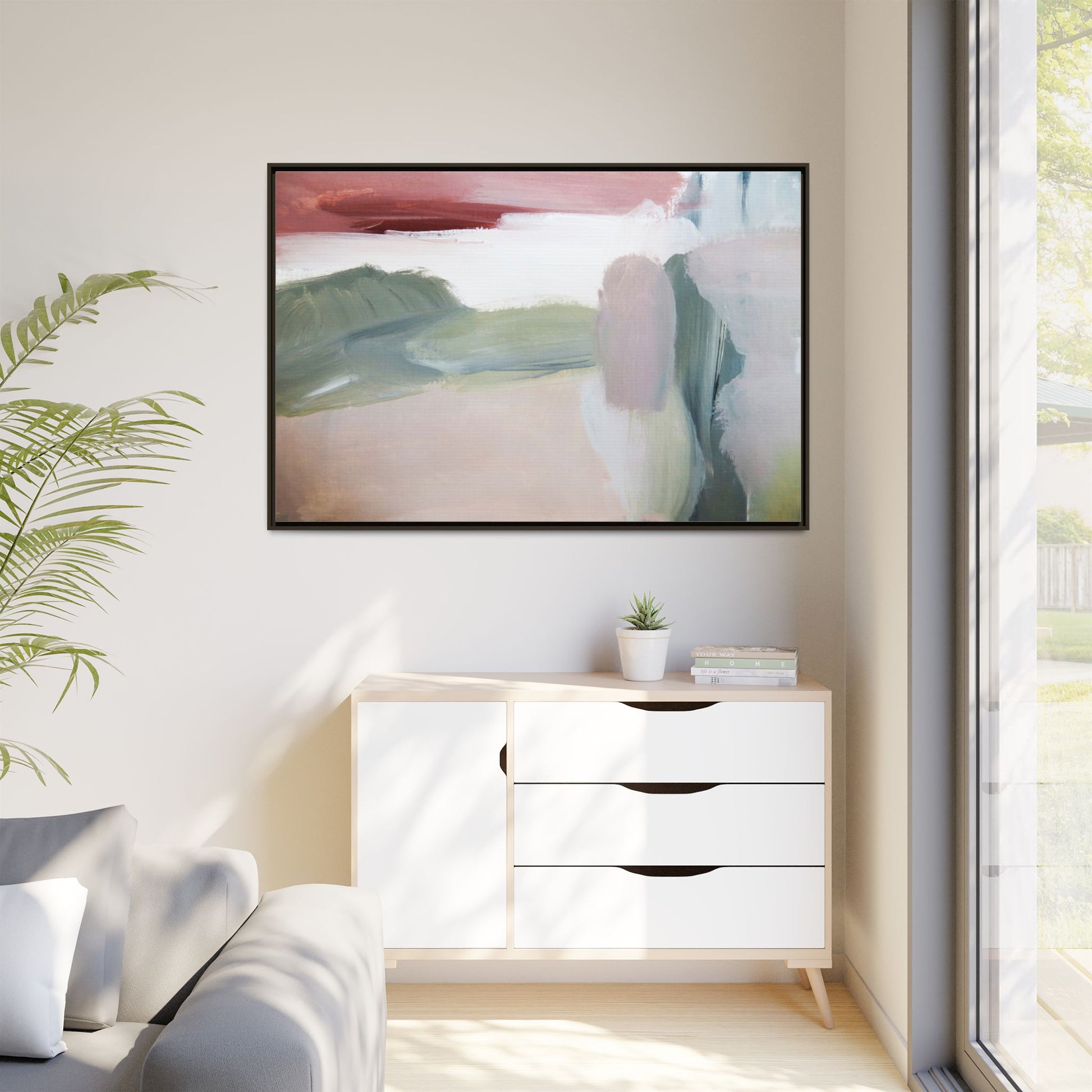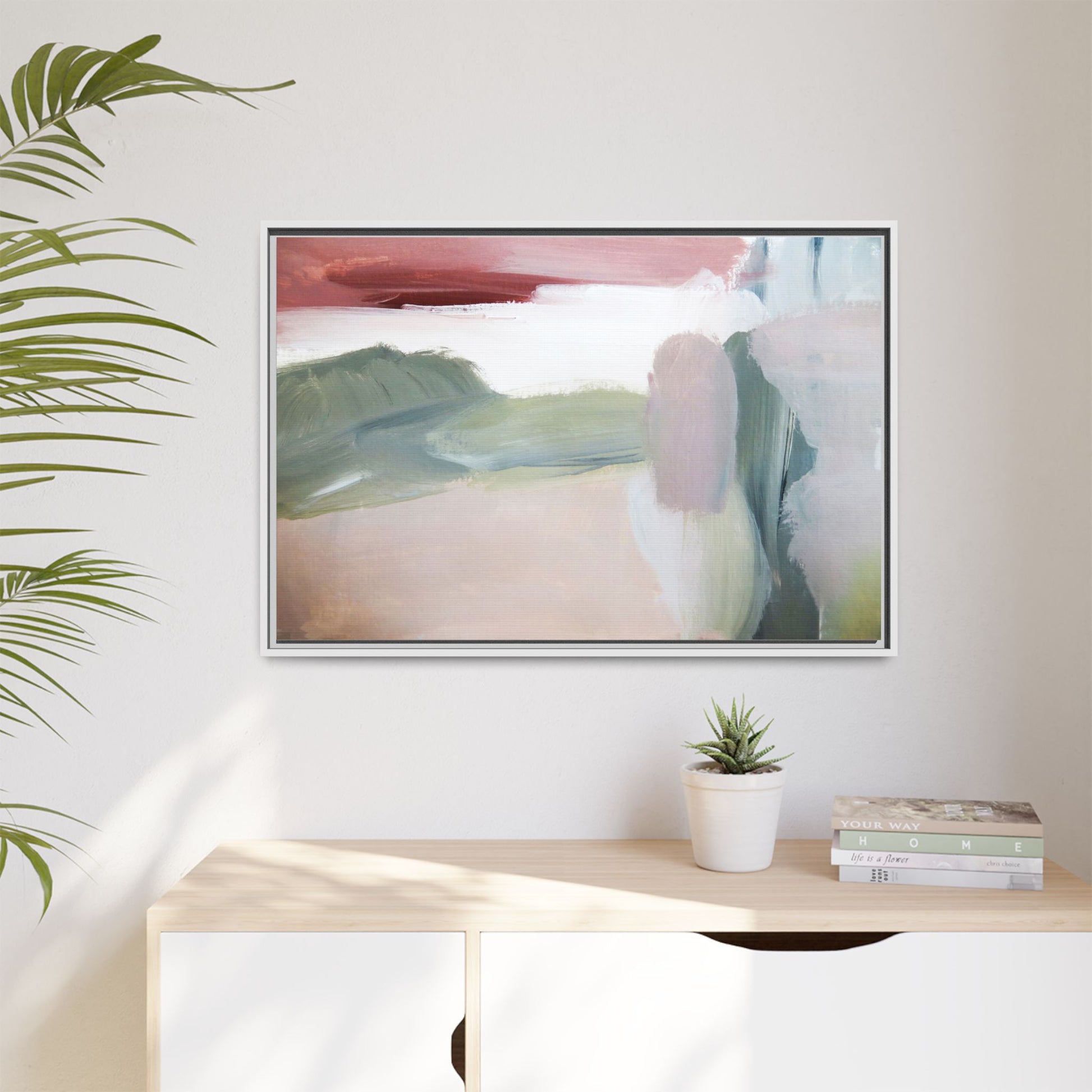 This abstract painting features a soft, ethereal landscape composed of muted, blended colors including pale pink, sage green, white, and hints of deep burgundy. The artwork employs a fluid, impressionistic style with broad, sweeping brushstrokes that create a sense of movement and depth across the canvas. Soft, diffused edges blend different color sections together, creating a dreamlike and harmonious composition that suggests a distant, misty horizon or landscape. The color palette evokes a sense of tranquility and subtle emotional resonance, with each hue gently transitioning into the next. The painting's technique appears to be oil or acrylic, with layers of color overlapping and creating a sense of atmospheric depth and gentle complexity.
