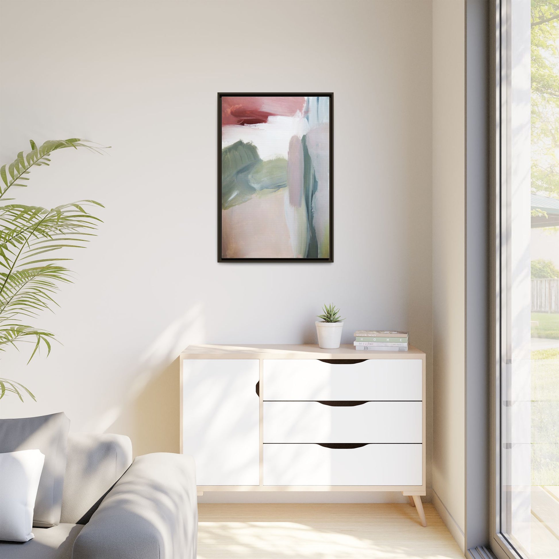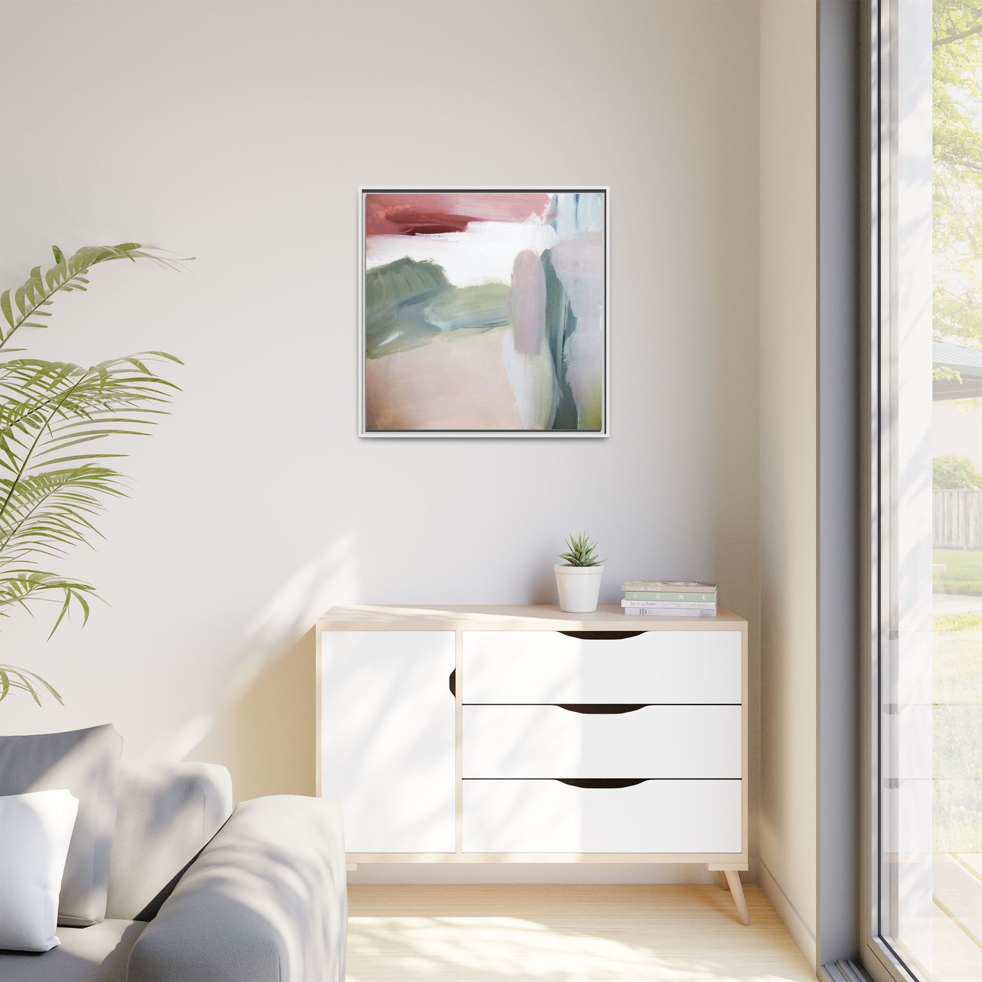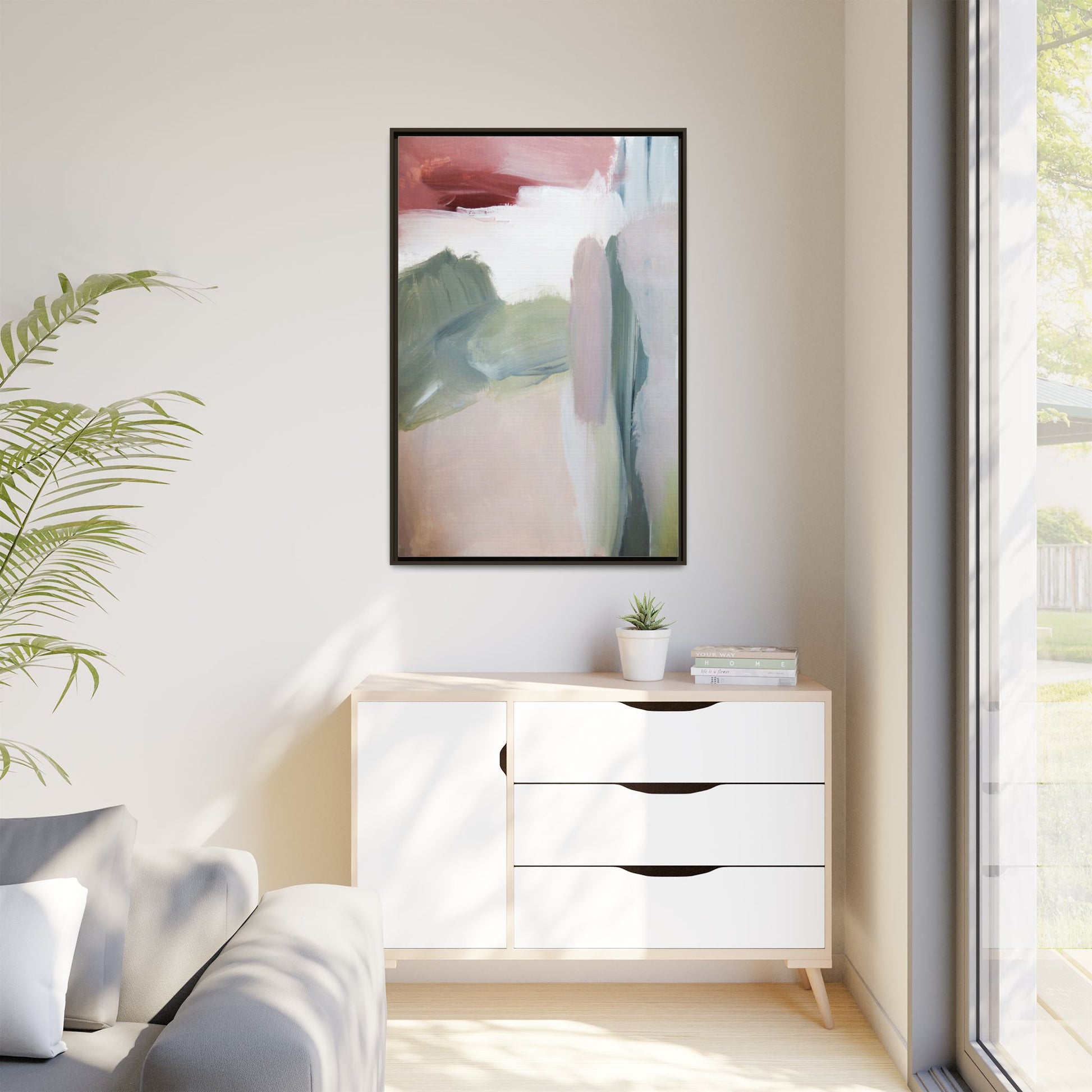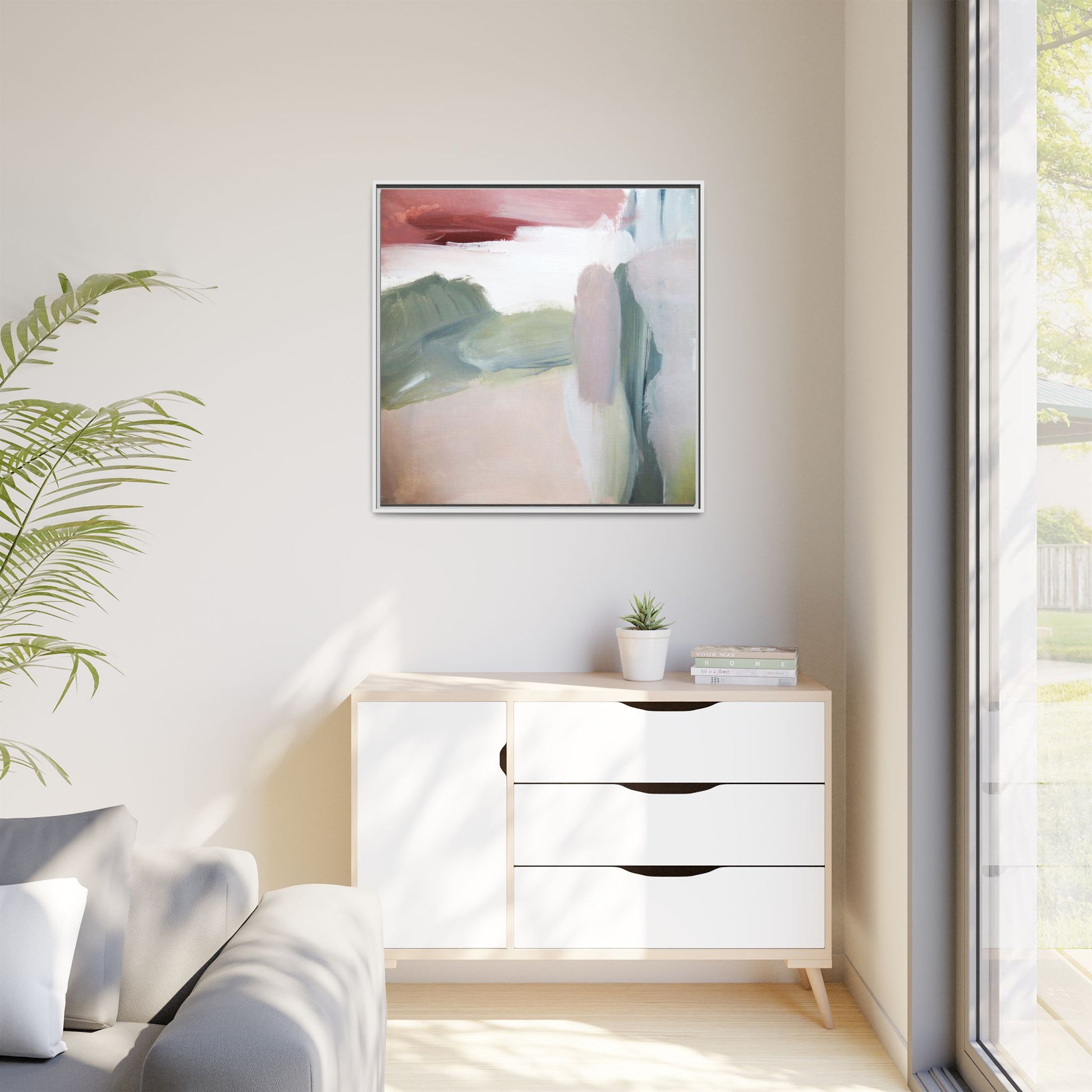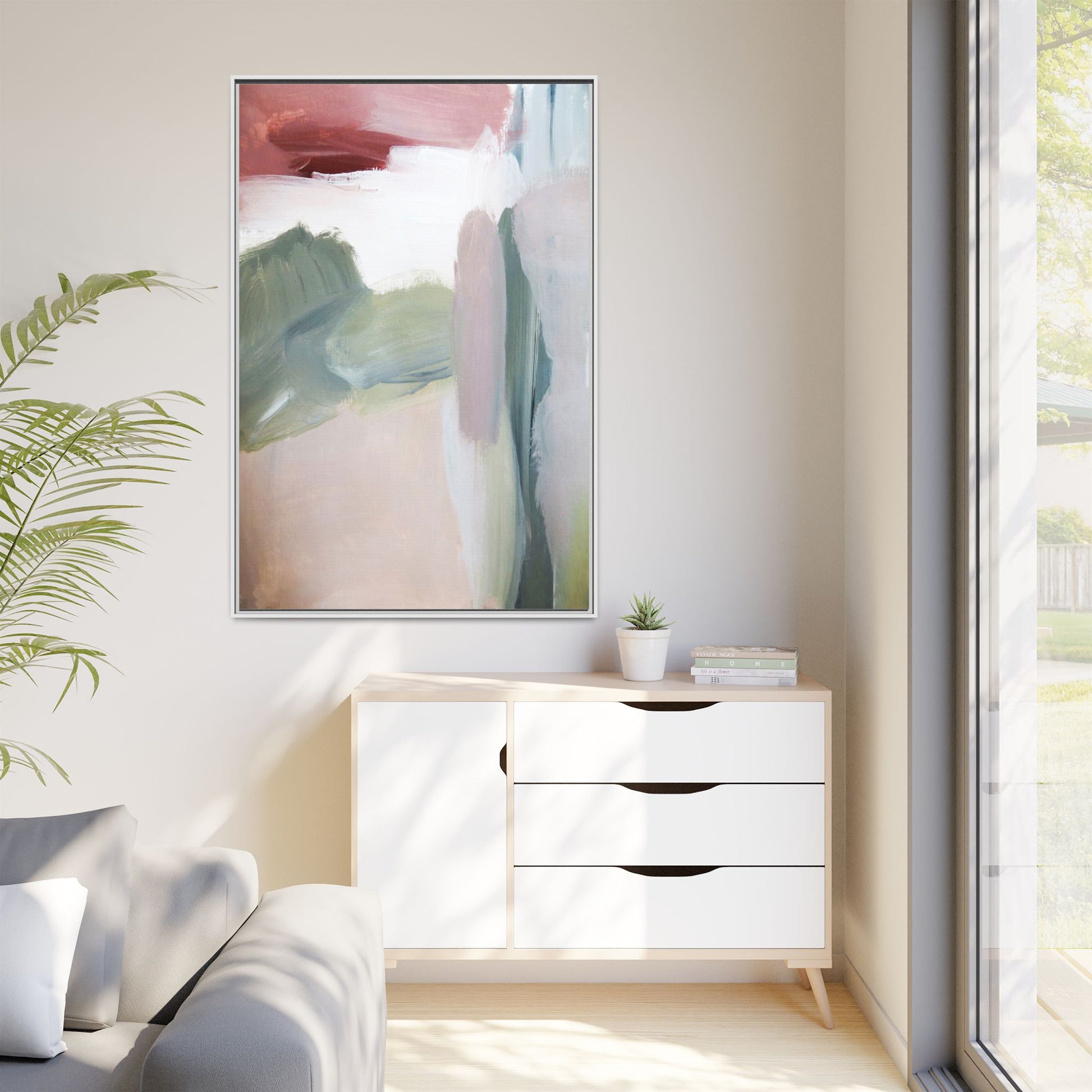 This abstract painting features a soft, ethereal landscape composed of muted, blended colors including pale pink, sage green, white, and hints of deep burgundy. The artwork employs a fluid, impressionistic style with broad, sweeping brushstrokes that create a sense of movement and depth across the canvas. Soft, diffused edges blend different color sections together, creating a dreamlike and harmonious composition that suggests a distant, misty horizon or landscape. The color palette evokes a sense of tranquility and subtle emotional resonance, with each hue gently transitioning into the next. The painting's technique appears to be oil or acrylic, with layers of color overlapping and creating a sense of atmospheric depth and gentle complexity.