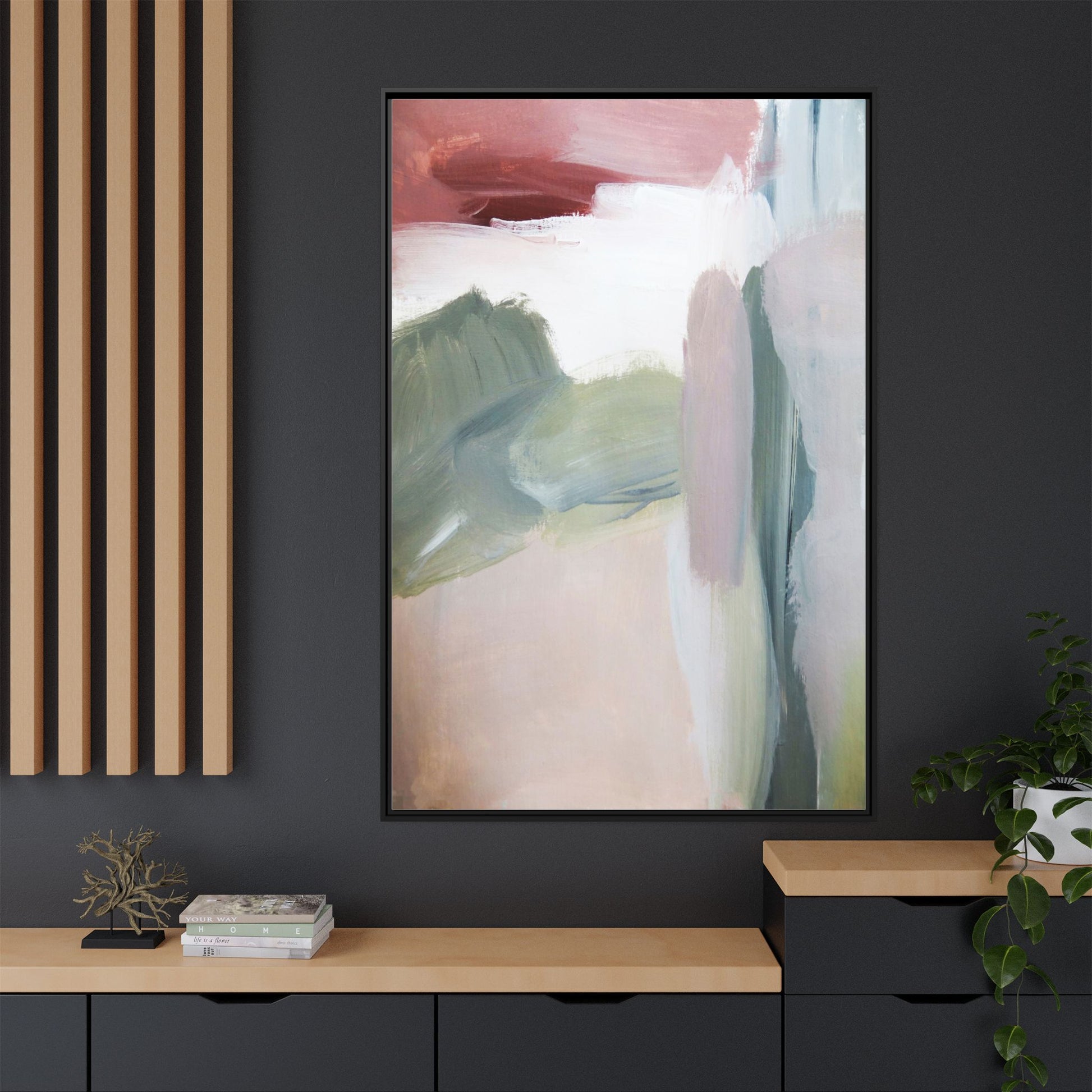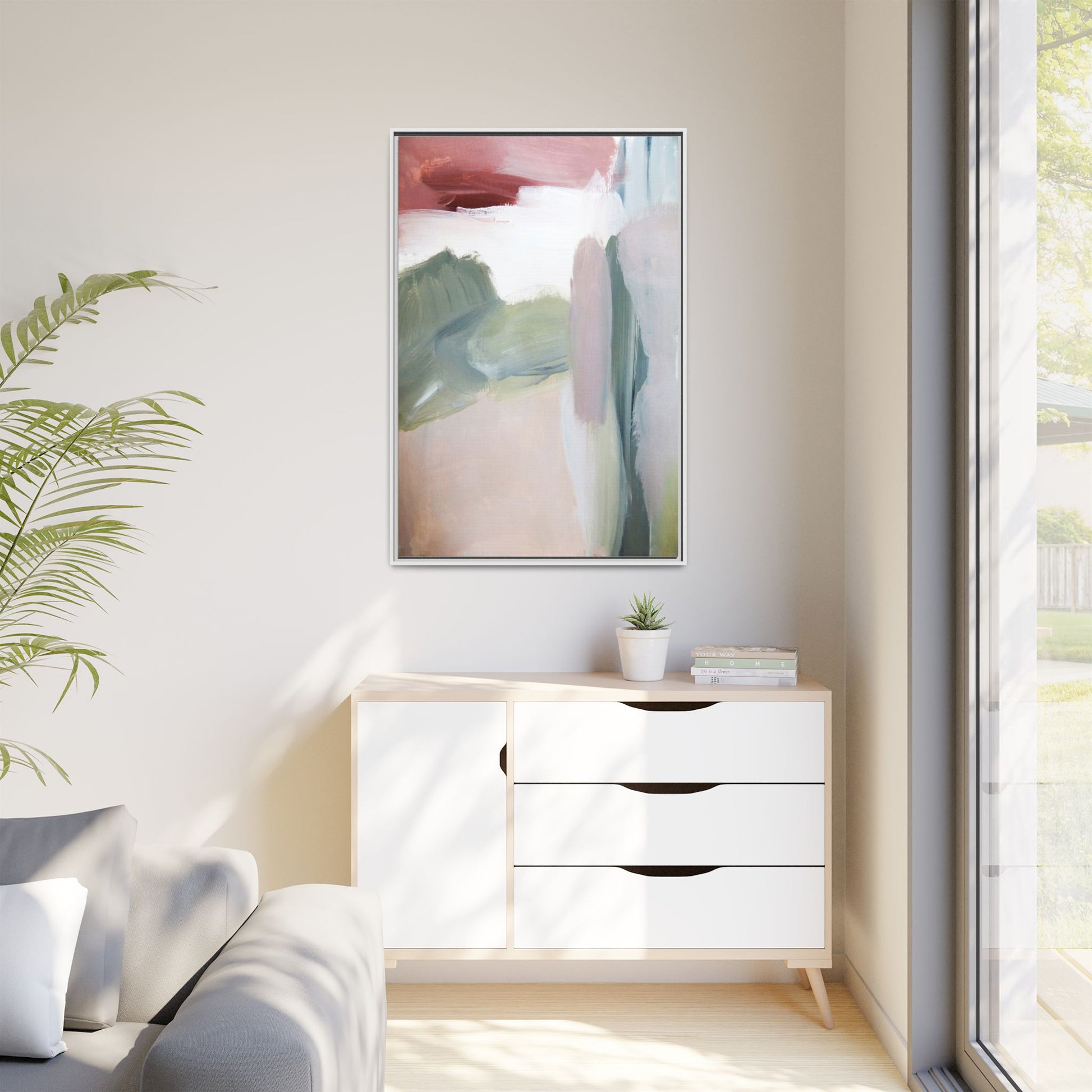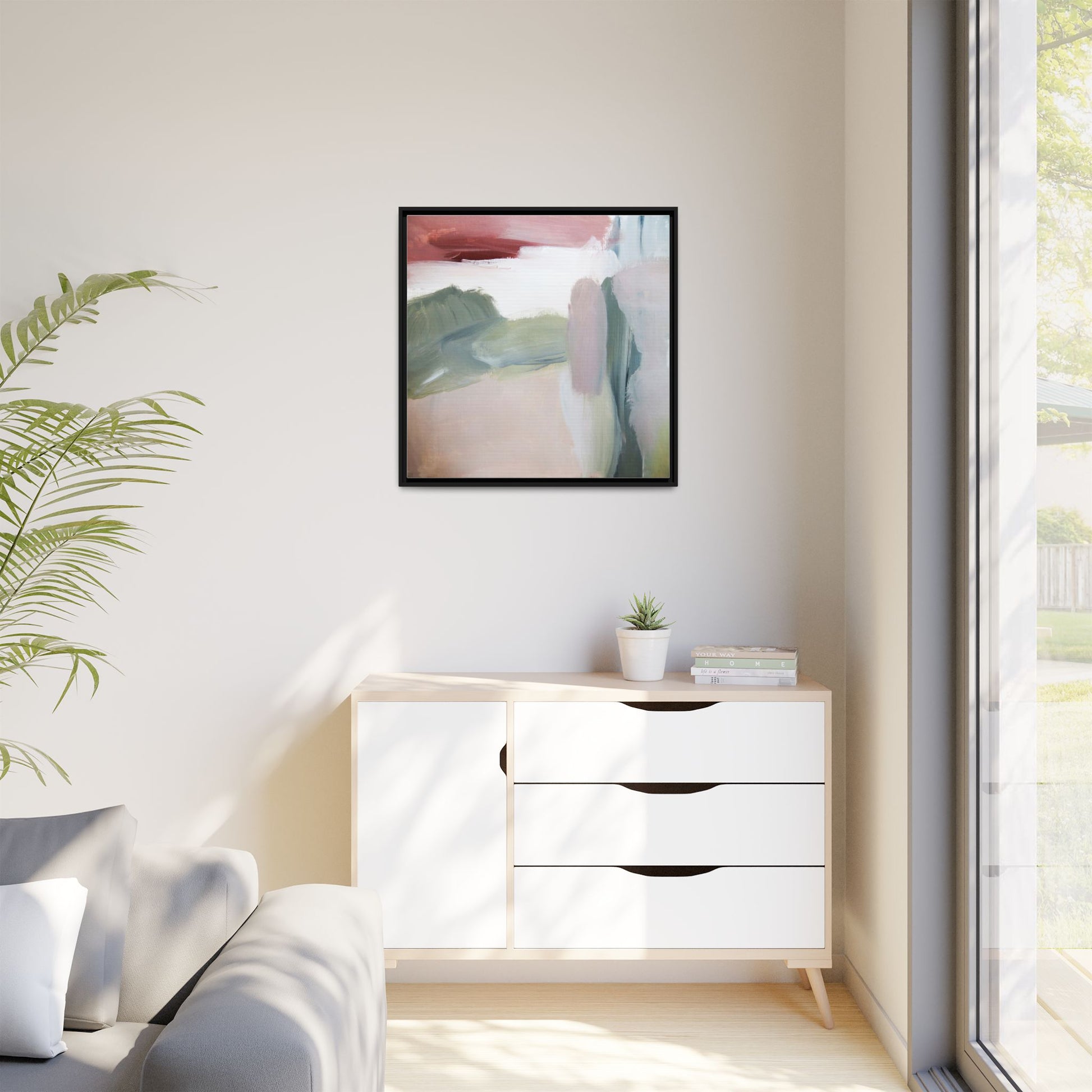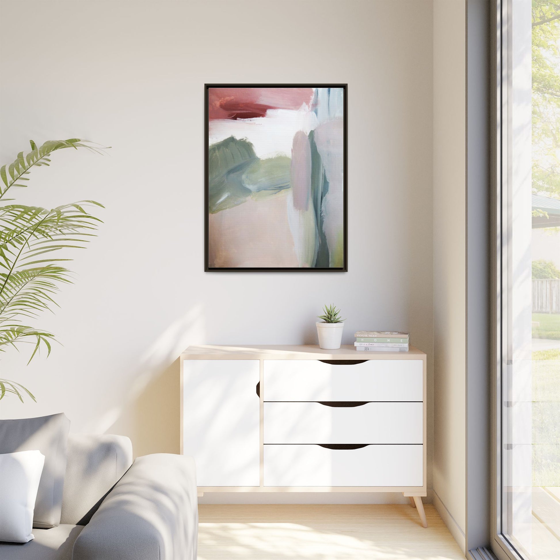 This abstract painting features a soft, ethereal landscape composed of muted, blended colors including pale pink, sage green, white, and hints of deep burgundy. The artwork employs a fluid, impressionistic style with broad, sweeping brushstrokes that create a sense of movement and depth across the canvas. Soft, diffused edges blend different color sections together, creating a dreamlike and harmonious composition that suggests a distant, misty horizon or landscape. The color palette evokes a sense of tranquility and subtle emotional resonance, with each hue gently transitioning into the next. The painting's technique appears to be oil or acrylic, with layers of color overlapping and creating a sense of atmospheric depth and gentle complexity.