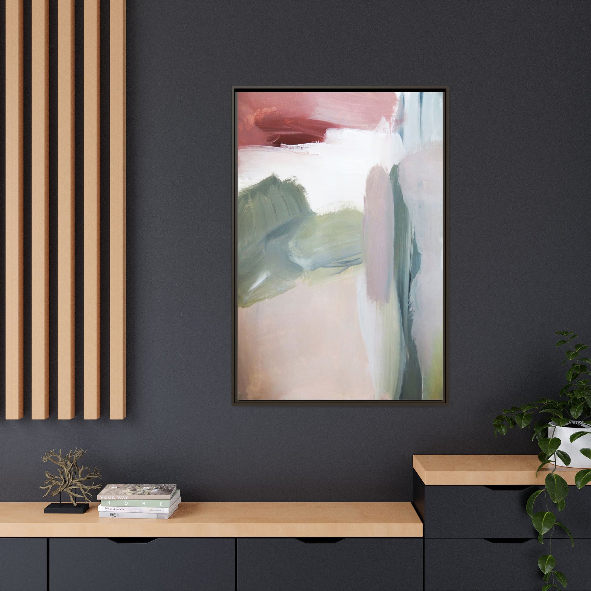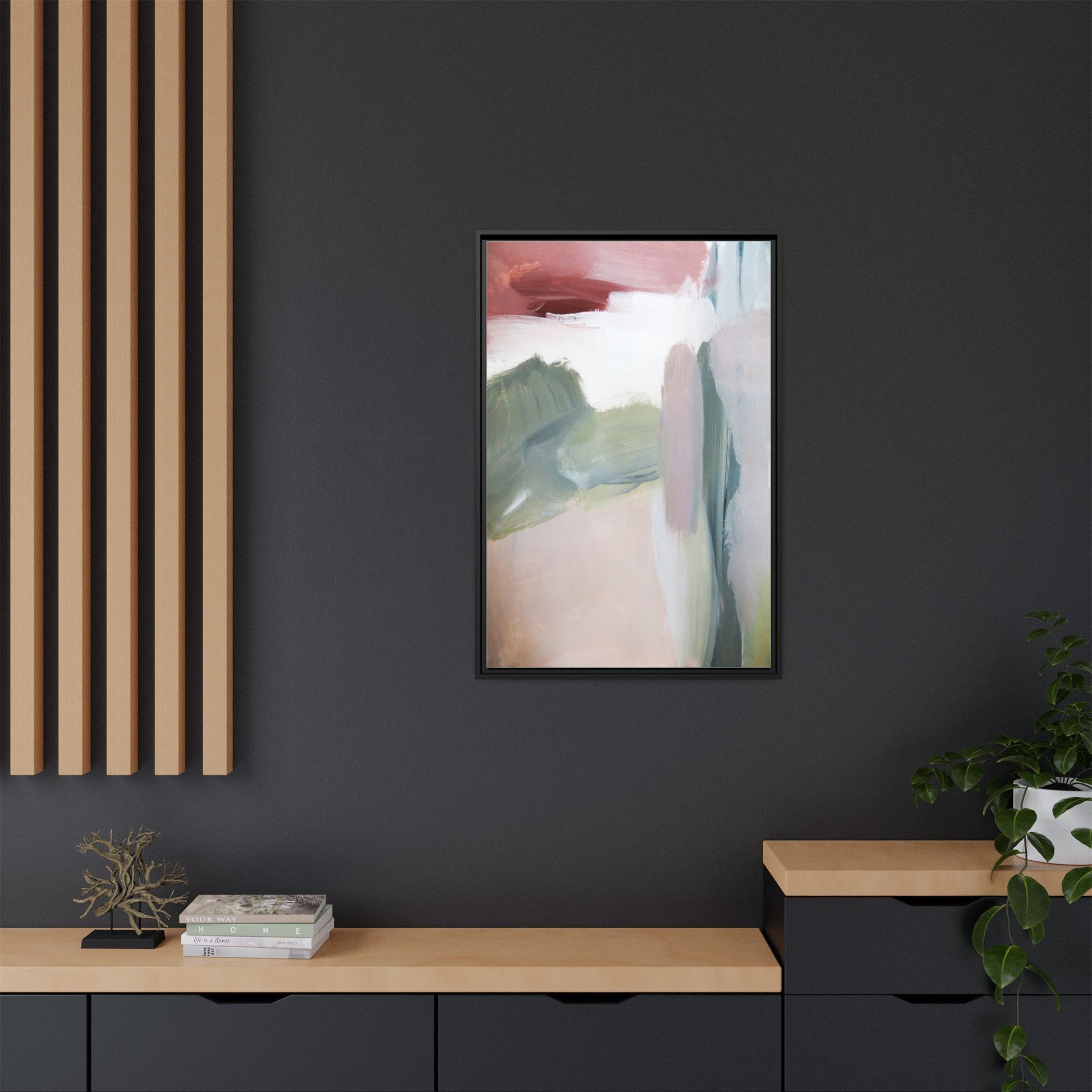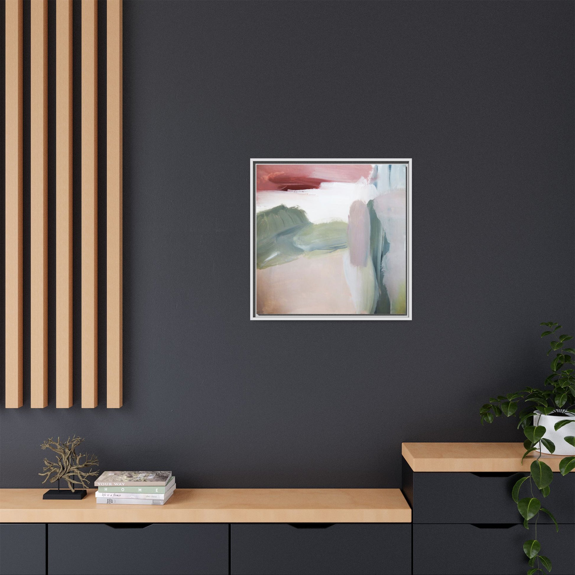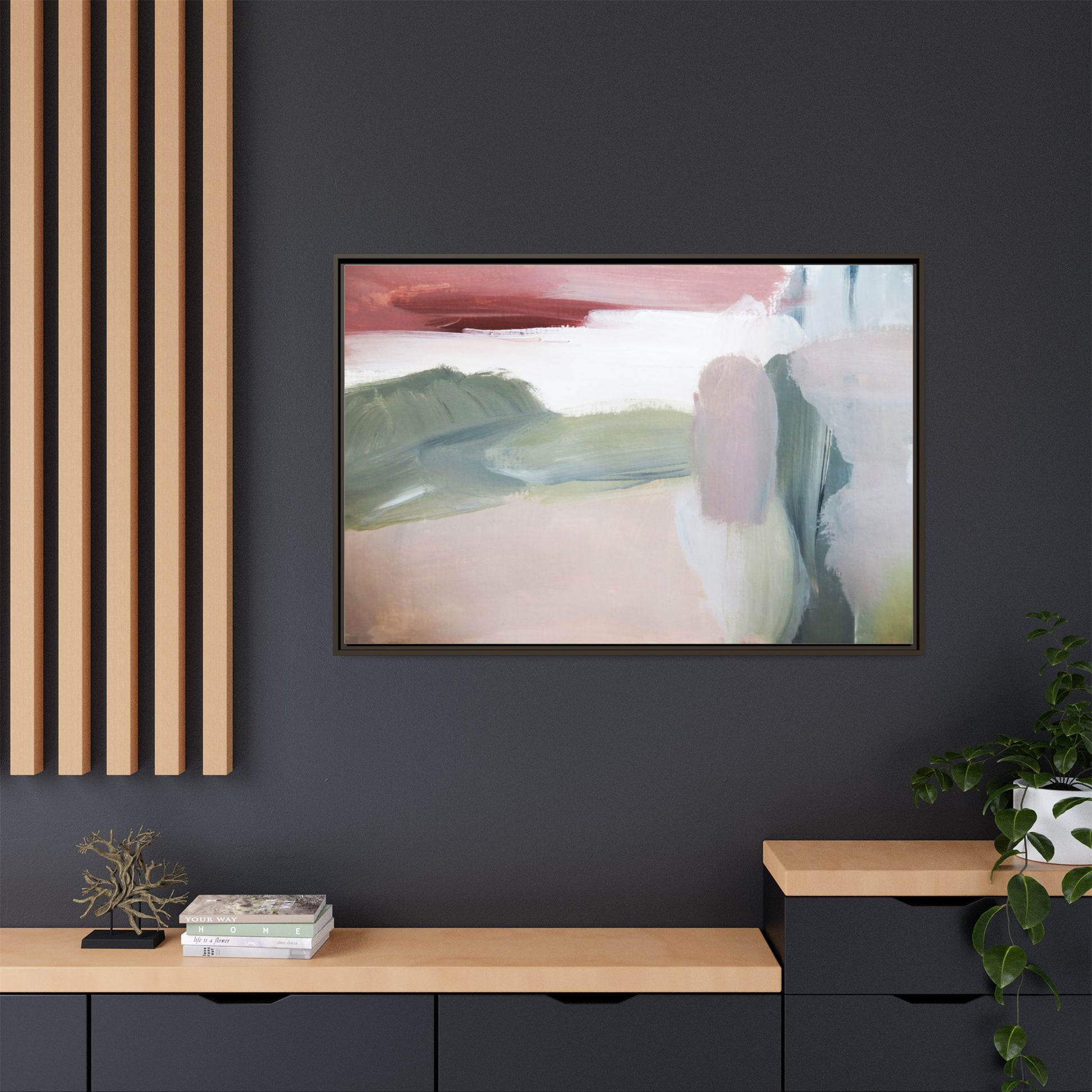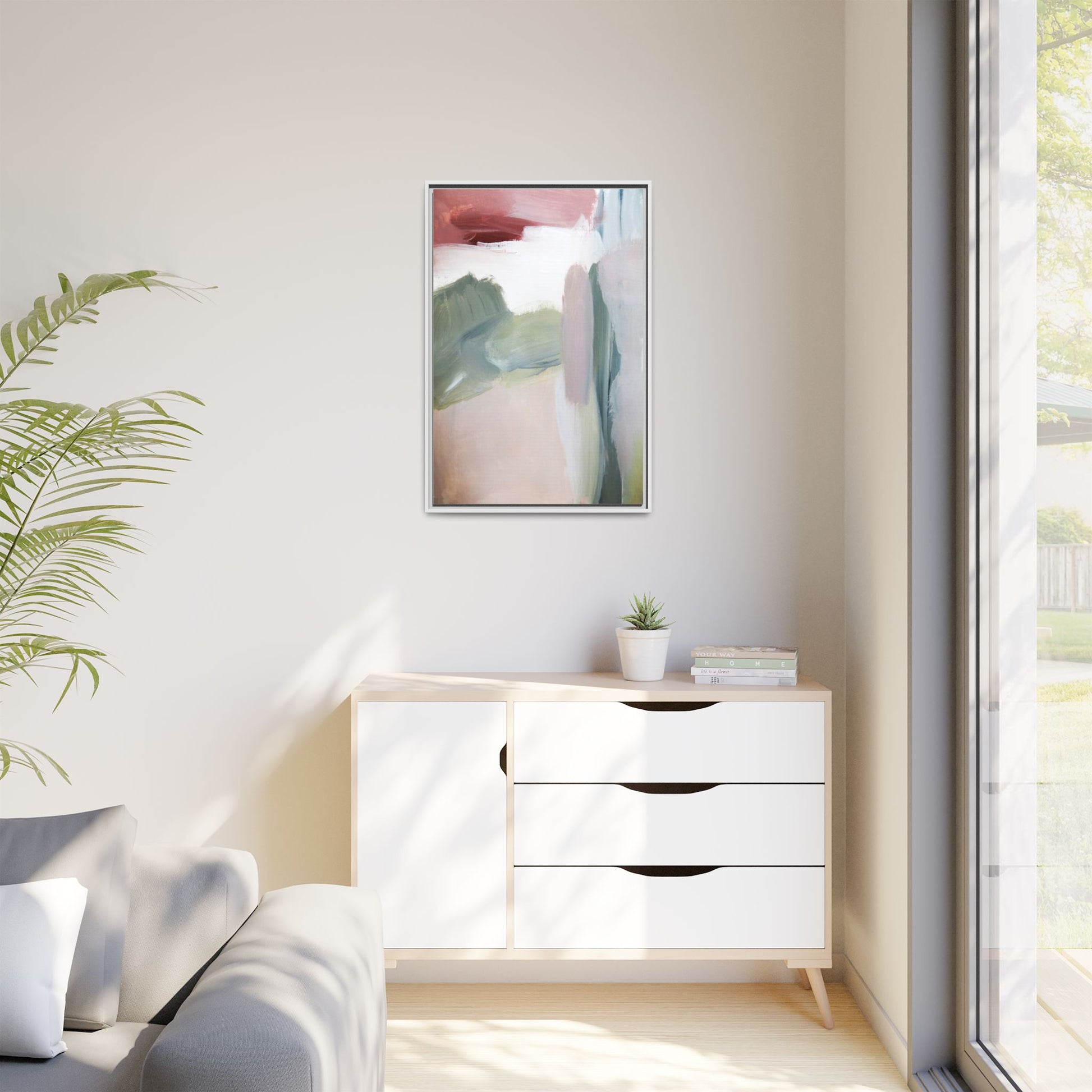 This abstract painting features a soft, ethereal landscape composed of muted, blended colors including pale pink, sage green, white, and hints of deep burgundy. The artwork employs a fluid, impressionistic style with broad, sweeping brushstrokes that create a sense of movement and depth across the canvas. Soft, diffused edges blend different color sections together, creating a dreamlike and harmonious composition that suggests a distant, misty horizon or landscape. The color palette evokes a sense of tranquility and subtle emotional resonance, with each hue gently transitioning into the next. The painting's technique appears to be oil or acrylic, with layers of color overlapping and creating a sense of atmospheric depth and gentle complexity.