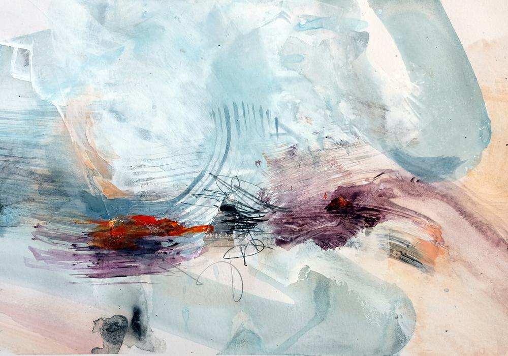 A swirling interplay of misty blues and earthy strokes converges, suggesting an unrestrained dance of elements. Flecks of vibrant orange ignite the scene, injecting life into the serene chaos.