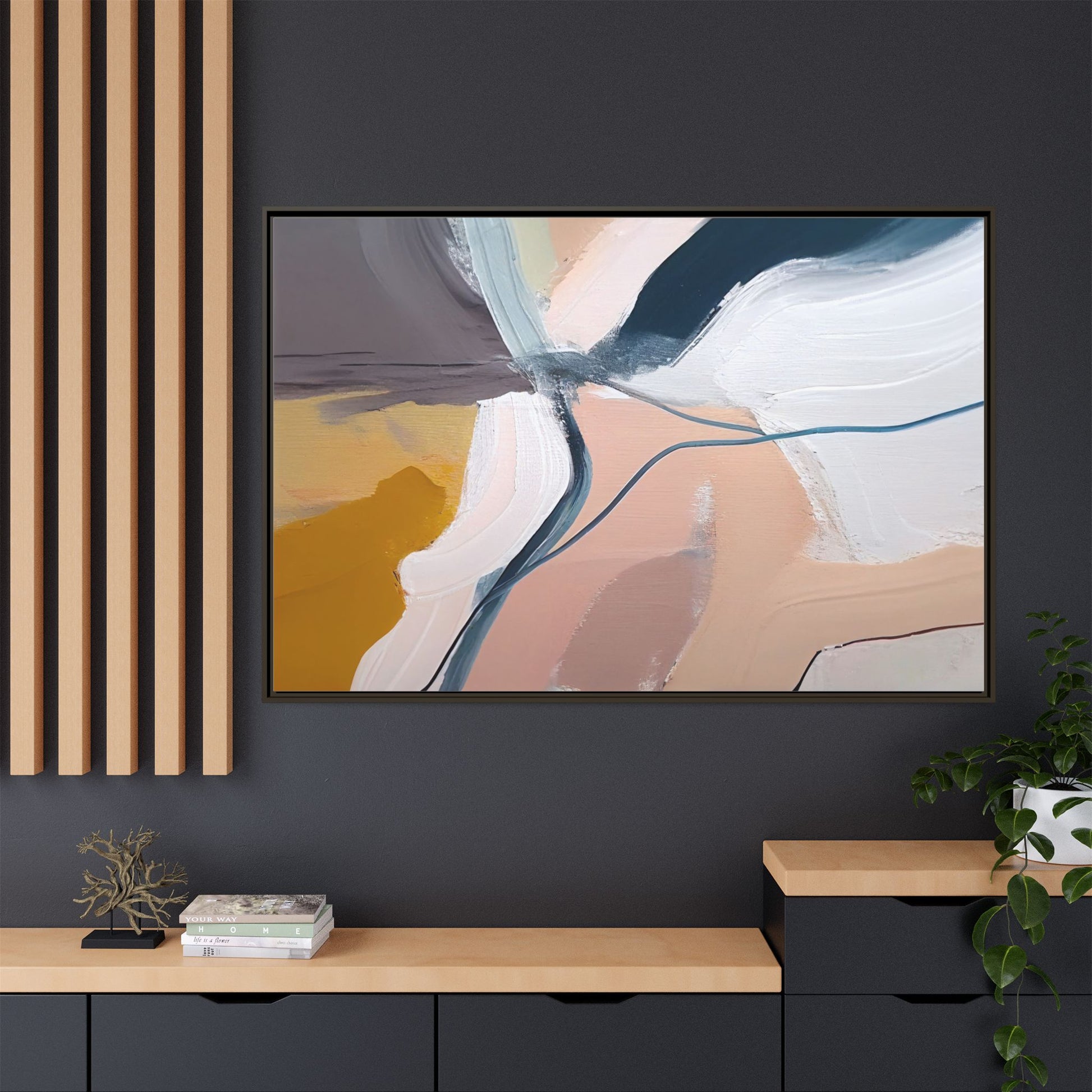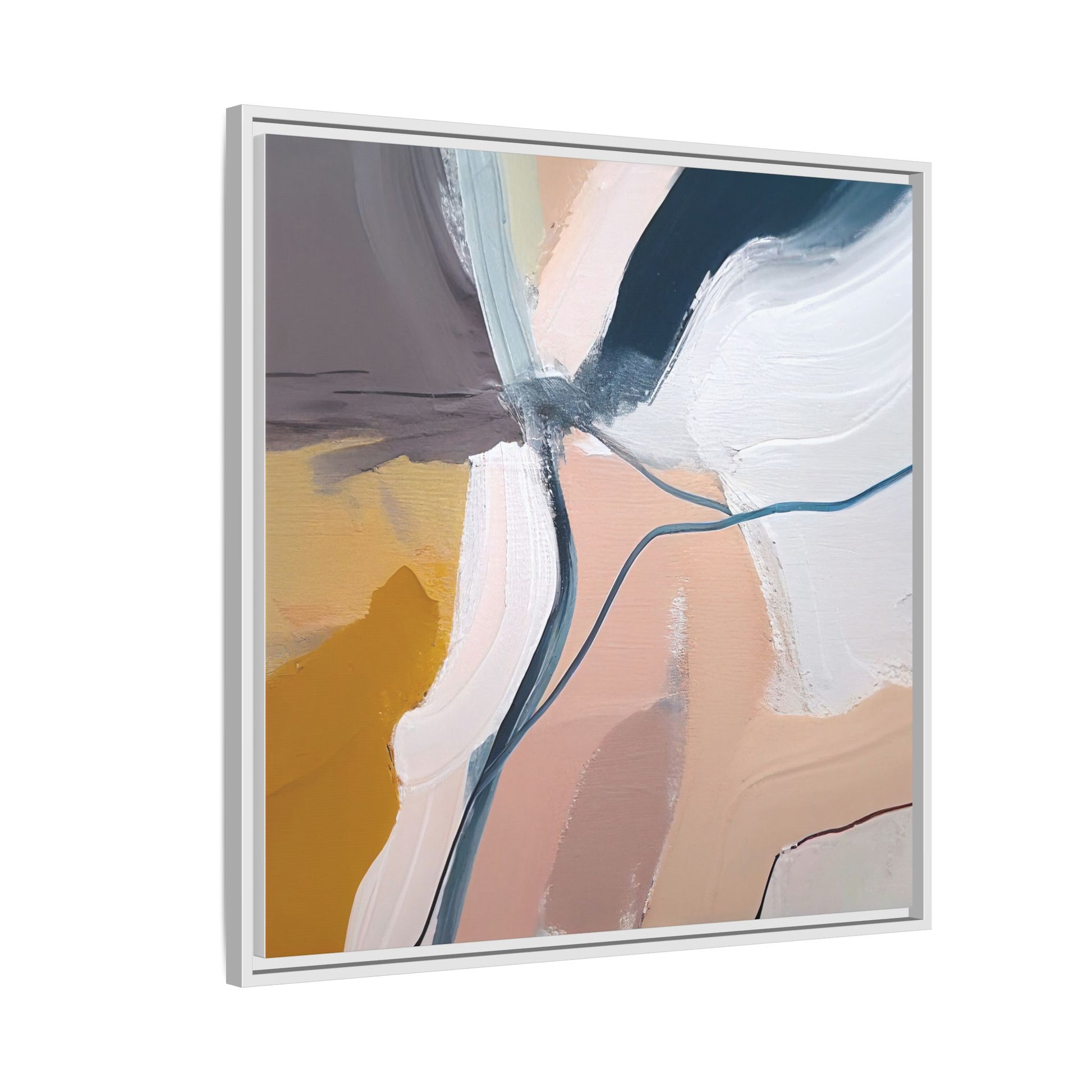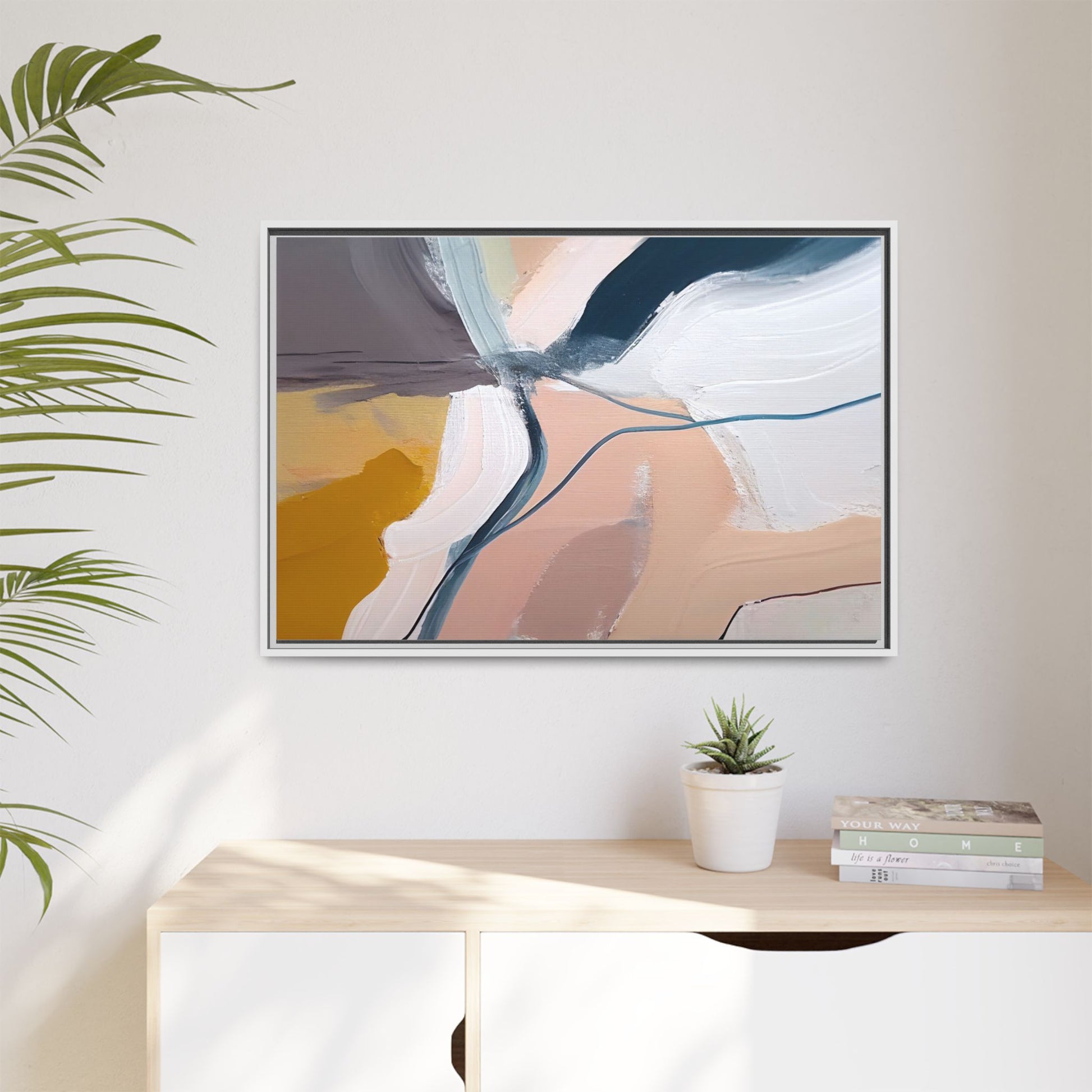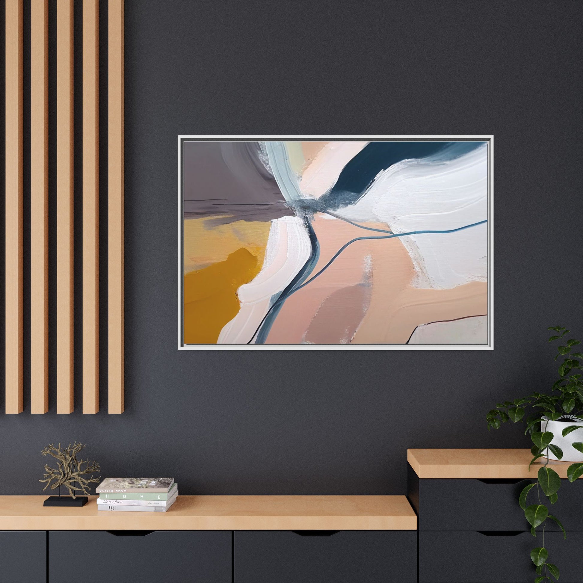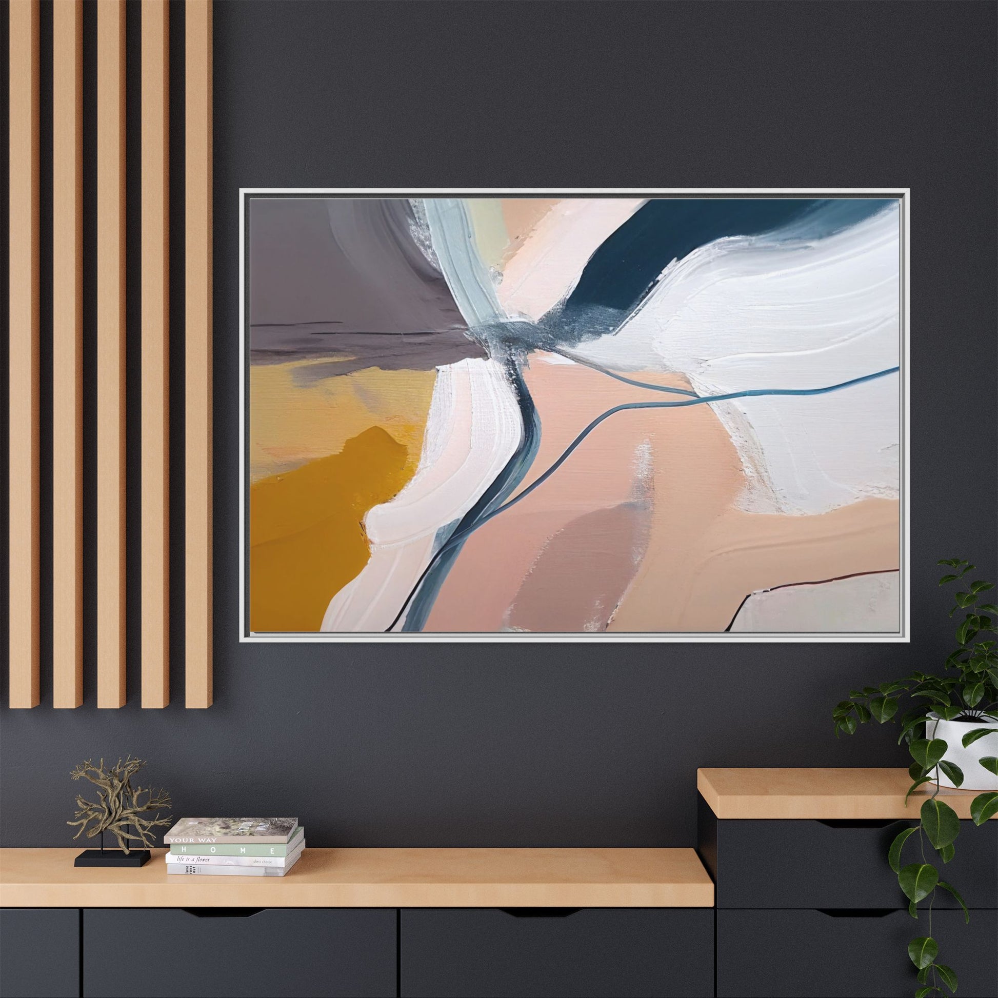 This abstract painting features a dynamic composition of fluid, sweeping brushstrokes in a soft, contemporary color palette. Shades of white, pale pink, deep blue, mustard yellow, and gray intertwine and flow across the canvas, creating a sense of movement and organic shapes. The central focus of the artwork is a converging point where multiple curved lines and color fields meet, suggesting a sense of connection and tension. Textured, layered paint techniques give the piece depth and visual interest, with each color bleeding and blending into the next in a harmonious yet energetic manner. The painting evokes a sense of natural landscapes or aerial views, while maintaining an elegant, minimalist aesthetic that would complement modern interior design styles.