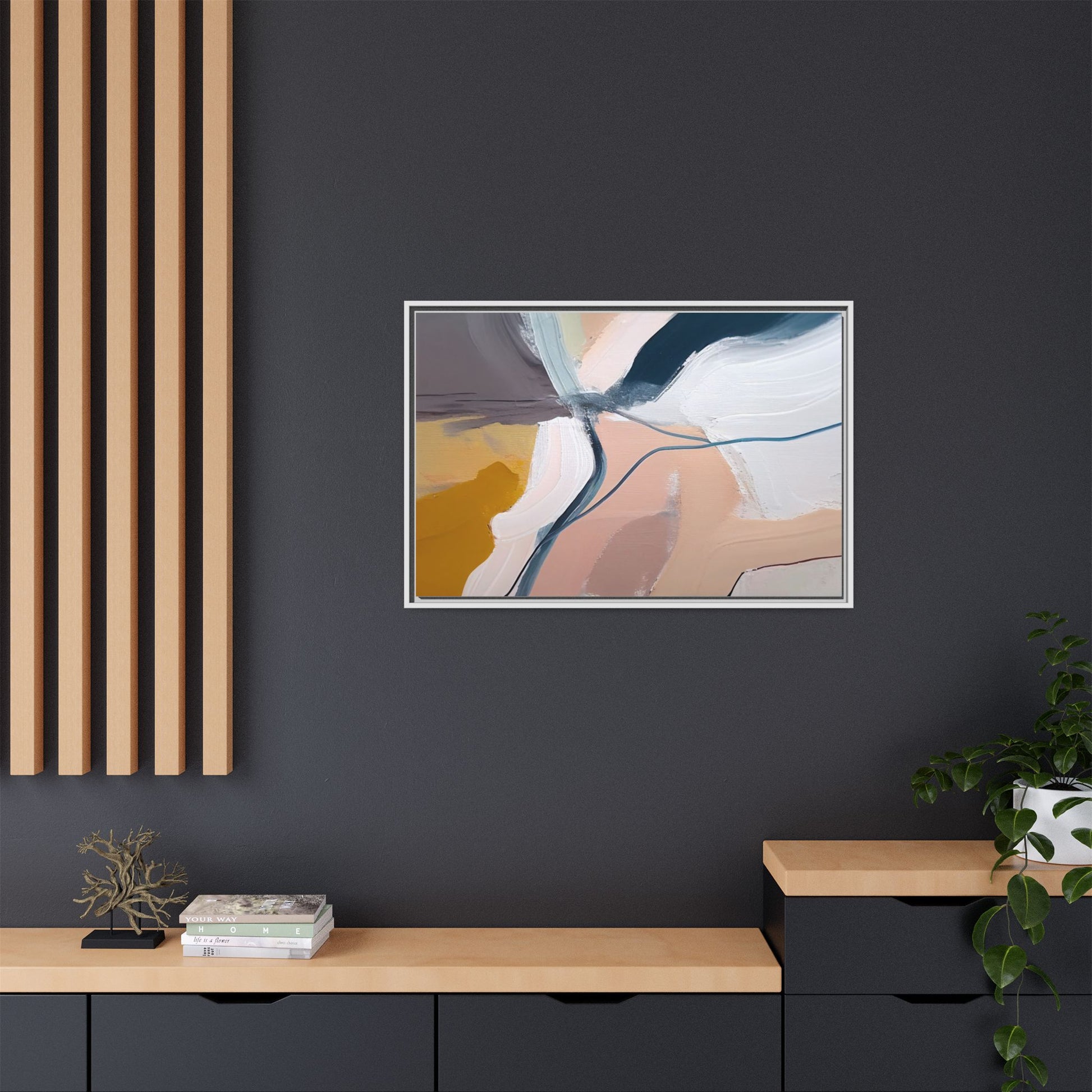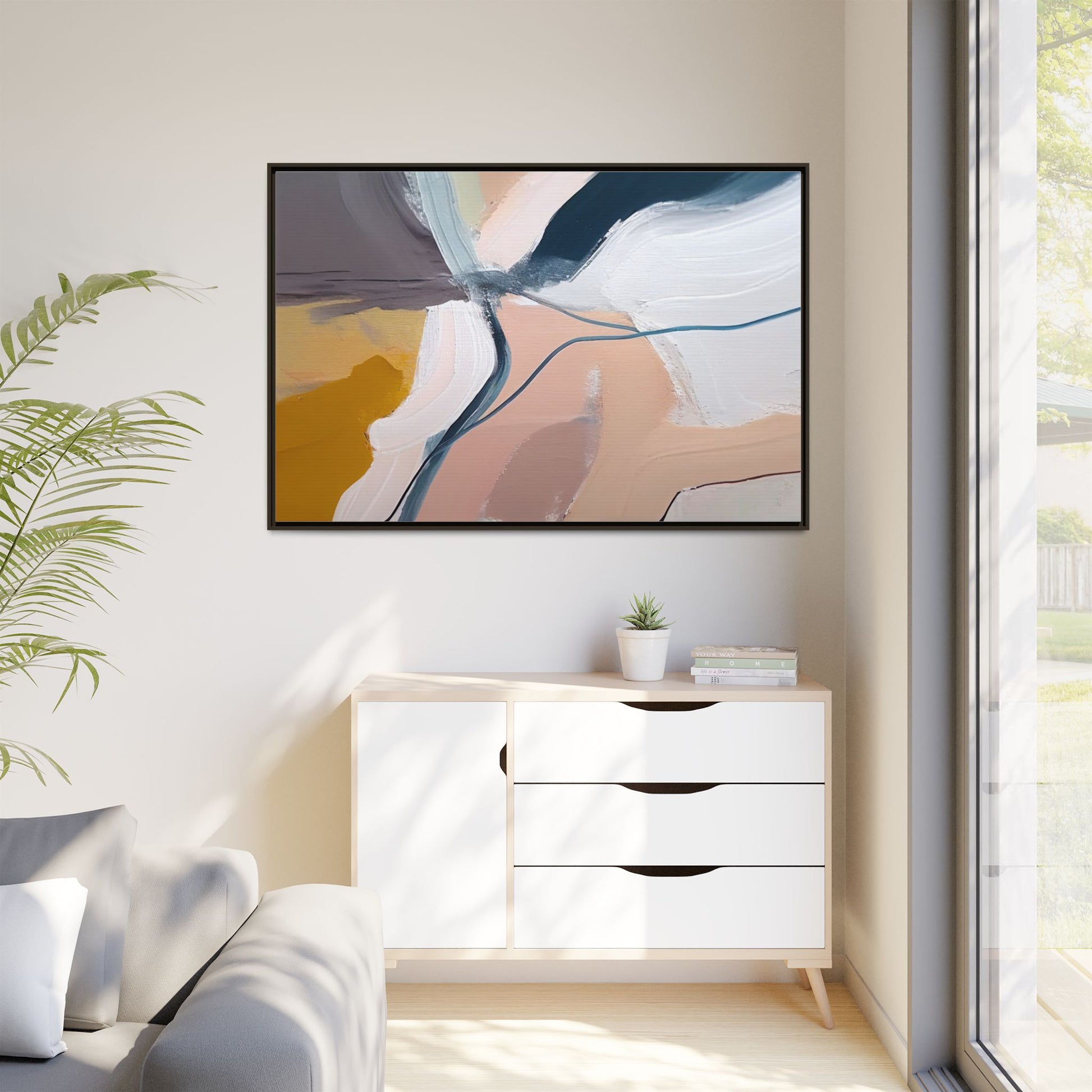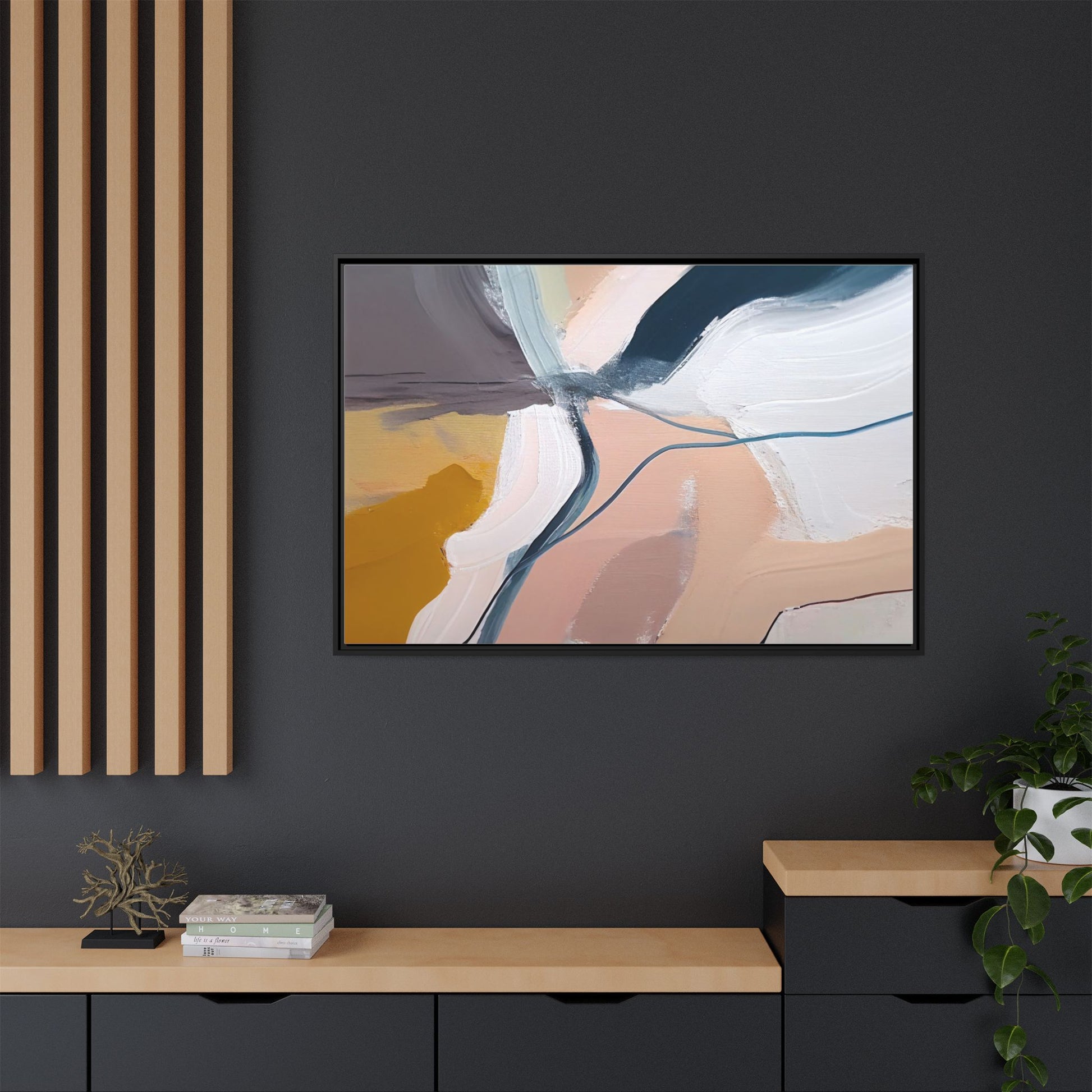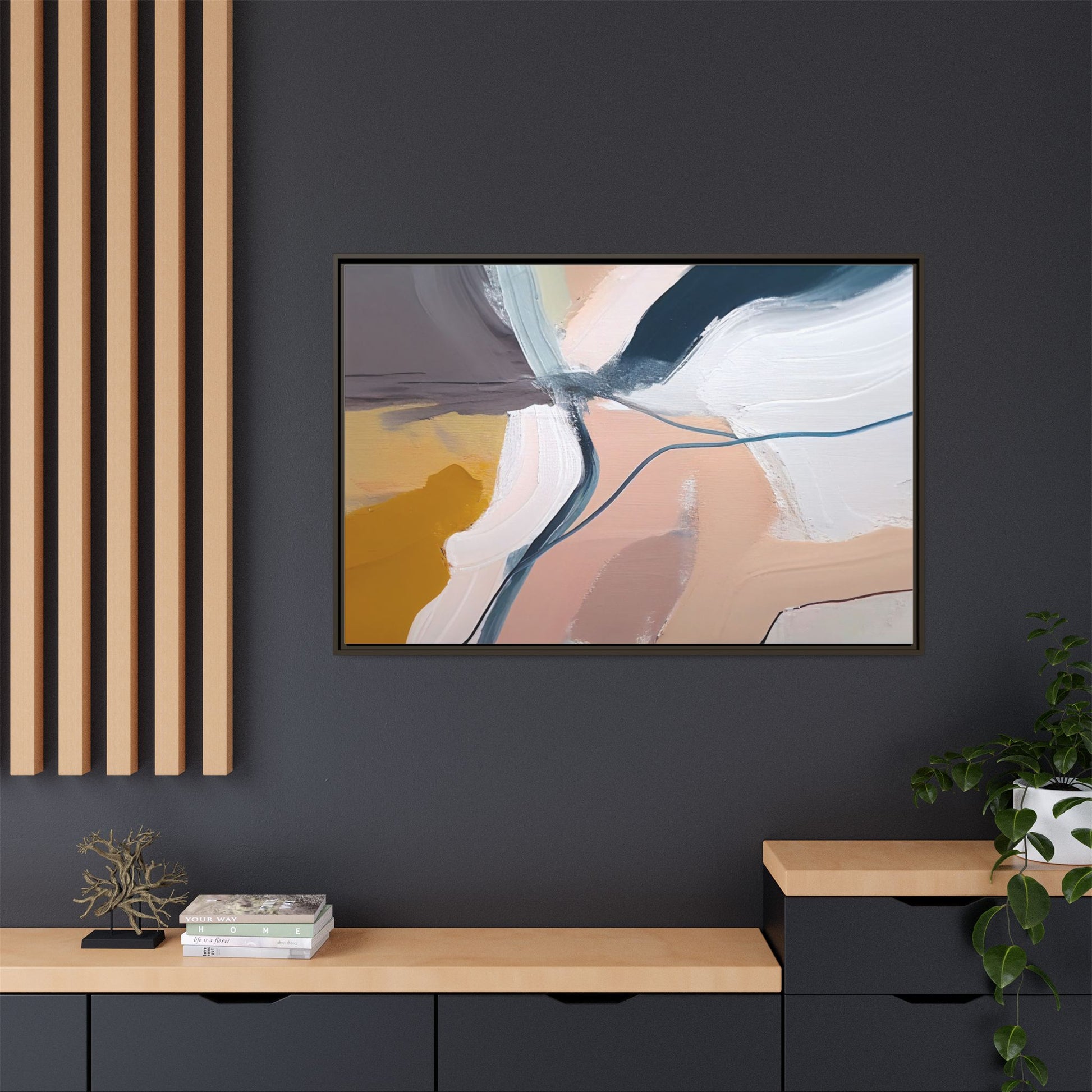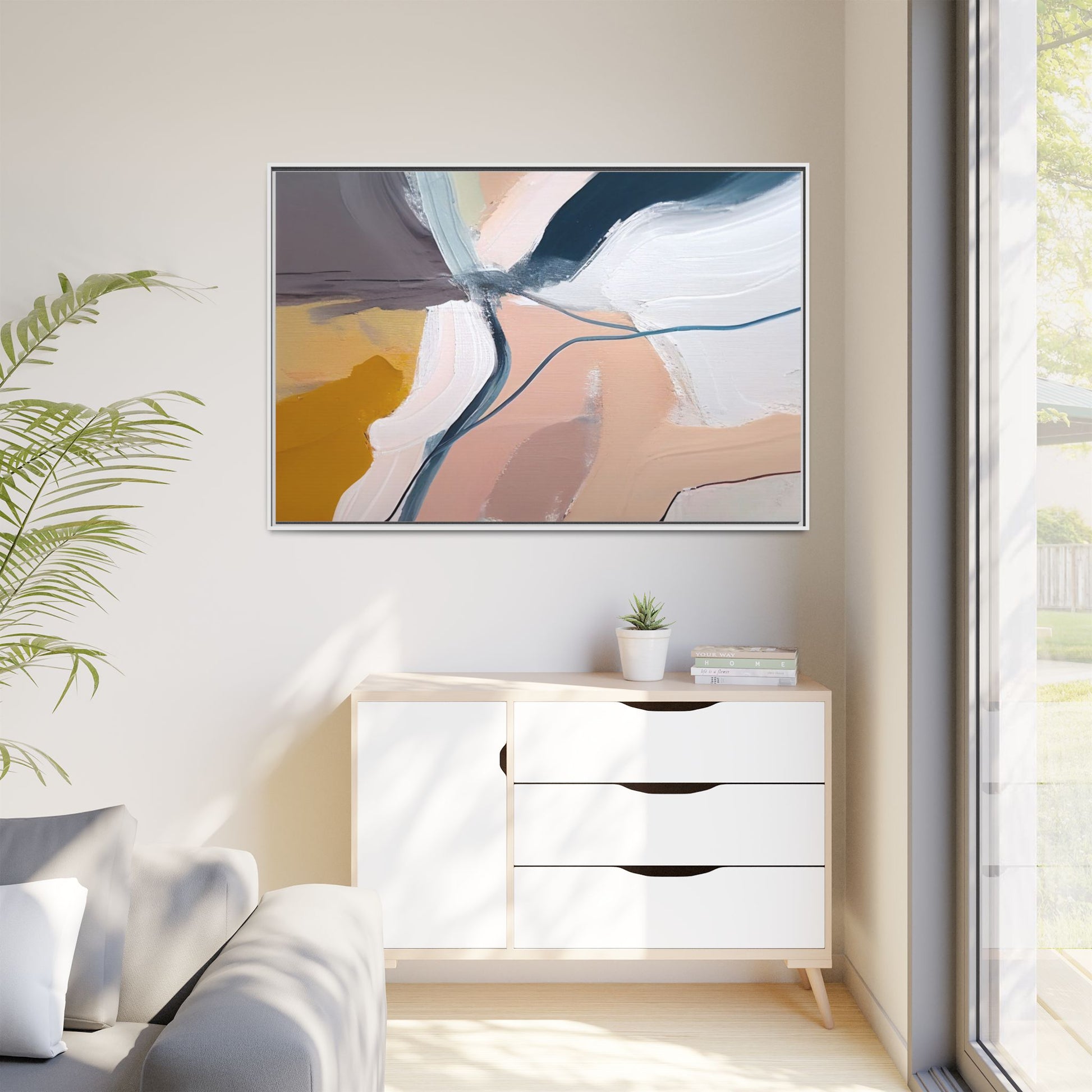 This abstract painting features a dynamic composition of fluid, sweeping brushstrokes in a soft, contemporary color palette. Shades of white, pale pink, deep blue, mustard yellow, and gray intertwine and flow across the canvas, creating a sense of movement and organic shapes. The central focus of the artwork is a converging point where multiple curved lines and color fields meet, suggesting a sense of connection and tension. Textured, layered paint techniques give the piece depth and visual interest, with each color bleeding and blending into the next in a harmonious yet energetic manner. The painting evokes a sense of natural landscapes or aerial views, while maintaining an elegant, minimalist aesthetic that would complement modern interior design styles.