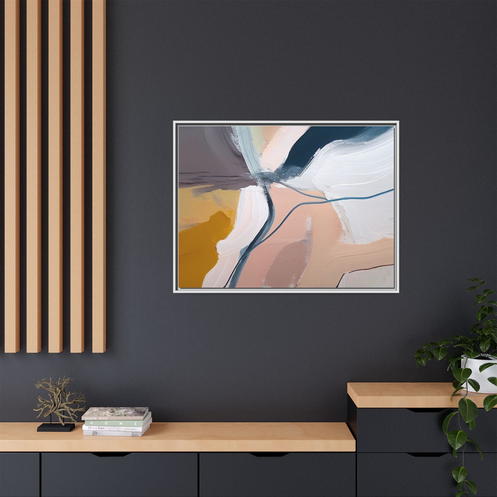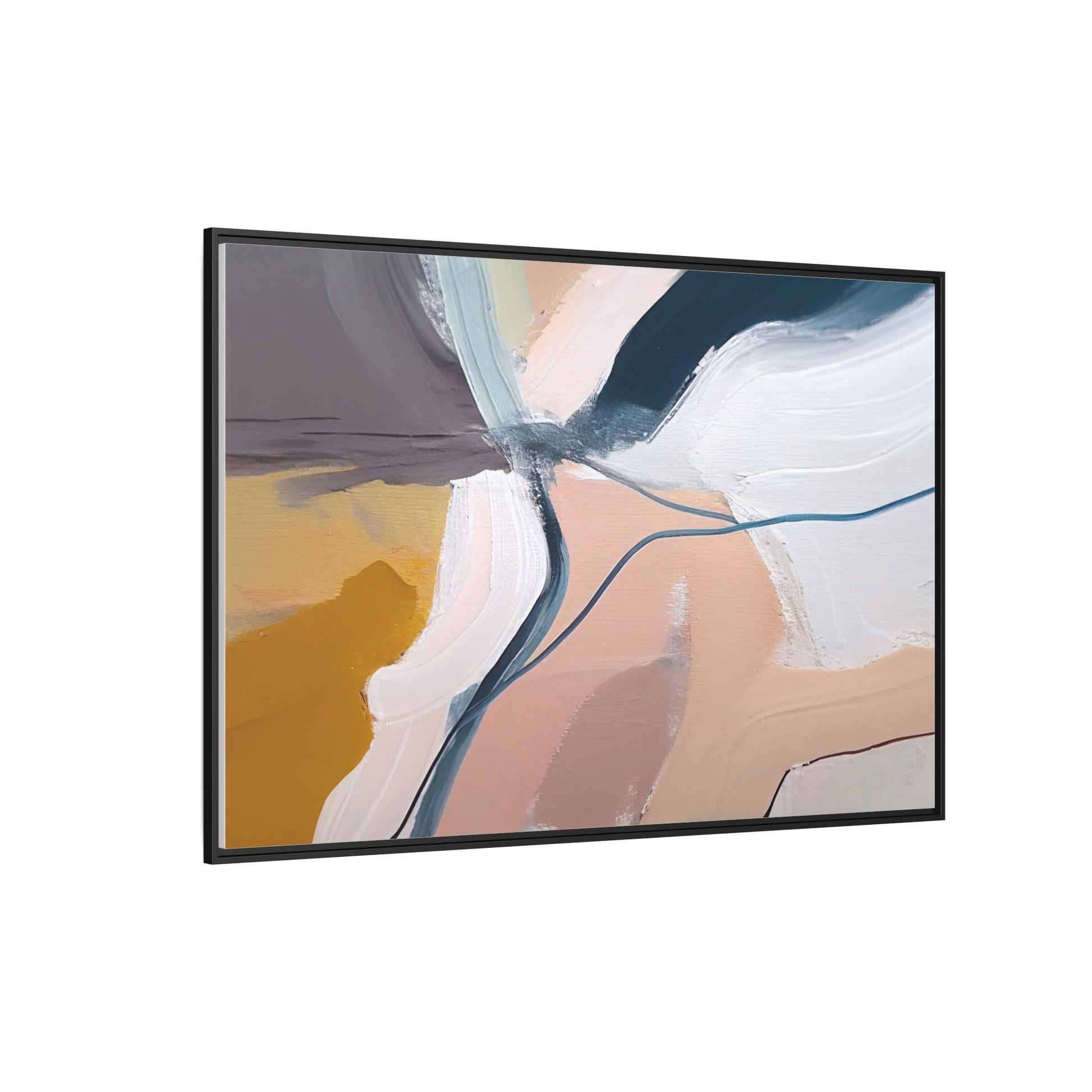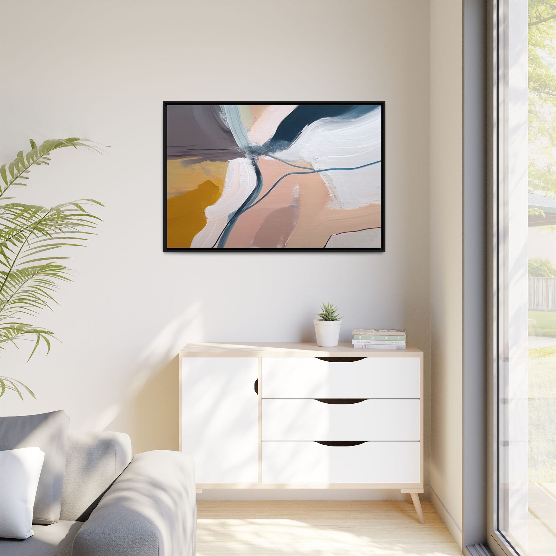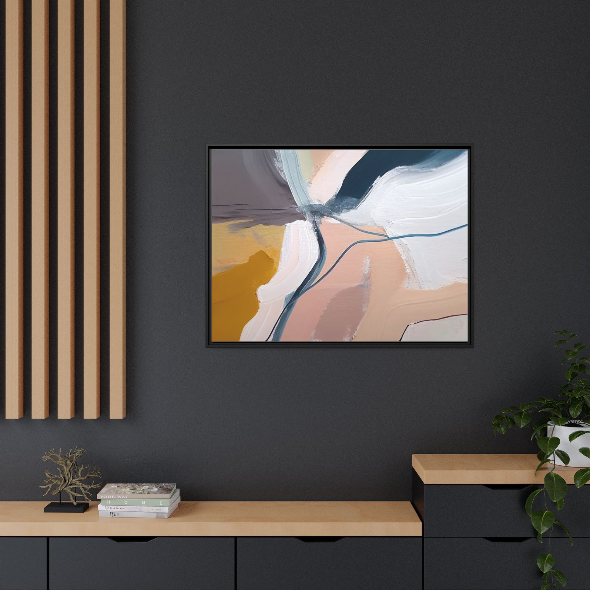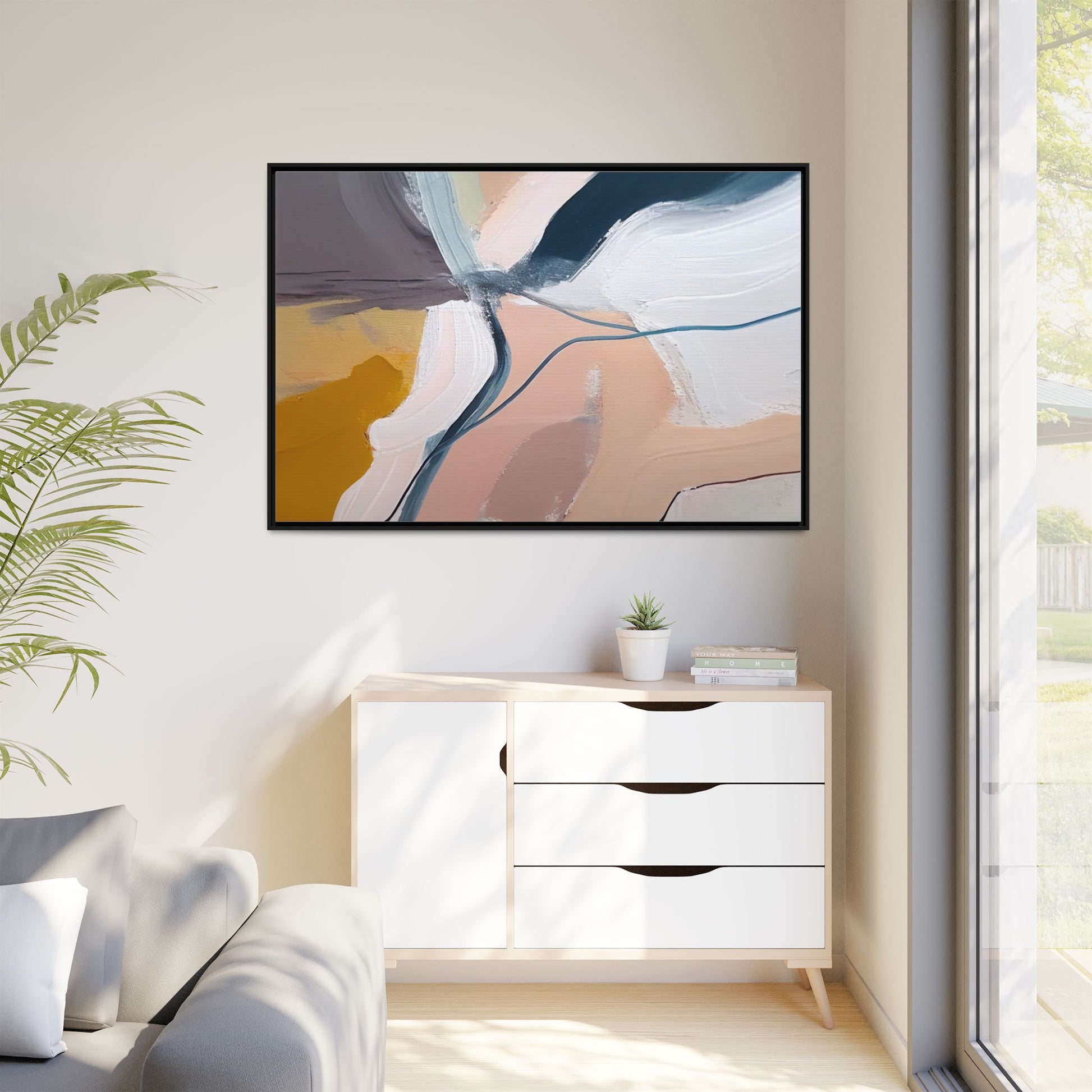 This abstract painting features a dynamic composition of fluid, sweeping brushstrokes in a soft, contemporary color palette. Shades of white, pale pink, deep blue, mustard yellow, and gray intertwine and flow across the canvas, creating a sense of movement and organic shapes. The central focus of the artwork is a converging point where multiple curved lines and color fields meet, suggesting a sense of connection and tension. Textured, layered paint techniques give the piece depth and visual interest, with each color bleeding and blending into the next in a harmonious yet energetic manner. The painting evokes a sense of natural landscapes or aerial views, while maintaining an elegant, minimalist aesthetic that would complement modern interior design styles.