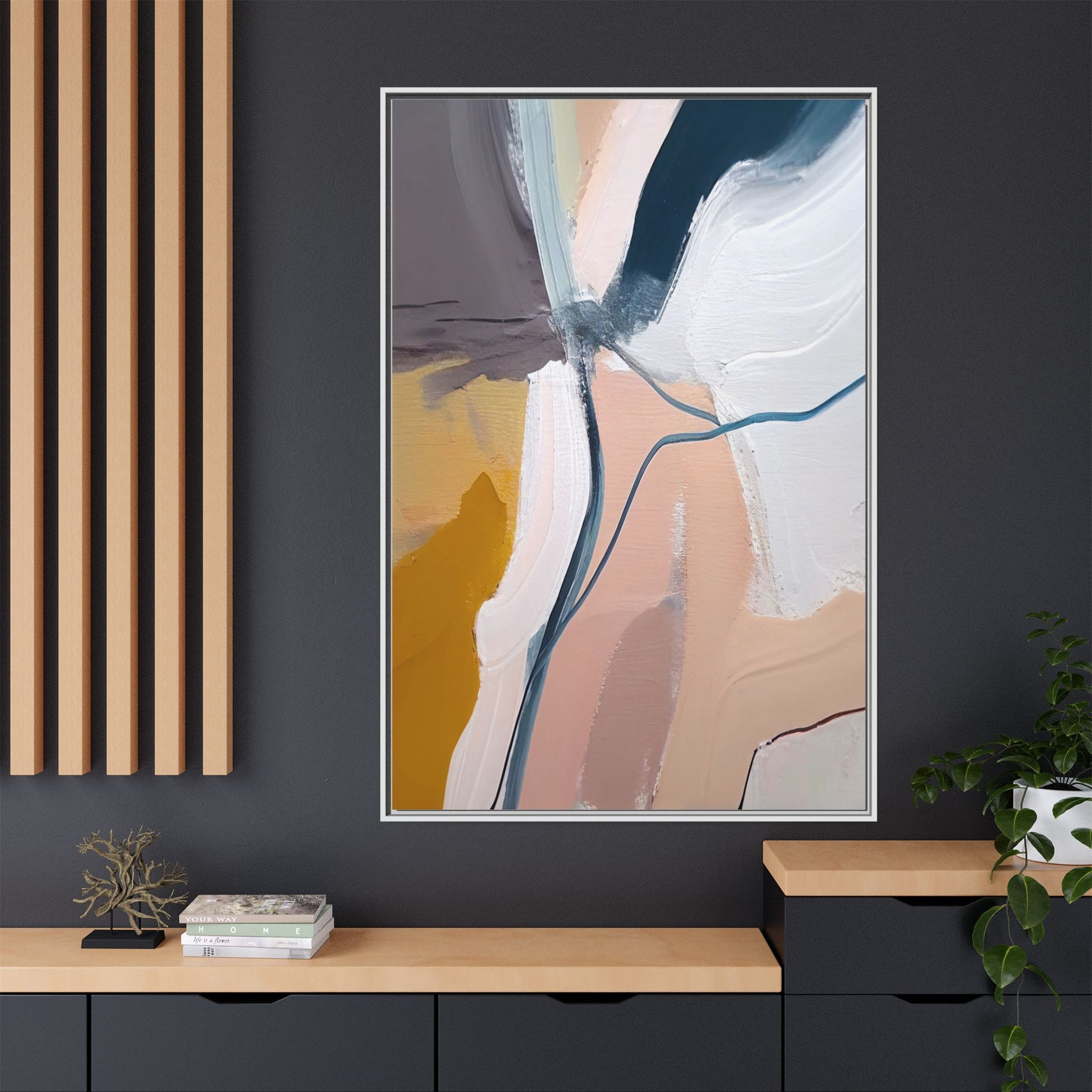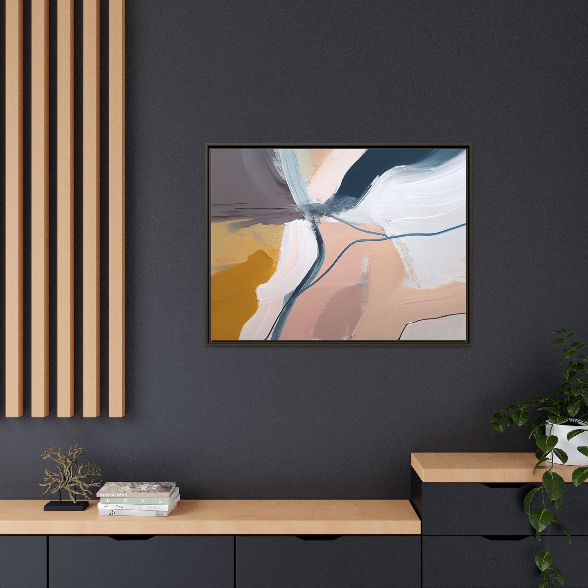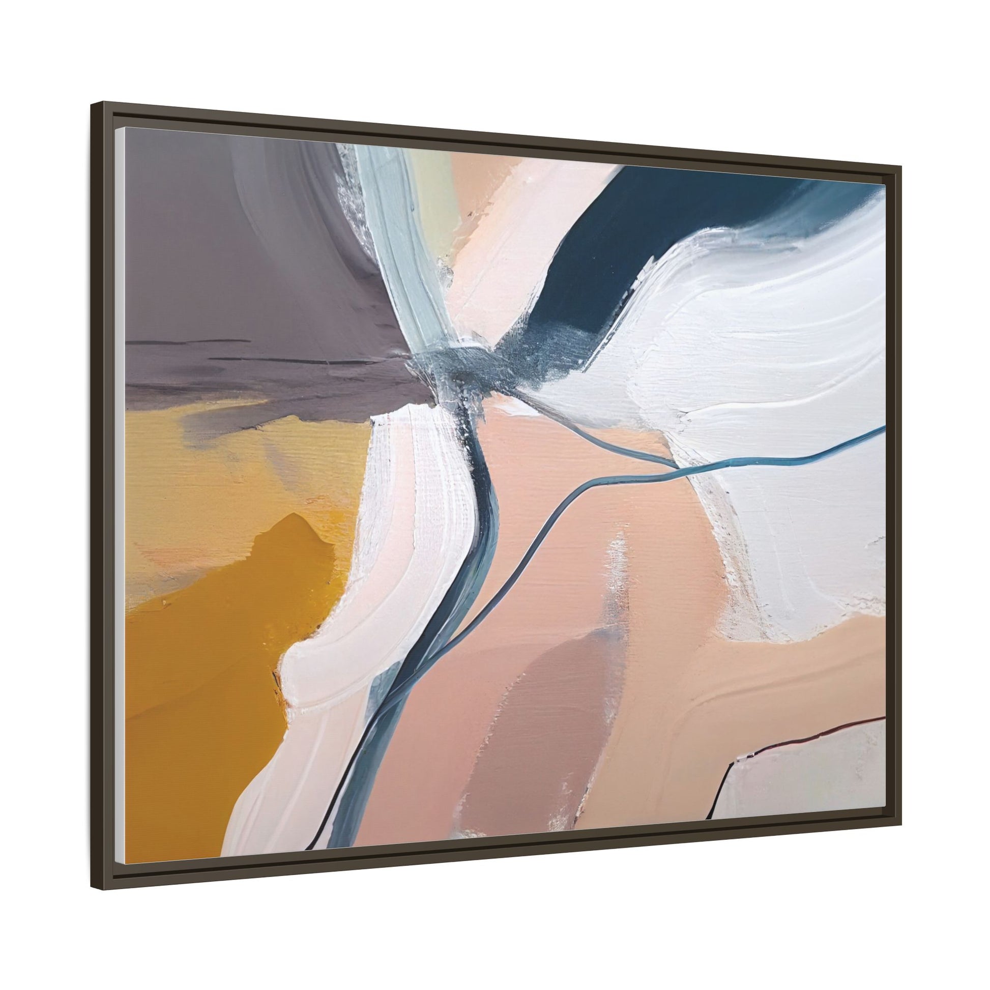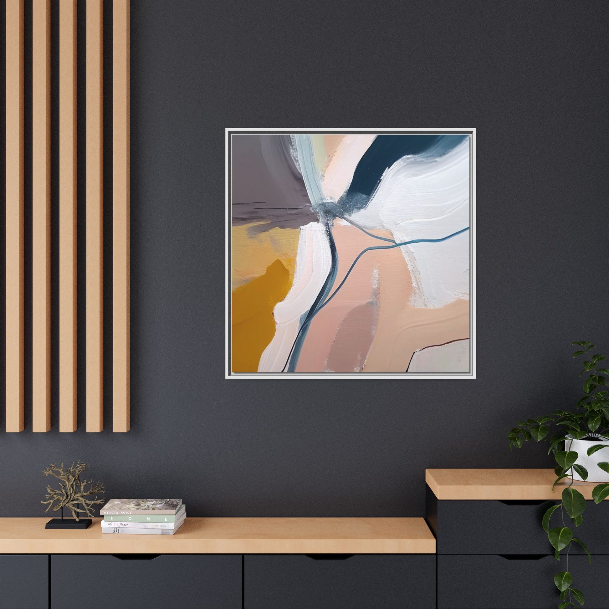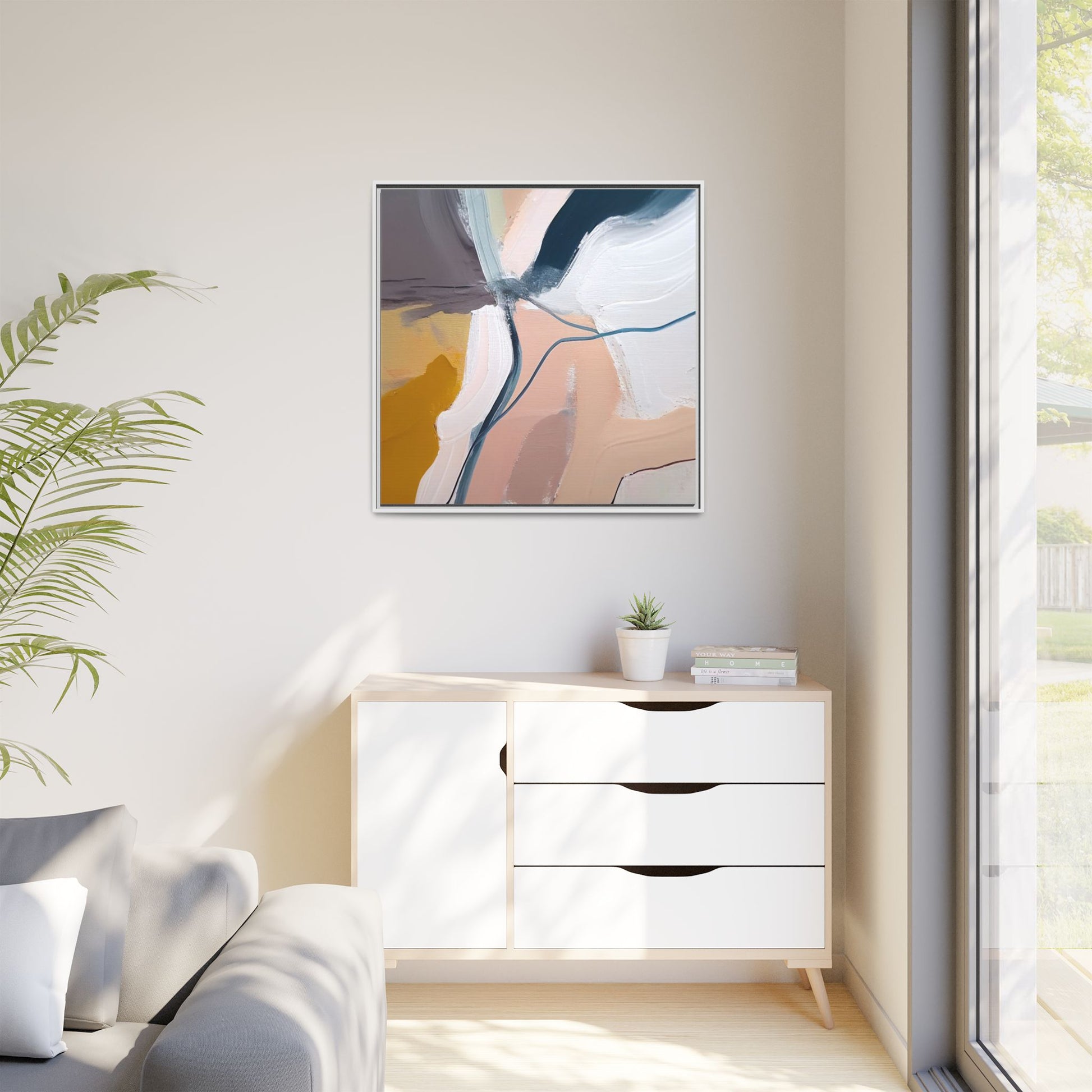 This abstract painting features a dynamic composition of fluid, sweeping brushstrokes in a soft, contemporary color palette. Shades of white, pale pink, deep blue, mustard yellow, and gray intertwine and flow across the canvas, creating a sense of movement and organic shapes. The central focus of the artwork is a converging point where multiple curved lines and color fields meet, suggesting a sense of connection and tension. Textured, layered paint techniques give the piece depth and visual interest, with each color bleeding and blending into the next in a harmonious yet energetic manner. The painting evokes a sense of natural landscapes or aerial views, while maintaining an elegant, minimalist aesthetic that would complement modern interior design styles.
