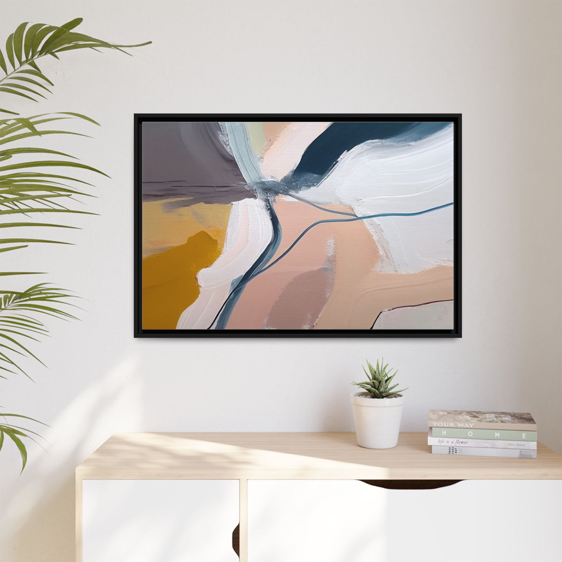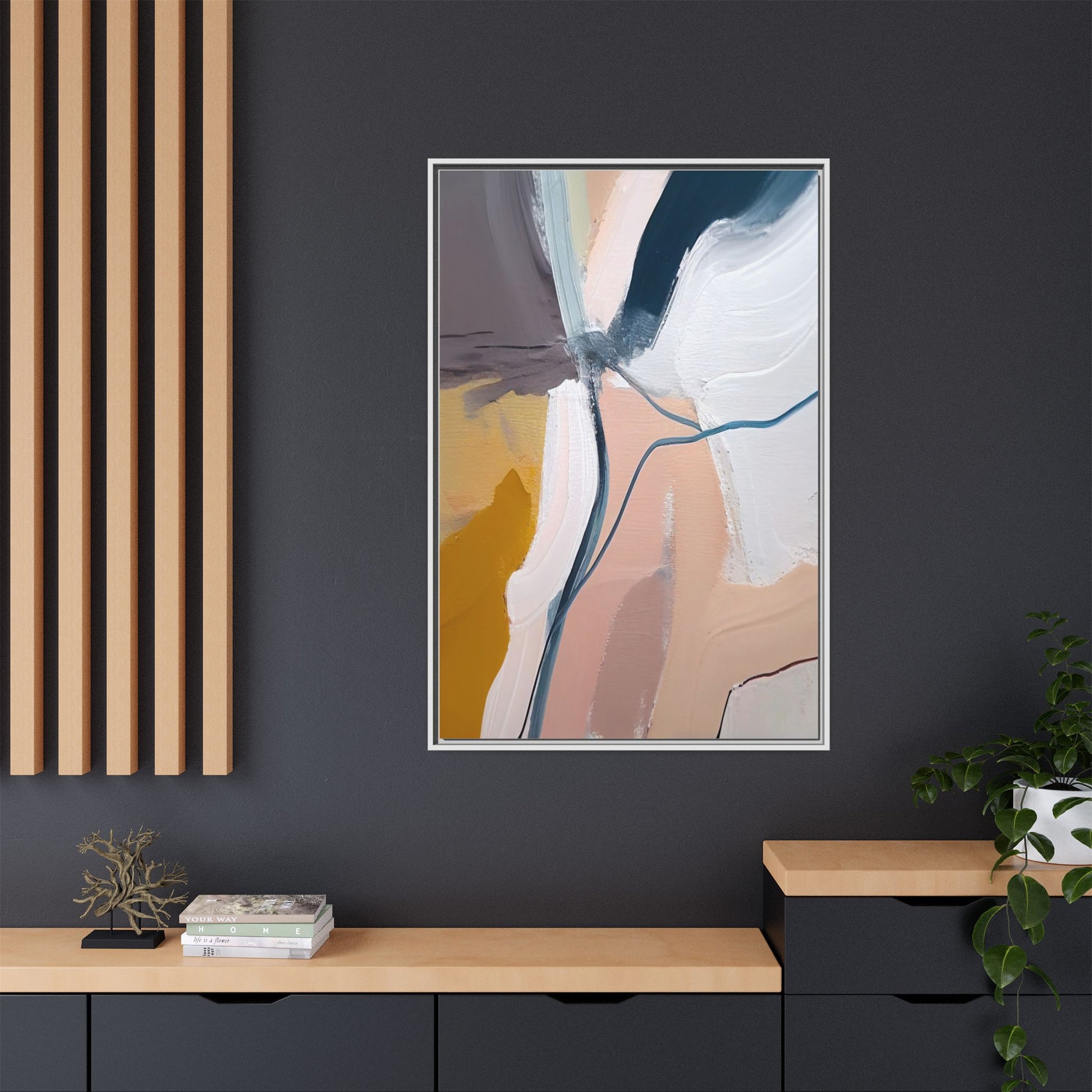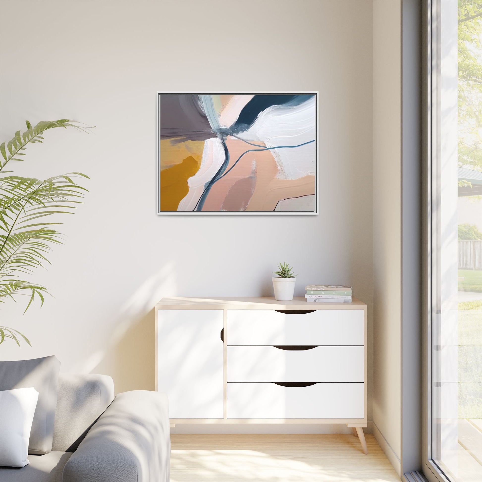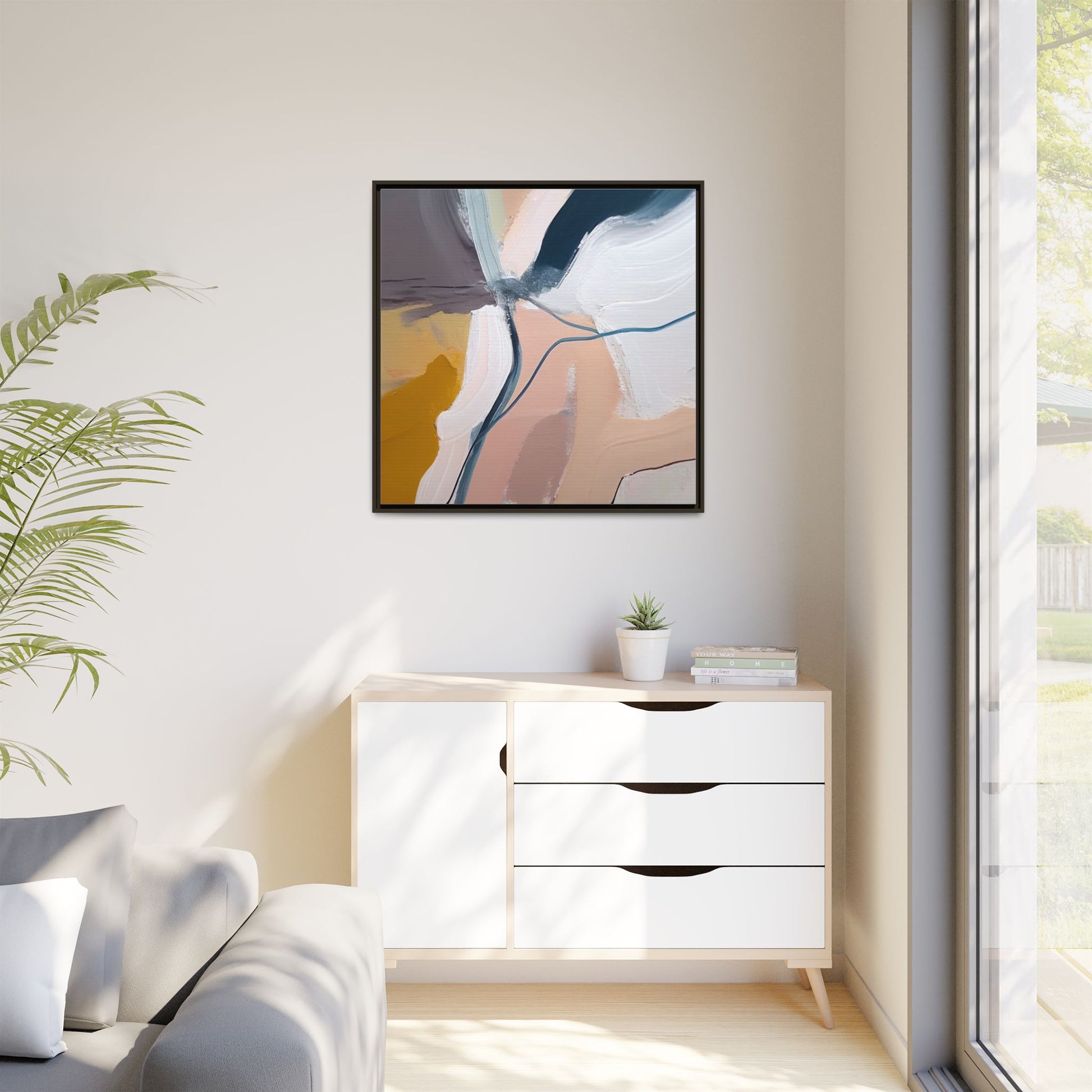 This abstract painting features a dynamic composition of fluid, sweeping brushstrokes in a soft, contemporary color palette. Shades of white, pale pink, deep blue, mustard yellow, and gray intertwine and flow across the canvas, creating a sense of movement and organic shapes. The central focus of the artwork is a converging point where multiple curved lines and color fields meet, suggesting a sense of connection and tension. Textured, layered paint techniques give the piece depth and visual interest, with each color bleeding and blending into the next in a harmonious yet energetic manner. The painting evokes a sense of natural landscapes or aerial views, while maintaining an elegant, minimalist aesthetic that would complement modern interior design styles.