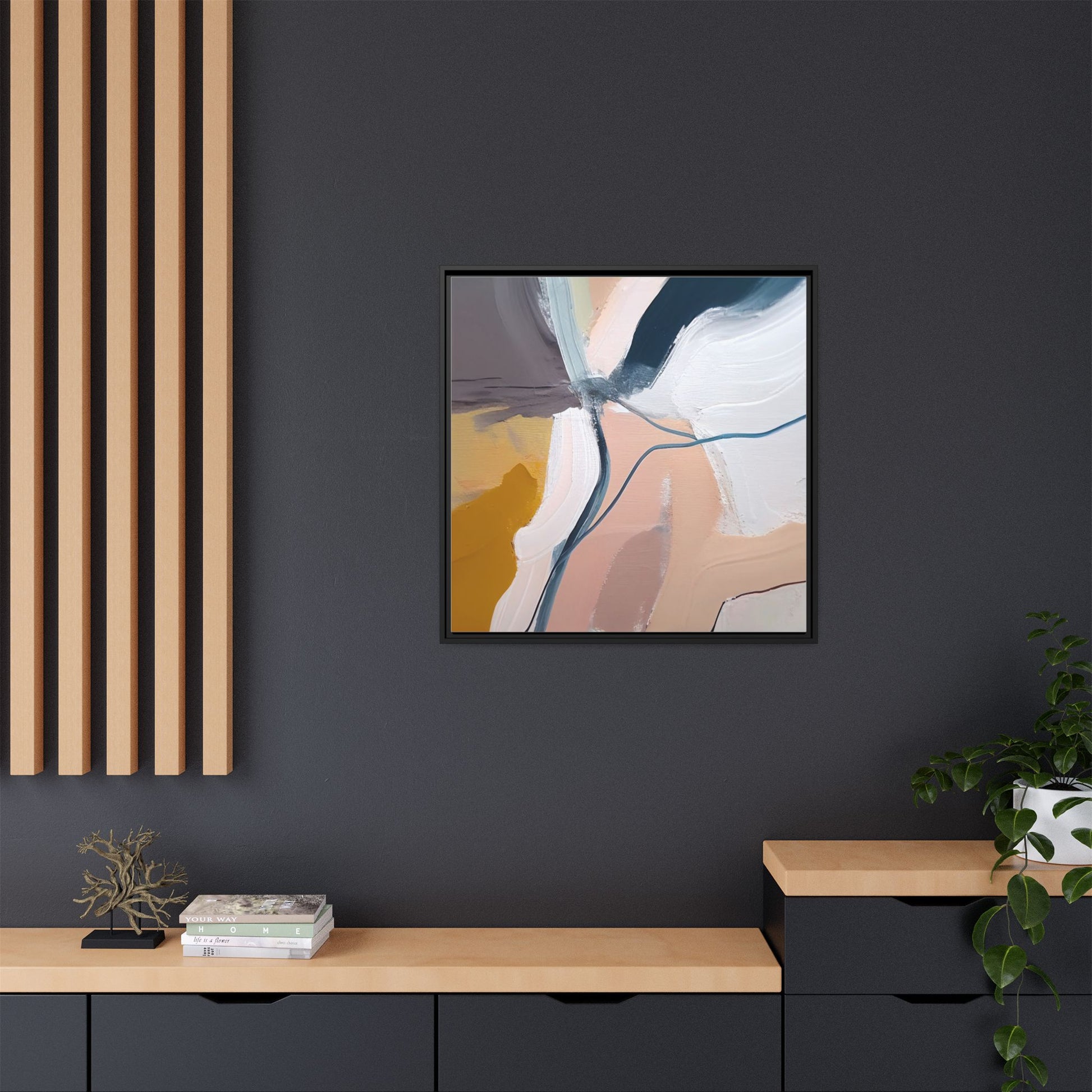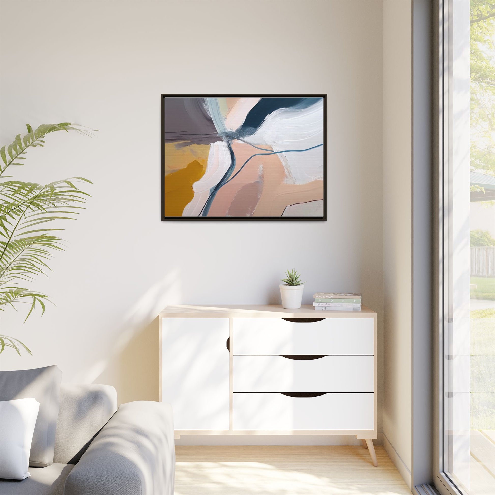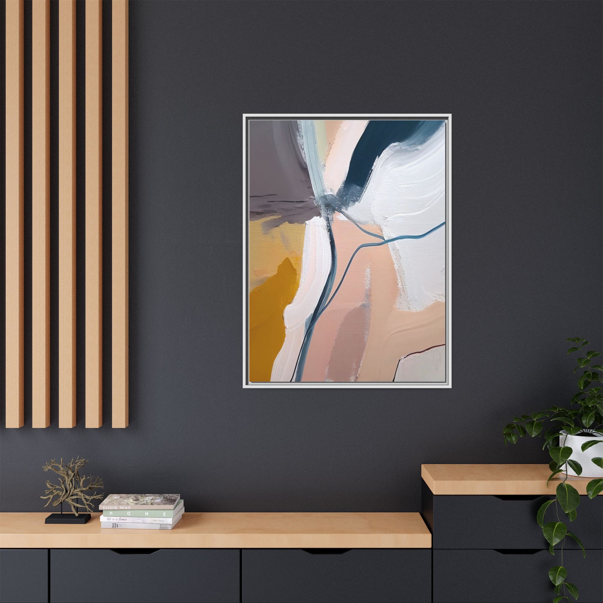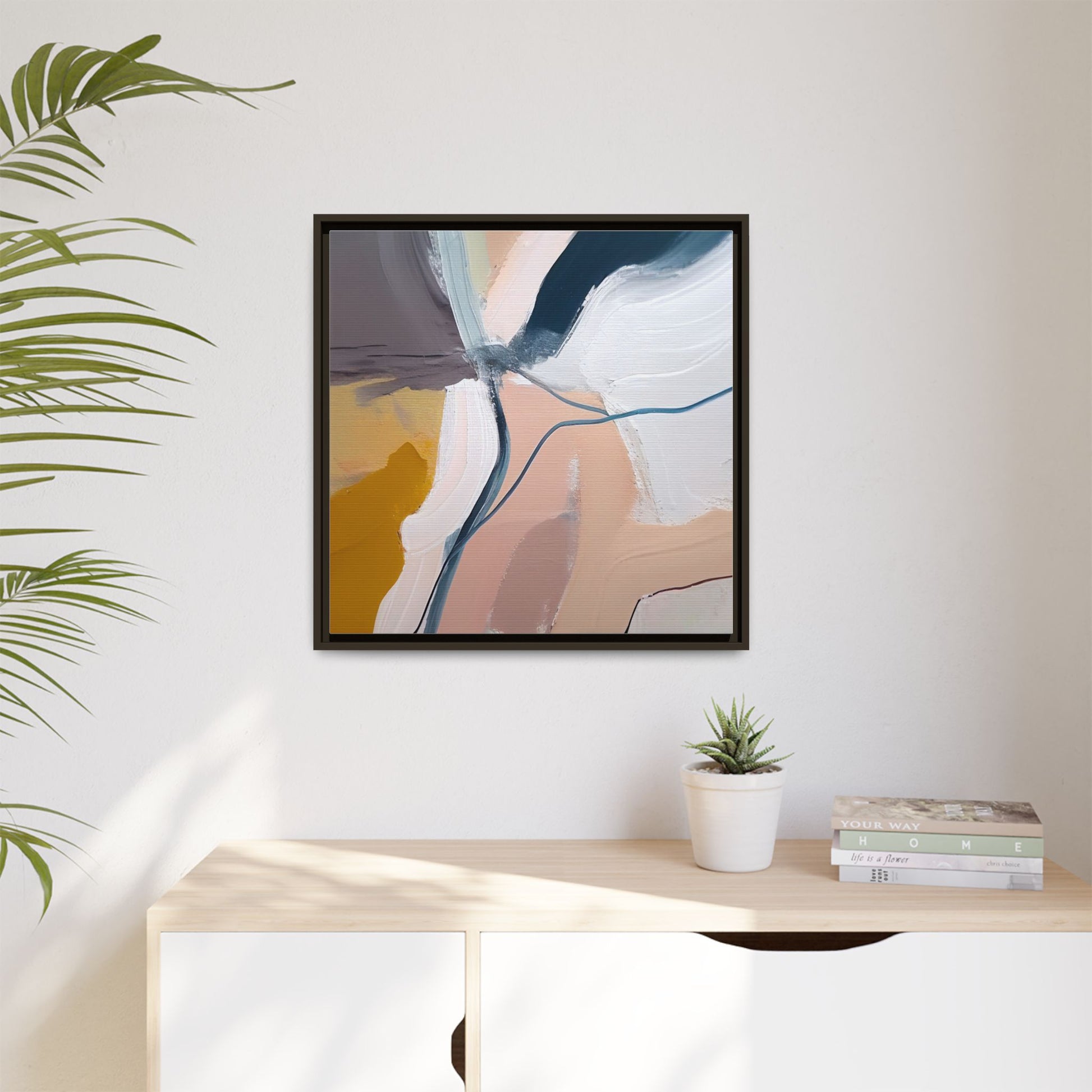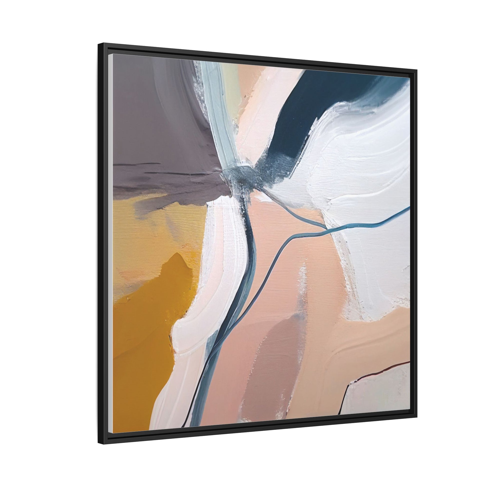 This abstract painting features a dynamic composition of fluid, sweeping brushstrokes in a soft, contemporary color palette. Shades of white, pale pink, deep blue, mustard yellow, and gray intertwine and flow across the canvas, creating a sense of movement and organic shapes. The central focus of the artwork is a converging point where multiple curved lines and color fields meet, suggesting a sense of connection and tension. Textured, layered paint techniques give the piece depth and visual interest, with each color bleeding and blending into the next in a harmonious yet energetic manner. The painting evokes a sense of natural landscapes or aerial views, while maintaining an elegant, minimalist aesthetic that would complement modern interior design styles.