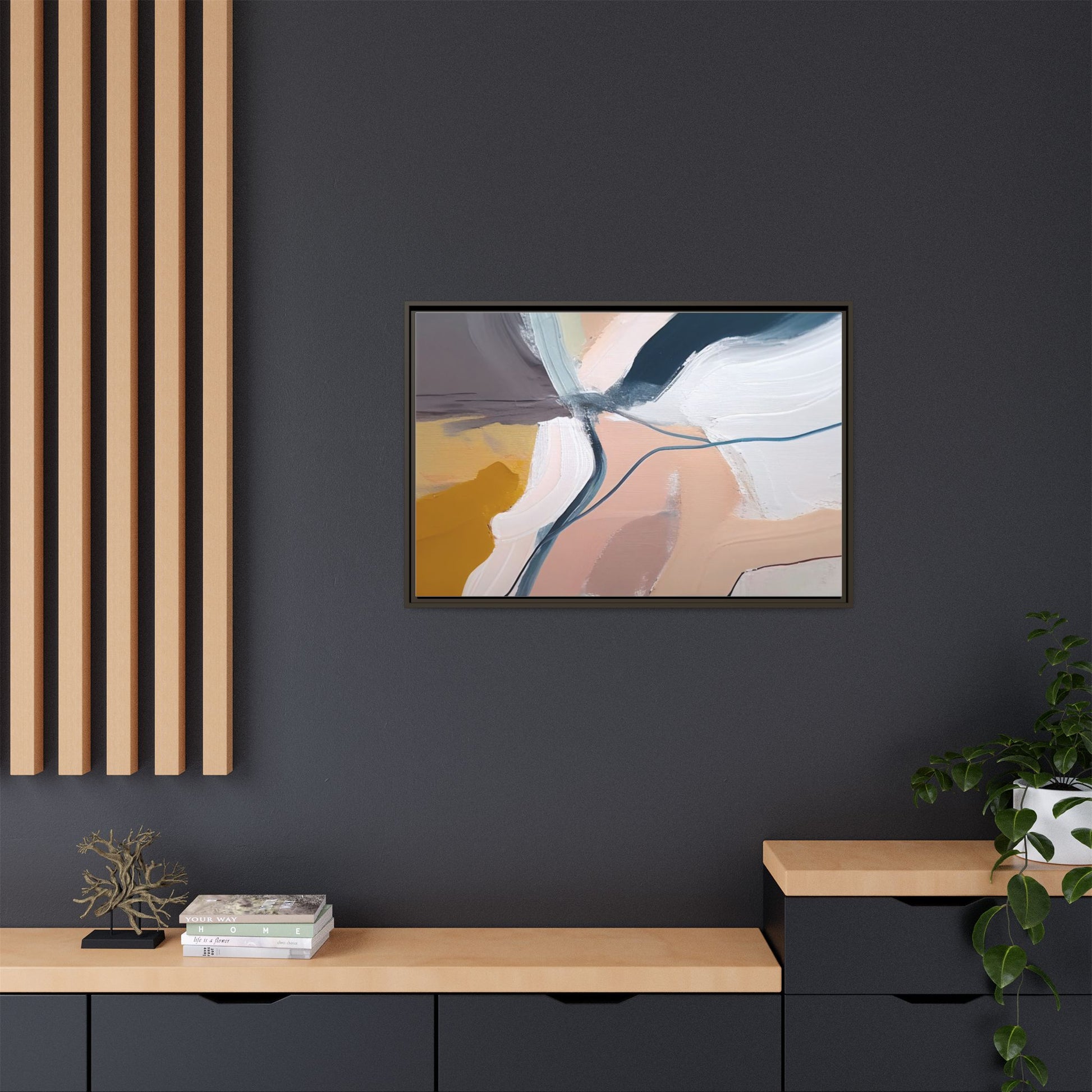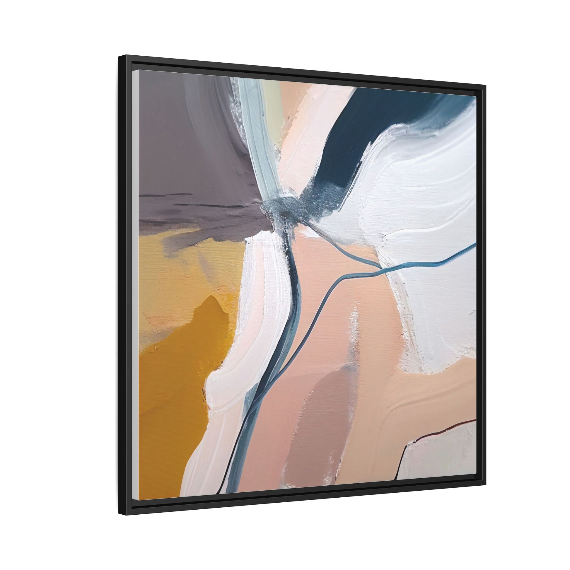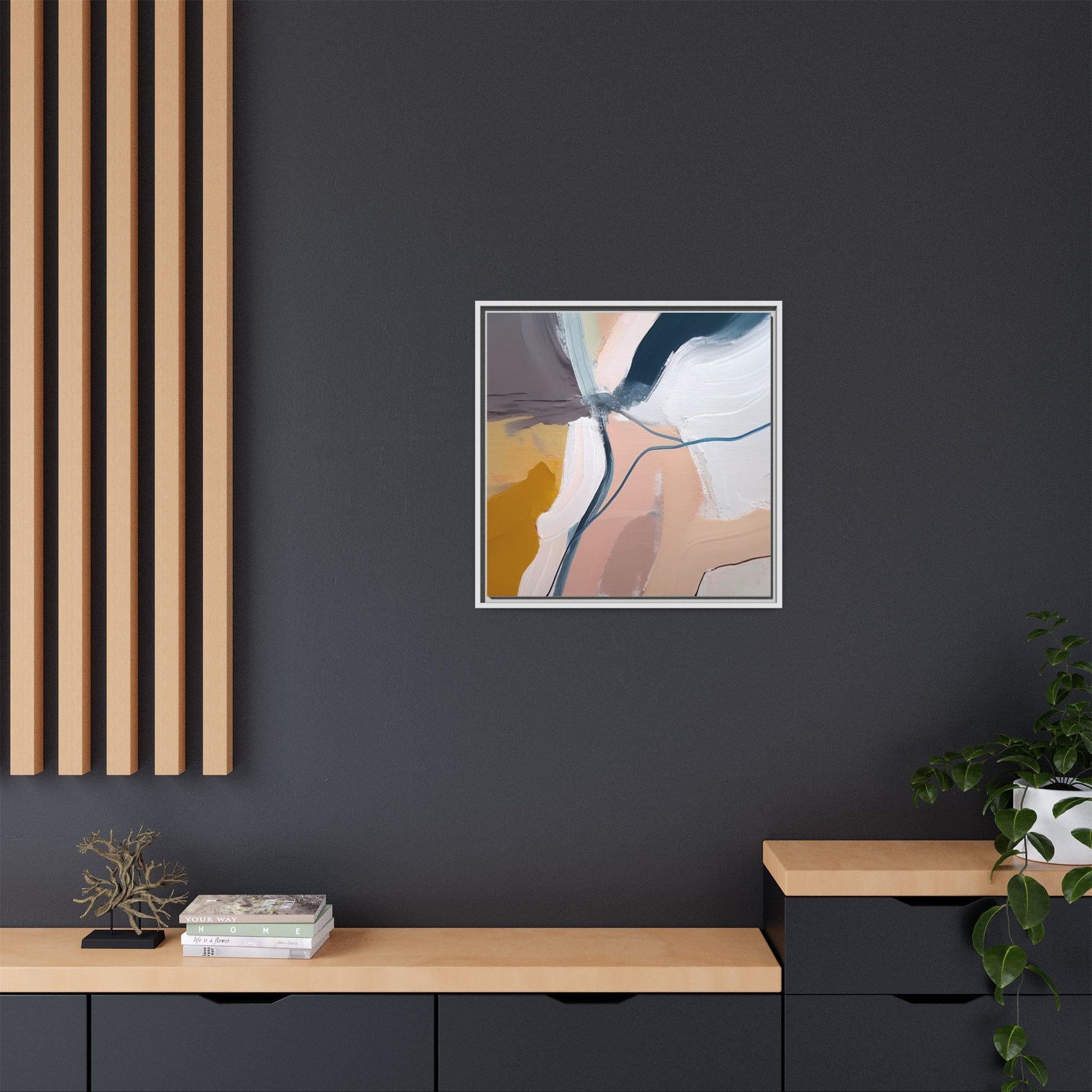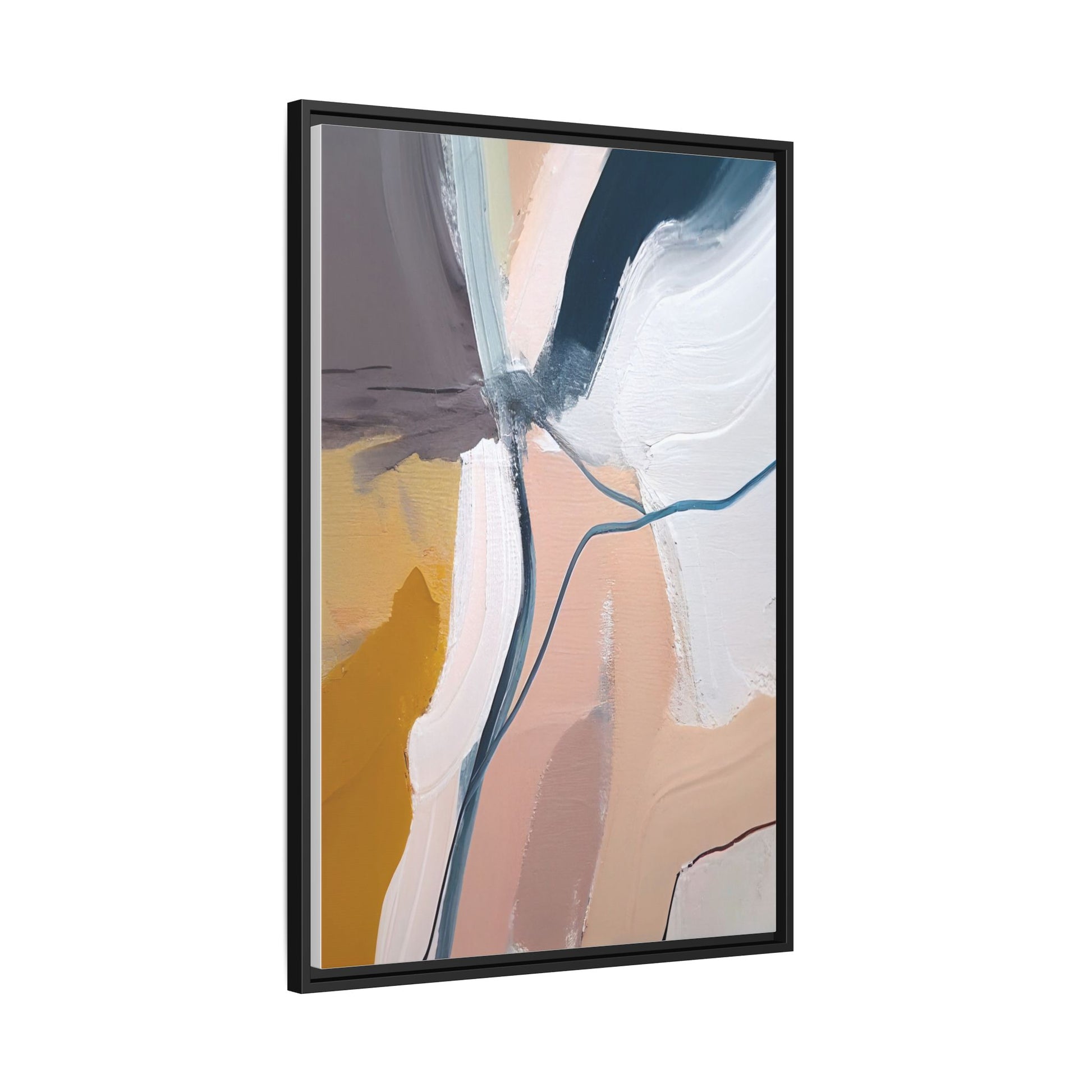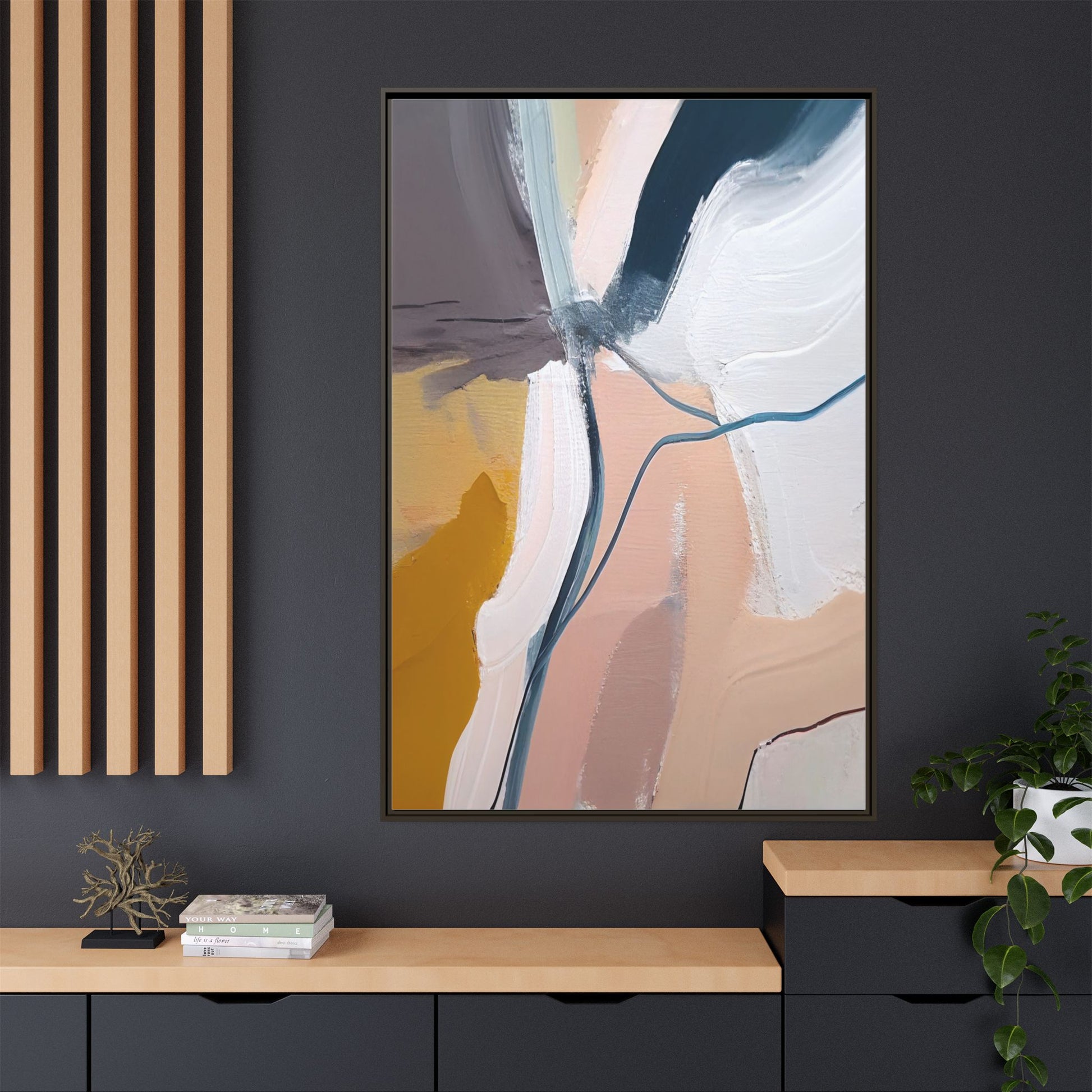 This abstract painting features a dynamic composition of fluid, sweeping brushstrokes in a soft, contemporary color palette. Shades of white, pale pink, deep blue, mustard yellow, and gray intertwine and flow across the canvas, creating a sense of movement and organic shapes. The central focus of the artwork is a converging point where multiple curved lines and color fields meet, suggesting a sense of connection and tension. Textured, layered paint techniques give the piece depth and visual interest, with each color bleeding and blending into the next in a harmonious yet energetic manner. The painting evokes a sense of natural landscapes or aerial views, while maintaining an elegant, minimalist aesthetic that would complement modern interior design styles.