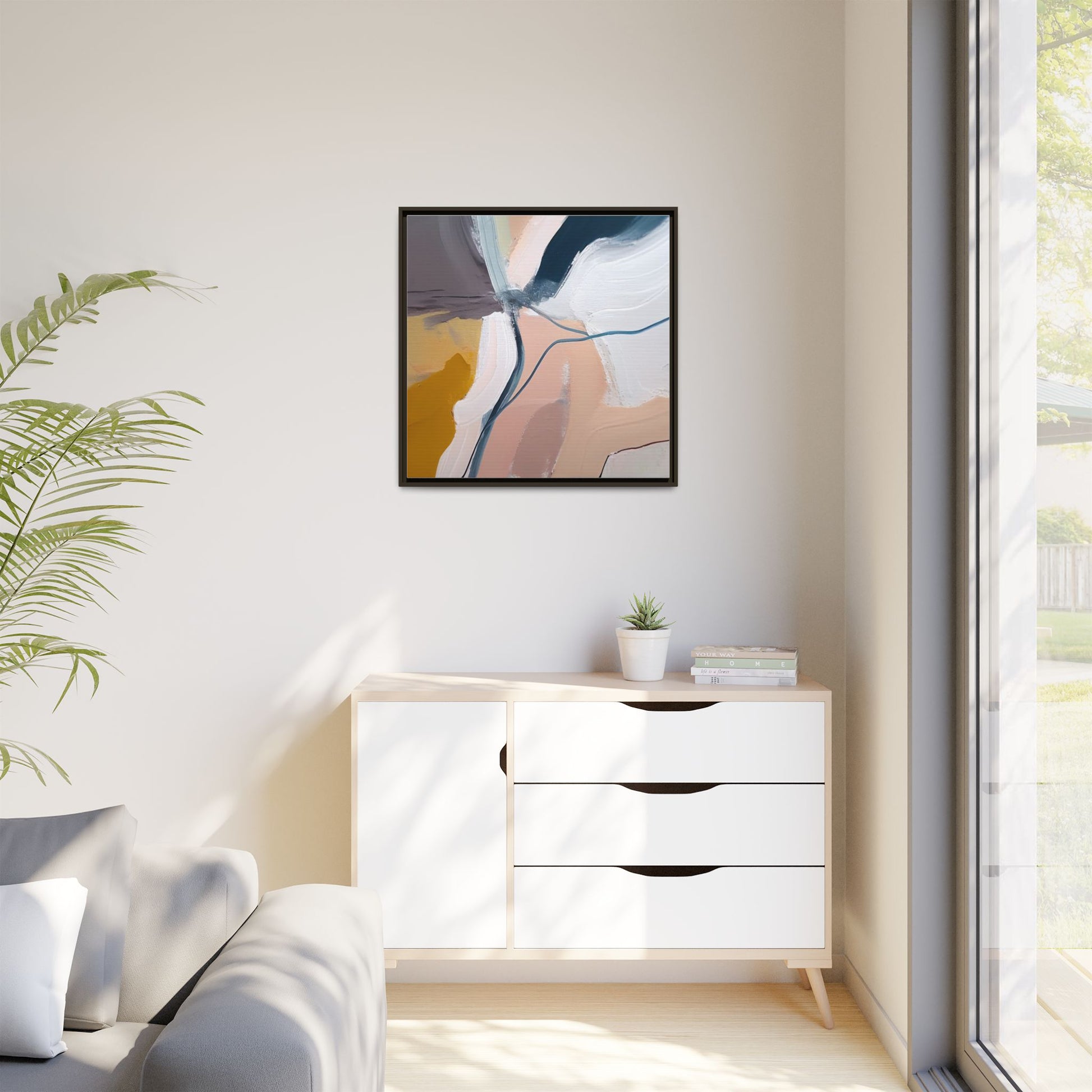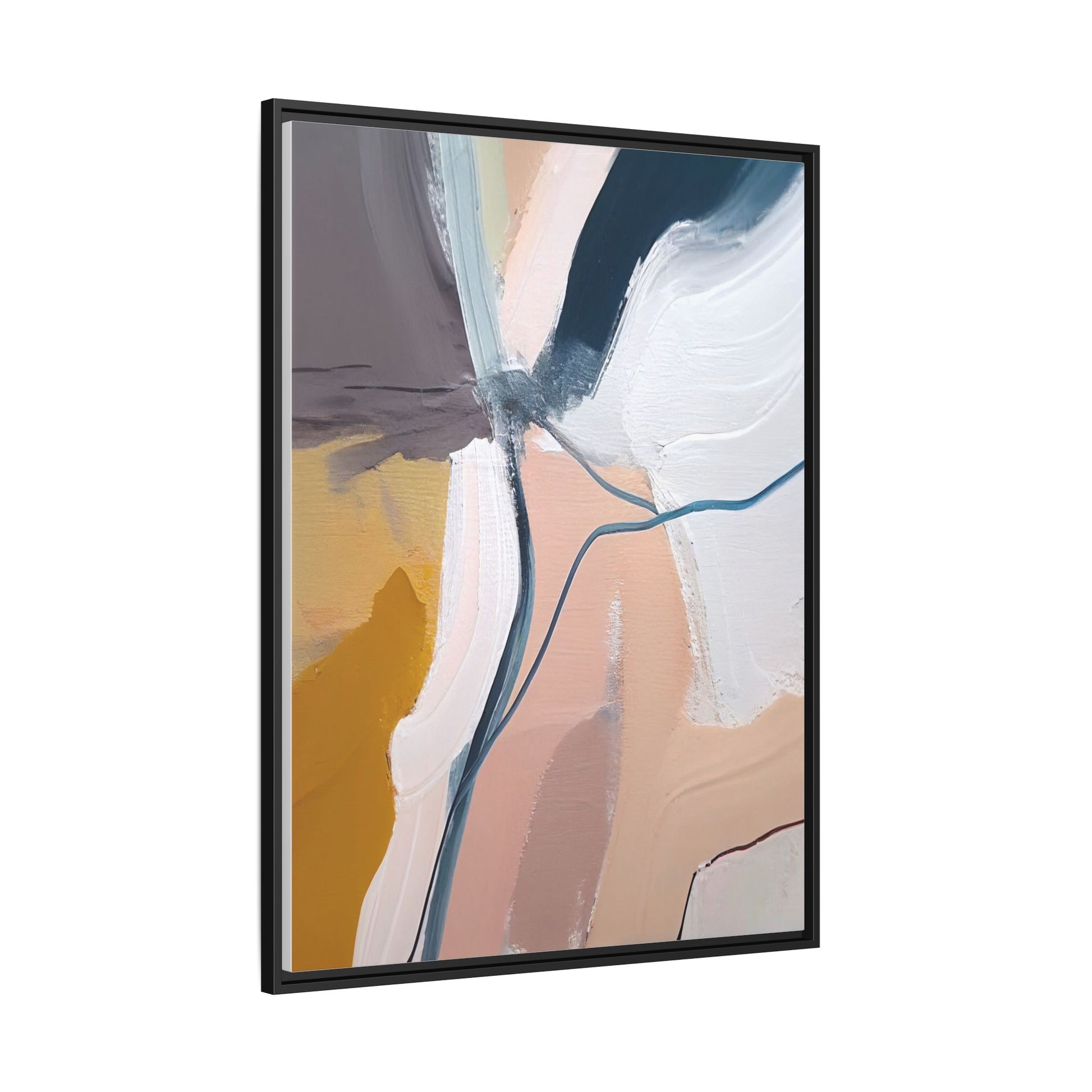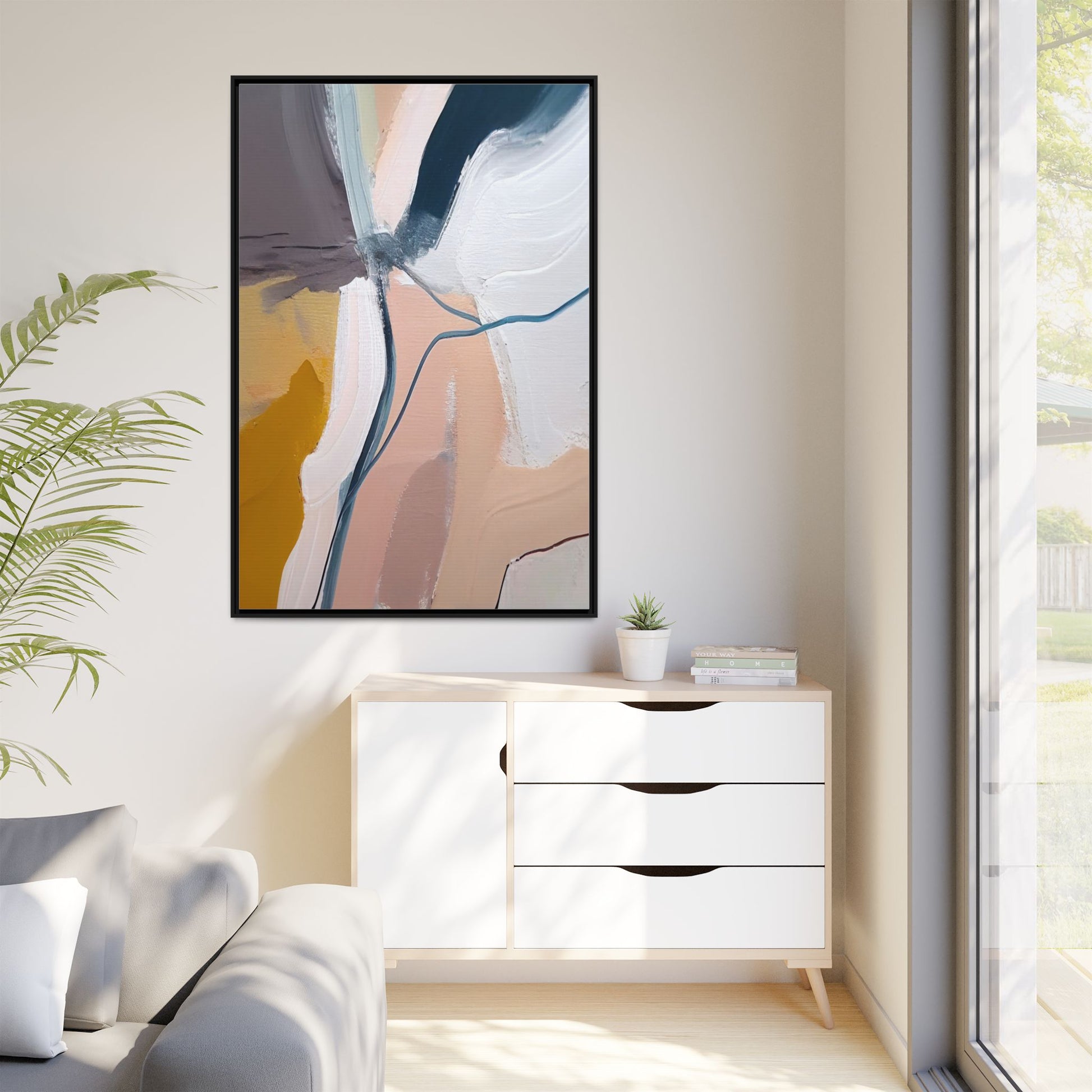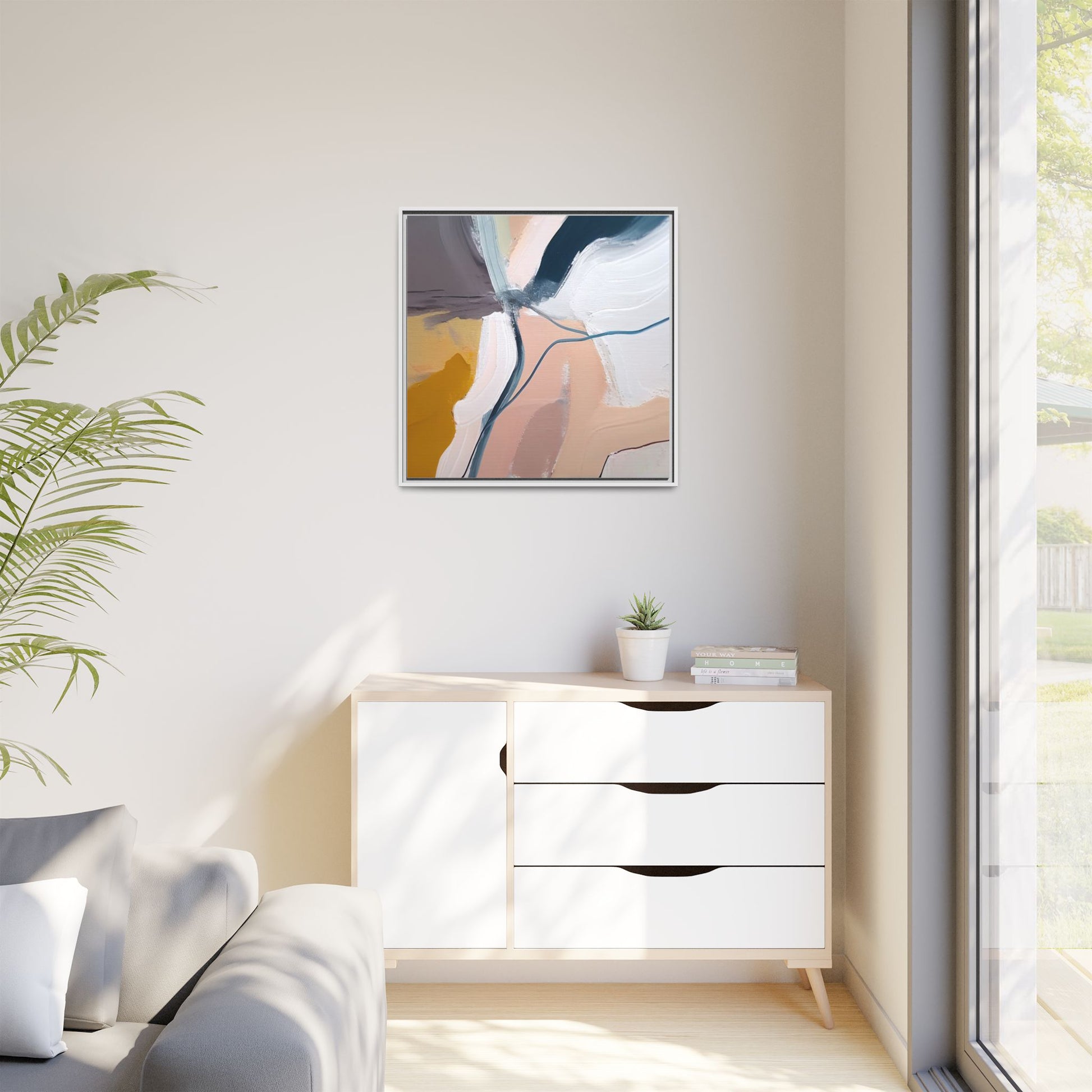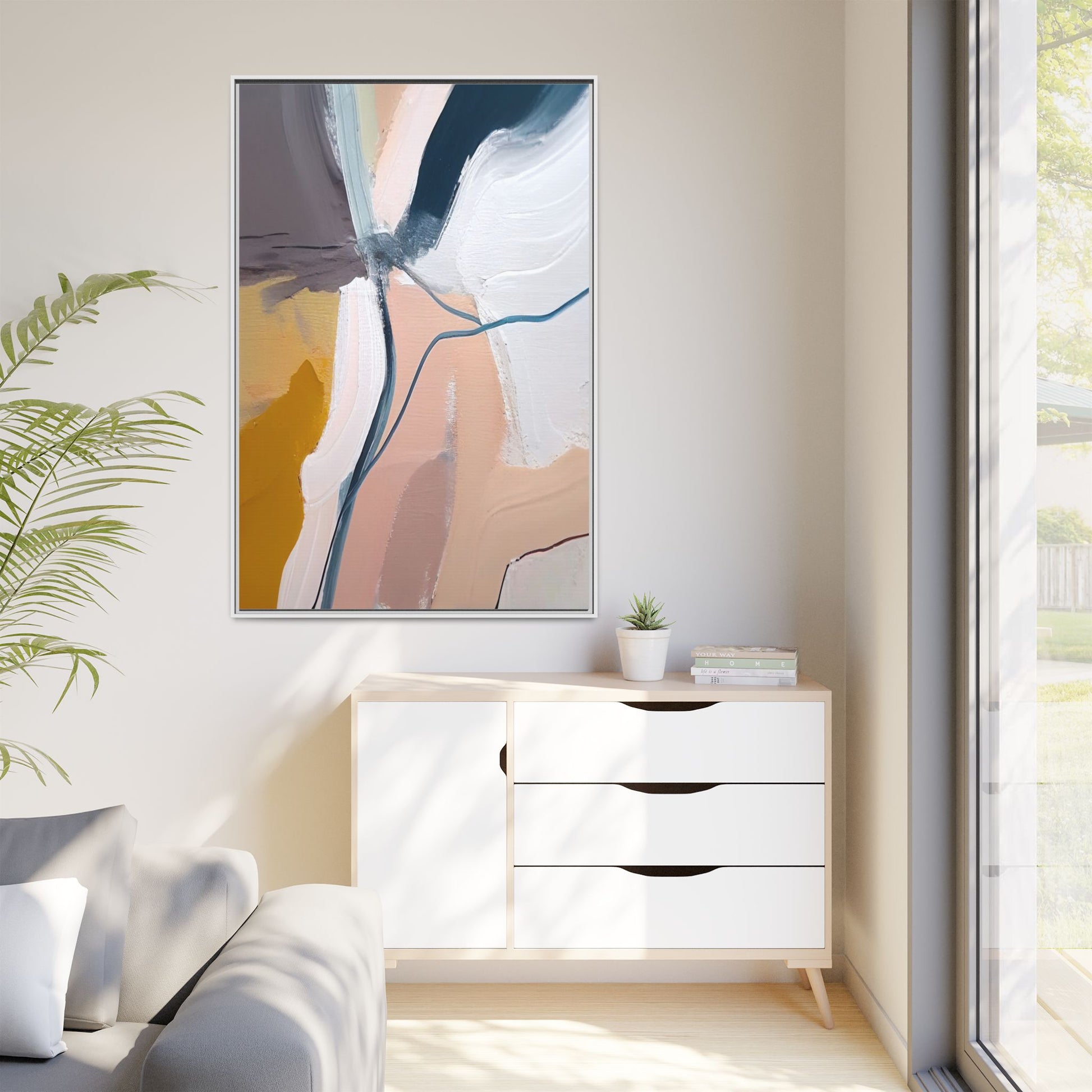 This abstract painting features a dynamic composition of fluid, sweeping brushstrokes in a soft, contemporary color palette. Shades of white, pale pink, deep blue, mustard yellow, and gray intertwine and flow across the canvas, creating a sense of movement and organic shapes. The central focus of the artwork is a converging point where multiple curved lines and color fields meet, suggesting a sense of connection and tension. Textured, layered paint techniques give the piece depth and visual interest, with each color bleeding and blending into the next in a harmonious yet energetic manner. The painting evokes a sense of natural landscapes or aerial views, while maintaining an elegant, minimalist aesthetic that would complement modern interior design styles.