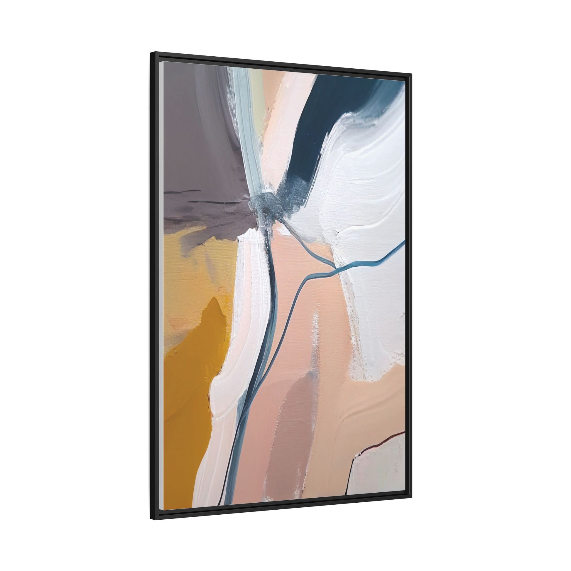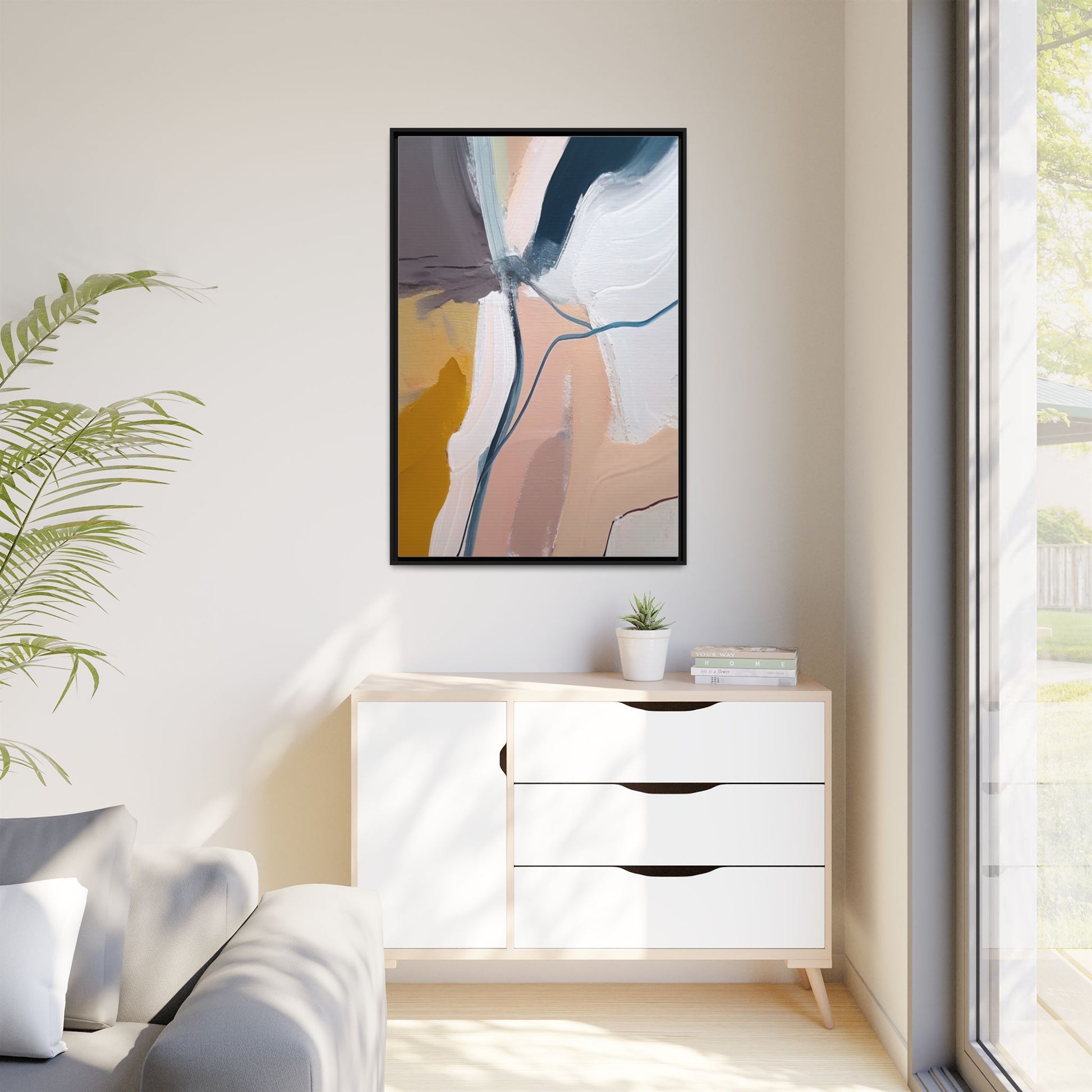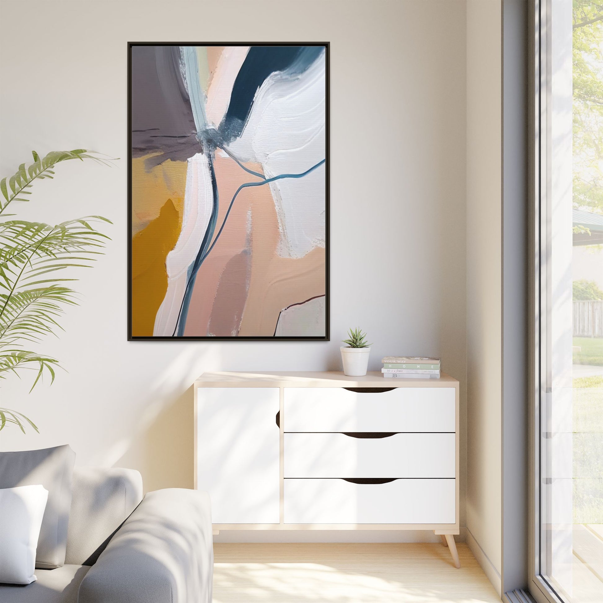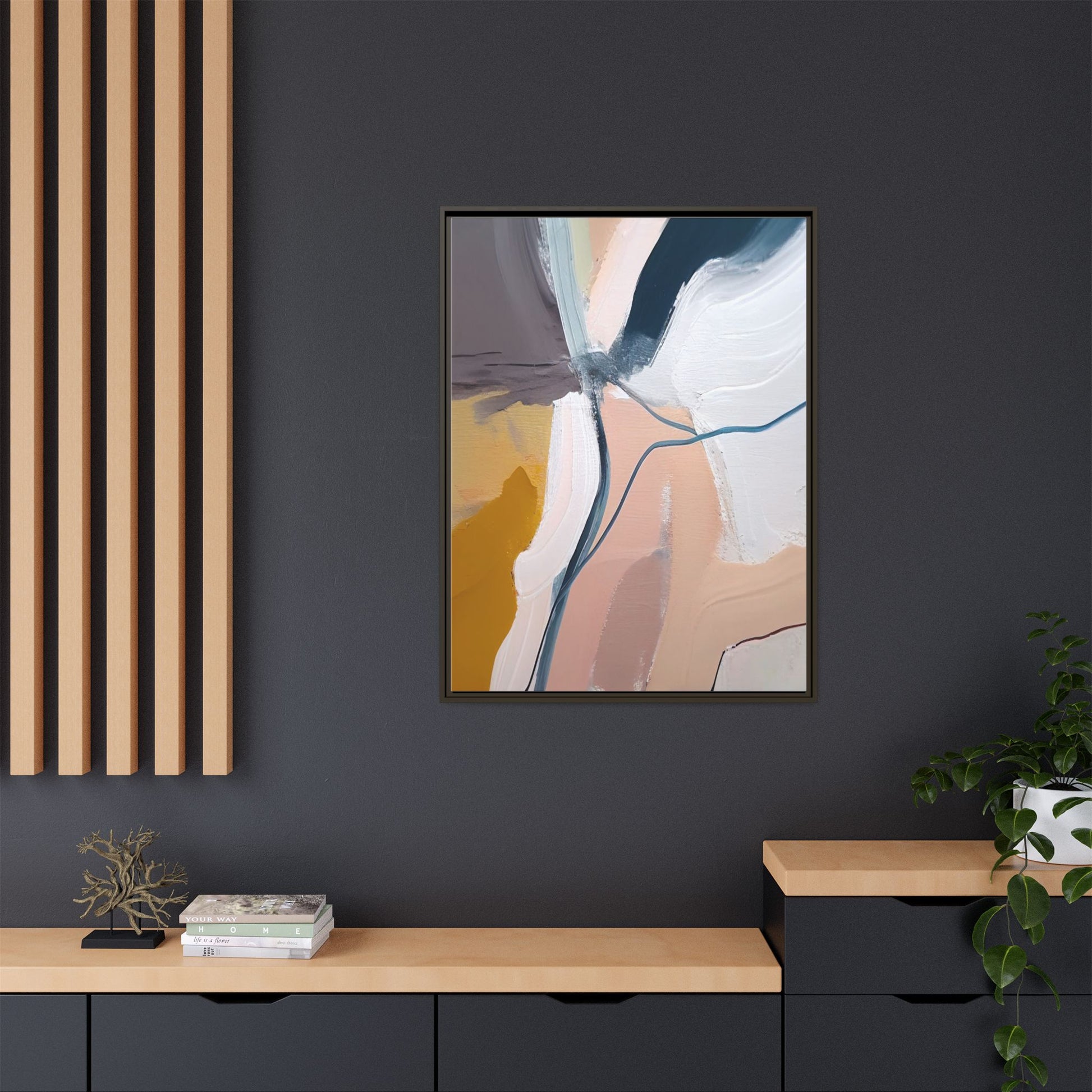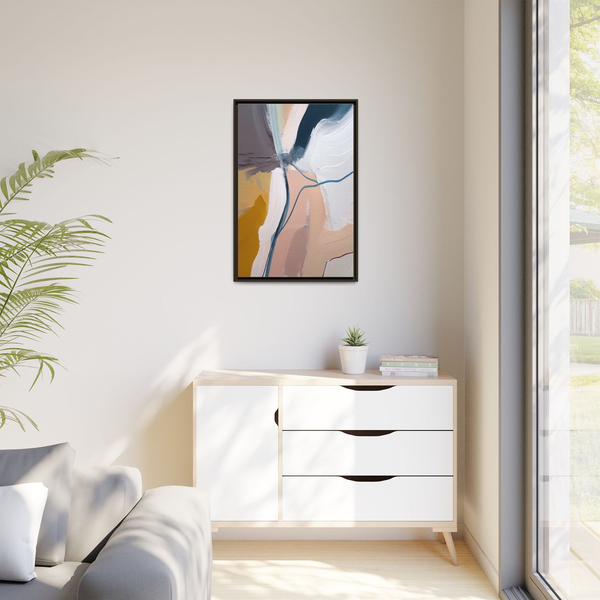 This abstract painting features a dynamic composition of fluid, sweeping brushstrokes in a soft, contemporary color palette. Shades of white, pale pink, deep blue, mustard yellow, and gray intertwine and flow across the canvas, creating a sense of movement and organic shapes. The central focus of the artwork is a converging point where multiple curved lines and color fields meet, suggesting a sense of connection and tension. Textured, layered paint techniques give the piece depth and visual interest, with each color bleeding and blending into the next in a harmonious yet energetic manner. The painting evokes a sense of natural landscapes or aerial views, while maintaining an elegant, minimalist aesthetic that would complement modern interior design styles.