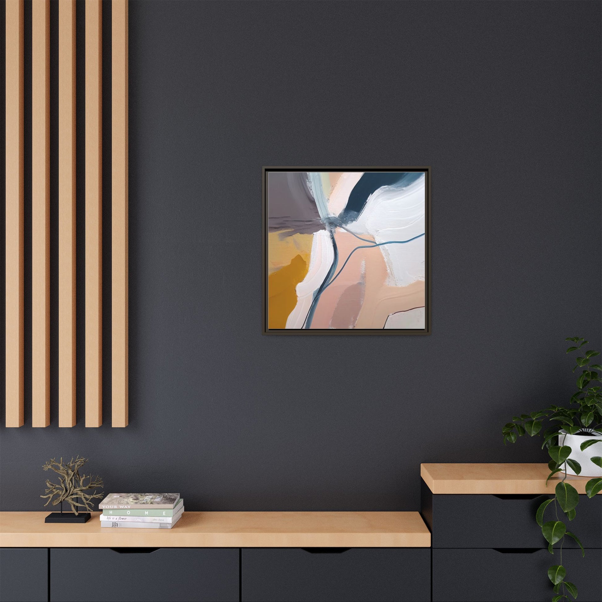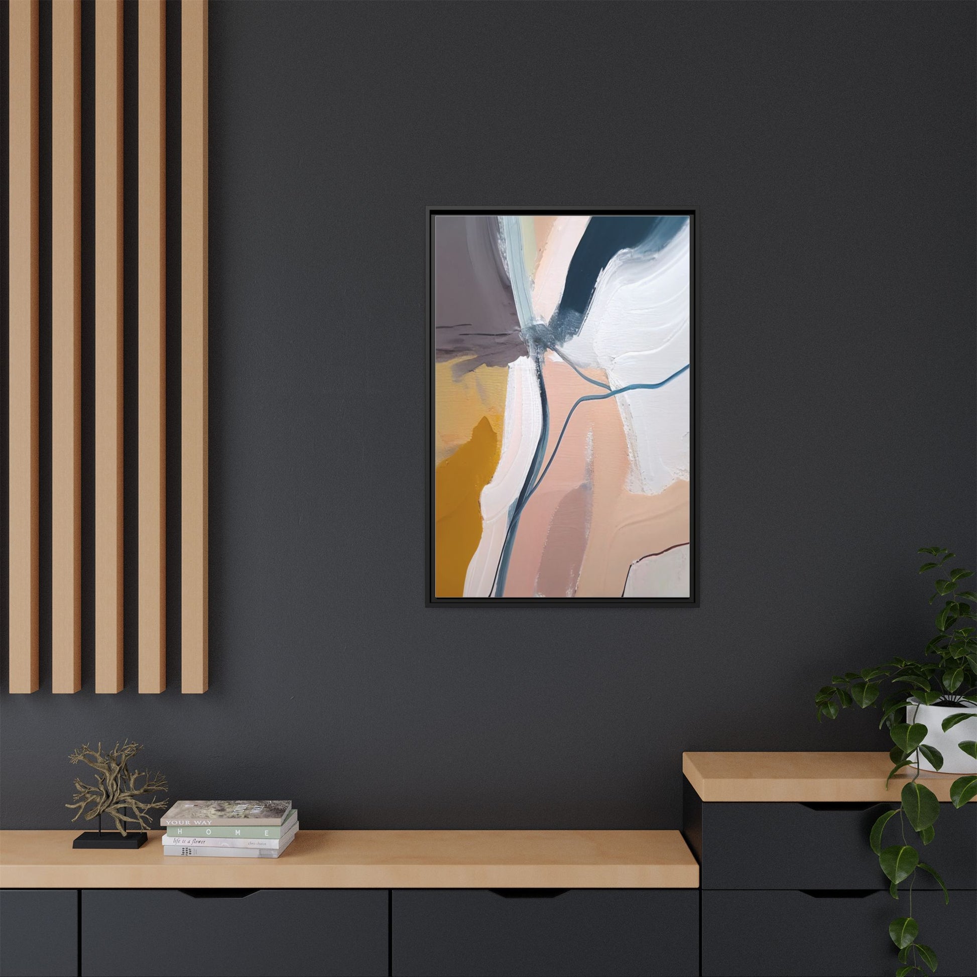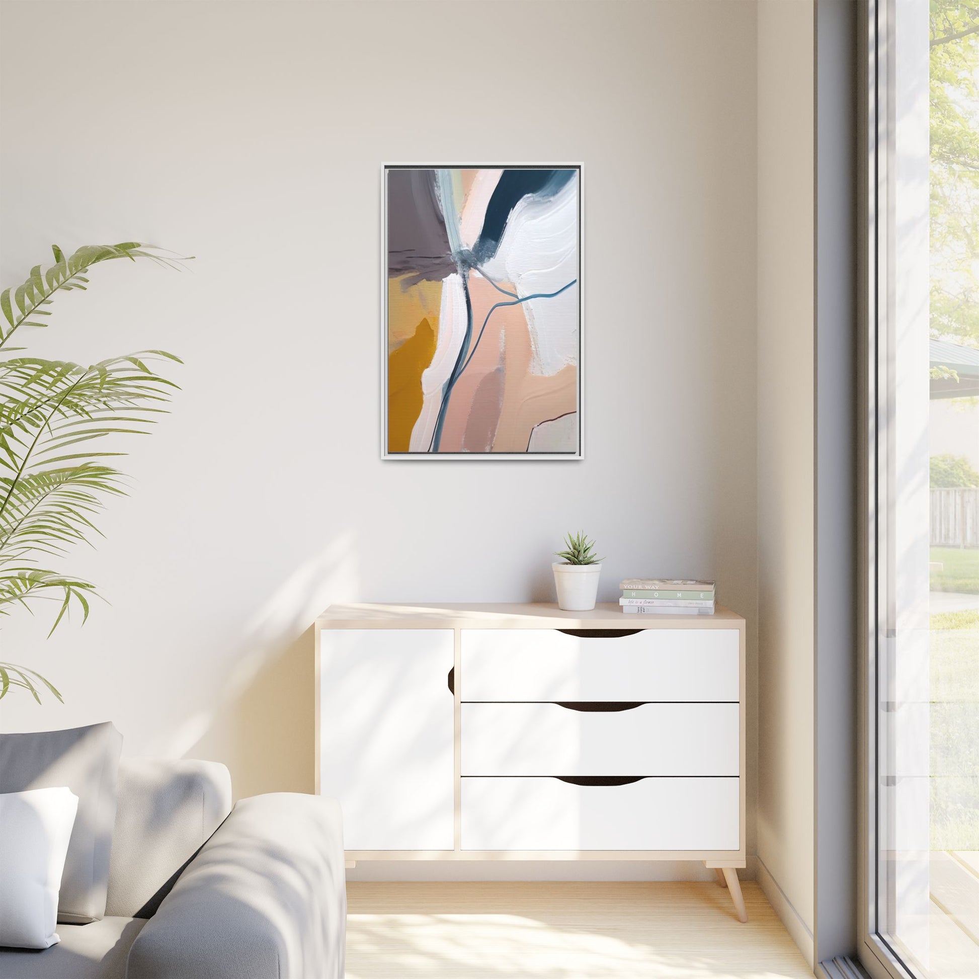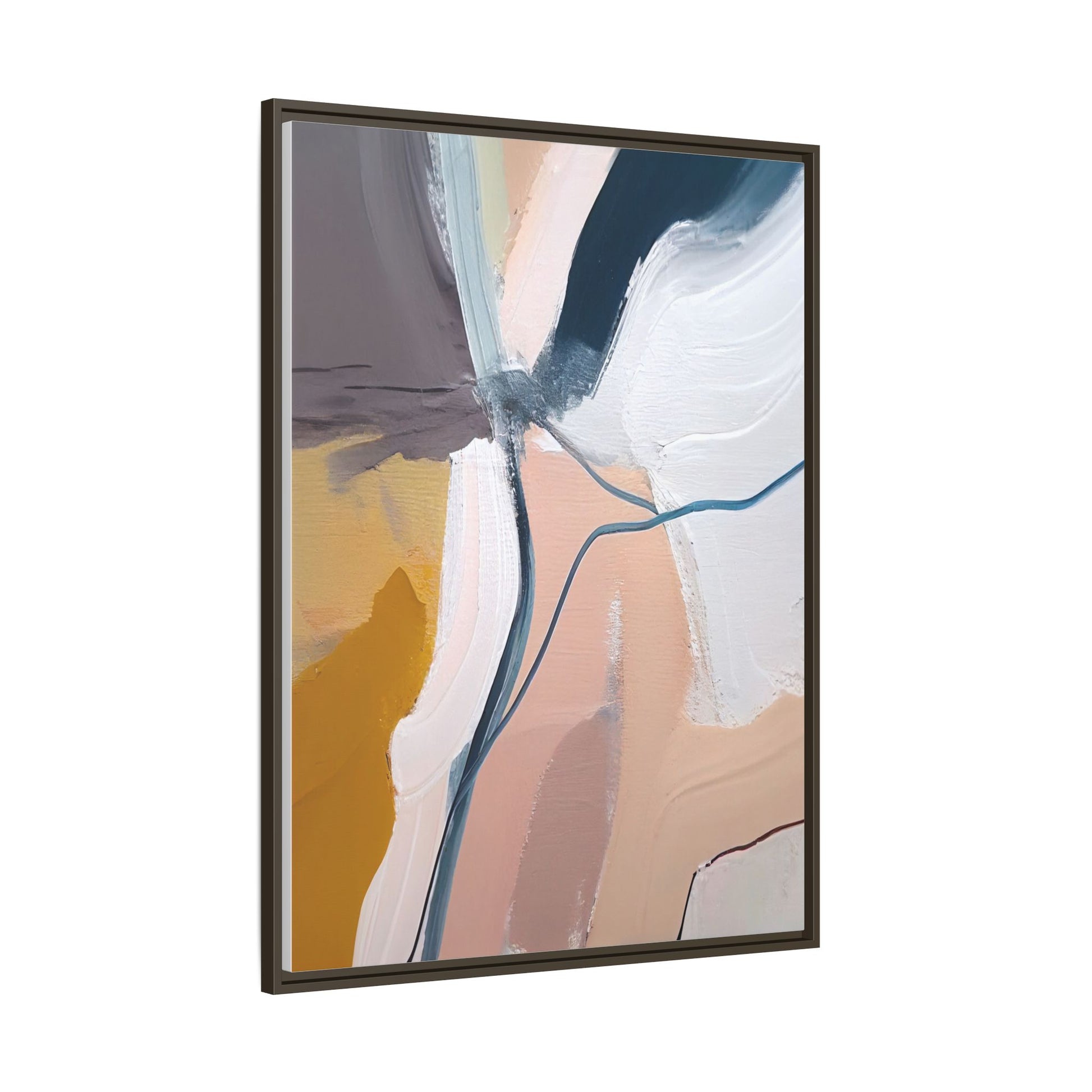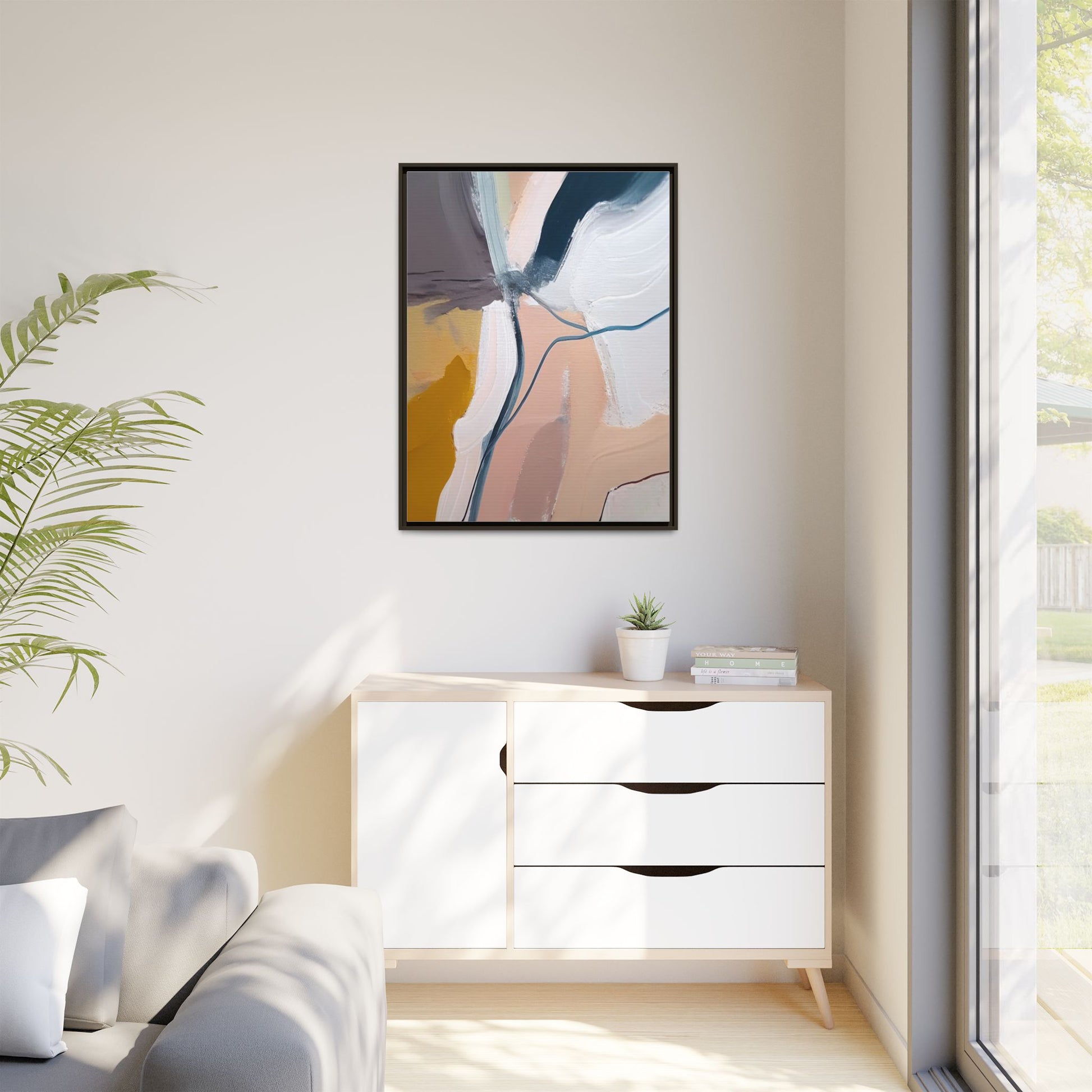 This abstract painting features a dynamic composition of fluid, sweeping brushstrokes in a soft, contemporary color palette. Shades of white, pale pink, deep blue, mustard yellow, and gray intertwine and flow across the canvas, creating a sense of movement and organic shapes. The central focus of the artwork is a converging point where multiple curved lines and color fields meet, suggesting a sense of connection and tension. Textured, layered paint techniques give the piece depth and visual interest, with each color bleeding and blending into the next in a harmonious yet energetic manner. The painting evokes a sense of natural landscapes or aerial views, while maintaining an elegant, minimalist aesthetic that would complement modern interior design styles.