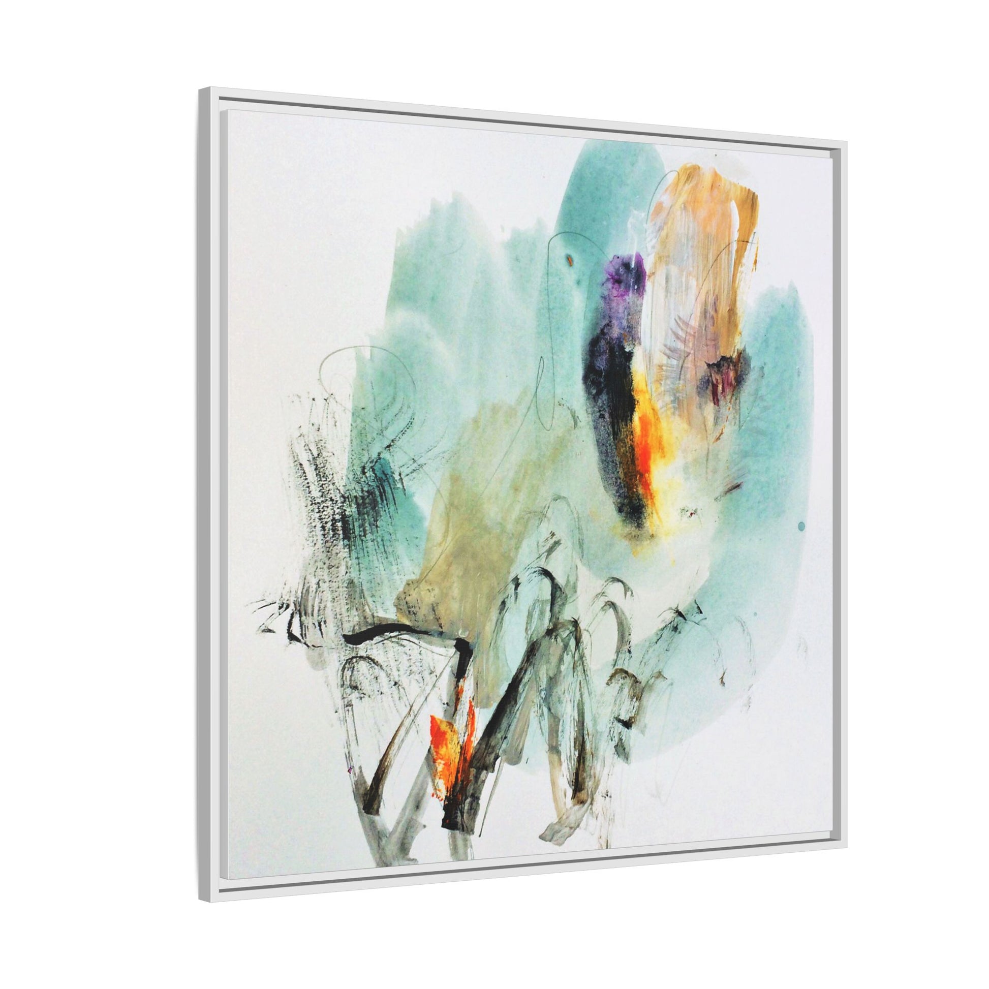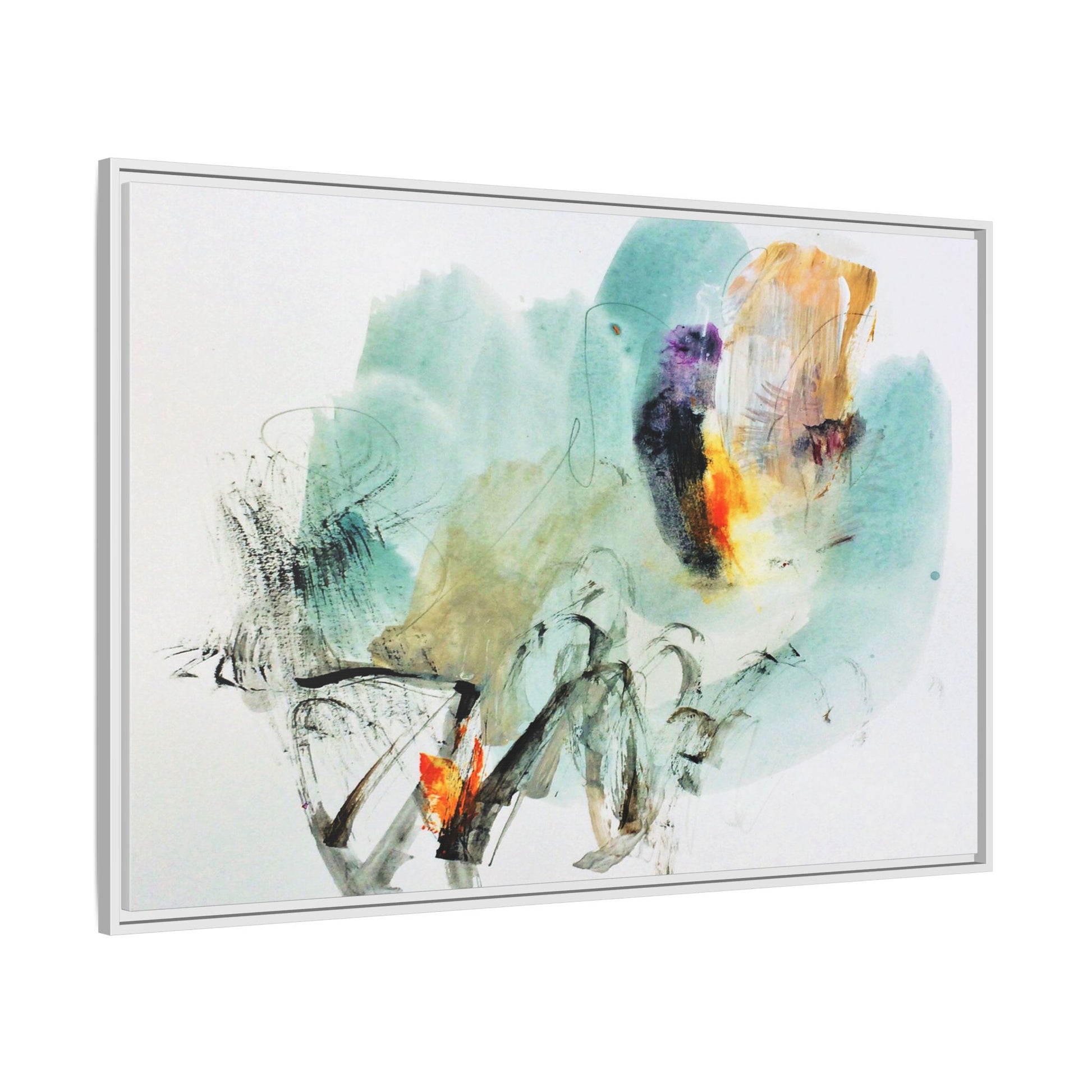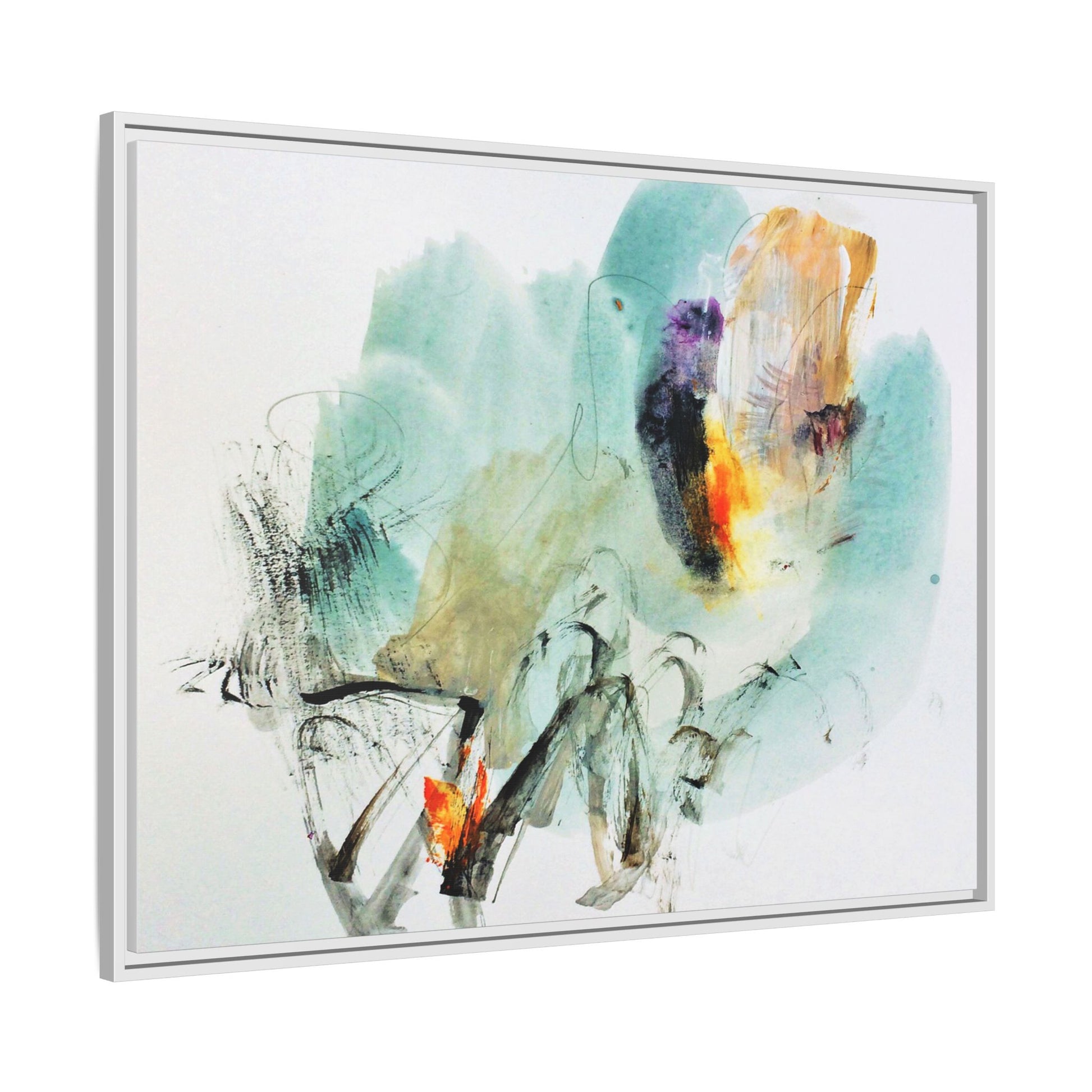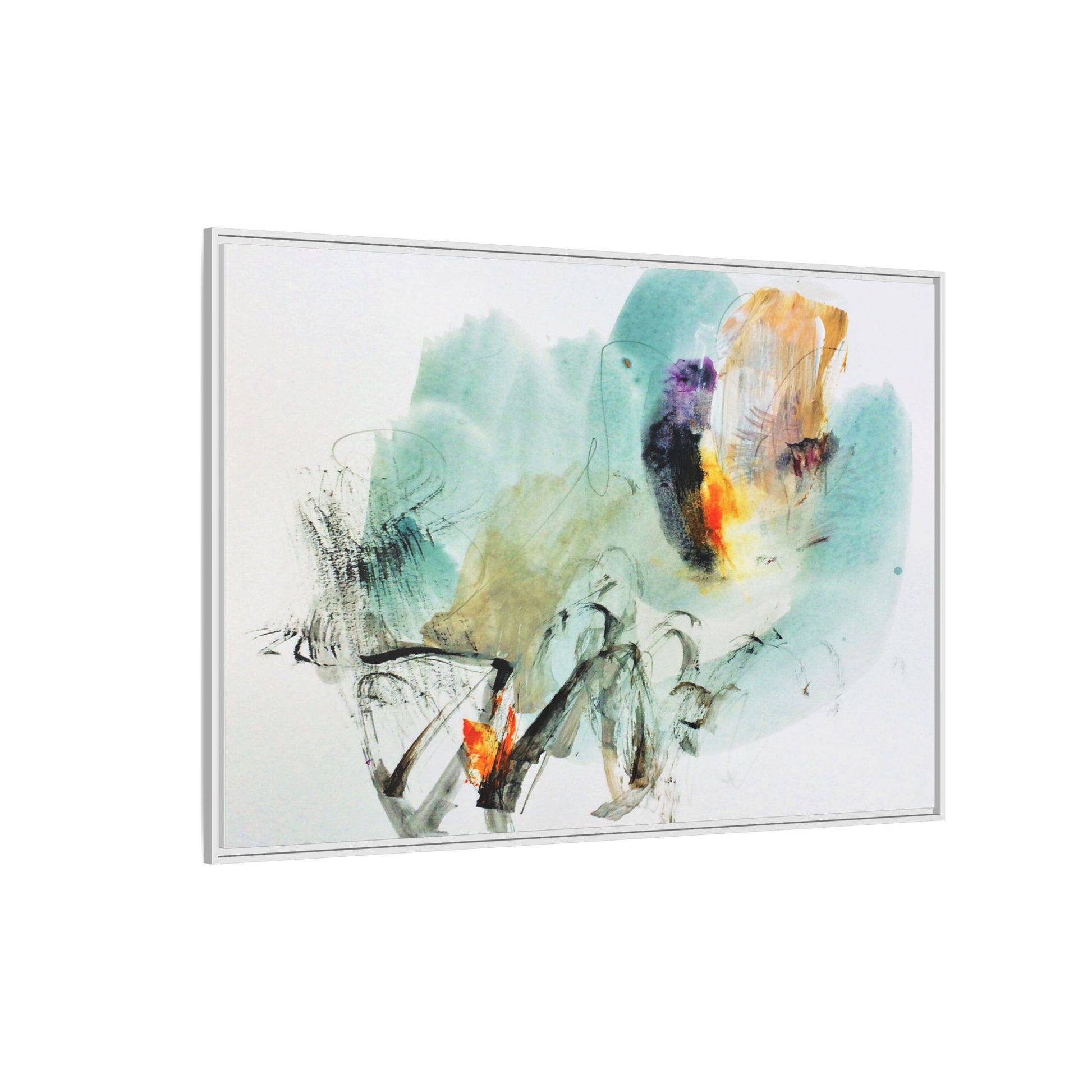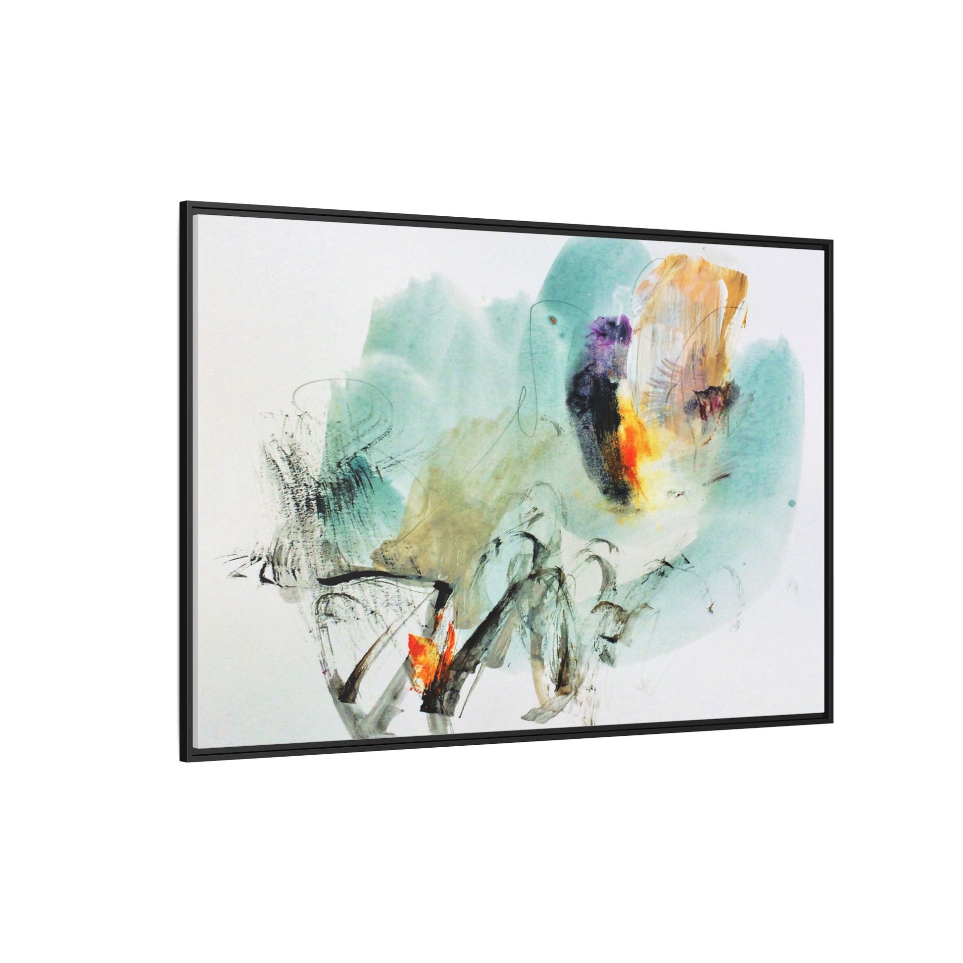 This captivating abstract watercolor painting features a dynamic composition of soft, ethereal teal and aquamarine backgrounds blended with muted yellows, oranges, and touches of purple. Fluid brushstrokes and organic shapes create a sense of movement and spontaneity, with gestural black and gray lines weaving throughout the image. Vibrant bursts of fiery orange and red punctuate the painting, providing striking contrast against the cool, watery color palette. The artwork appears to be created using a combination of watercolor, ink, and possibly other mixed media techniques, giving it a rich, layered texture. The painting evokes a sense of natural elements - perhaps suggesting landscapes, water, or atmospheric phenomena through its abstract, impressionistic style.