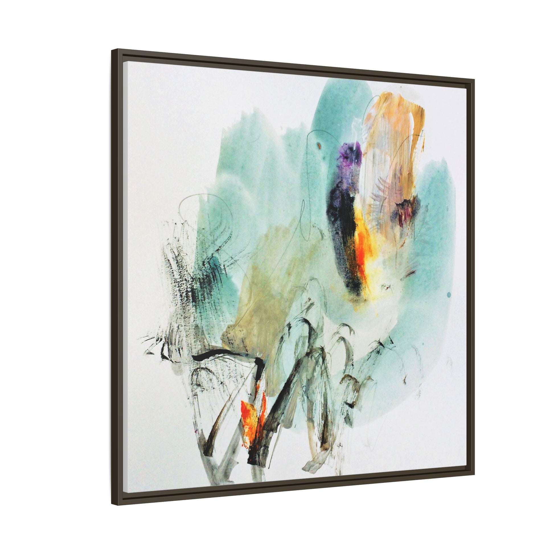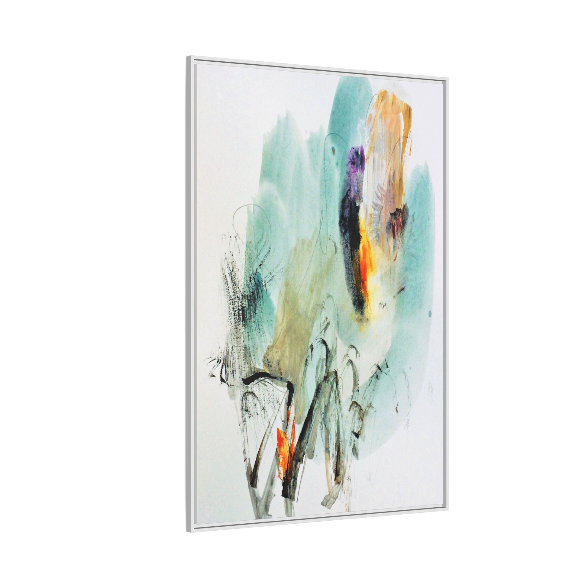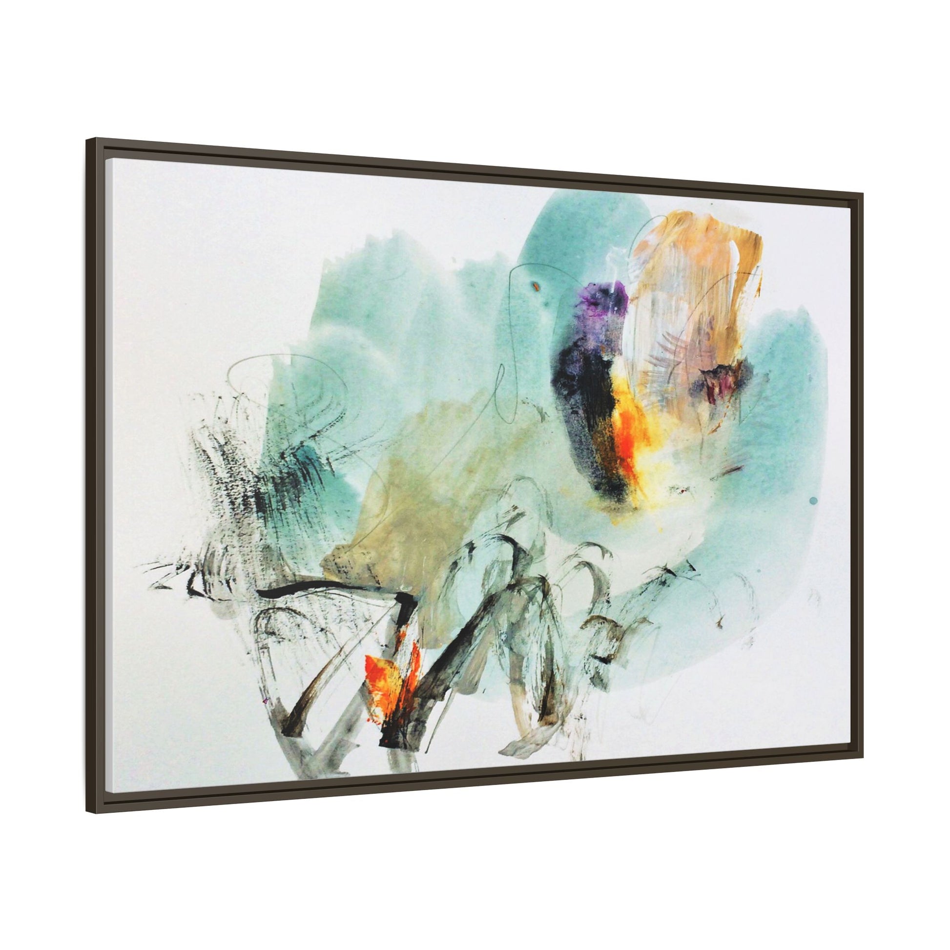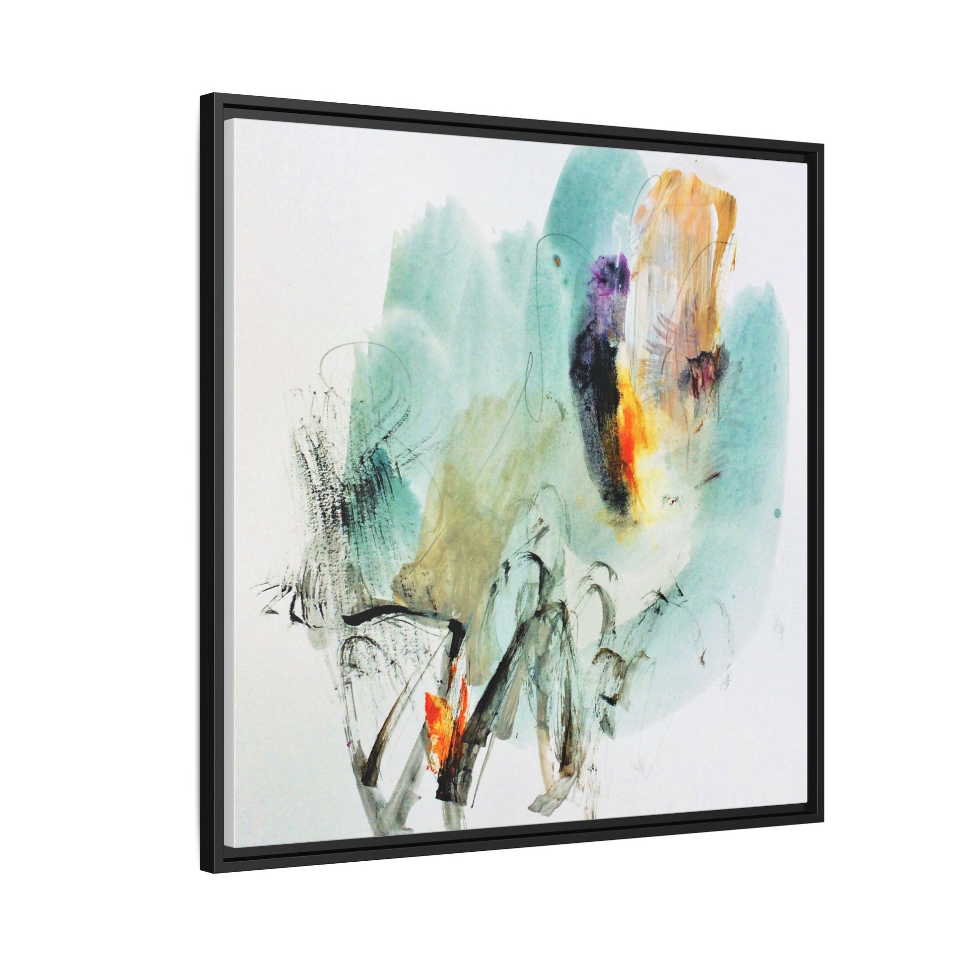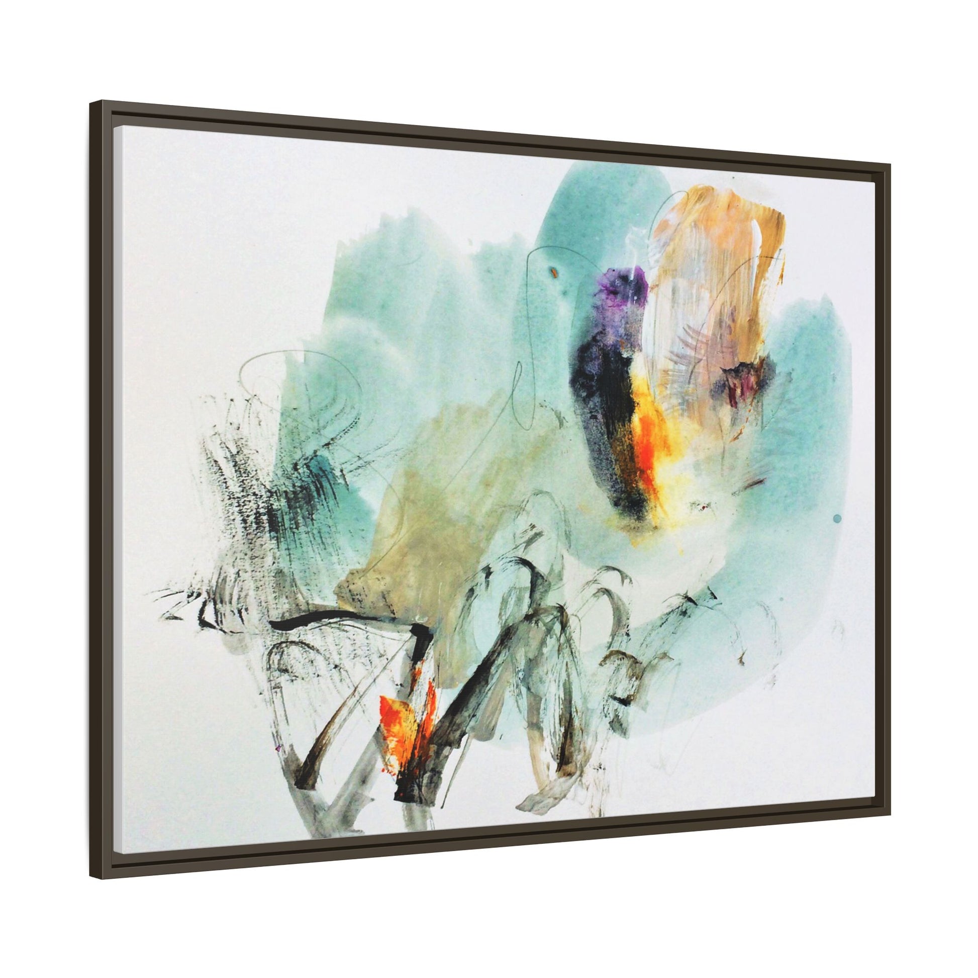 This captivating abstract watercolor painting features a dynamic composition of soft, ethereal teal and aquamarine backgrounds blended with muted yellows, oranges, and touches of purple. Fluid brushstrokes and organic shapes create a sense of movement and spontaneity, with gestural black and gray lines weaving throughout the image. Vibrant bursts of fiery orange and red punctuate the painting, providing striking contrast against the cool, watery color palette. The artwork appears to be created using a combination of watercolor, ink, and possibly other mixed media techniques, giving it a rich, layered texture. The painting evokes a sense of natural elements - perhaps suggesting landscapes, water, or atmospheric phenomena through its abstract, impressionistic style.