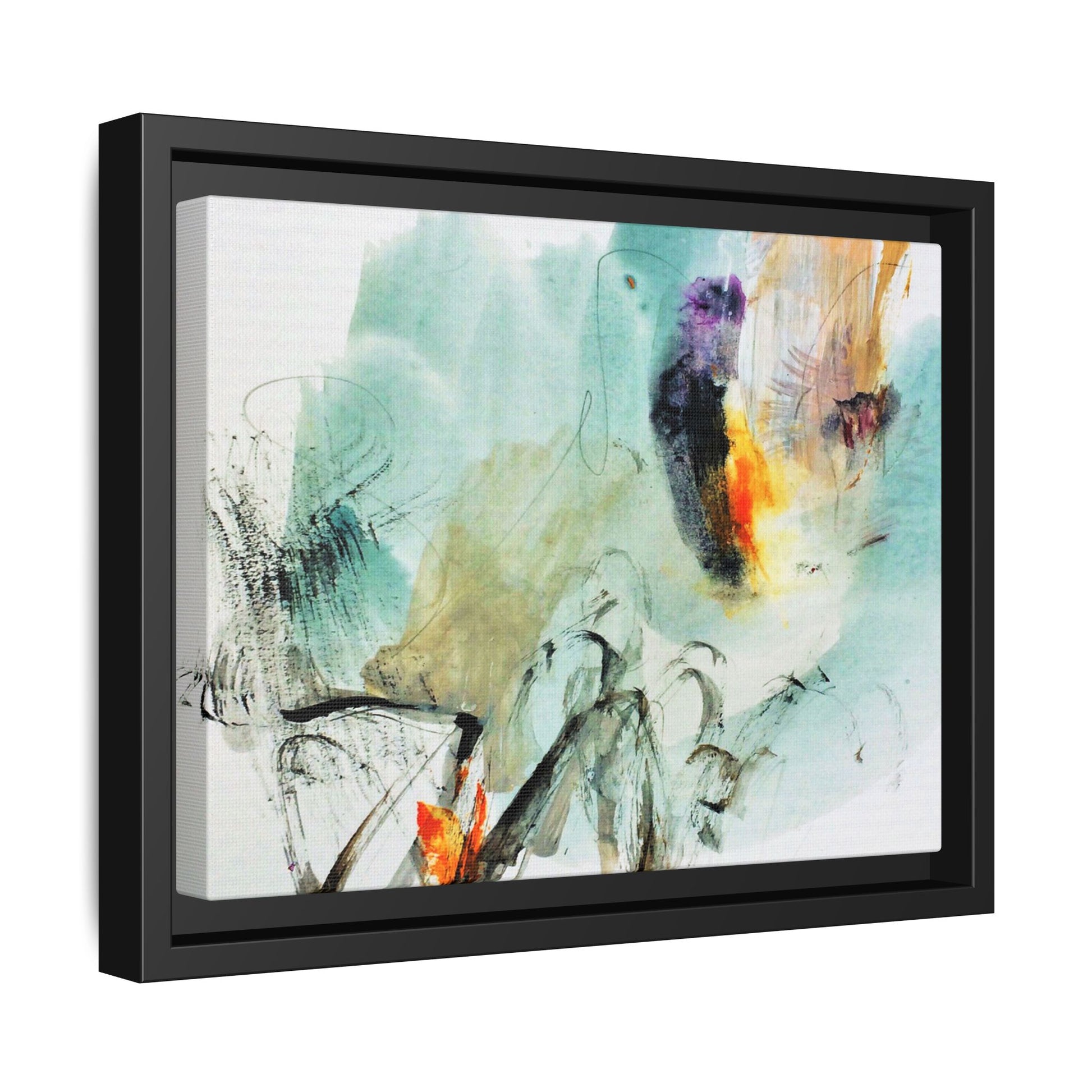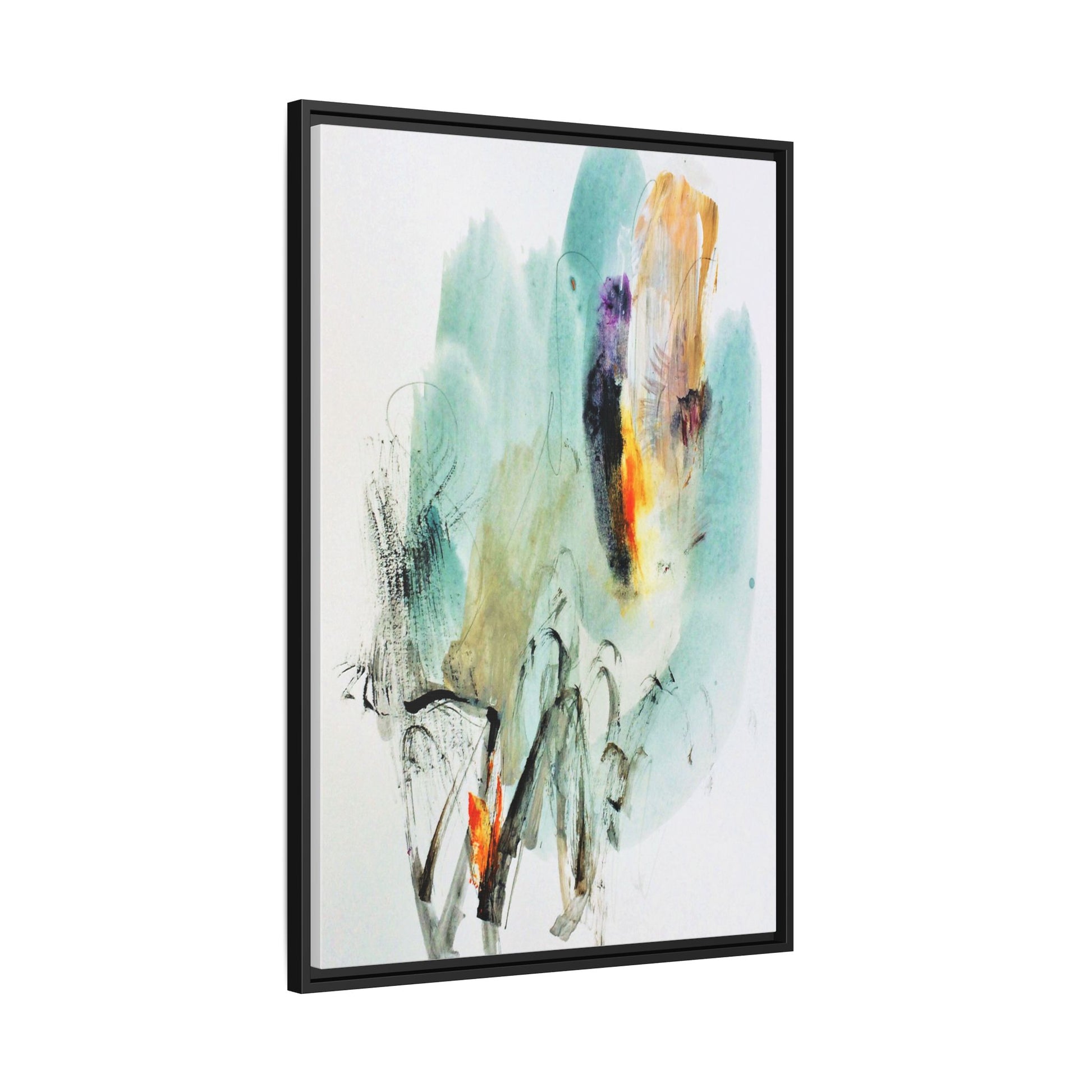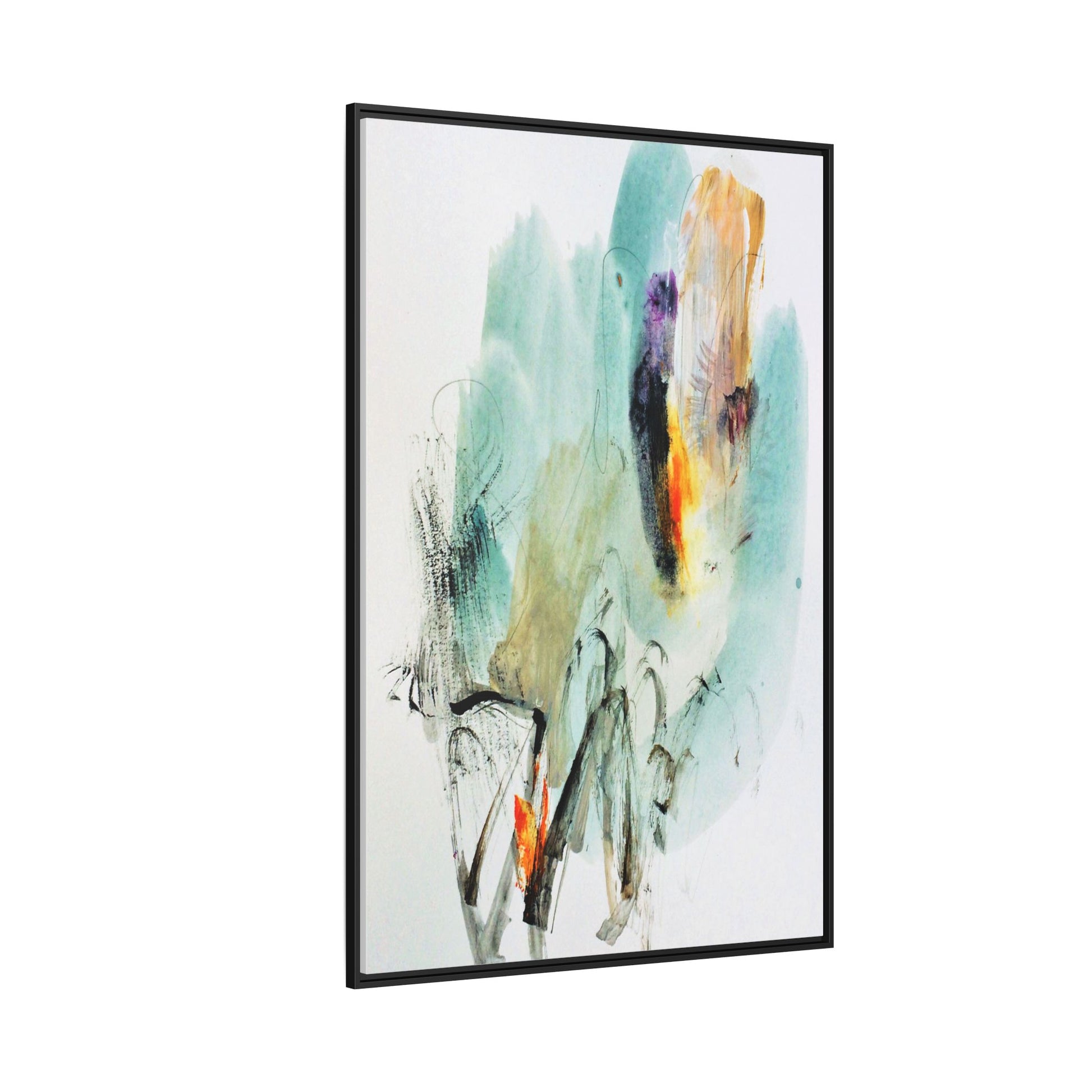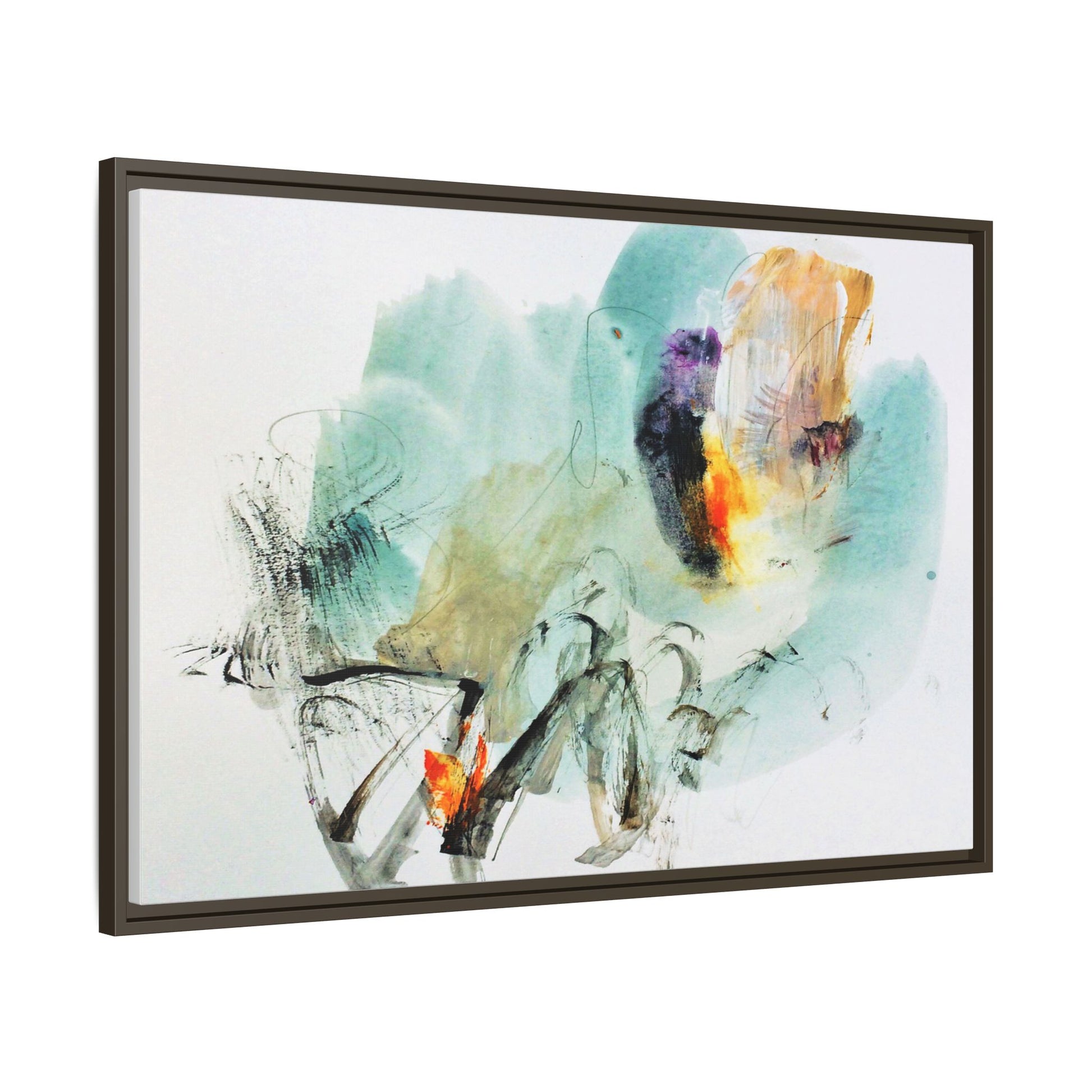 This captivating abstract watercolor painting features a dynamic composition of soft, ethereal teal and aquamarine backgrounds blended with muted yellows, oranges, and touches of purple. Fluid brushstrokes and organic shapes create a sense of movement and spontaneity, with gestural black and gray lines weaving throughout the image. Vibrant bursts of fiery orange and red punctuate the painting, providing striking contrast against the cool, watery color palette. The artwork appears to be created using a combination of watercolor, ink, and possibly other mixed media techniques, giving it a rich, layered texture. The painting evokes a sense of natural elements - perhaps suggesting landscapes, water, or atmospheric phenomena through its abstract, impressionistic style.