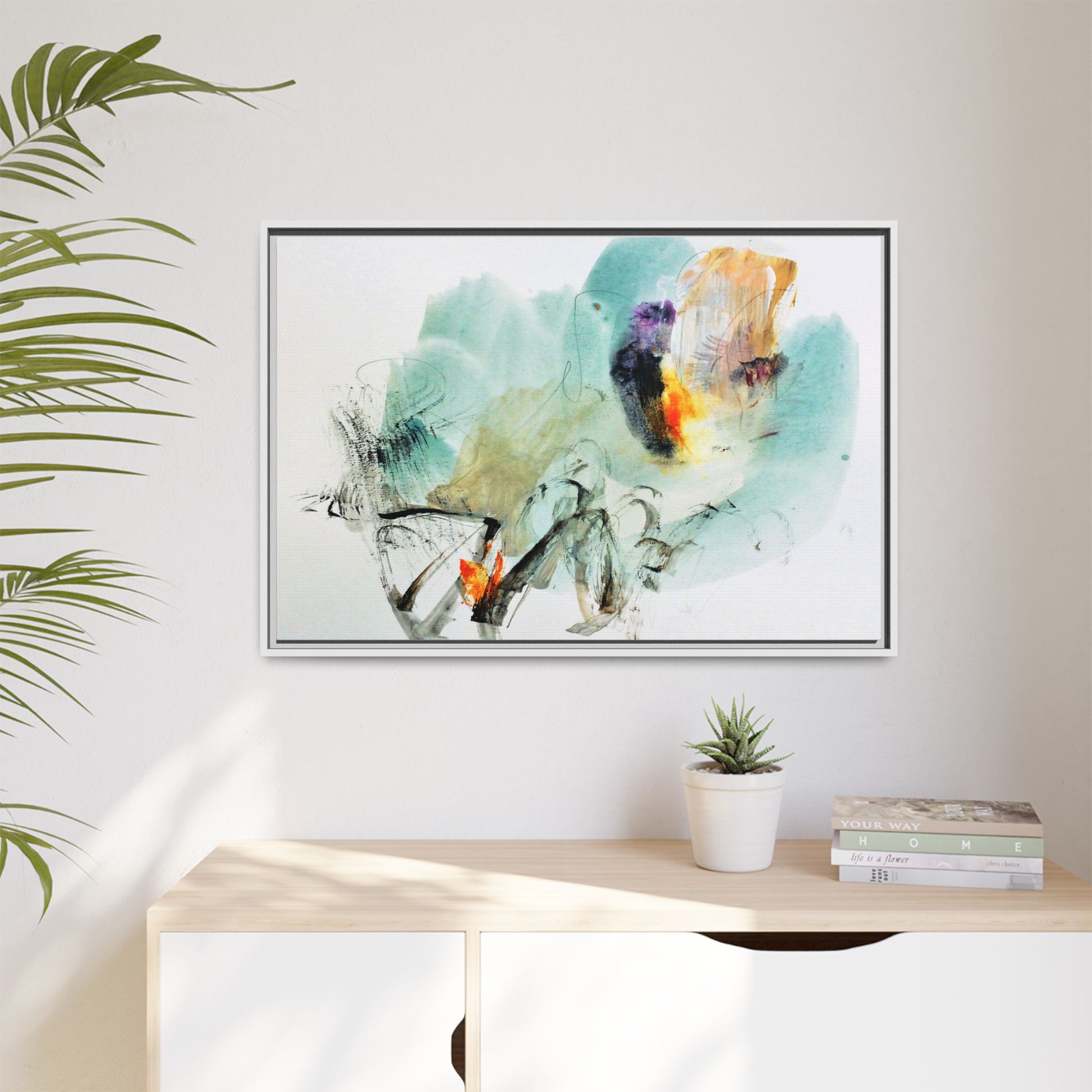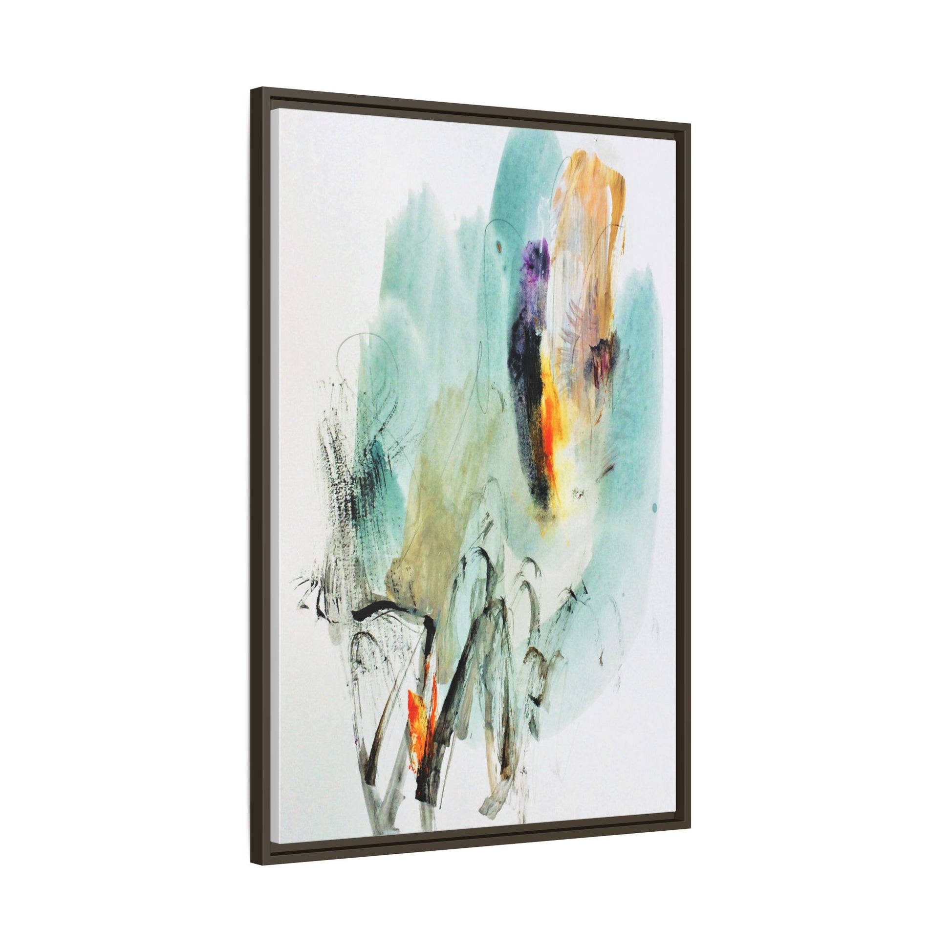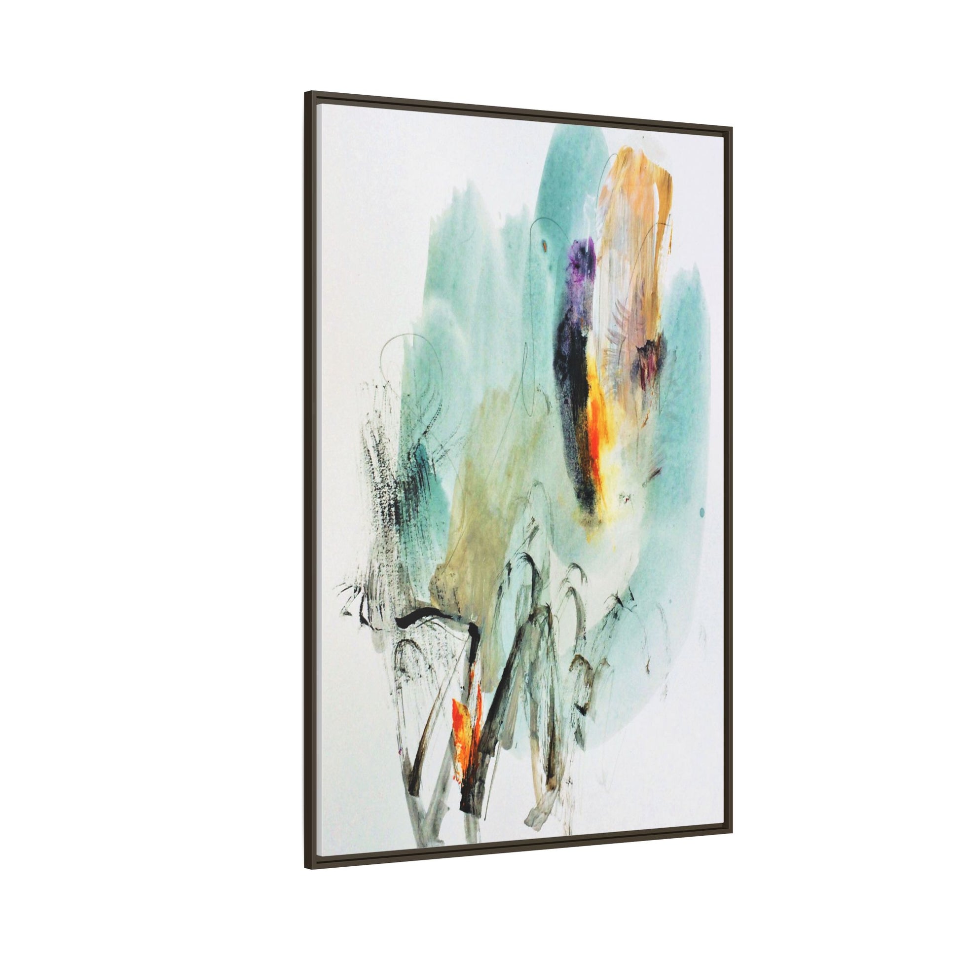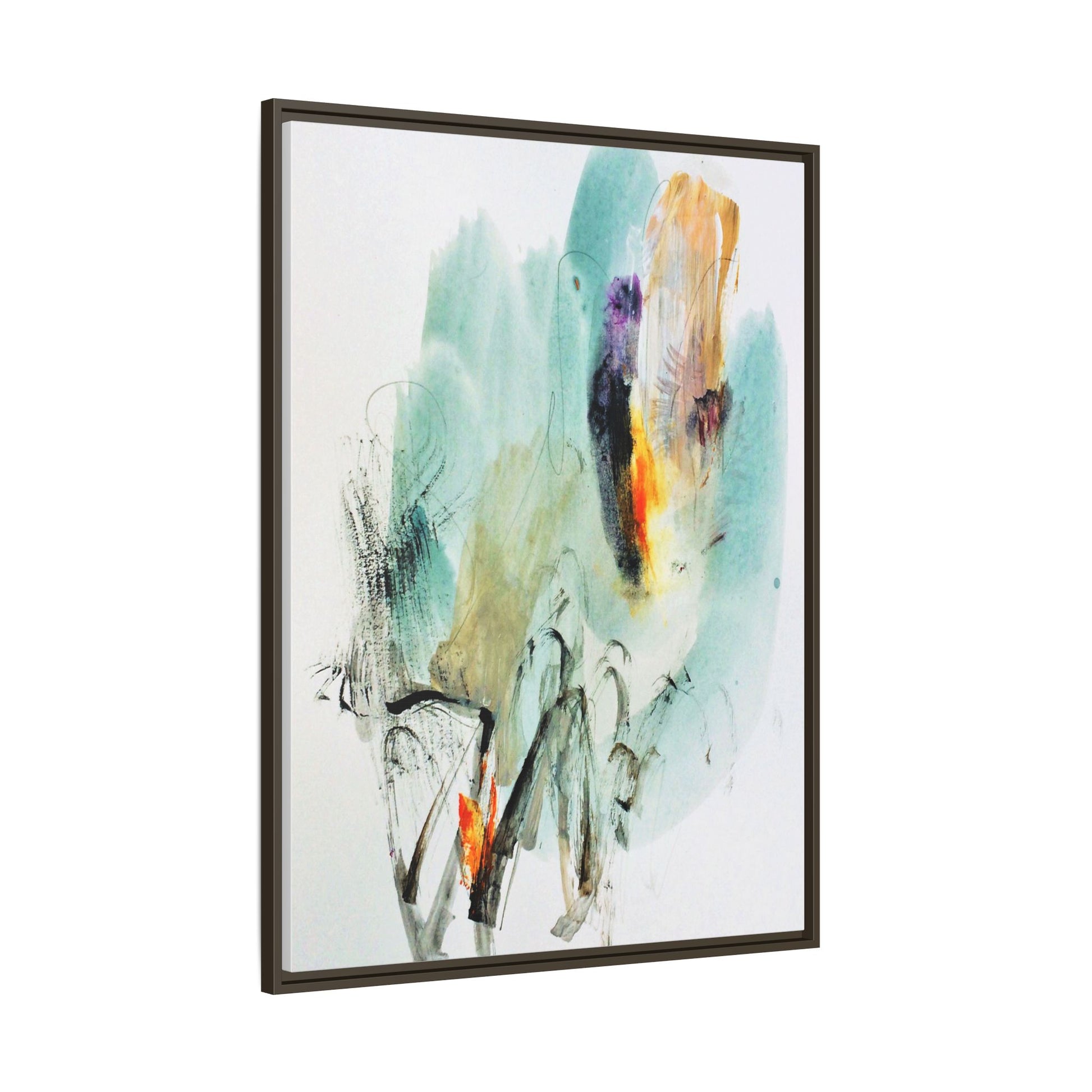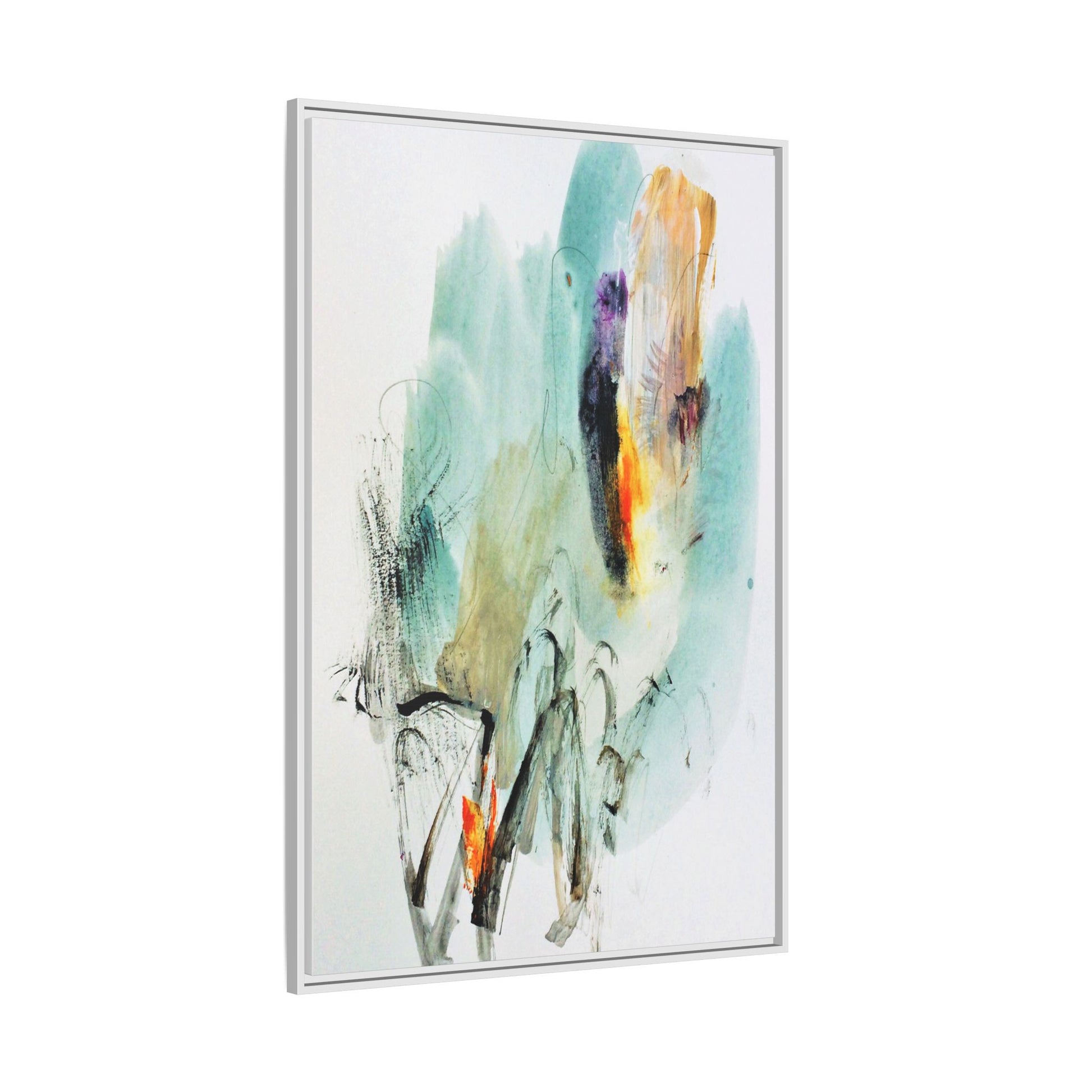 This captivating abstract watercolor painting features a dynamic composition of soft, ethereal teal and aquamarine backgrounds blended with muted yellows, oranges, and touches of purple. Fluid brushstrokes and organic shapes create a sense of movement and spontaneity, with gestural black and gray lines weaving throughout the image. Vibrant bursts of fiery orange and red punctuate the painting, providing striking contrast against the cool, watery color palette. The artwork appears to be created using a combination of watercolor, ink, and possibly other mixed media techniques, giving it a rich, layered texture. The painting evokes a sense of natural elements - perhaps suggesting landscapes, water, or atmospheric phenomena through its abstract, impressionistic style.