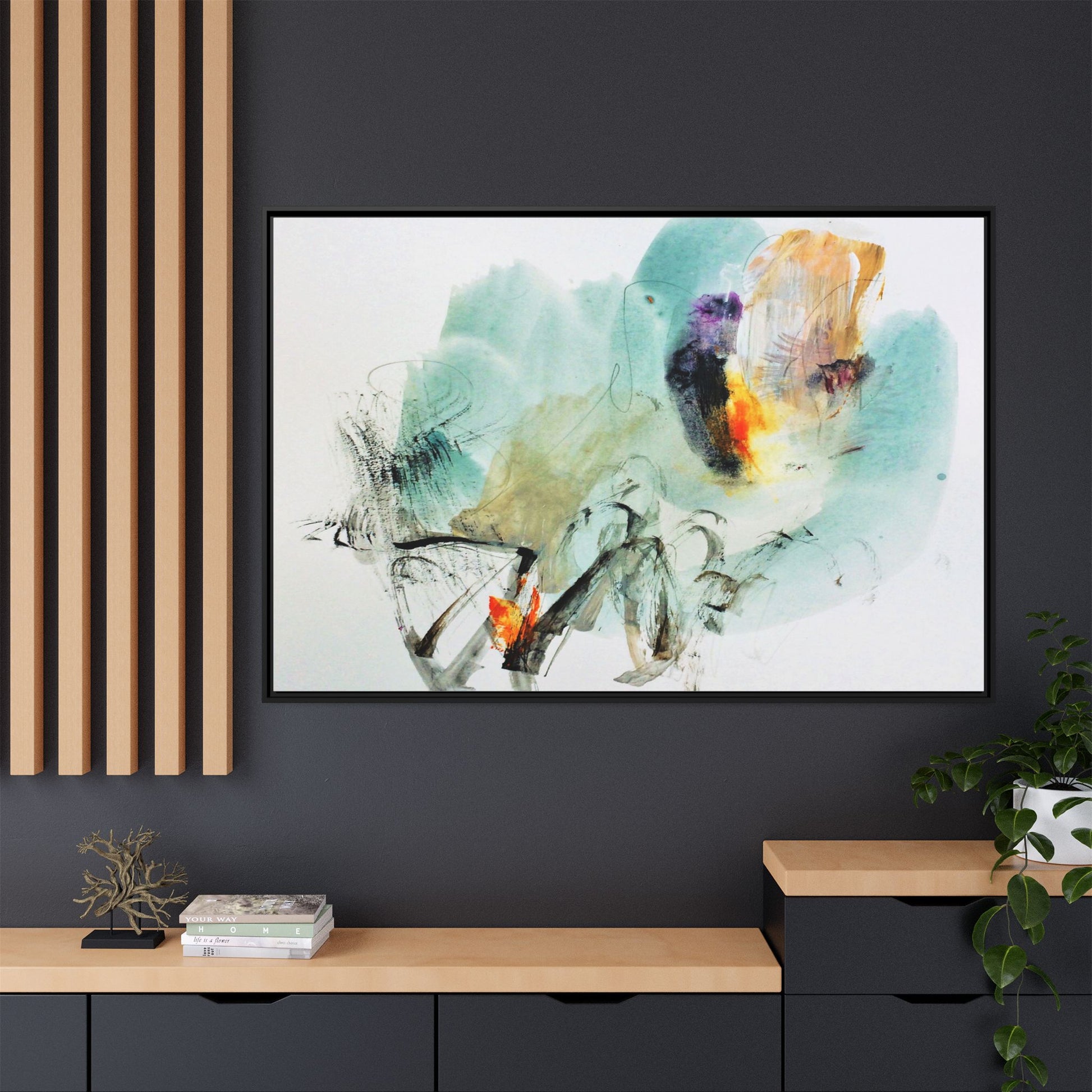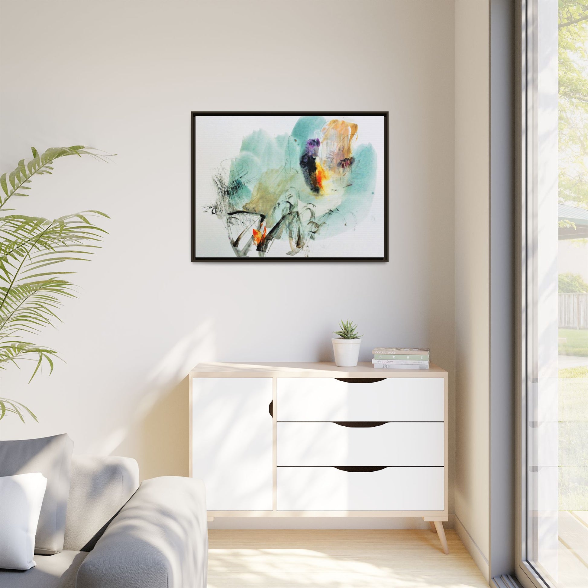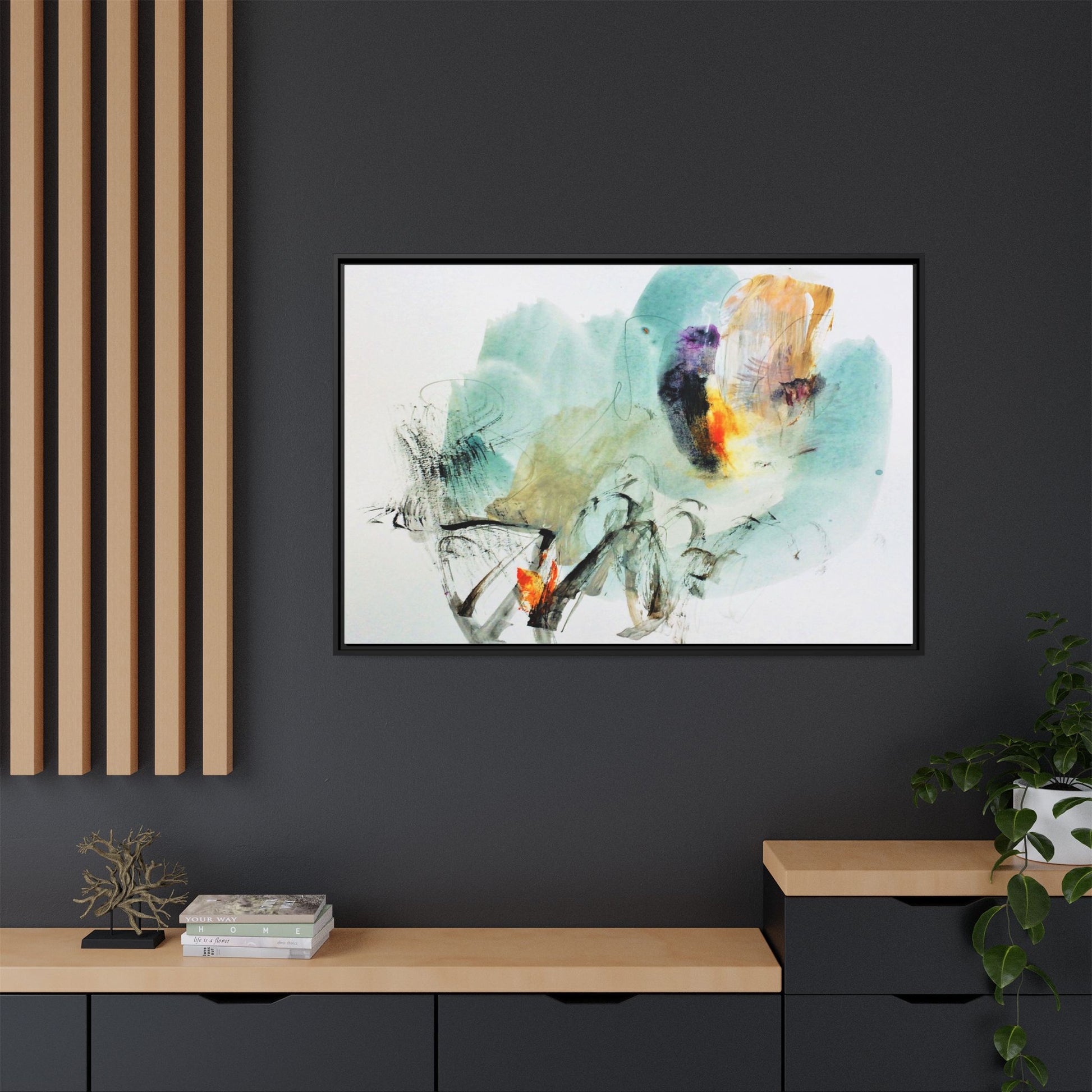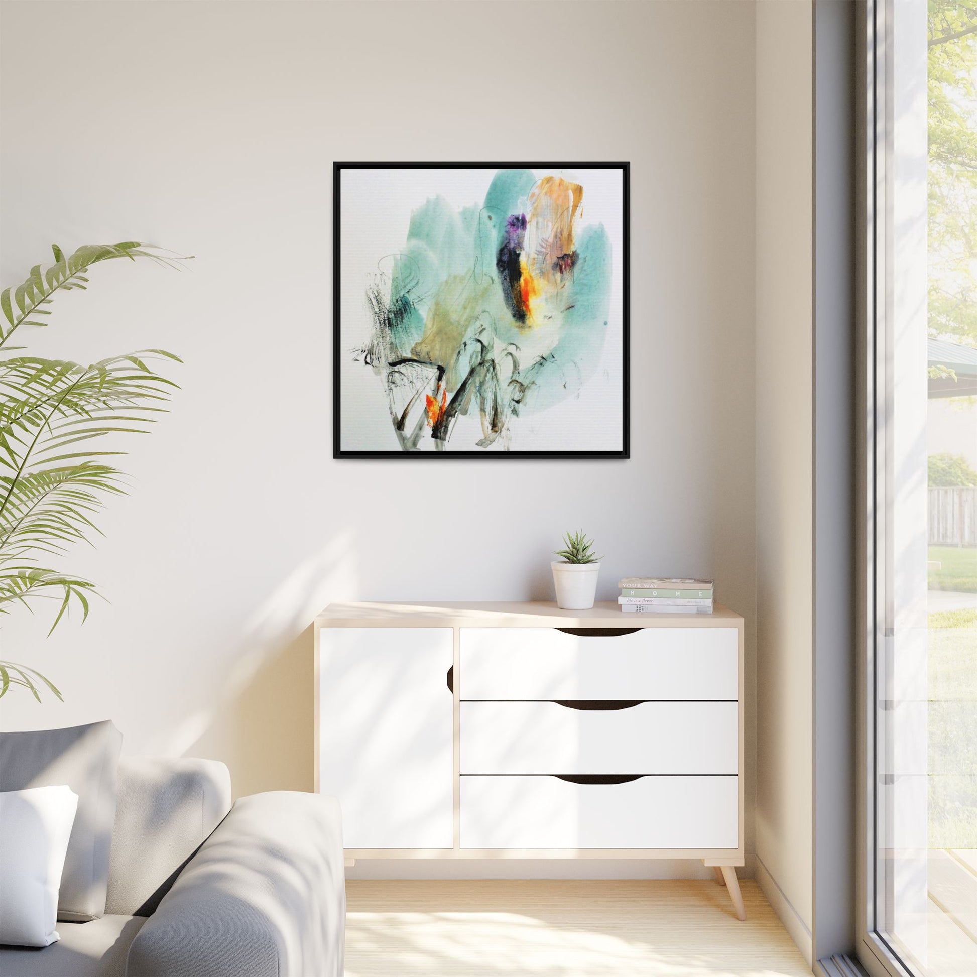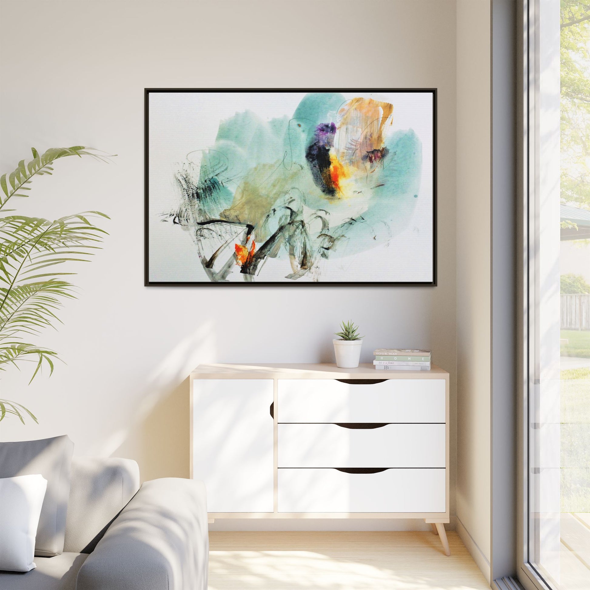 This captivating abstract watercolor painting features a dynamic composition of soft, ethereal teal and aquamarine backgrounds blended with muted yellows, oranges, and touches of purple. Fluid brushstrokes and organic shapes create a sense of movement and spontaneity, with gestural black and gray lines weaving throughout the image. Vibrant bursts of fiery orange and red punctuate the painting, providing striking contrast against the cool, watery color palette. The artwork appears to be created using a combination of watercolor, ink, and possibly other mixed media techniques, giving it a rich, layered texture. The painting evokes a sense of natural elements - perhaps suggesting landscapes, water, or atmospheric phenomena through its abstract, impressionistic style.