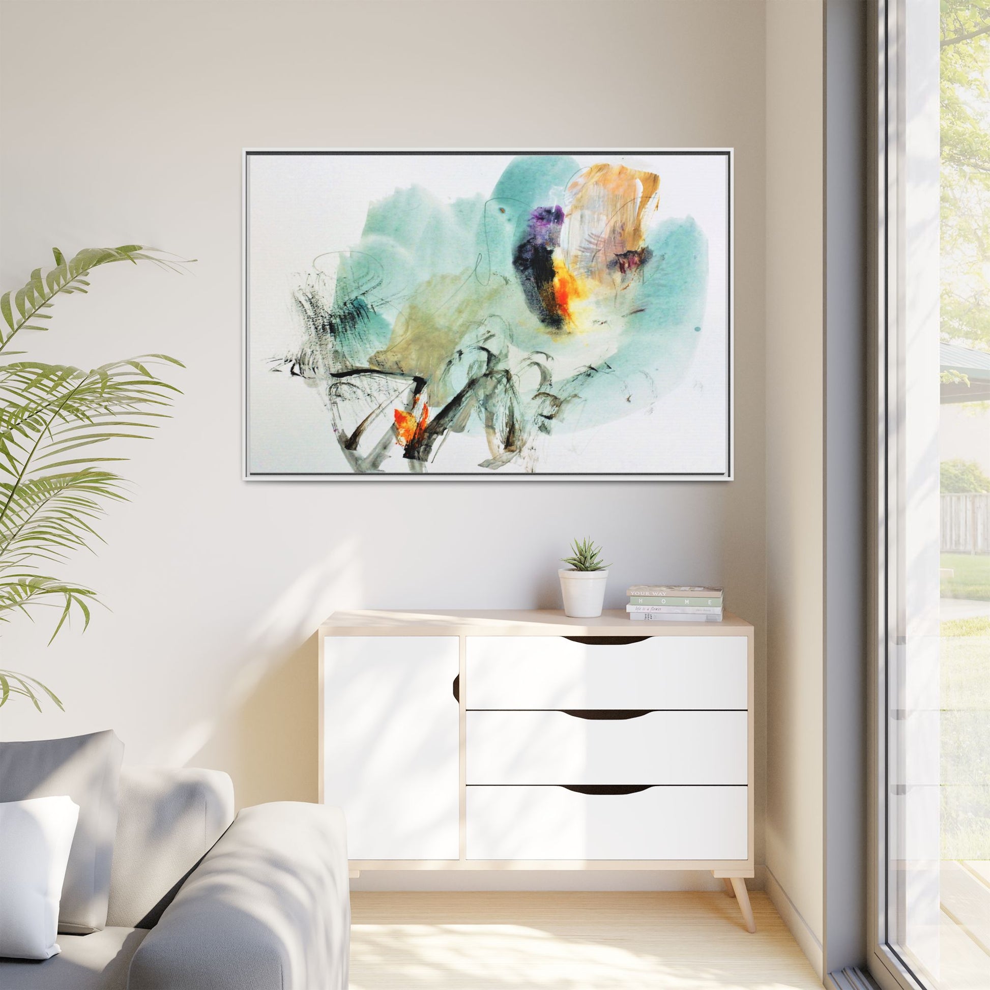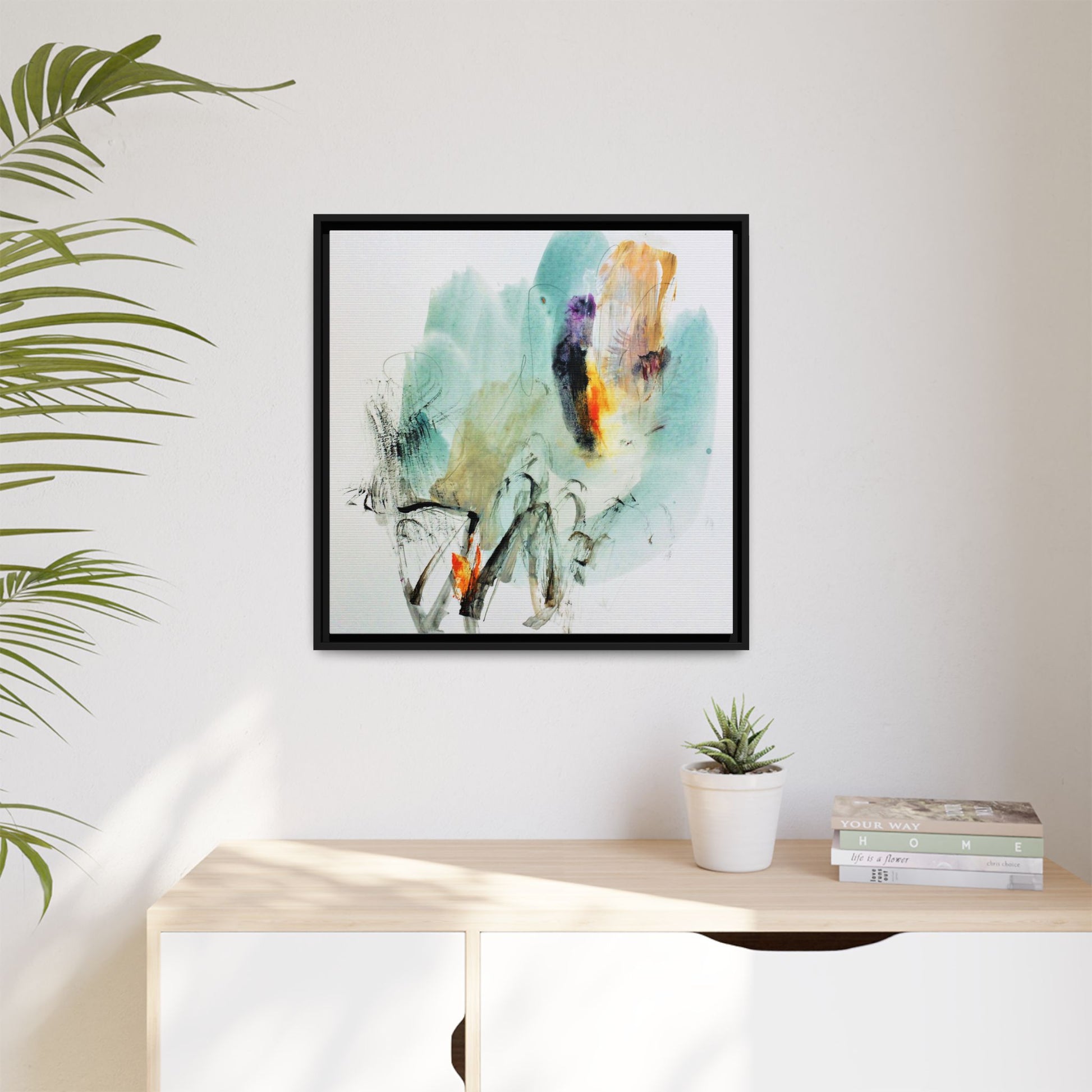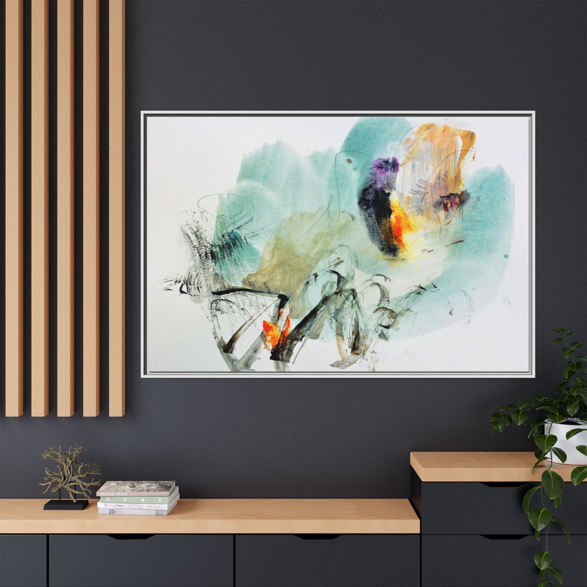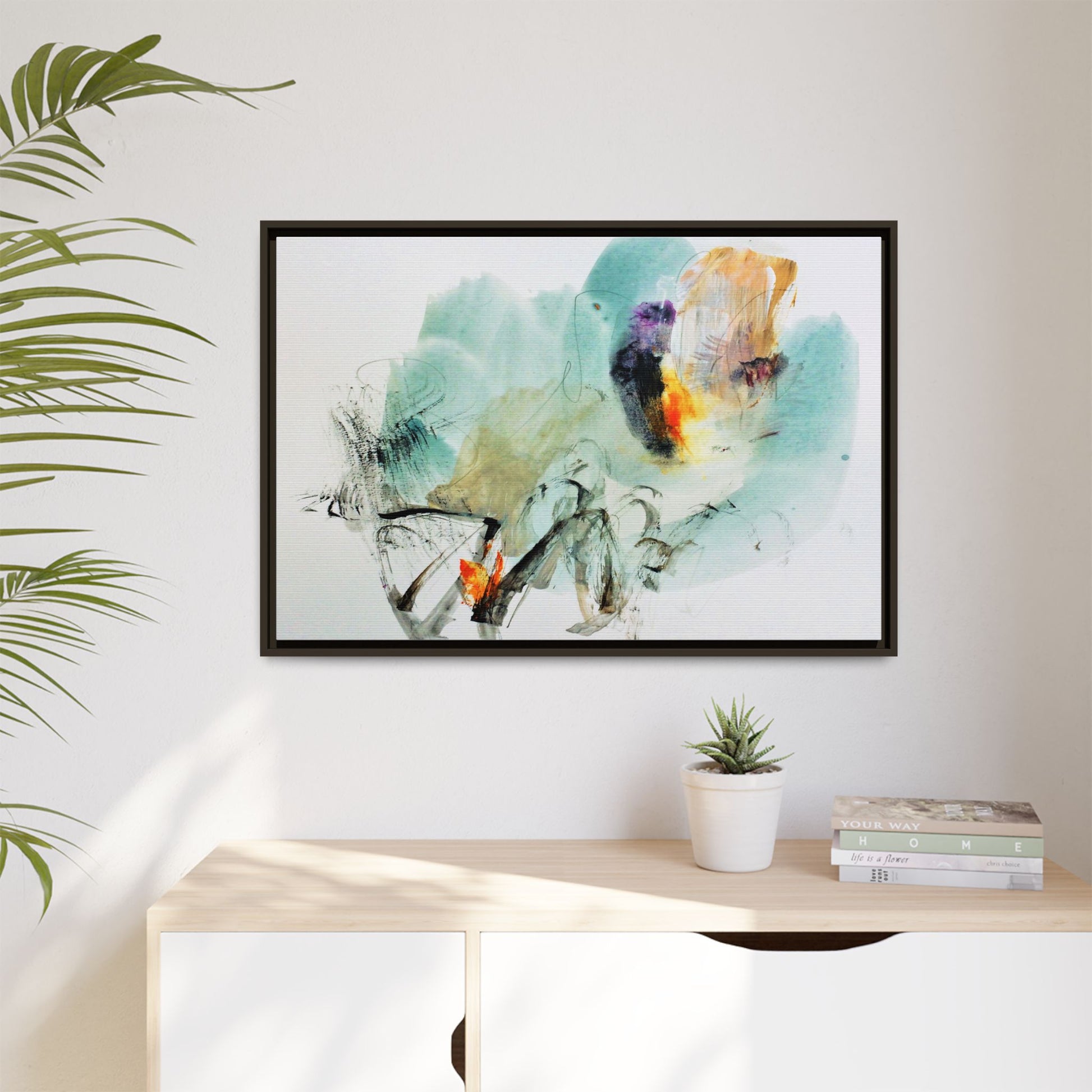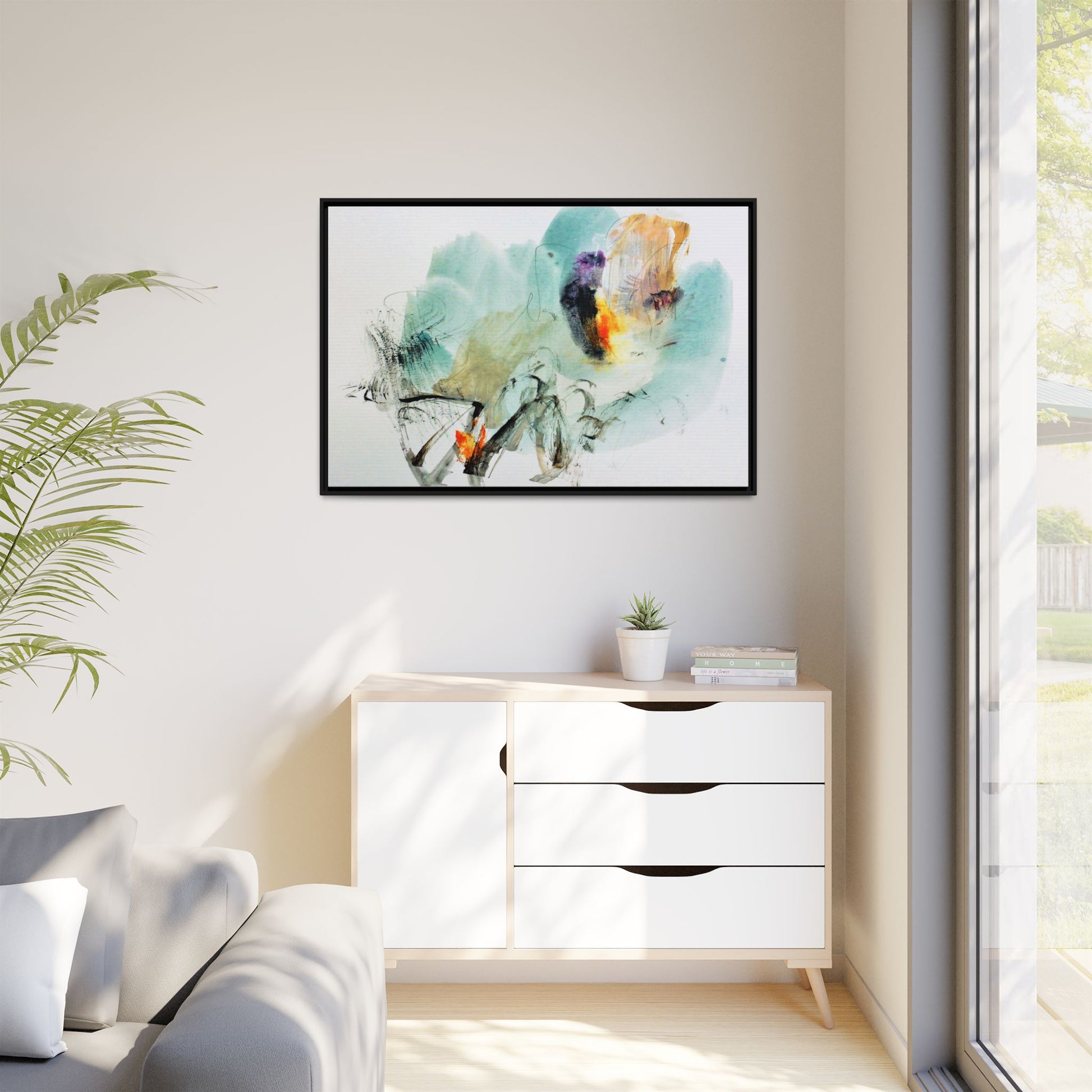 This captivating abstract watercolor painting features a dynamic composition of soft, ethereal teal and aquamarine backgrounds blended with muted yellows, oranges, and touches of purple. Fluid brushstrokes and organic shapes create a sense of movement and spontaneity, with gestural black and gray lines weaving throughout the image. Vibrant bursts of fiery orange and red punctuate the painting, providing striking contrast against the cool, watery color palette. The artwork appears to be created using a combination of watercolor, ink, and possibly other mixed media techniques, giving it a rich, layered texture. The painting evokes a sense of natural elements - perhaps suggesting landscapes, water, or atmospheric phenomena through its abstract, impressionistic style.