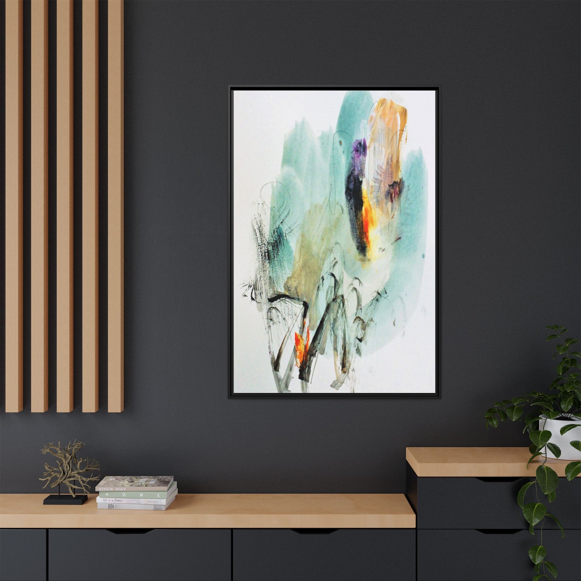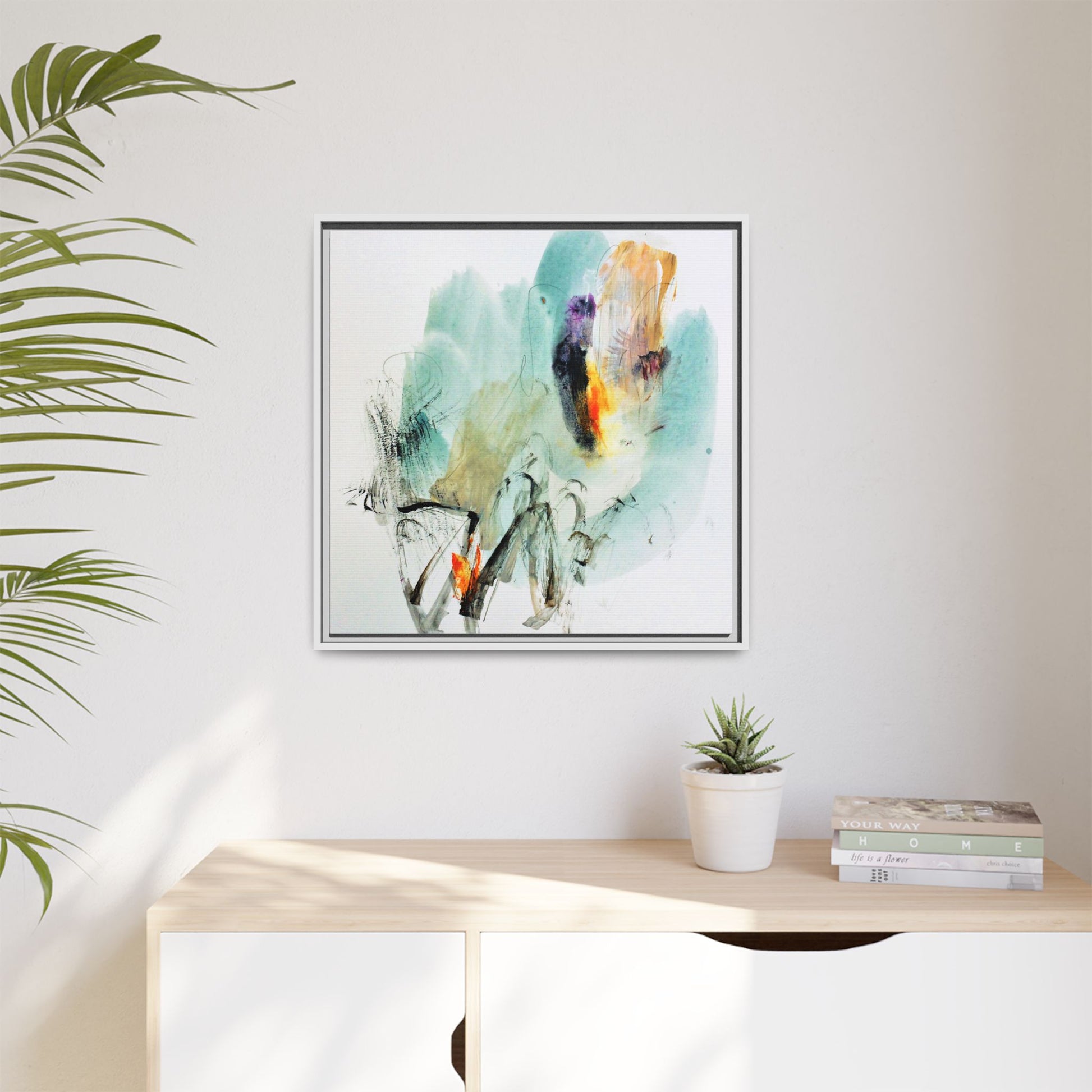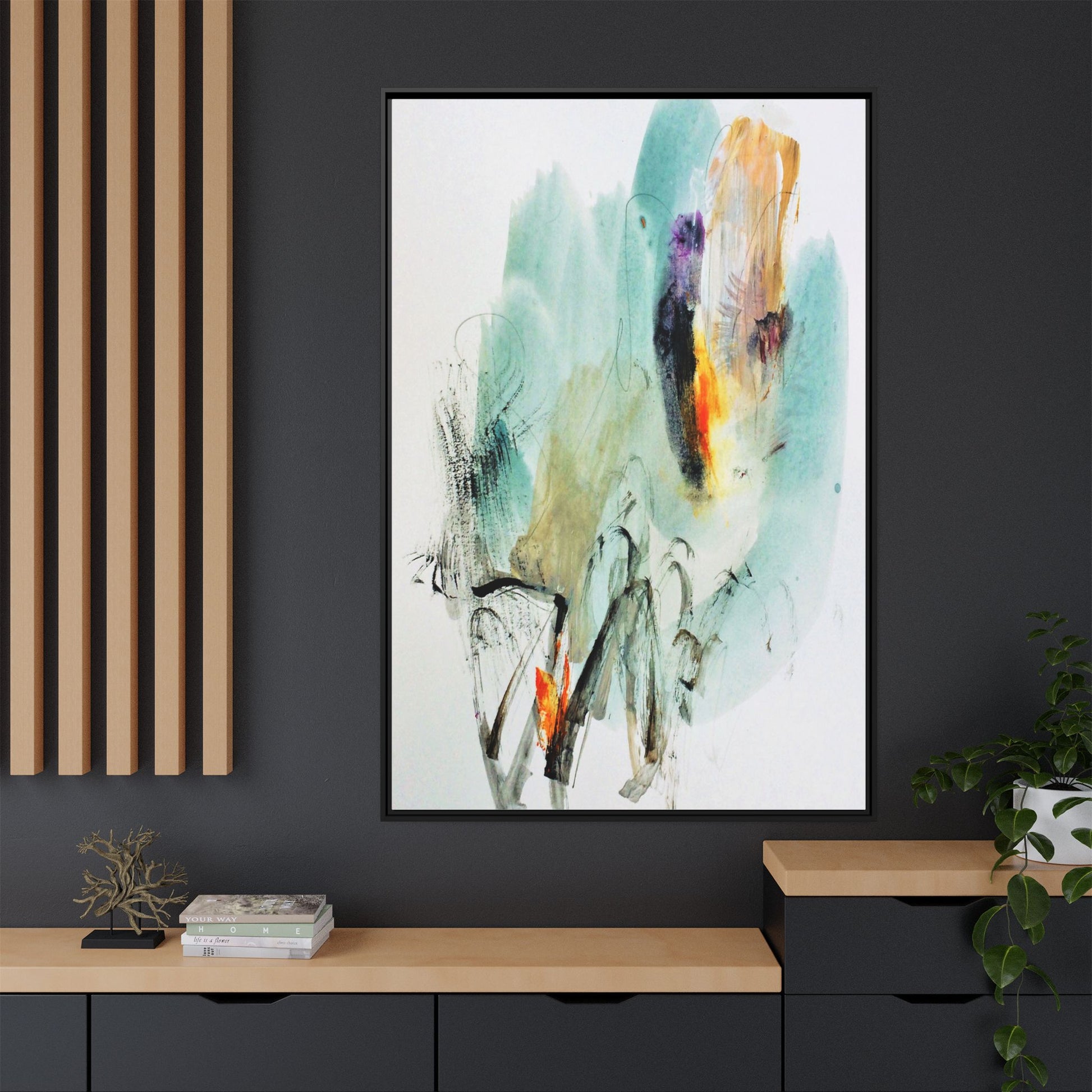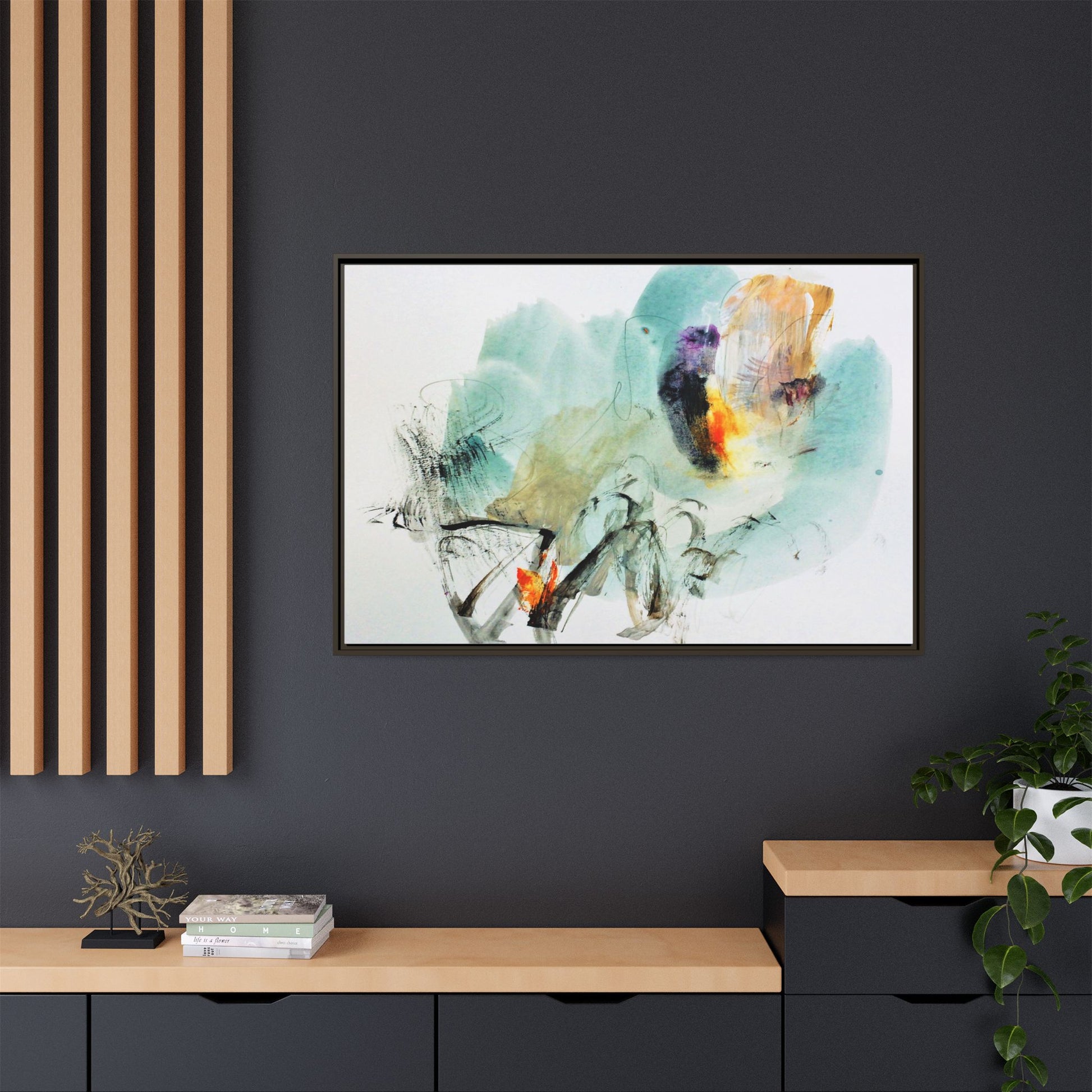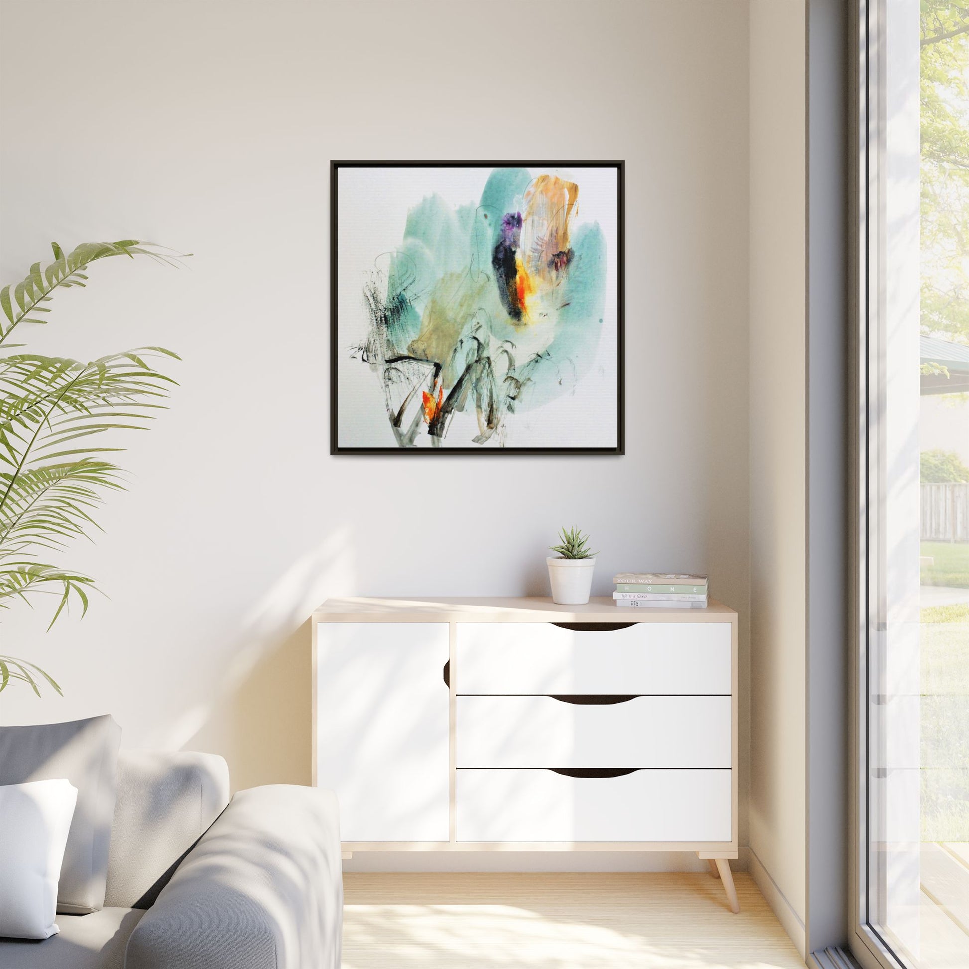 This captivating abstract watercolor painting features a dynamic composition of soft, ethereal teal and aquamarine backgrounds blended with muted yellows, oranges, and touches of purple. Fluid brushstrokes and organic shapes create a sense of movement and spontaneity, with gestural black and gray lines weaving throughout the image. Vibrant bursts of fiery orange and red punctuate the painting, providing striking contrast against the cool, watery color palette. The artwork appears to be created using a combination of watercolor, ink, and possibly other mixed media techniques, giving it a rich, layered texture. The painting evokes a sense of natural elements - perhaps suggesting landscapes, water, or atmospheric phenomena through its abstract, impressionistic style.