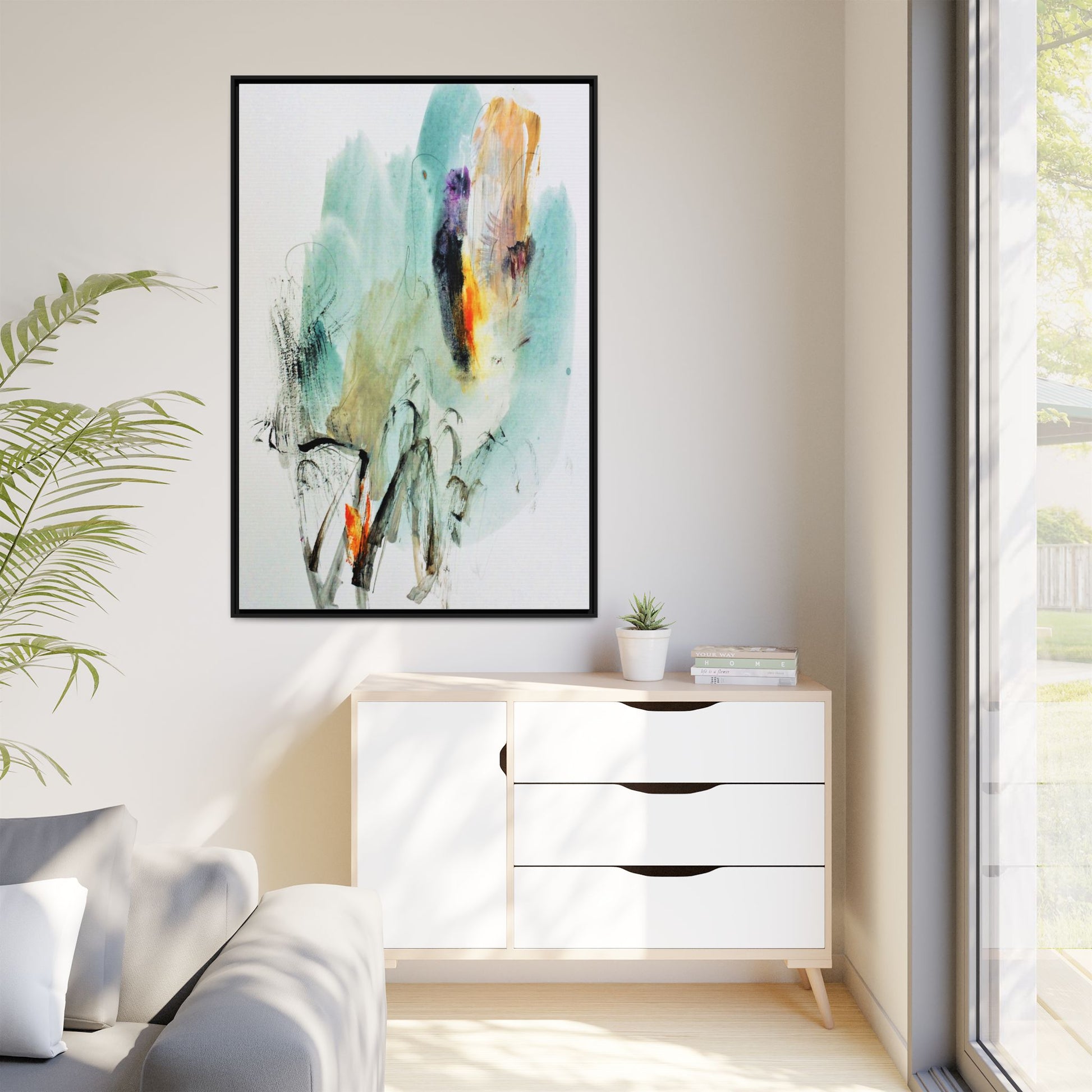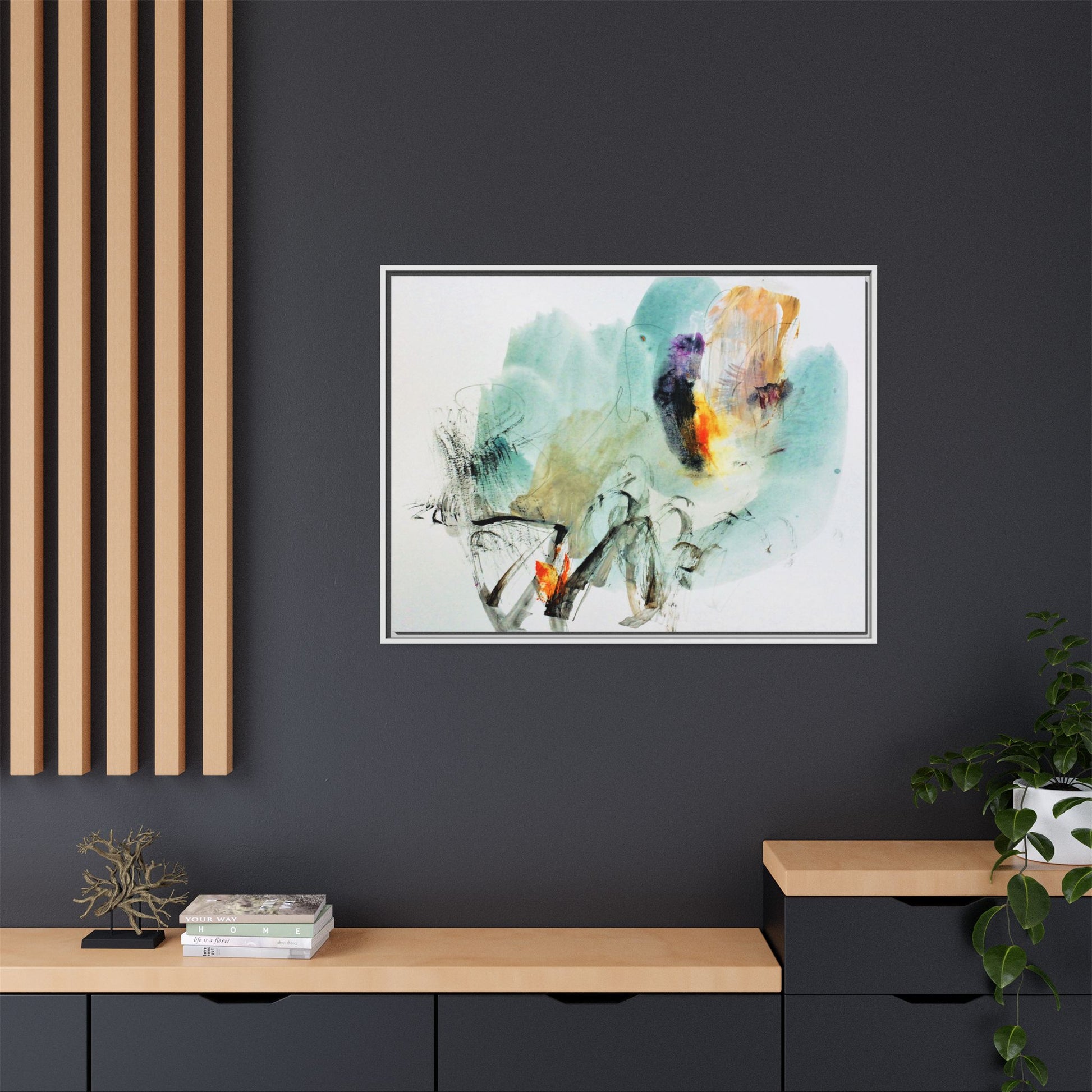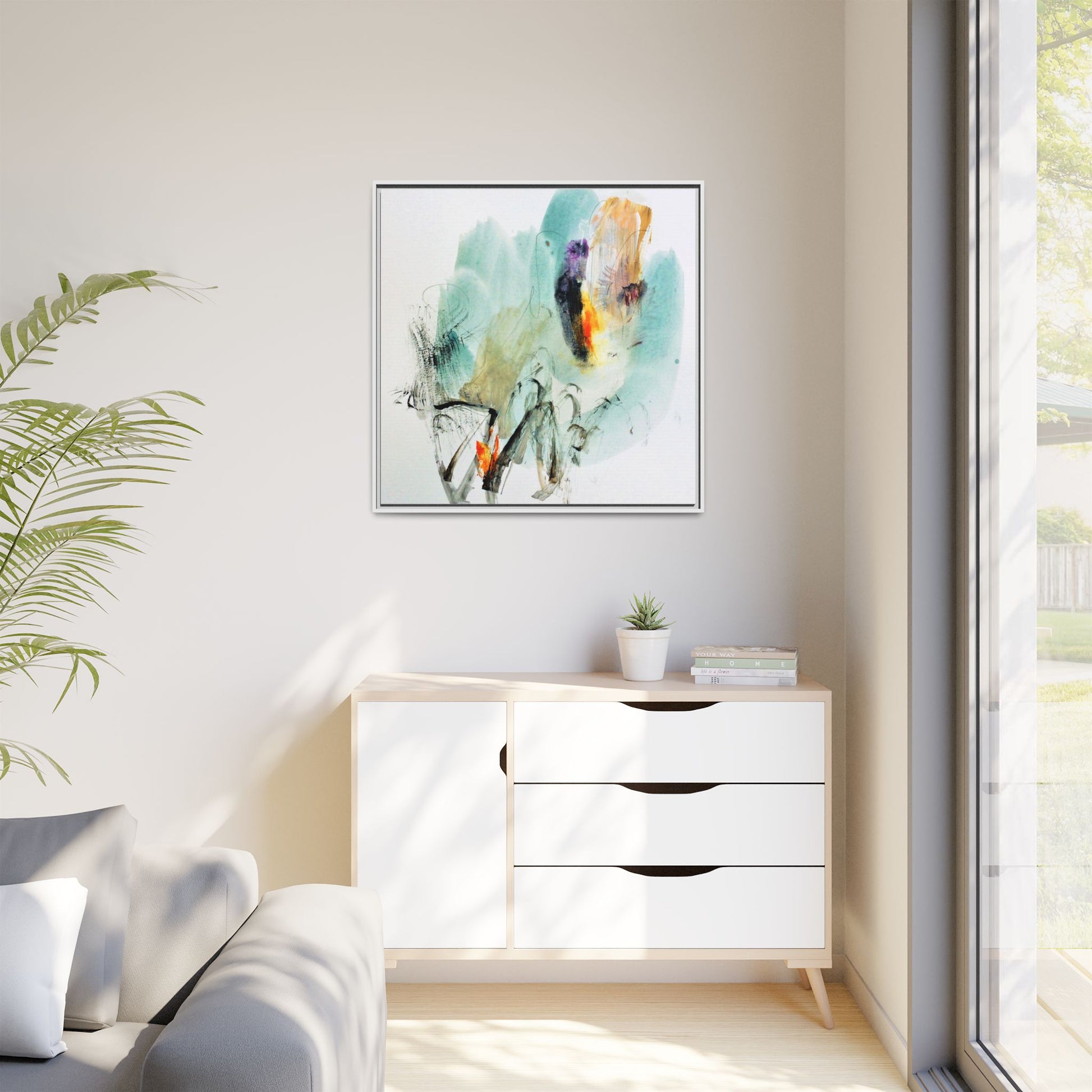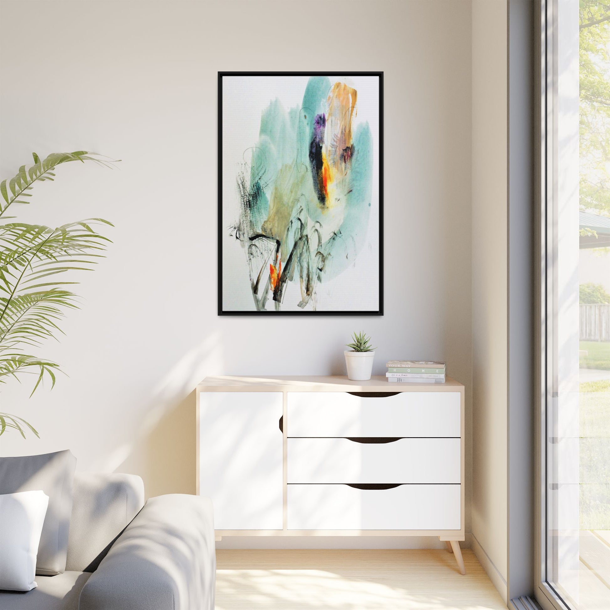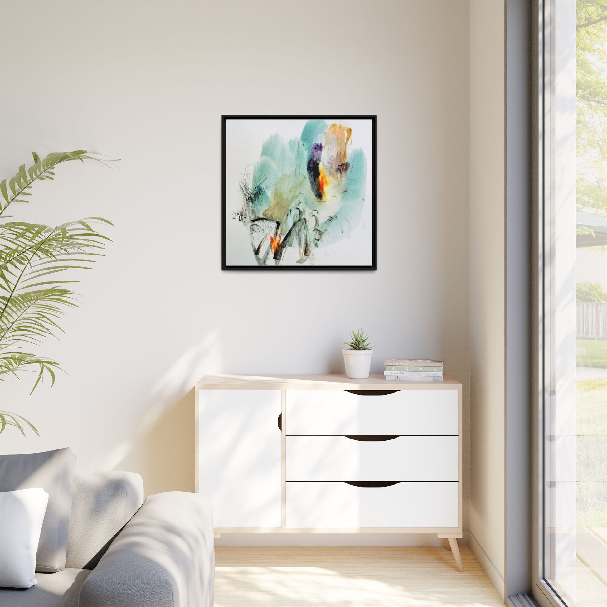 This captivating abstract watercolor painting features a dynamic composition of soft, ethereal teal and aquamarine backgrounds blended with muted yellows, oranges, and touches of purple. Fluid brushstrokes and organic shapes create a sense of movement and spontaneity, with gestural black and gray lines weaving throughout the image. Vibrant bursts of fiery orange and red punctuate the painting, providing striking contrast against the cool, watery color palette. The artwork appears to be created using a combination of watercolor, ink, and possibly other mixed media techniques, giving it a rich, layered texture. The painting evokes a sense of natural elements - perhaps suggesting landscapes, water, or atmospheric phenomena through its abstract, impressionistic style.